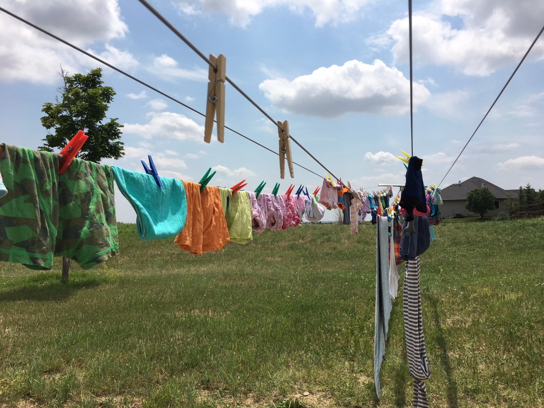 As a mom with many kids I have learned I can’t do it all on my own and that I only wear about 1/7th of the clothes that I wash each week…and so I’ve told the kiddos that they have to help. And usually they are glad and willing to help. Usually I have a few of them pull socks out and hang those on the drying rack and then I load the bottom of my shirt up with clothes pins and the other two kids bring me clothes to hang up as we work our way down the lines. It takes way less time with all the help.