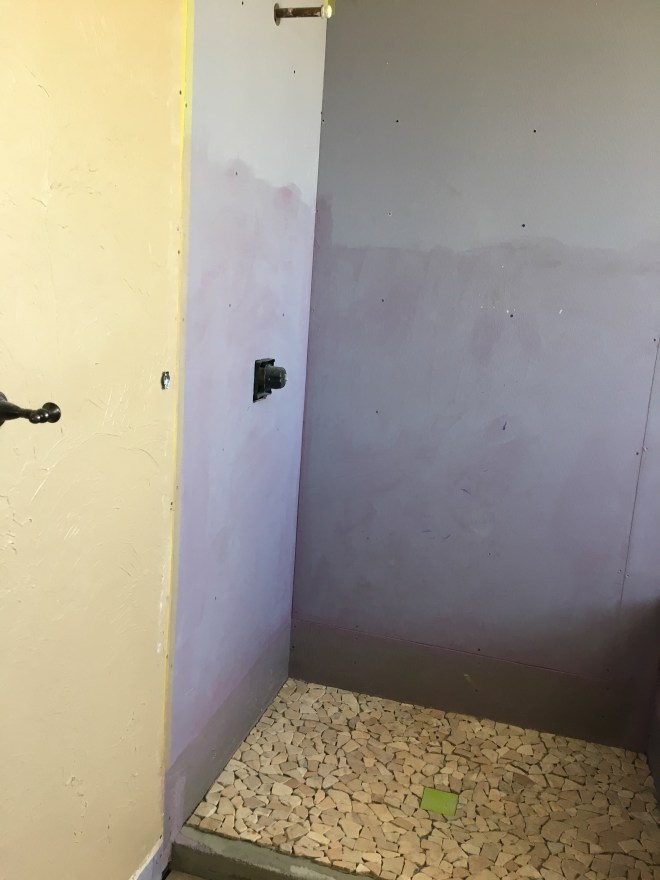 We still won’t have function of our bathroom for a few more weeks….because its summer and there are vacations the plumber can’t come for 2 weeks in order to put all the facets and such on, and it’s going to take 3-4 more weeks to get the glass for the shower doors made and hung. But it’s coming.