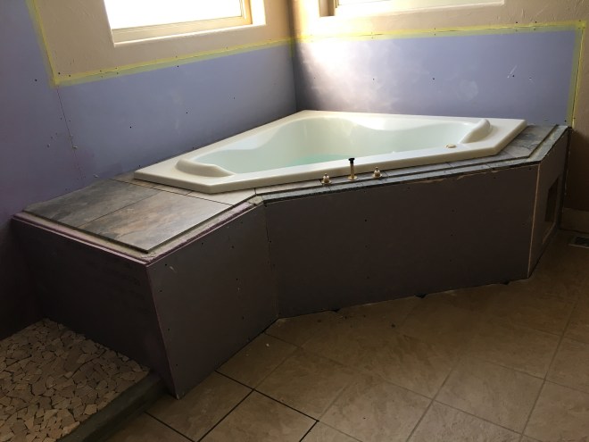 It is all an adventure. Next summer I’m hoping to use the left over new tile to re-do the sinks in our bathroom to match the tub and shower…that should be simple enough right?