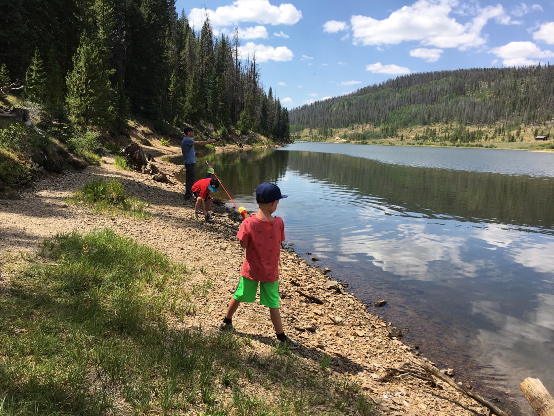 We had a couple of lures that didn’t have hooks on them. We put these on Paxton and Coppelia’s poles because it was just safer that way. Still, Coppelia could get her line in the biggest knot in the matter of 2 seconds. Once I literally cast her line out and started her reeling in, and turned and walked up the shore about 10 feet to cast out Paxton’s line and turned back around and in the span of less than 2 minutes Coppelia hand her line strung up and down both sides of herself about 8 feet in both directions, wrapped around both legs and up over her shoulder and through the velcro in her shoe still with the lure out in the lake where I cast it just seconds before. Paxton was just as bad. I seriously asked him once how he managed to get his line over Caedmon’s shoulder and between his legs….I will never know. Needless to say we had lots to laugh about.