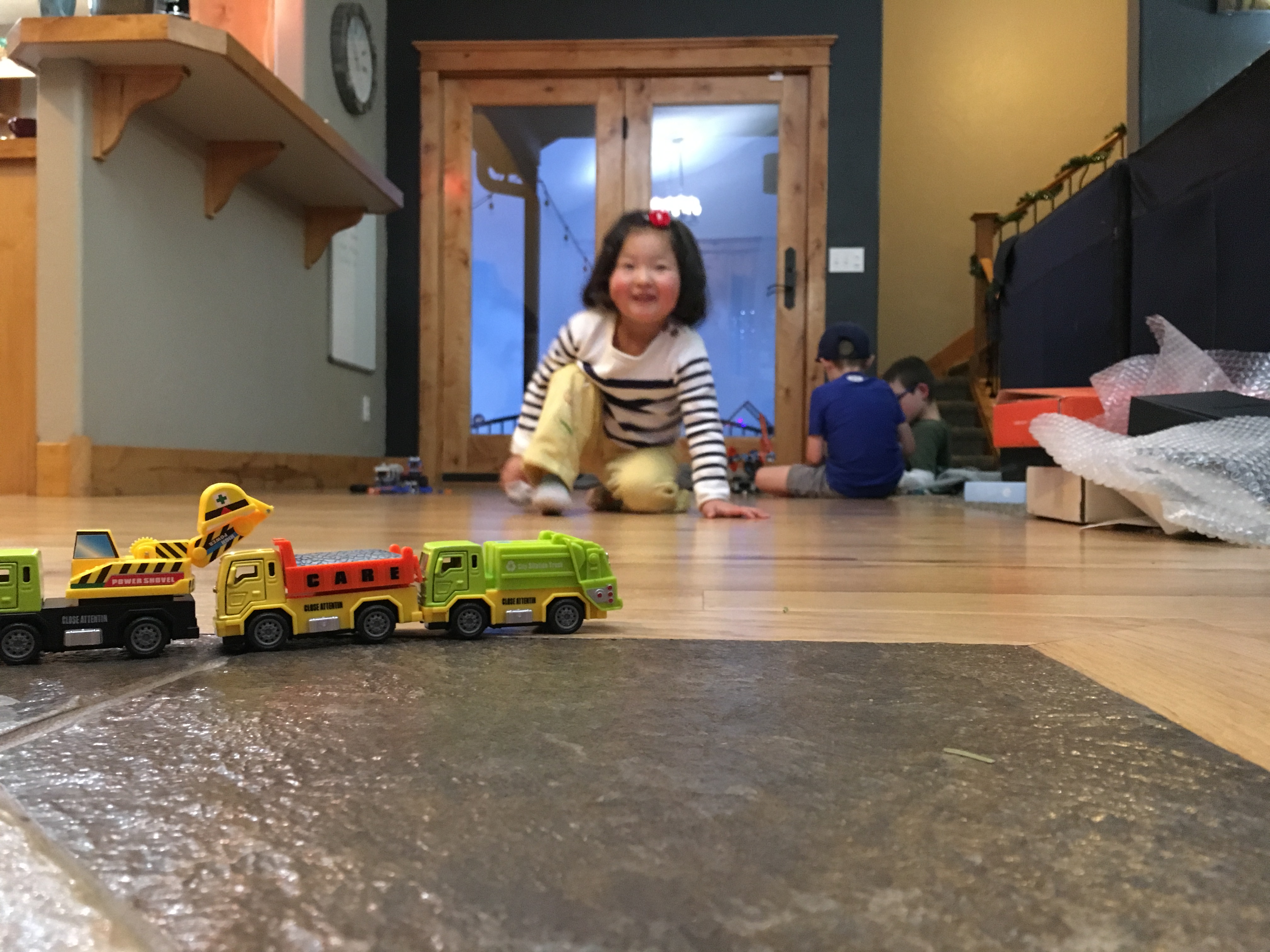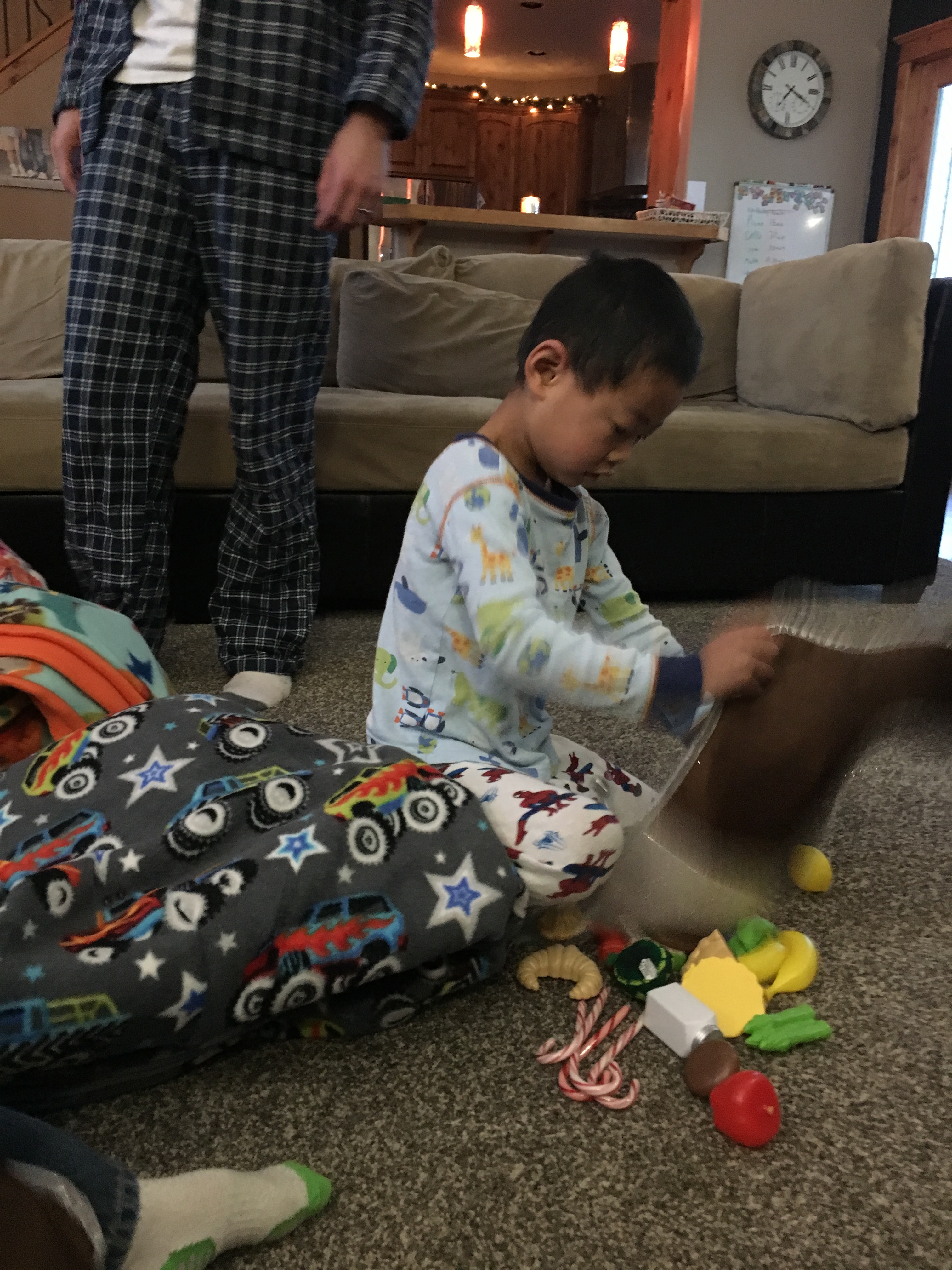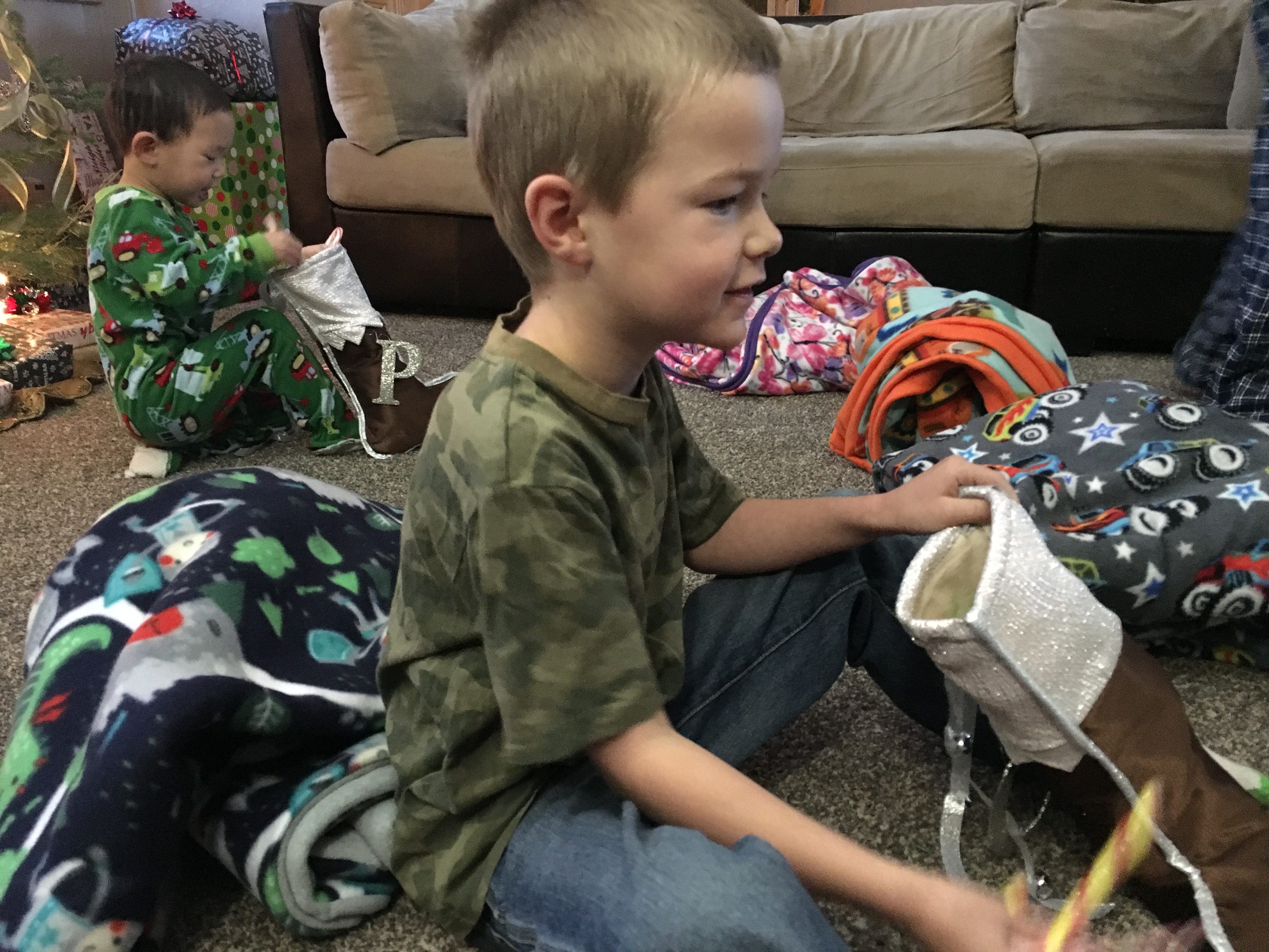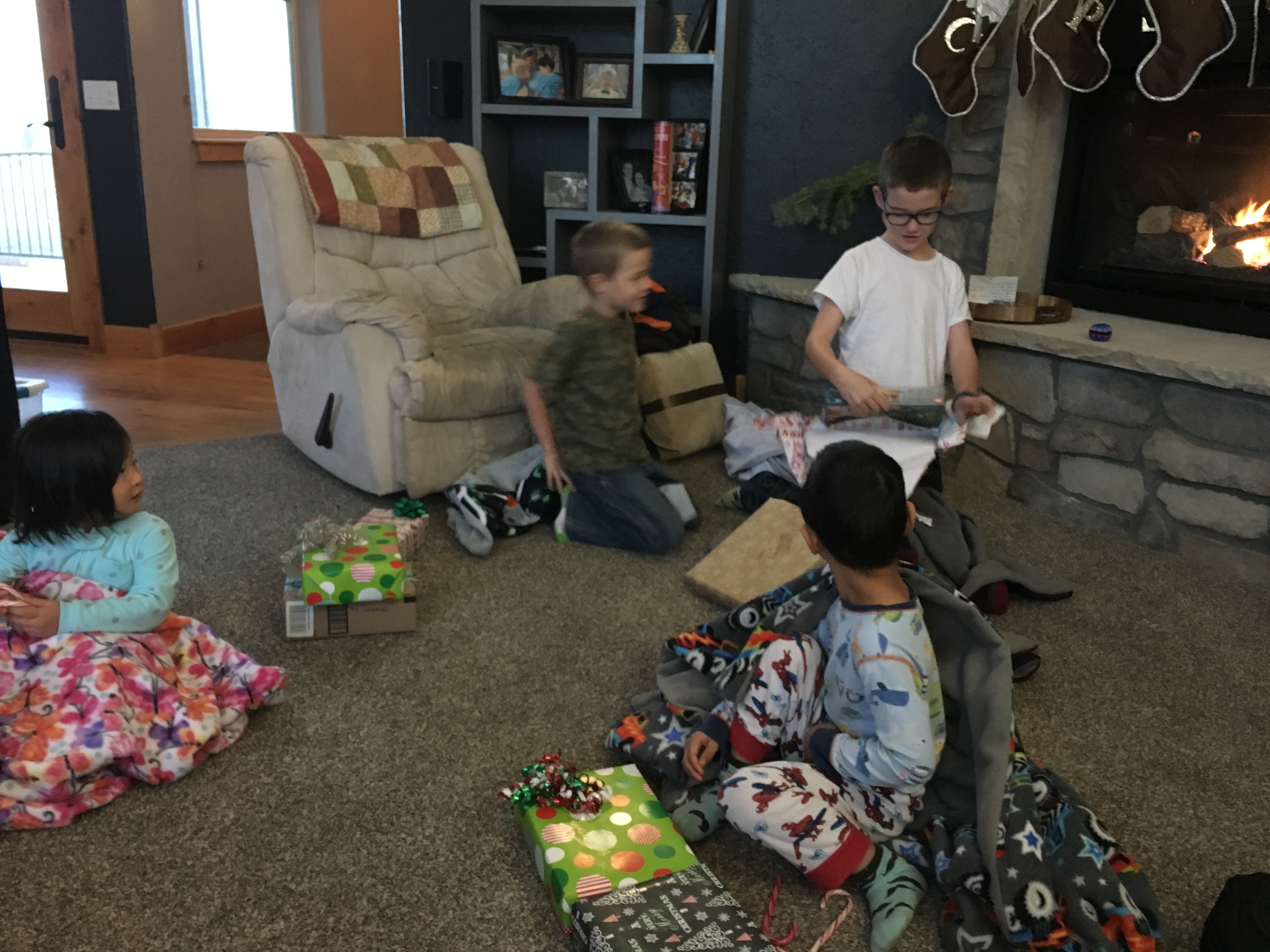 They all actually slept till nearly 7AM which was amazing. They loved their blankets. This year each of the kids exchanged names and so they got to buy a gift for one of their siblings and wrap those up which they had a lot of fun with. We also got each one a gift and then for all of them we got a zip line. Initially the goal was to have it all set up in time for Christmas but someone (Clint) forgot to get it approved by our HOA and we ran into a bit of a snag there so it will be up in the next couple of weeks once we get the concrete and posts put in place. The kids were super excited anyway and I am looking forward to watching them and playing with them on it.