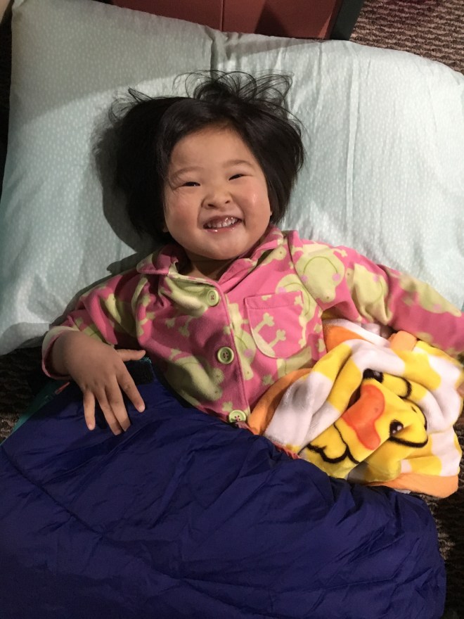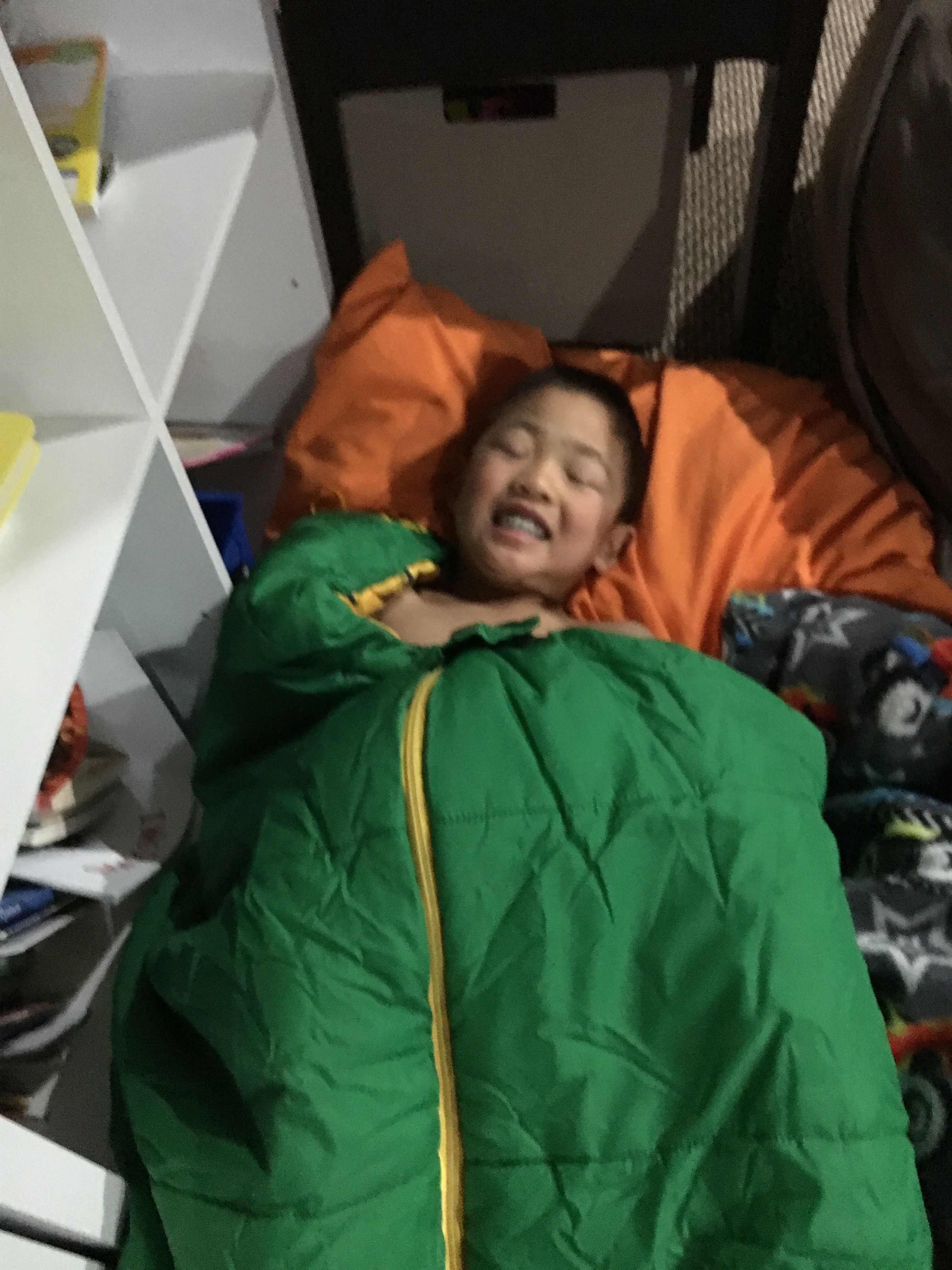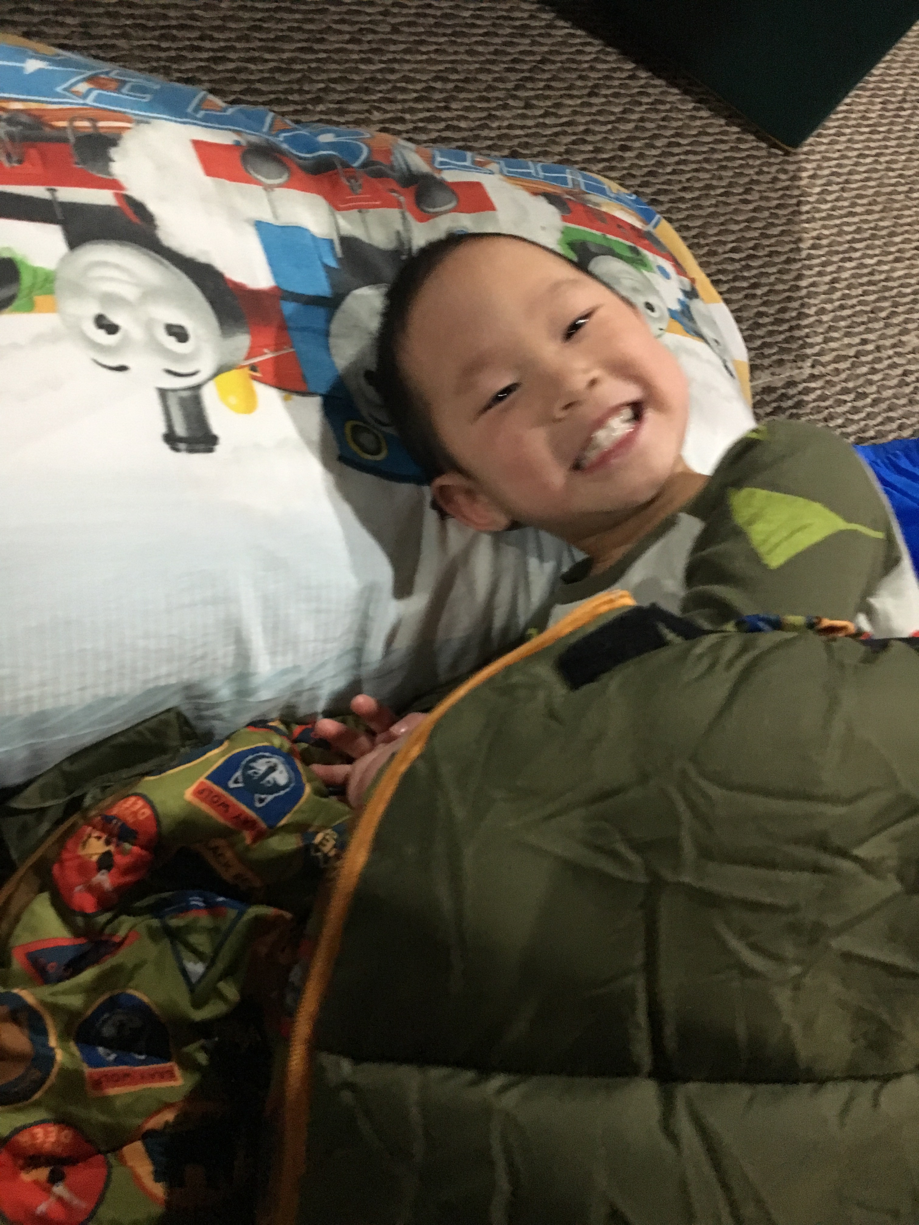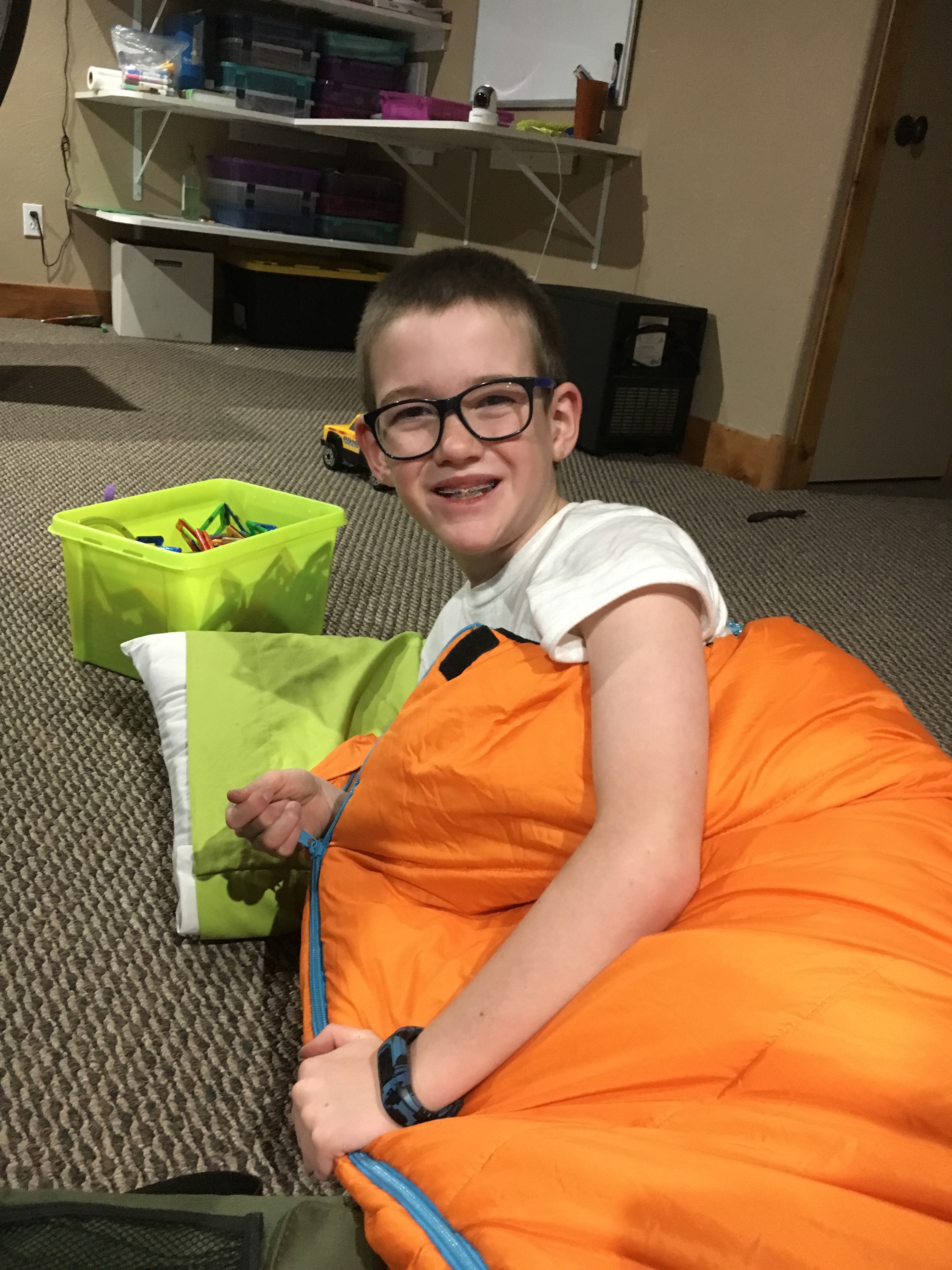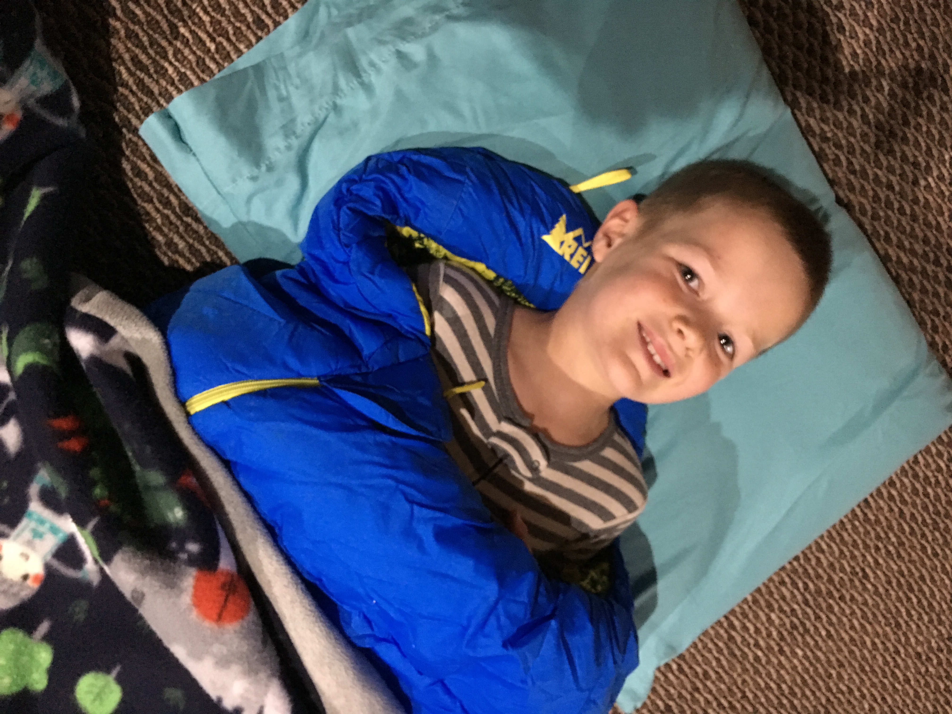 Last week after game night the kids all decided to sleep in the playroom. I wasn’t so sure how it would go but I figured we could at least start everyone out up there and then if needed put them back in their rooms if needed. Everyone was super excited and loved getting their sleeping bags set up. Leighton stayed off to the side a little, I think to act like the big brother and tell everyone else to lay back down…