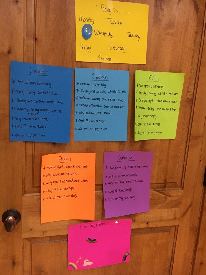 It’s actually been going pretty well and making things easier. The kids finish breakfast and look to see what day it is and then read down their list to see what they have assigned that day. I purposely didn’t assign kitty duty to anyone on Wednesdays because that’s the day we all have to get around early for homeschool enrichment and preschool and so that morning whoever is ready first does it to help everyone else out. And the littles have a few things assigned and thats ok, as they grow so will their responsibilities.