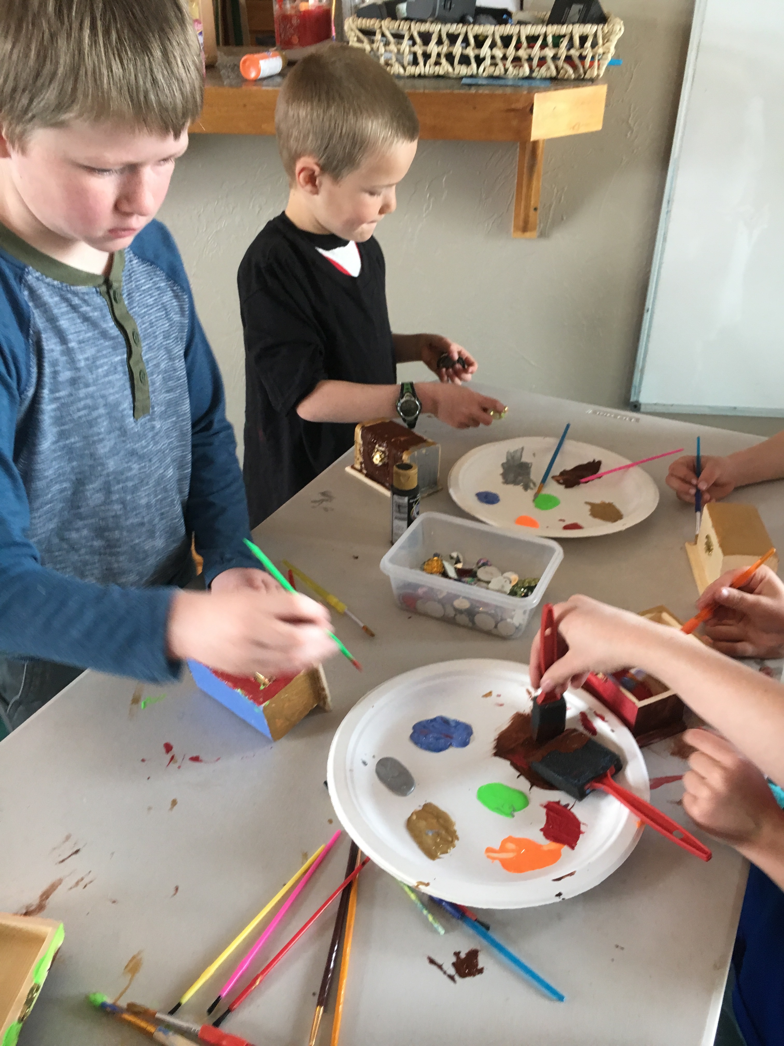We celebrated his friend birthday party on Friday. It worked well since he wanted his homeschool buddies to come and a couple of his neighborhood friends who were on spring break. He decided he wanted everyone to paint treasure boxes and put pirate gold and treasures in them. But he also told me that it wasn’t a pirate birthday party. So the kids painted and played outside and had a great time. They ate popsicles instead of cake and everyone had a good time.
