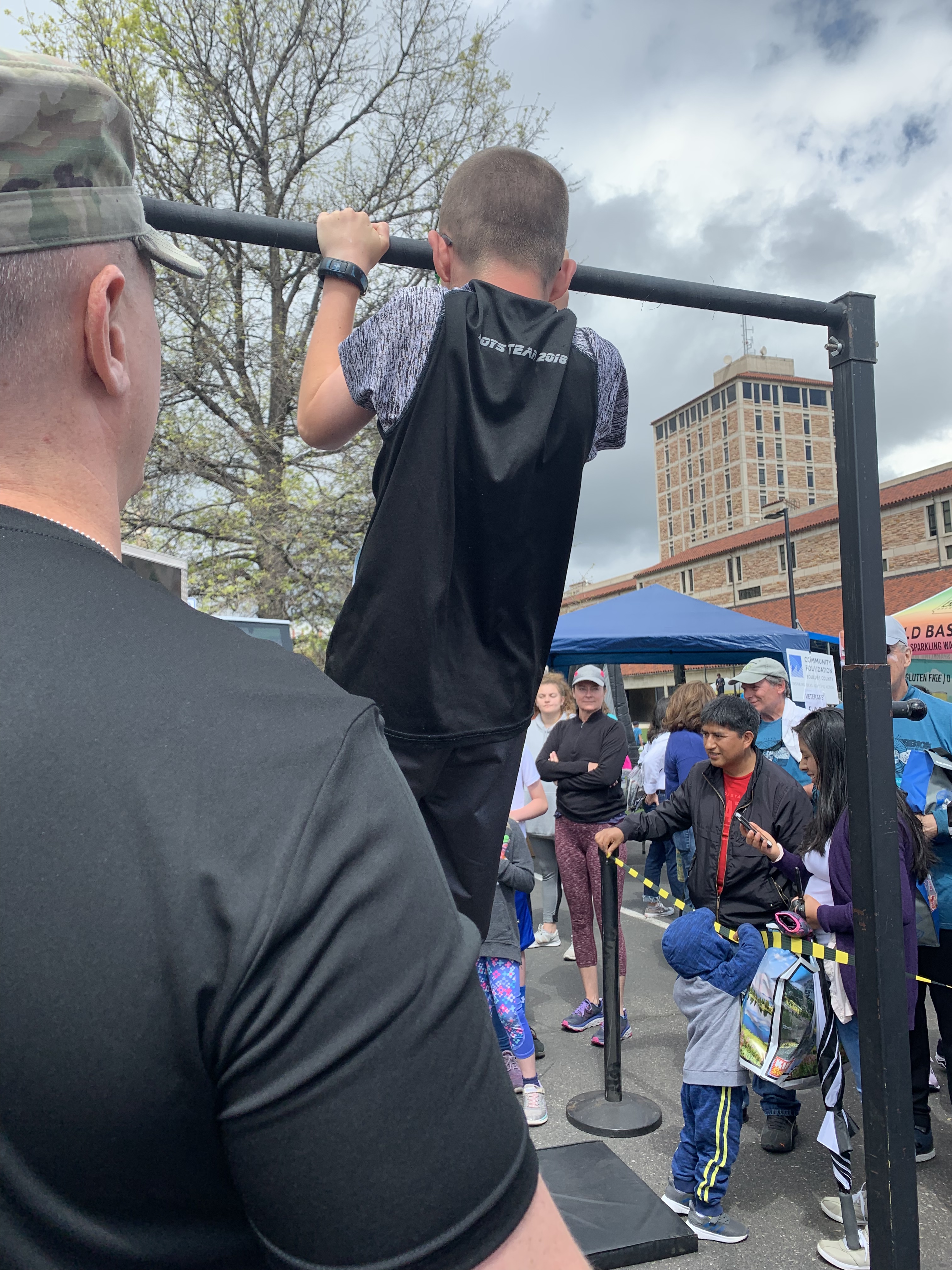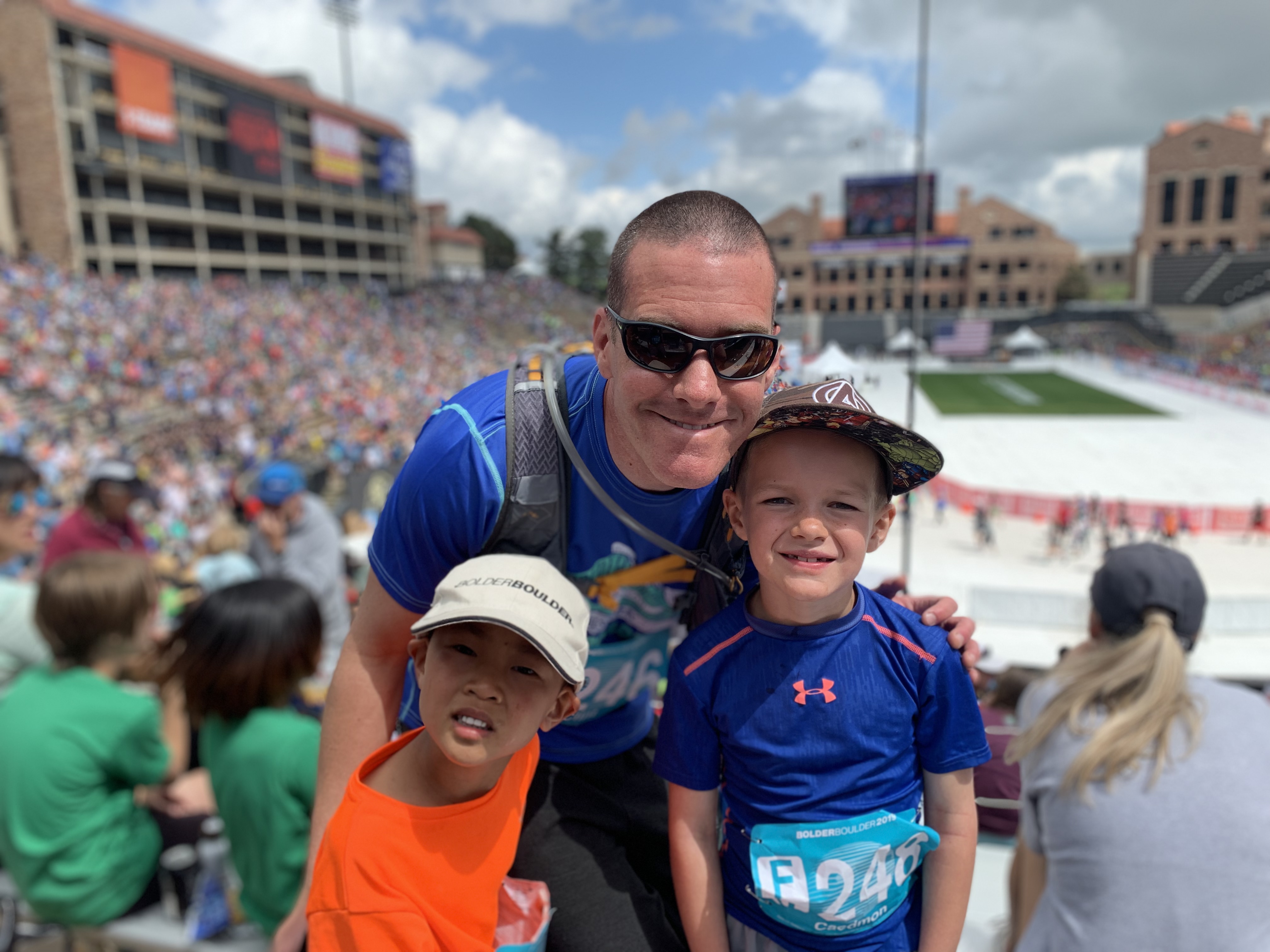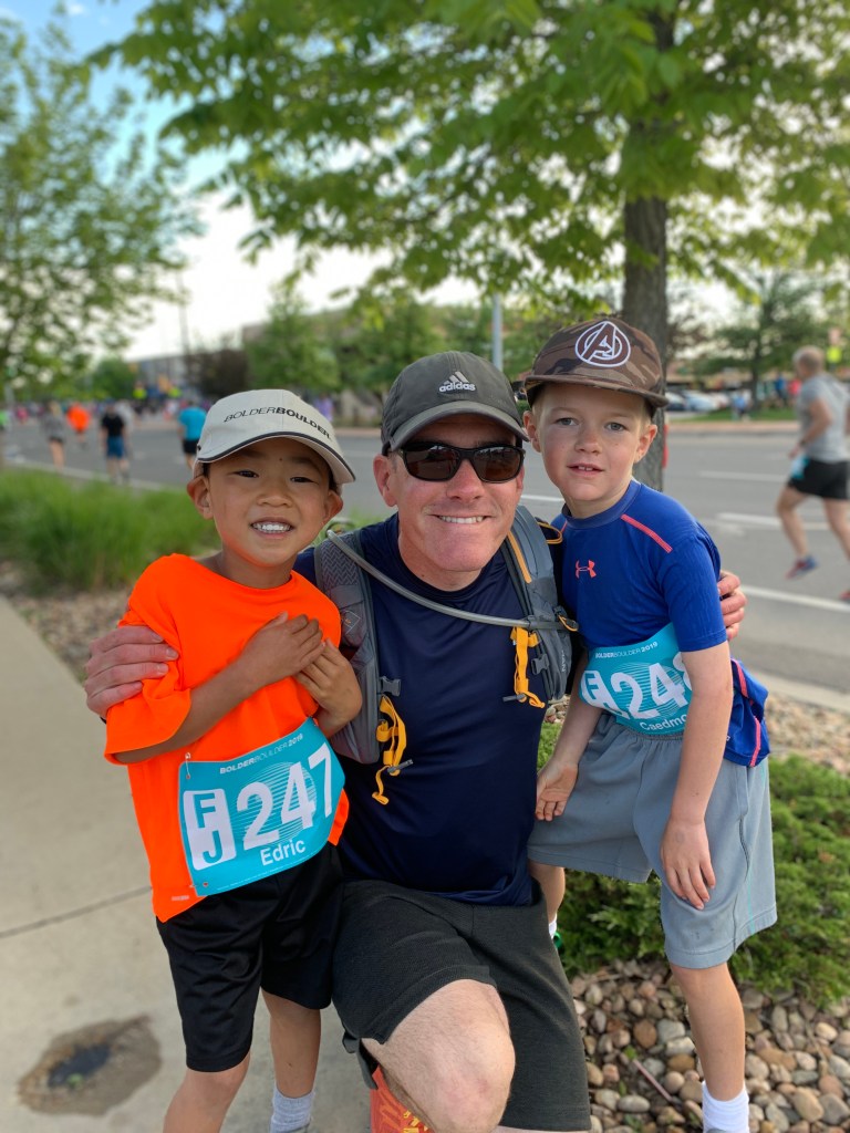 After he and I finished we began the waiting game for Clint, Caedmon and Edric to finish. They had a new app this year where people could be tracked (if they were over 18), which worked really well. In fact just as we finished and were getting our goodie bags I saw on the app that one of my partners from work was finishing and so we met up with him. Leighton got a photo of us, I’m currently the youngest partner in our doctor group and he’s the oldest so it seemed fitting, our finishing times were within a minute of each other. Clint and the boys were making better time than I had expected and it actually didn’t take too long before they were crossing the line. I was smart and had insisted that Edric wear a bright orange shirt which helped us pick them out of the finish line crowd.