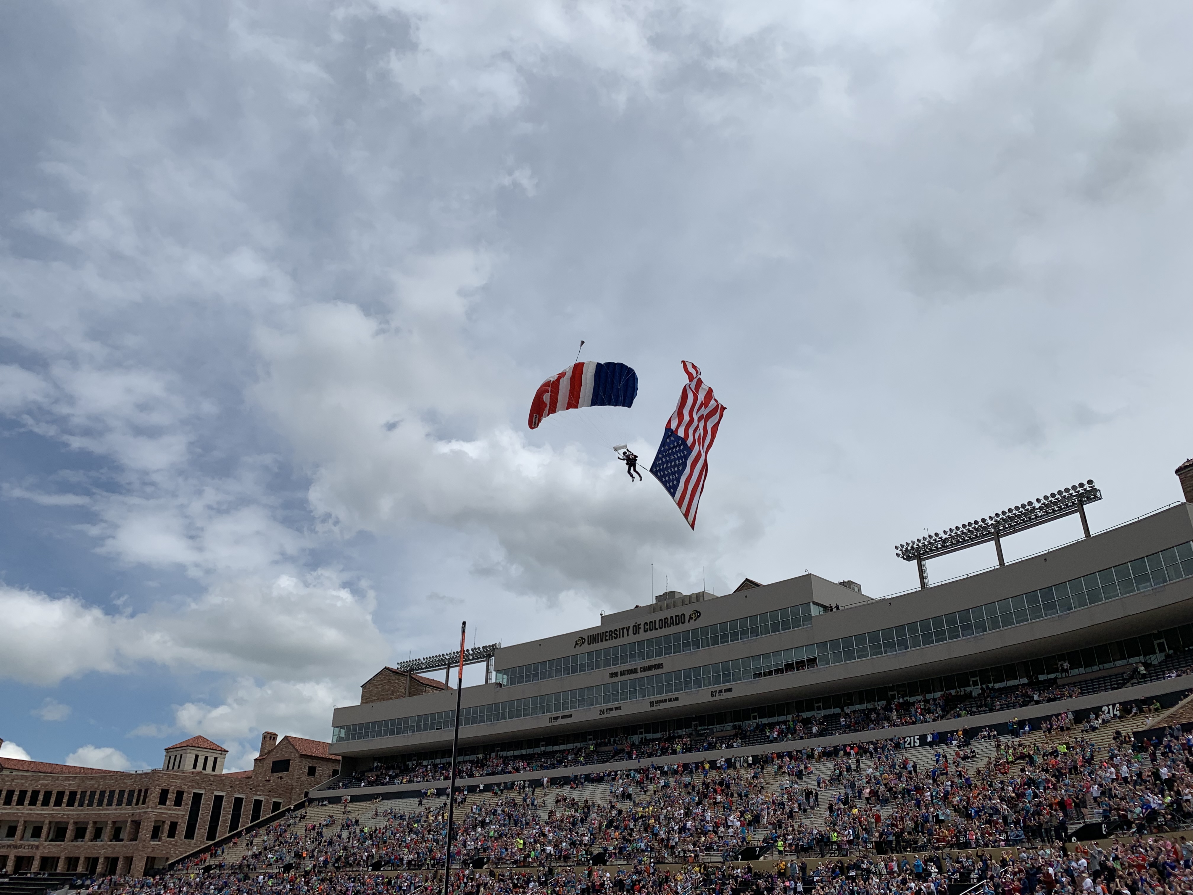 After eating all their goodies we headed out to the expo where the kids found more popsicles, chicken nuggets, jelly beans, gummys, and juice to drink. Leighton found the Army tent where they had a pull up bar set up and so he busted out 10 pull ups without a problem which impressed the crowd that was standing around. We then found our seats for the Memorial Day celevration. The tributes this year were in honor of Gold Star families, those that had lost family members in combat. The celebrations concluded with parachutes landing, each with large flags of the different branches of the military.