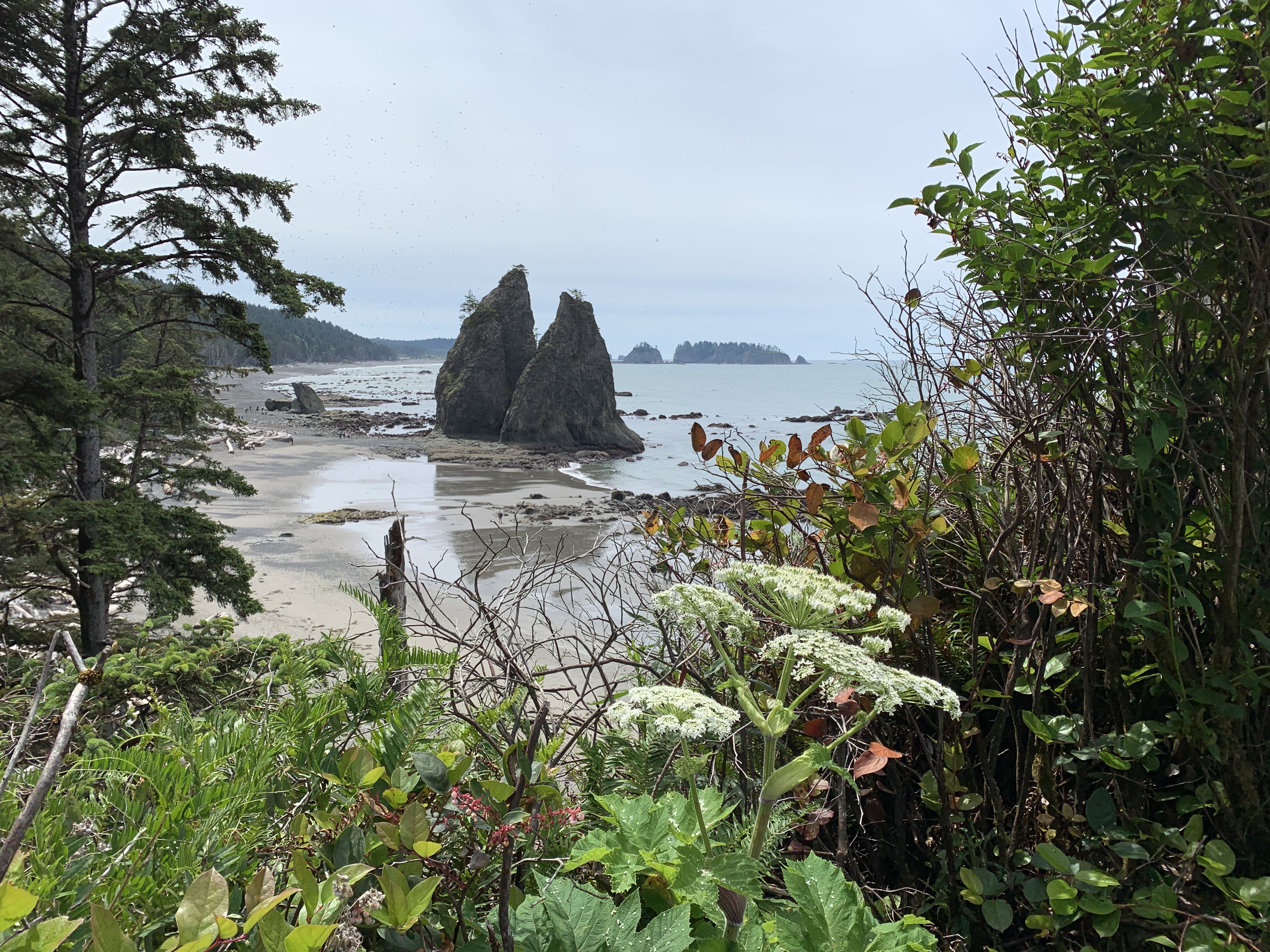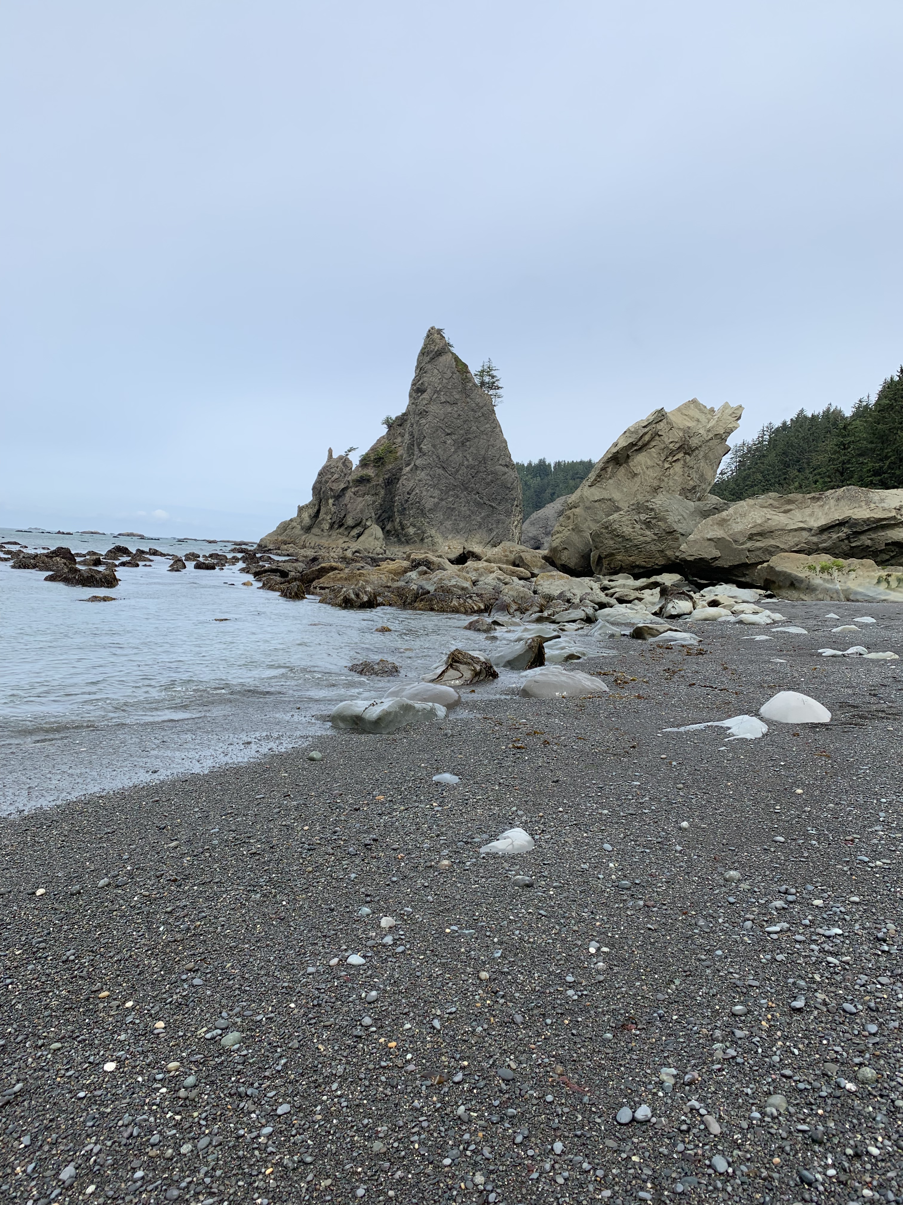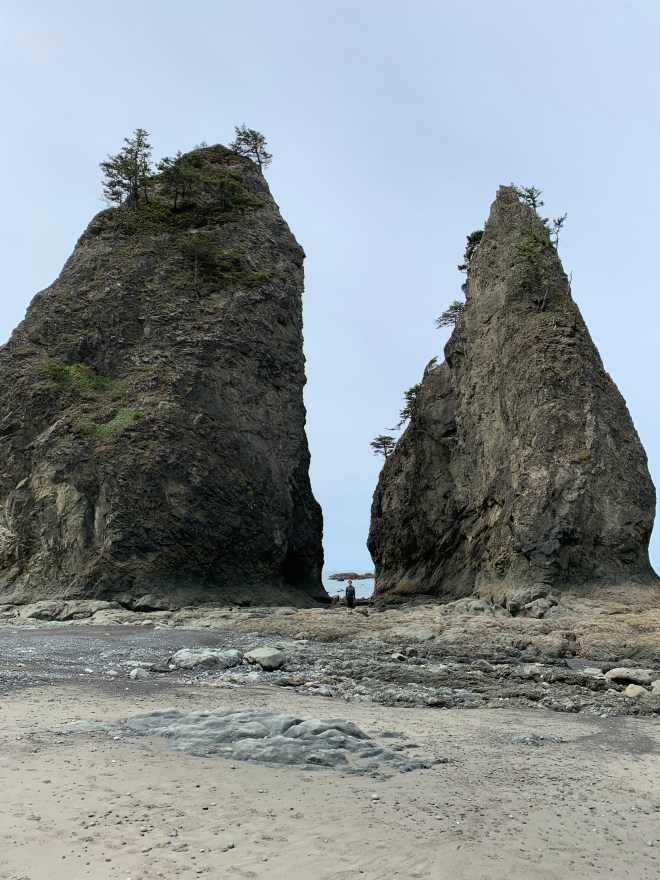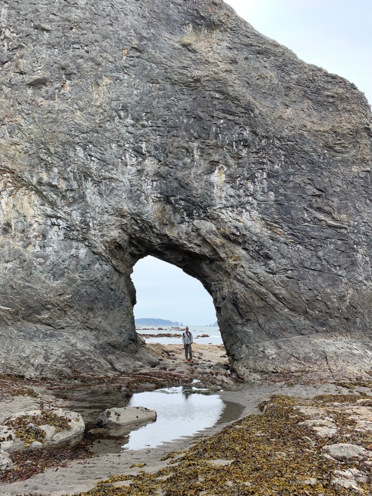We did a little bit of everything on Day 3. We started the day by driving out to the west coast again, but this time a little farther south to Rialto Beach. It was foggy and windy and cool when we got there and so we bundled up in our coats and started walking the beach. There was a lot of drift wood which was something we hadn’t seen as much of before and a bunch of really smooth stones along the beach which was also different that Shi Shi Beach the day before. There were a number of sea stacks which is part of what Rialto Beach is known for. After about a mile or so up the beach there is a solid wall of rock that during low tide one can actually walk through a large hole in it. We timed it right and walked through and then spent a lot of time exploring the tide pools. The clouds and mist slowly lifted while we were doing that. We again found starfish and all sorts of little creatures. We also found a trial up over the large rock wall that backpackers use when they are hiking and are there during high tide and can’t just walk through the hole in the wall.