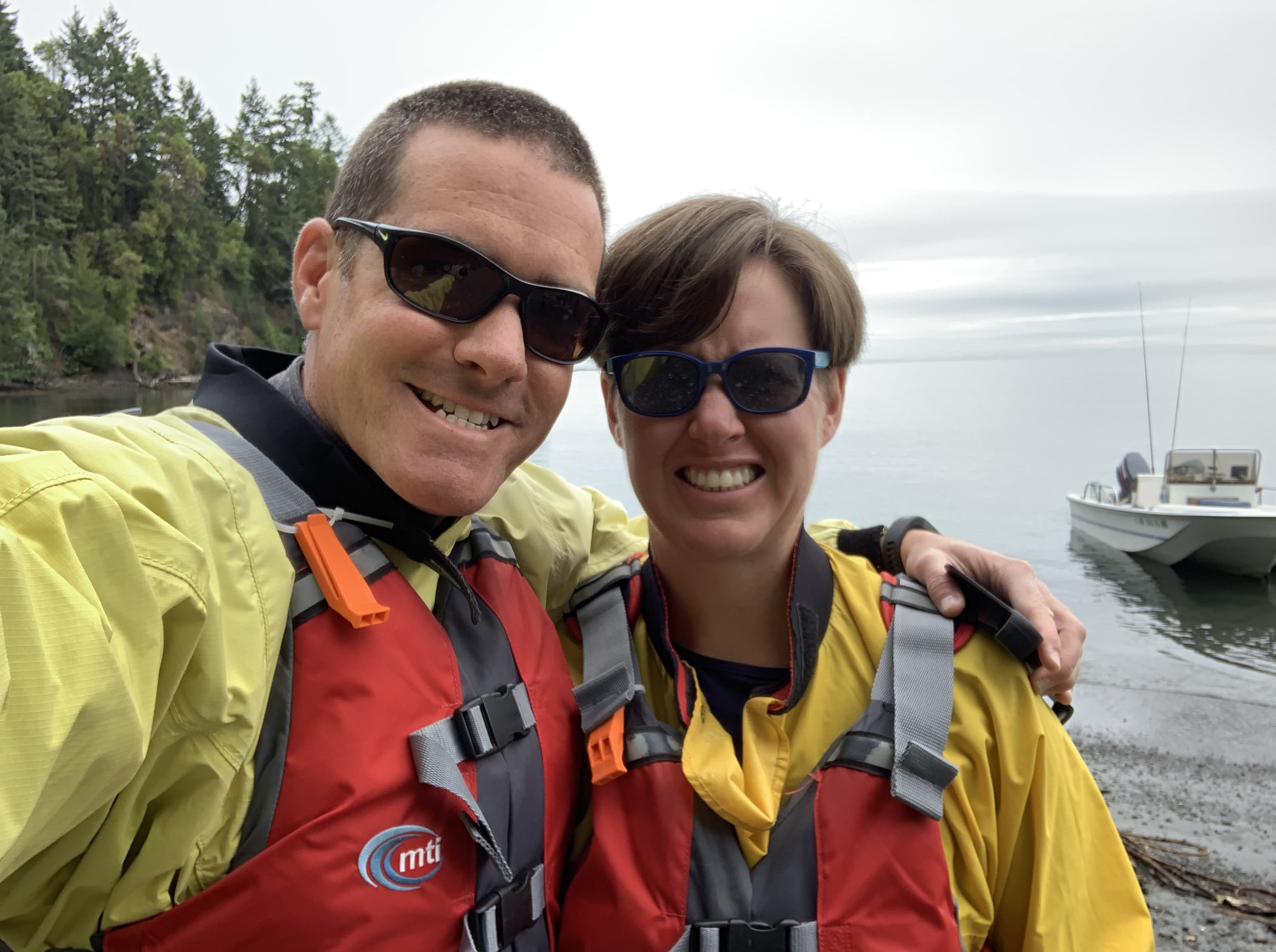 The day started cloudy but was comfortable. We met our guide and 2 other couples at their headquarters and after getting suited up in our attractive wet suits and life vests we loaded up and drove down to the bay. The guide gave Clint and I single kayaks and joked with Clint that experienced kayakers called a married couple in double kayak “divorced”. We laughed and enjoyed our single kayak. The clouds quickly burned off and it was a gorgeous day. We kayaked in and out of the area bays and learned all about the different kelp and sea life. We saw starfish, anemones, sea urchins, dungeness crabs, clams, and even had a harbor seal pop up in the water in between us. As we finished and were pulling our kayaks up on the shore a huge bald eagle came sweeping down to the edge of the water not 10 yards in front of us and plucked up a huge fish and flew off with it. It was a pretty amazing experience. Clint and I fell in love with kayaking and look forward to doing more in the future.