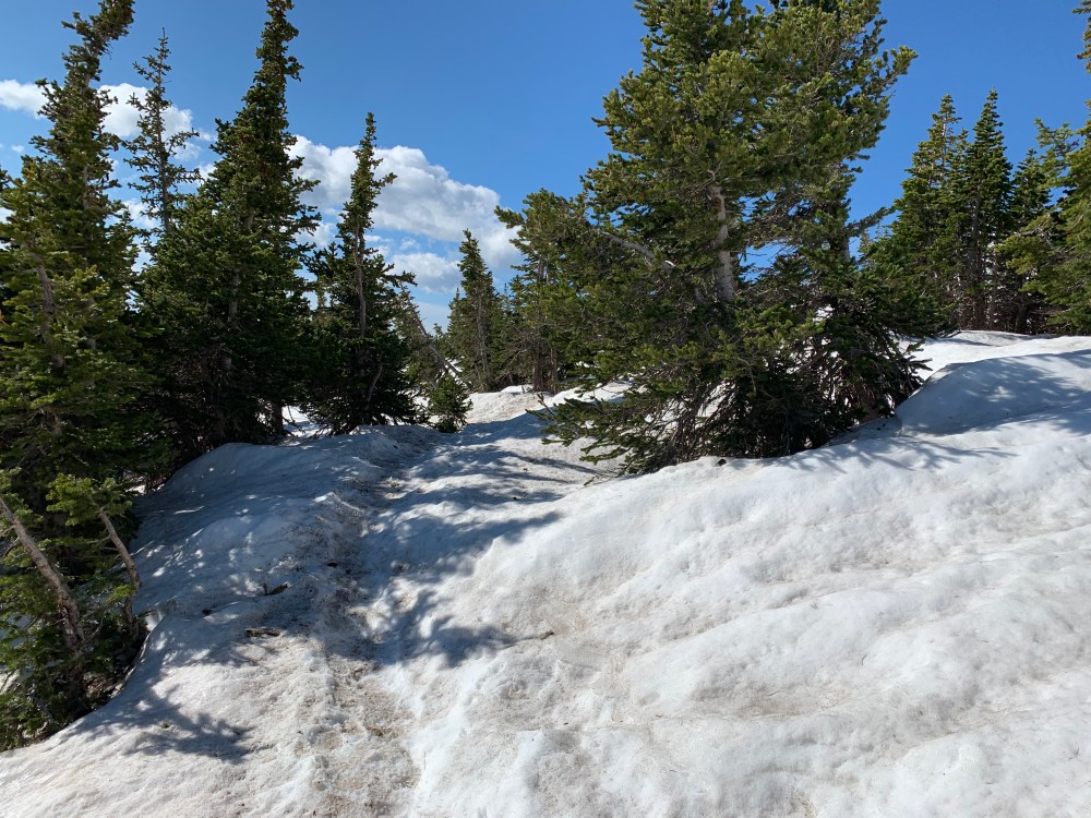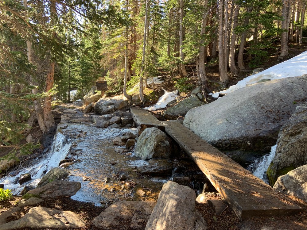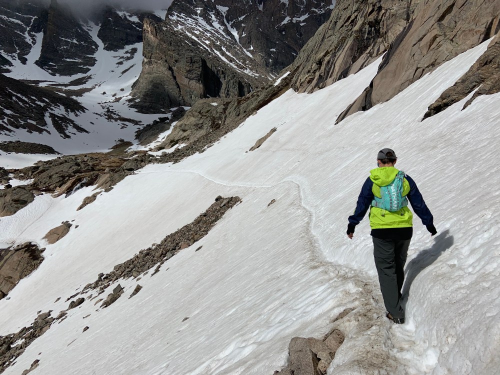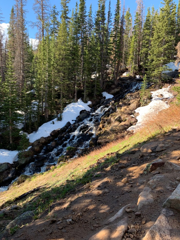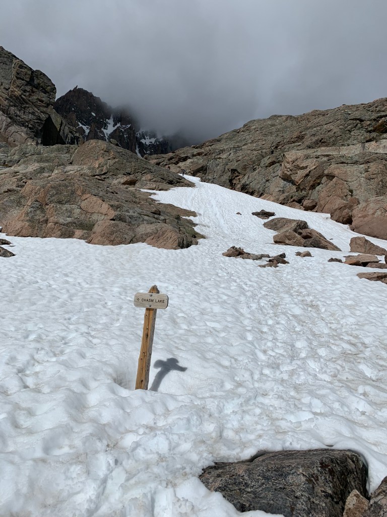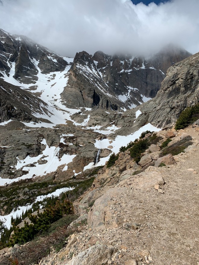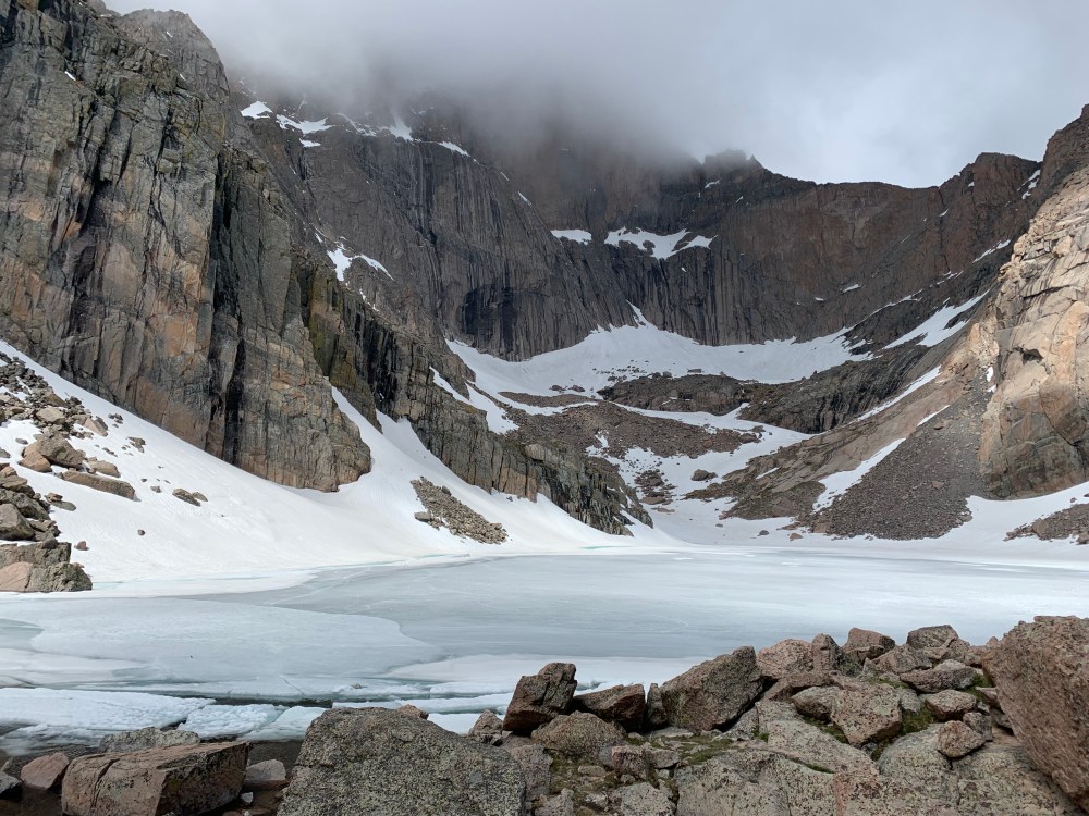 Since we had to come home early from our post Korea Camp hiking plans because of the stomach virus and I had not yet gotten sick (yet being the key word there, it hit me a few days after everyone else), I had an extra day off and so I got to share one of my favorite hikes with my friend Amanda. I first hiked Chasm Lake which sits at the base of Longs Peak when I worked at Camp Timberline after my junior year of college and it was one of the first Colorado Hikes I took Clint on when he came to visit the next summer. I have hiked it in mid June in the past but this year has been so whacky with weather this was the most snow I have ever had up there. Amanda has a huge desire to climb Longs Peak and I had to keep her on the path to just go to the base and no all the way up the mountain. It was windy/rainy/sleeting enough that she didn’t need much convincing. And the amount of snow was impressive. We might have actually just slid on our backsides down a huge section because there really was going to be no other way down and we were going to end up sliding anyway so we just went for it at the top. And we might have lost the trail at one point thanks to the snow on the way down. We took a selfie photo of ourselves when we were lost in case anyone found us later….We had a great time, we put in a good 9ish miles and saw some beautiful areas. The sun broke through as we were making our way down and we finally got a good view of the top as we started back towards home. So thankful for this creation and for the beautiful friendship I have with Amanda.