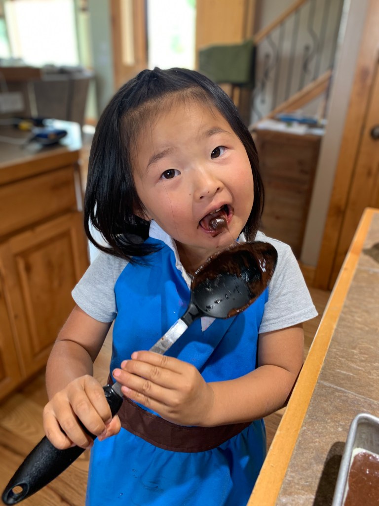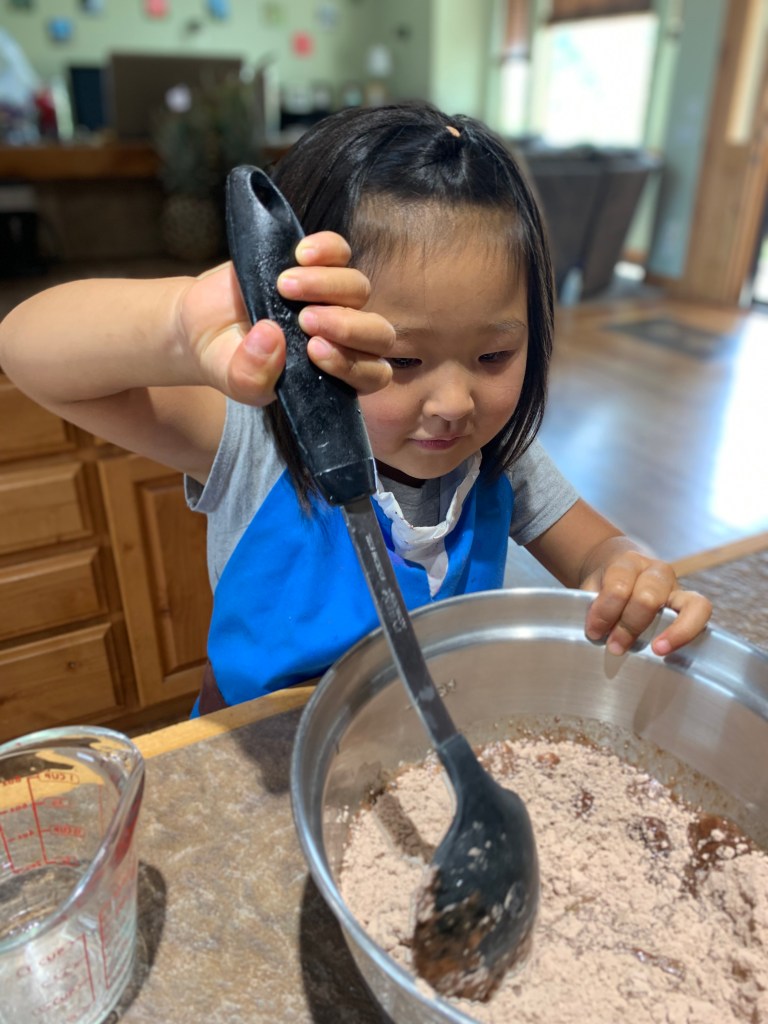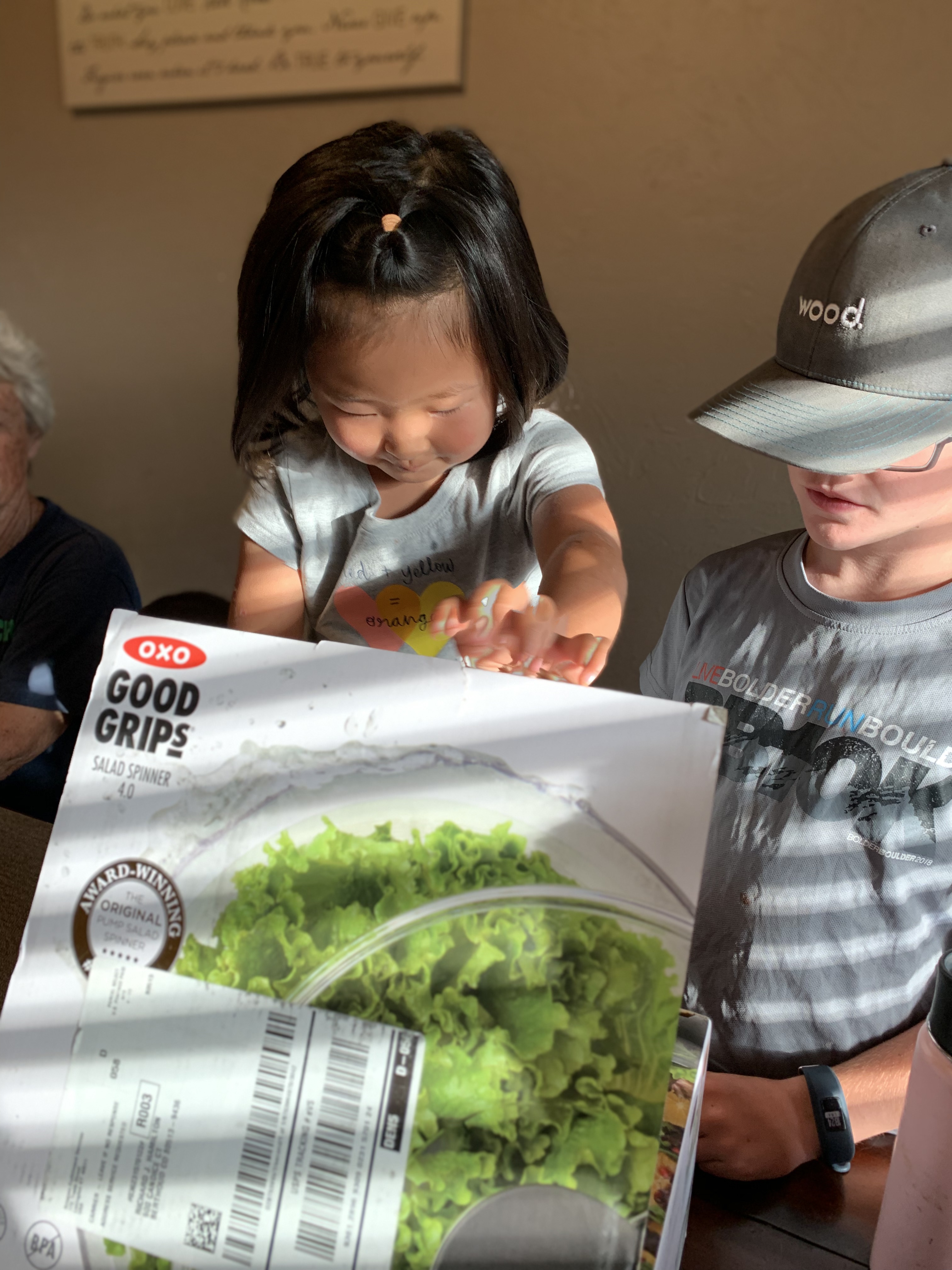 We celebrated her birthday over a couple of different days because of scheduling things. Over the weekend we had her requested dinner of mandu and gimbop and fried rice as well as brownies with my parents, Honey and Grandpa. Her actual requested meal was ice cream, cake, brownies, and cupcakes, but I told her that she needed something besides sweets to eat for her meal. She helped me make the brownies in the afternoon which she loved to do. We started out outside but then the wind picked up so we ended up inside for candles and presents. My mom made her a snow white dress (hint hint hint for what we are all going to dress up for Halloween) and wrapped it in a salad bowl box. She actually wasn’t all that impressed with the dress and wanted to know where the salad and the bowl were. So long story short she’s been sleeping with a plastic salad bowl and the box in her bed since that time and is so pleased with them (who needs princess dresses when you can have a salad bowl????). They also got her a ukulele which she really likes and has been playing. We are thinking maybe she can learn to play a simple Christmas song with Clint for her preschool program.