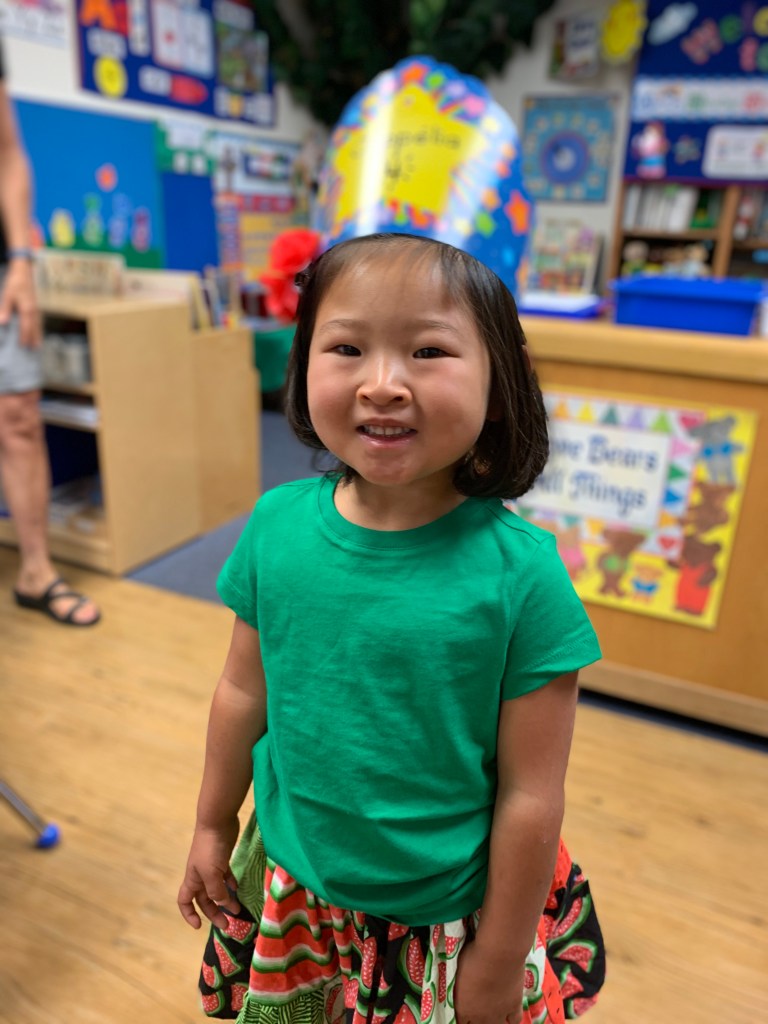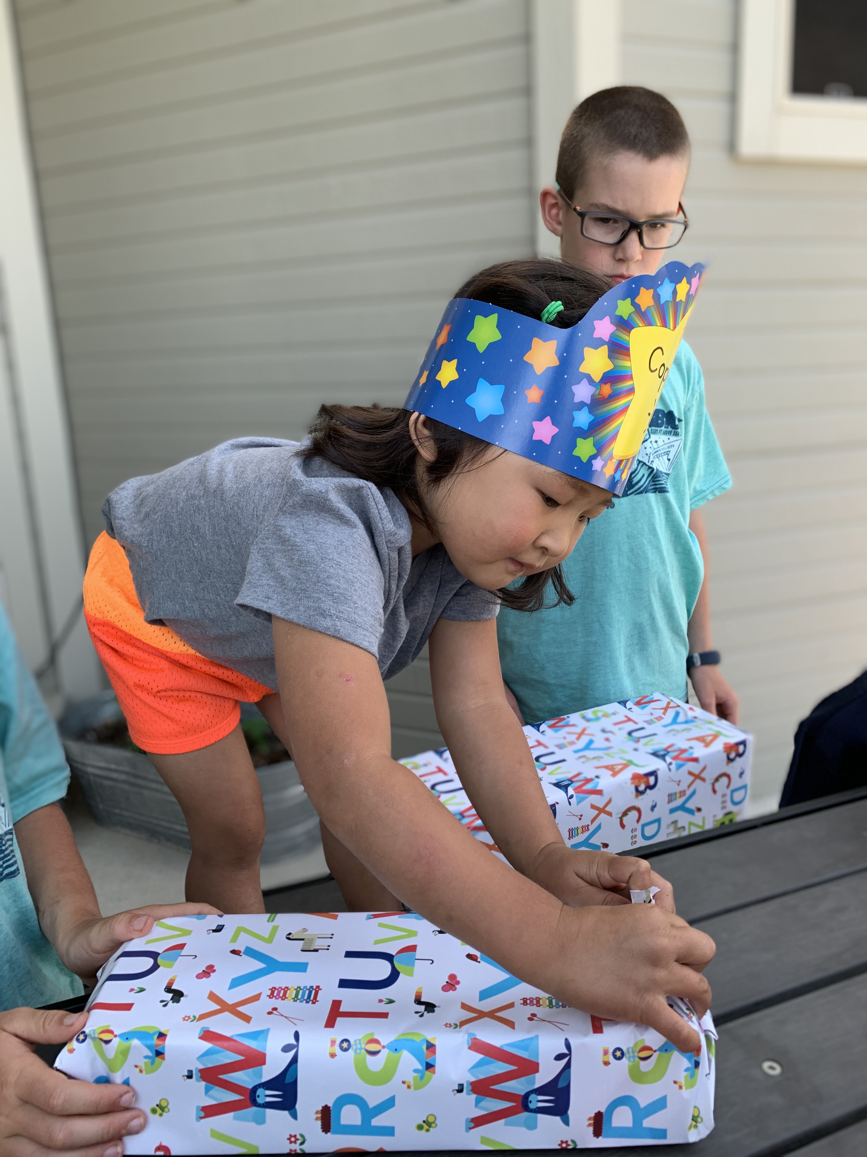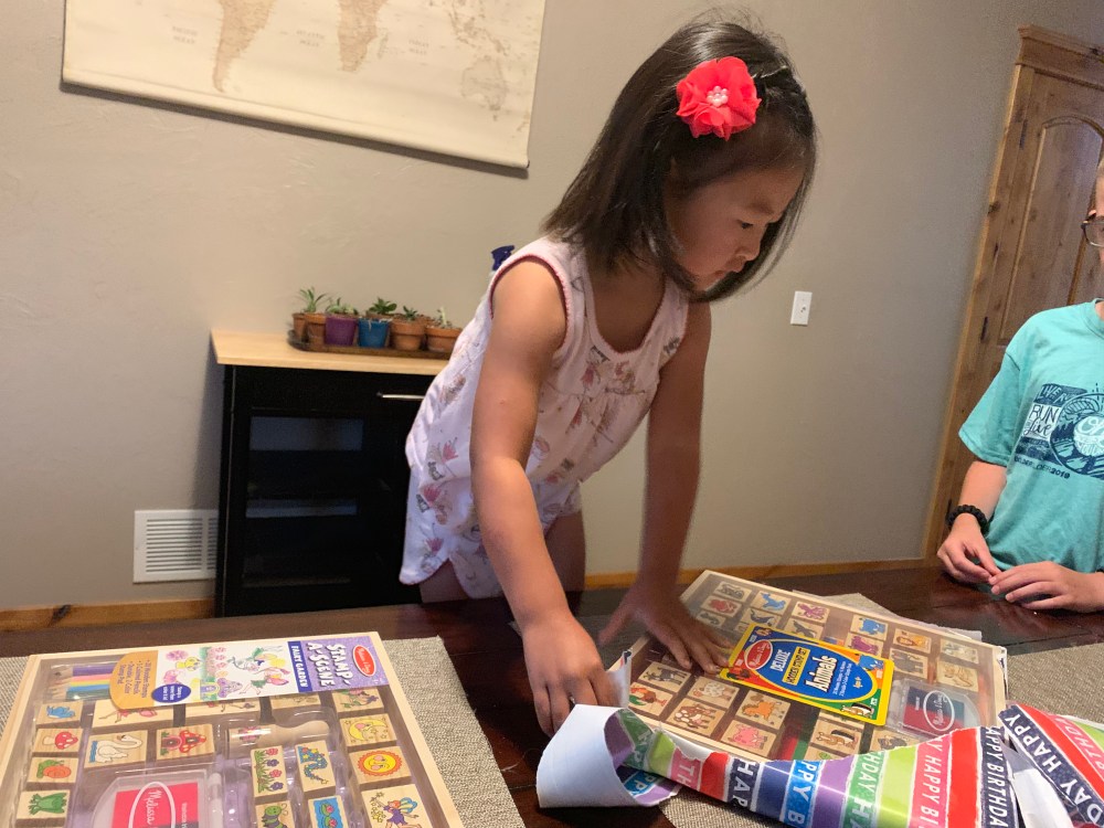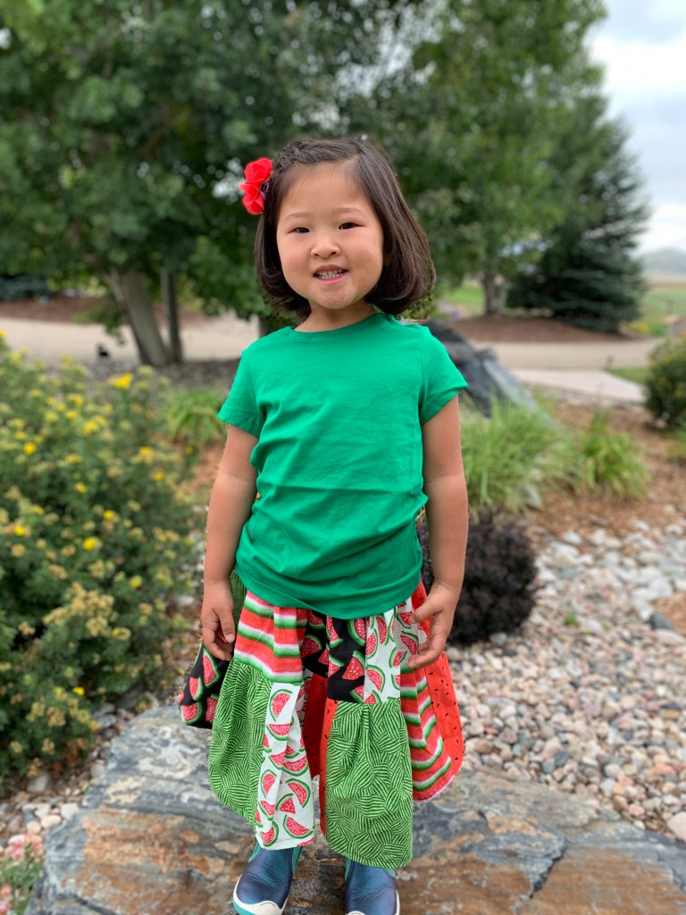 Today on her birthday she woke up to balloons and streamers decorating the stairs and then first words out of her mouth when I walked in her room was “Is today my birthday?”. When I told her it was she said “oh thank you!”. During breakfast she opened two stamp sets from her brothers. It was then kind of a quick morning as she and Paxton had preschool and the other 3 boys had orientation for their homeschool program. She wore the watermelon skirt that I made for her and we even managed to curl her hair. At preschool she got to be the special helper and wear a crown and lead a parade.