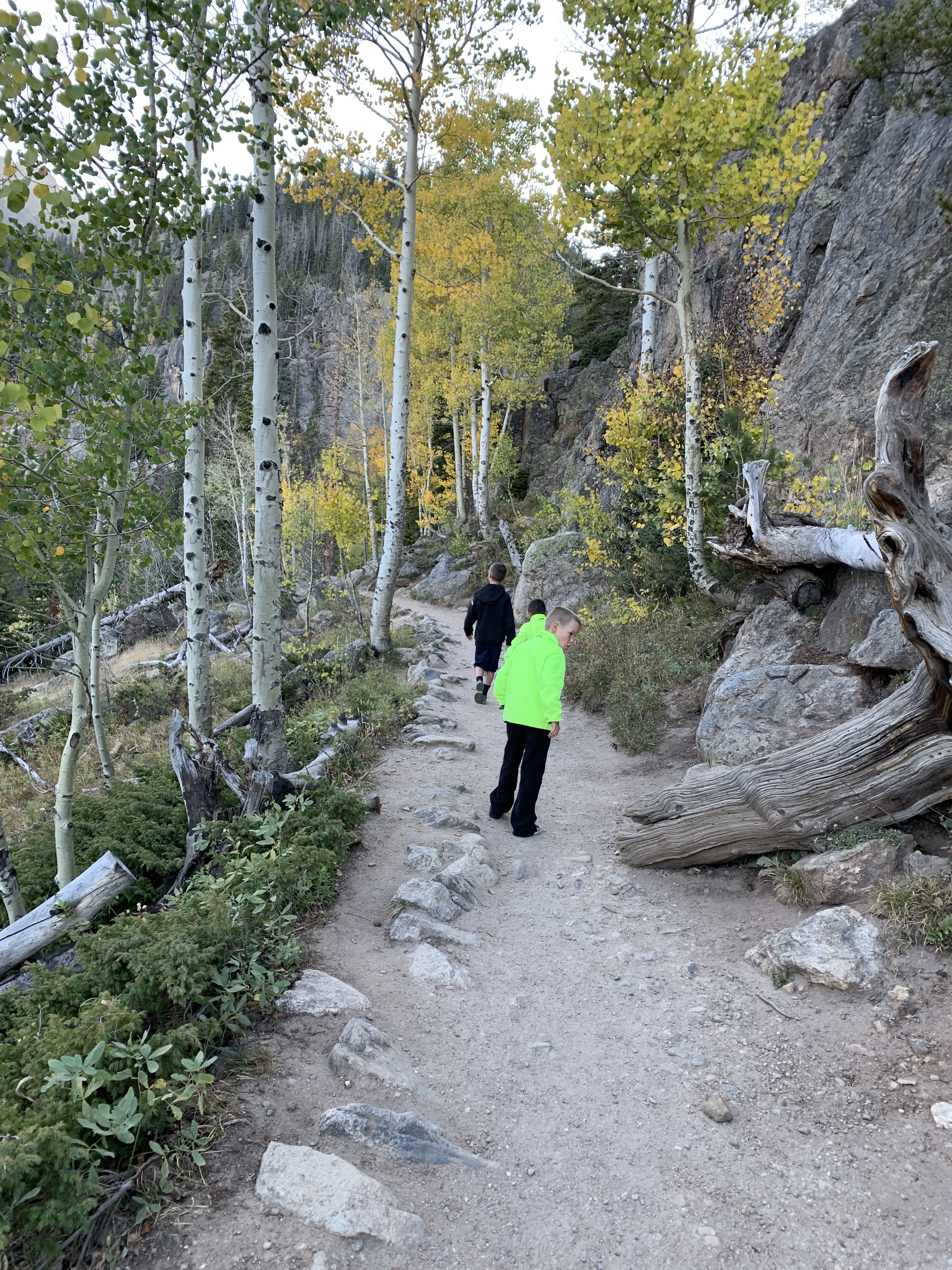 Since we have Thursday evenings free and open we decided to head up to Rocky Mountain National Park and go for a hike to see the leaves changing. We got there late enough in the afternoon that many people were headed out so we were able to park at the Bear Lake trailhead. We decided to hike to Nymph Lake and Dream Lake. The evening was cool but it was gorgeous and the sun was shining when we started out with blue sky. The trees were a beautiful golden color as well.