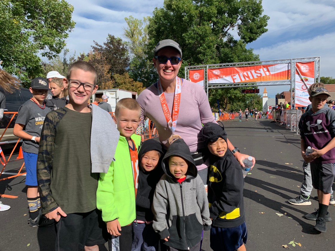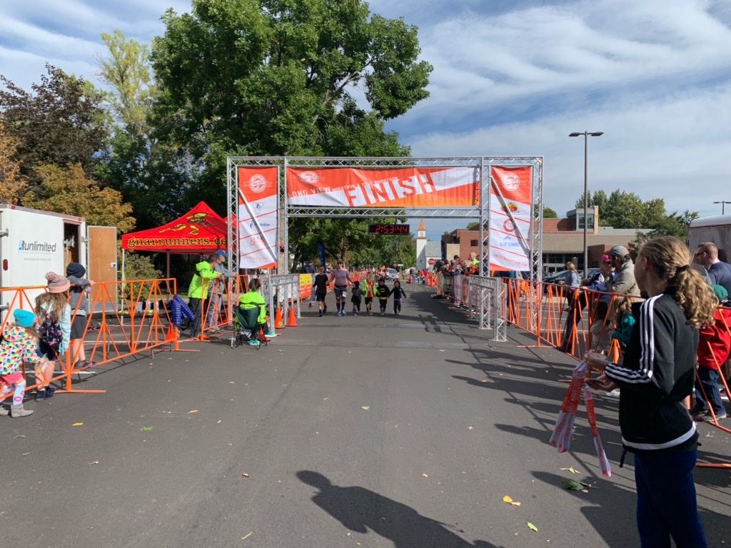 Clint and the kids were waiting for me at the finish line, and after handing the library books off to Clint that they had checked out while waiting for me, they grabbed hands and ran the last few yards over the finish with me. The time displayed in the photo was not my time, the clock was set for the marathon race which had started 40 some minutes prior to my race. We took some photos and the kids admired my finisher medal.