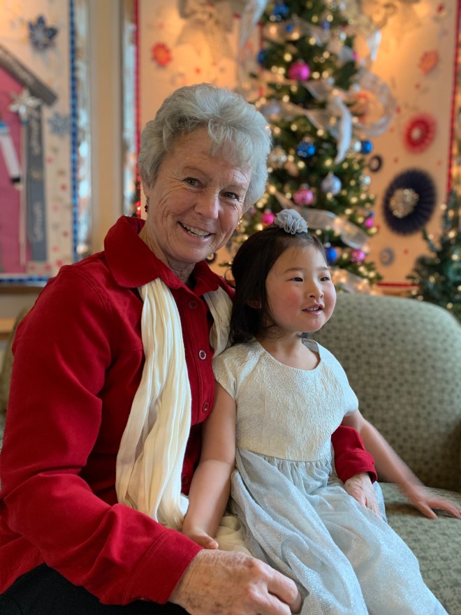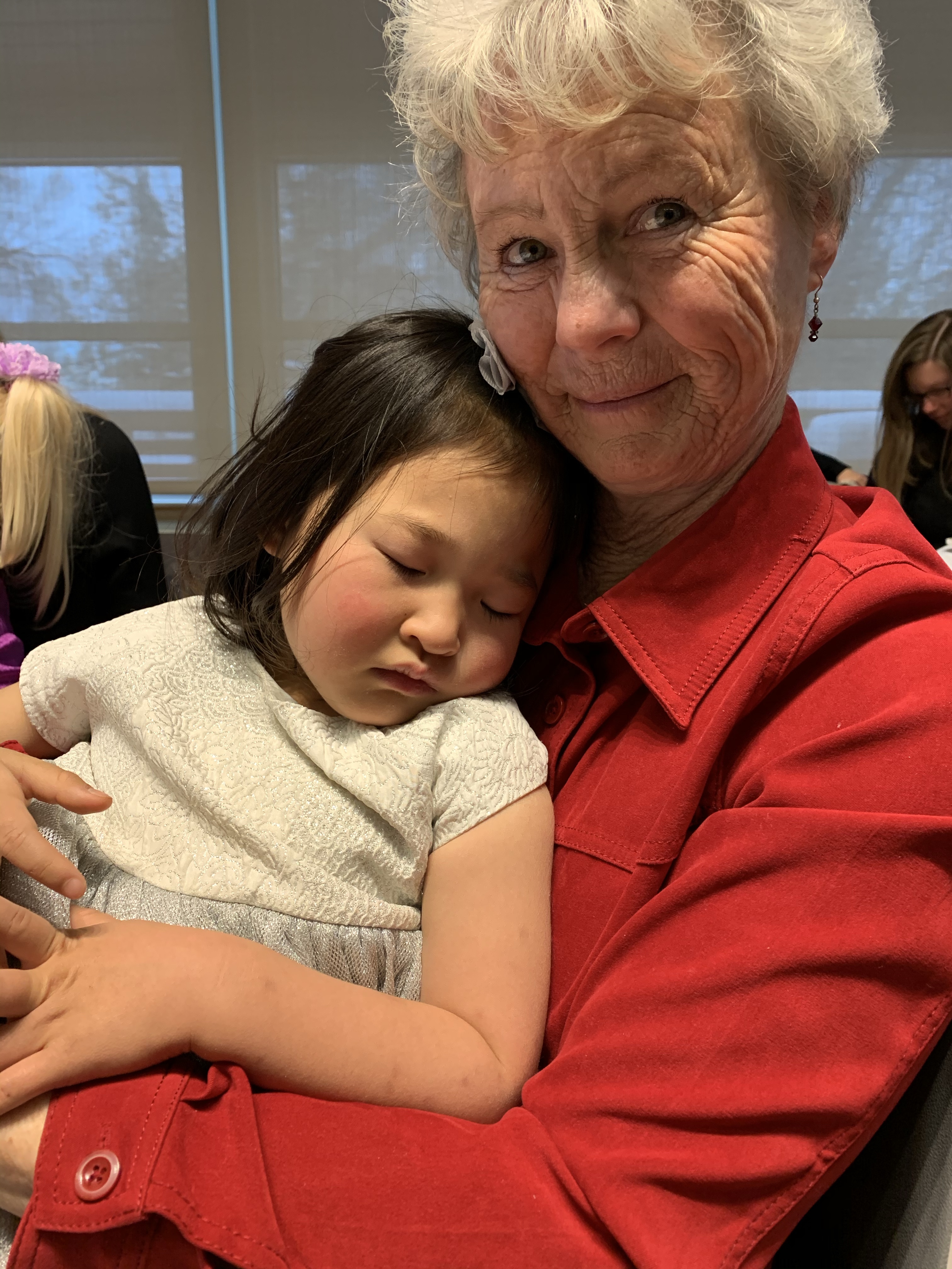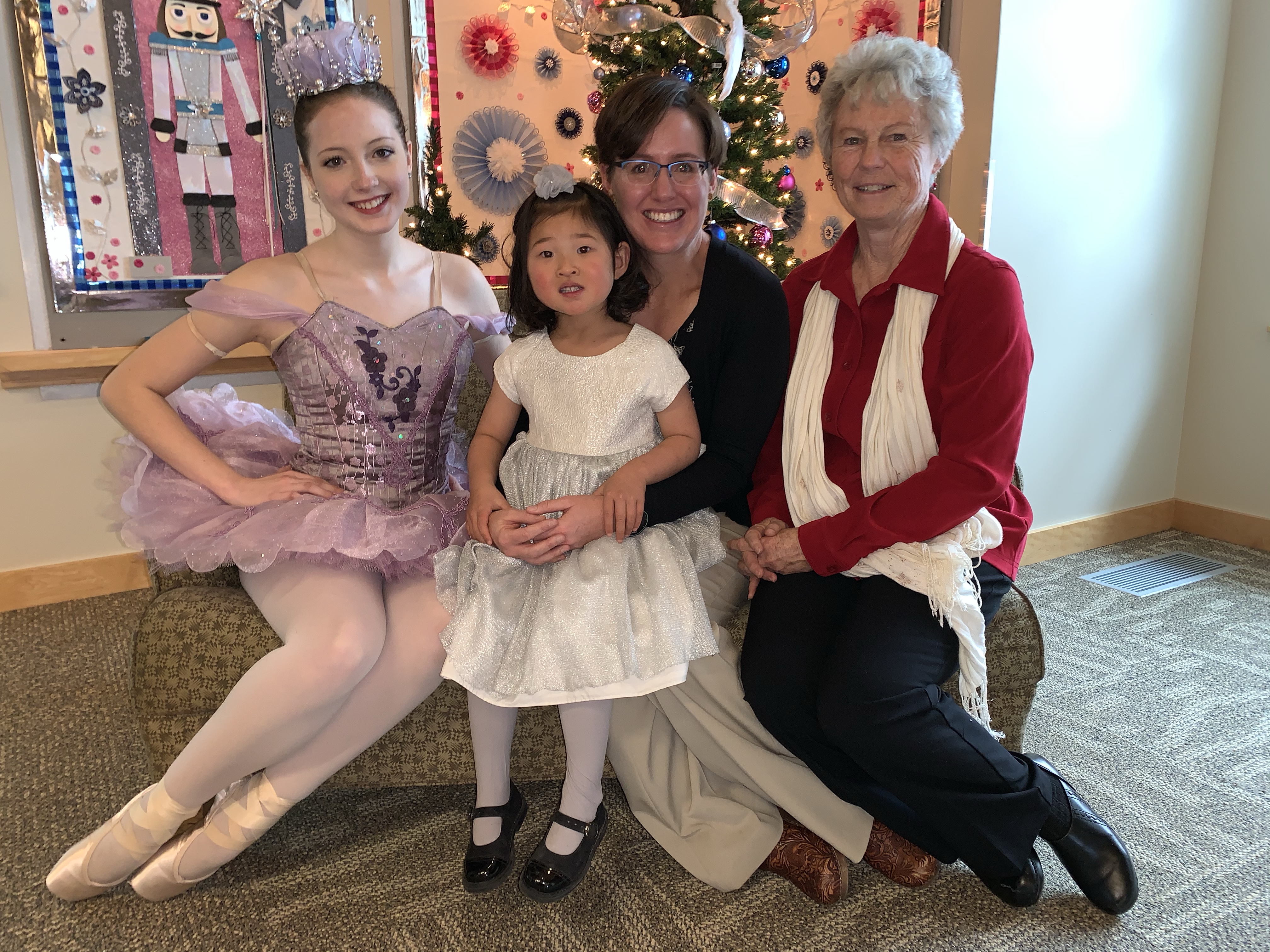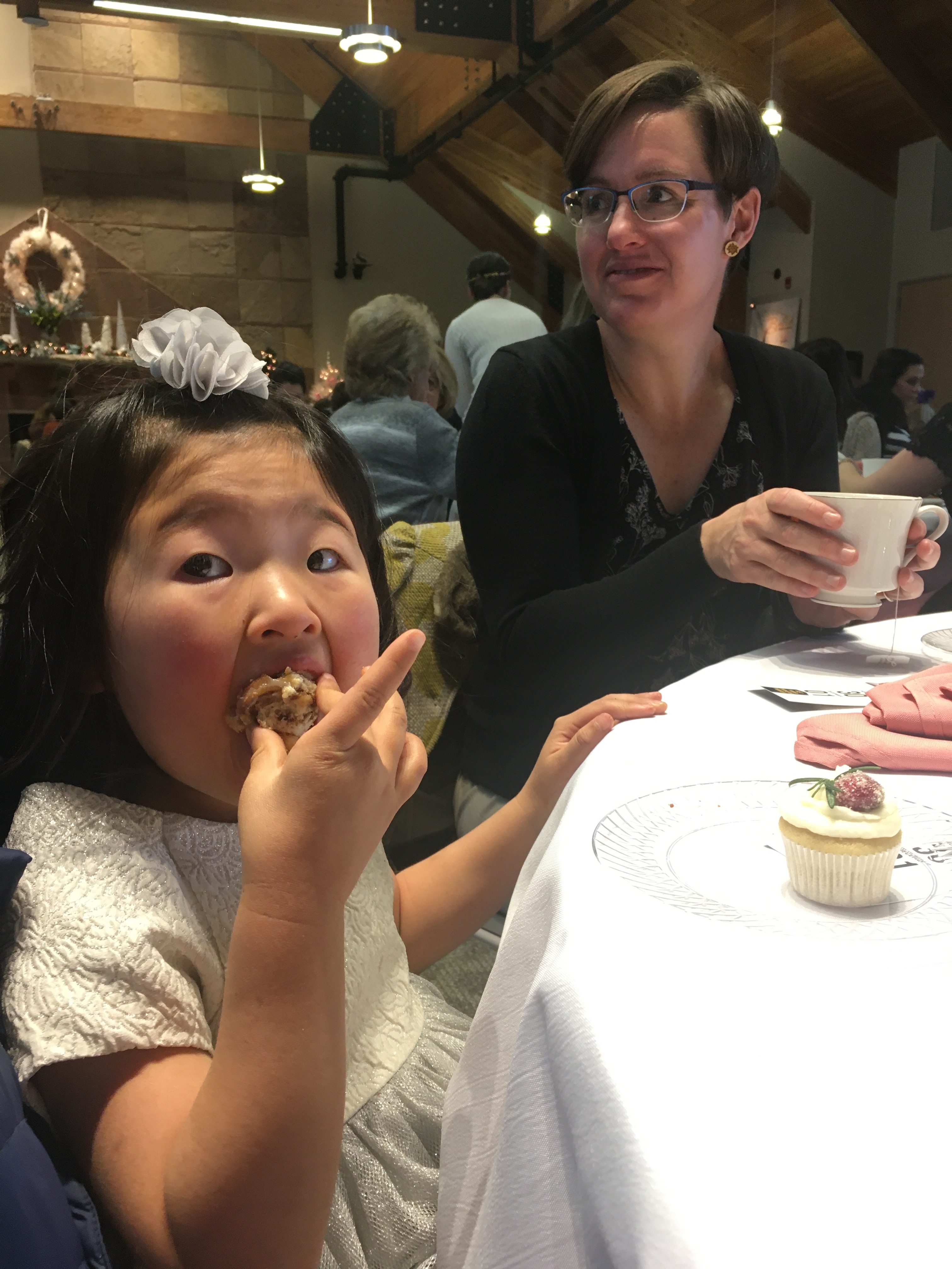 On Saturday my mom, Coppelia, and I got to have a girls day. We dropped off goodies for the Sugar Plum Tea, and then did a little Christmas shopping. This year everyone in our family is picking out an ornament that we will wrap up and then unwrap on Christmas eve and put on our tree. So we went shopping for Coppelia to pick out her ornament and because we needed a few things for Christmas decorations. We then went out to lunch together which was fun and then headed to the Sugar Plum Tea Party. Coppelia has been excited about it for months and has asked me a number of times “when I go tea party with mommy and Honey?” (our kids call my mom “Honey”). The Sugar Plum Tea Party is put on by the company that Caedmon dances with. They decorate a beautiful room and serve a very fancy tea with real china and tea cups. And they serve all sorts of yummy treats. They then let everyone take photos with the Sugar Plum Fairy and then do a mini narrated Nutcracker. We had a great time, and ultimately by the end Coppelia had fallen asleep in my mom’s arms. Sometimes tea parties are just too much for little girls.