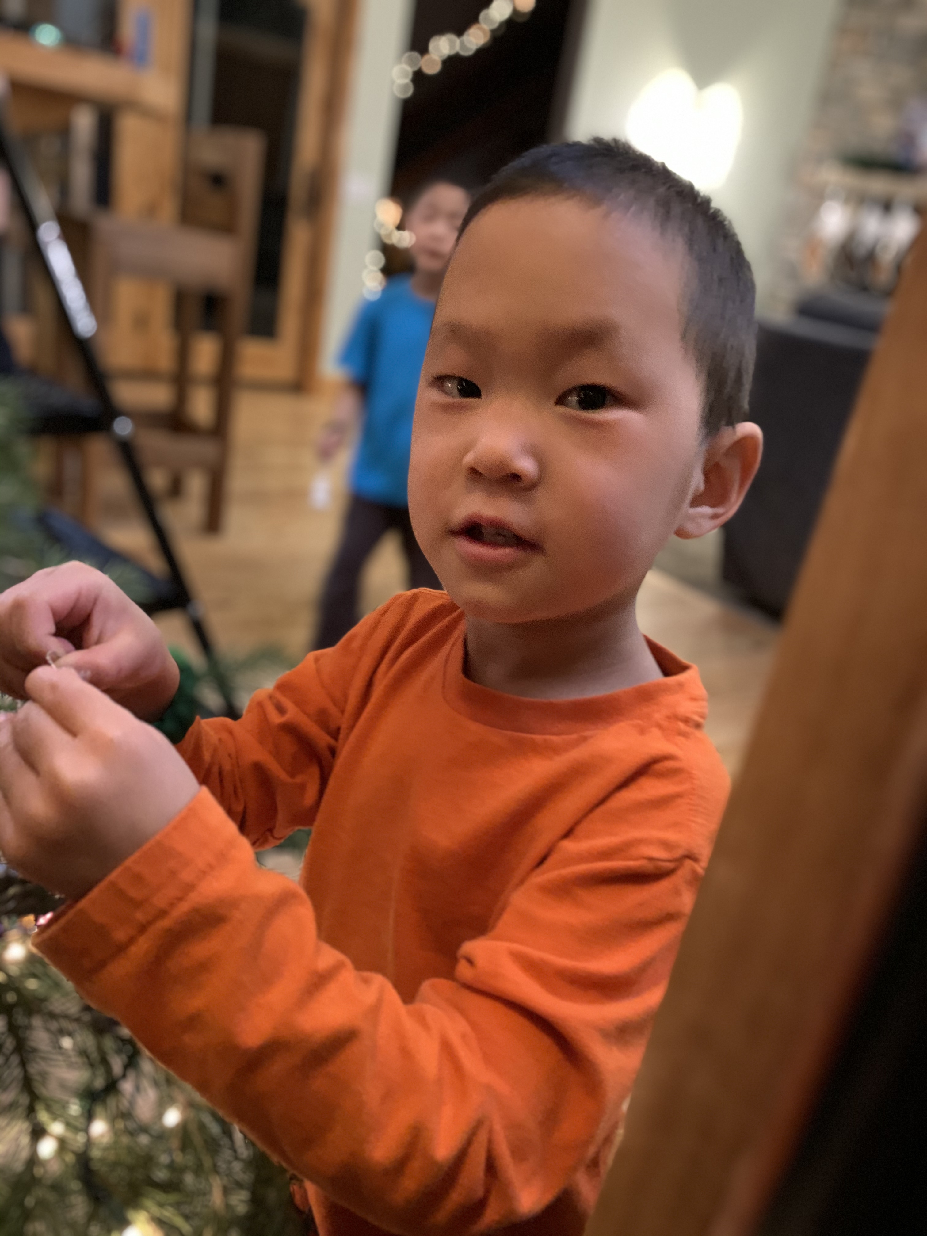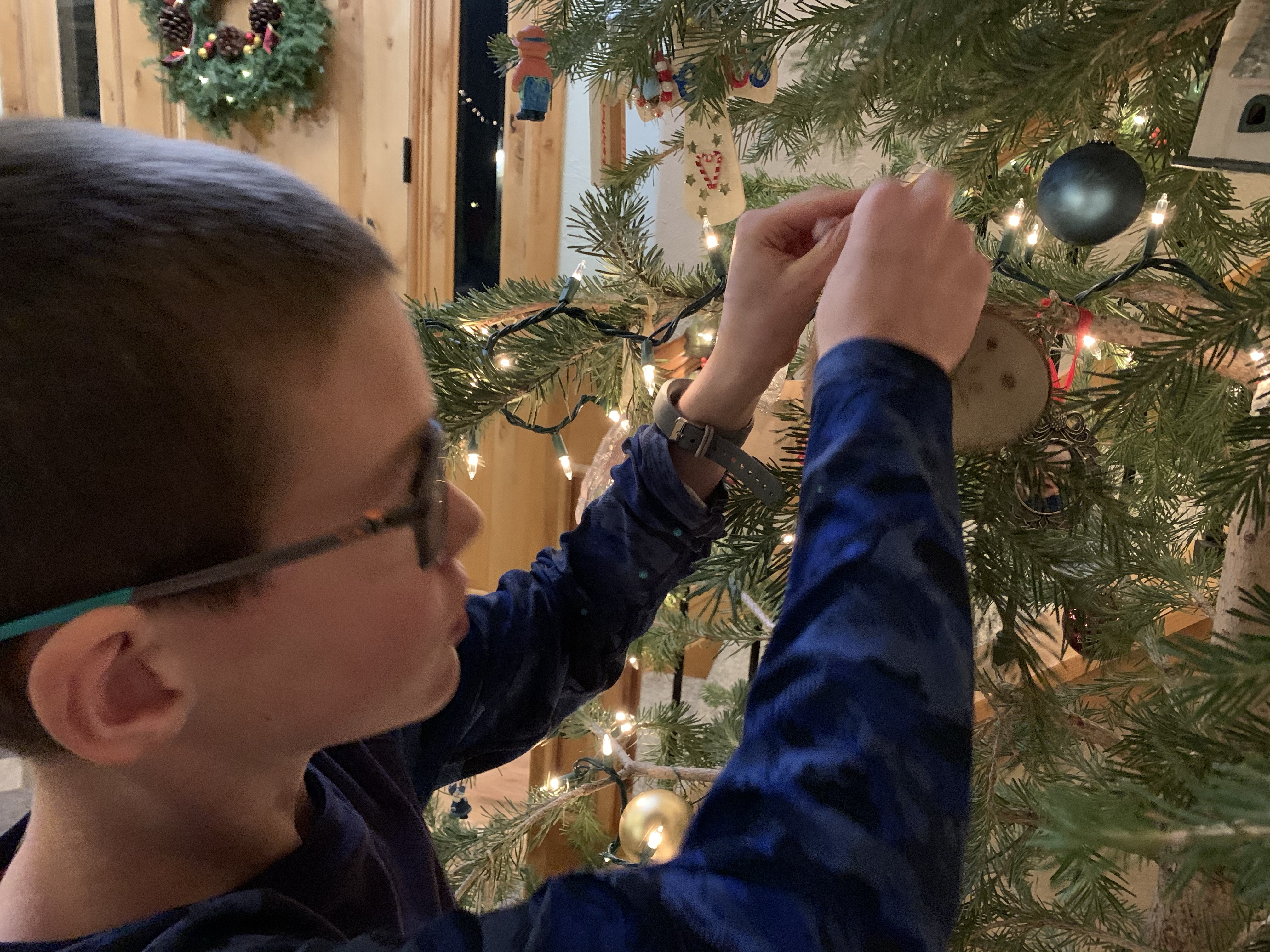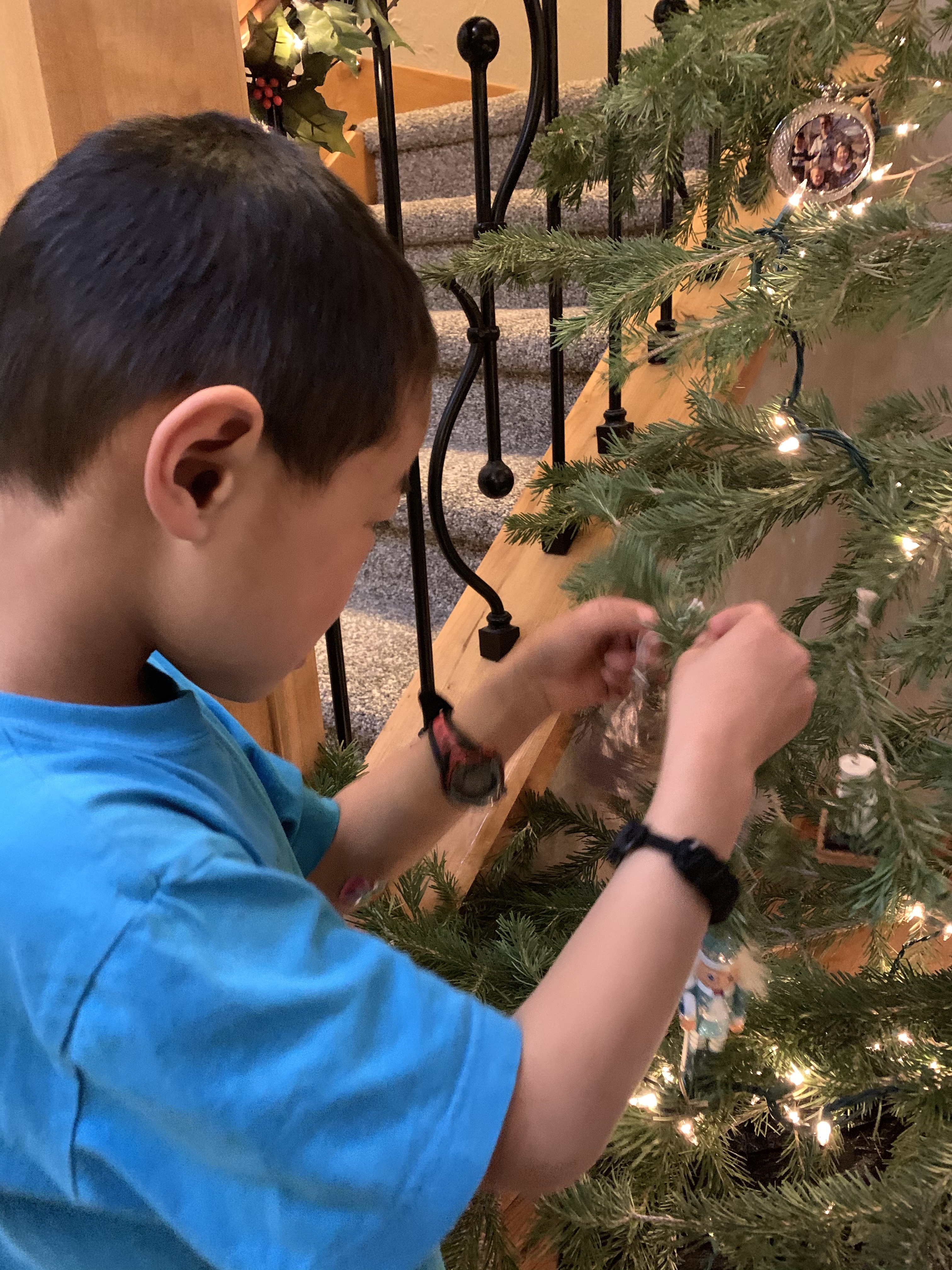 So after we let the tree warm up and all the snow to melt off it for a day, we decorated it. Somehow I didn’t get many photos of the decorating process because everyone was so busy decorating and hanging ornaments. The really nice things with our new location for the tree, we can use the stairs to our advantage with the decorating. In the end the tree was beautifully decorated.