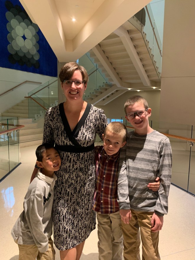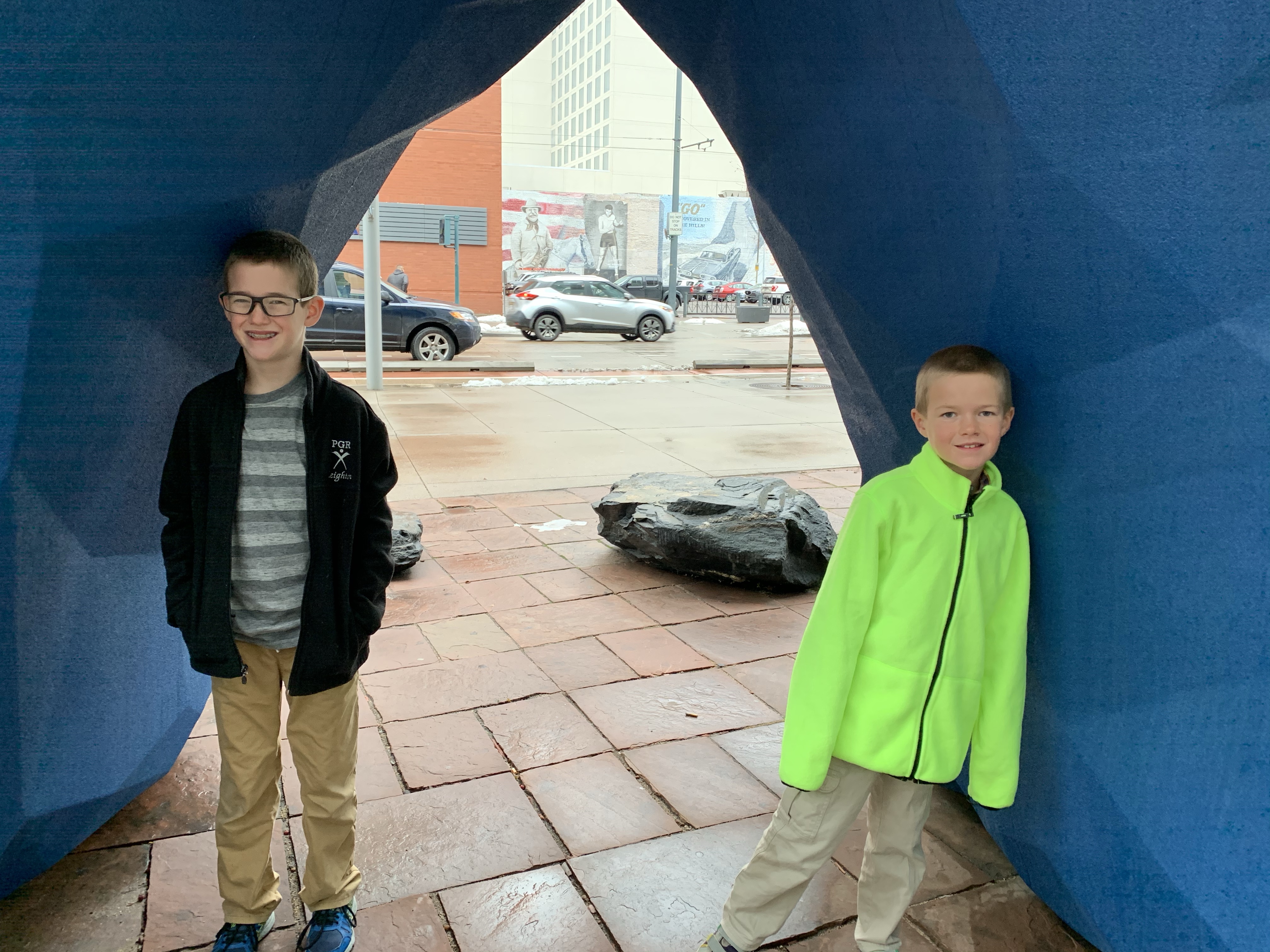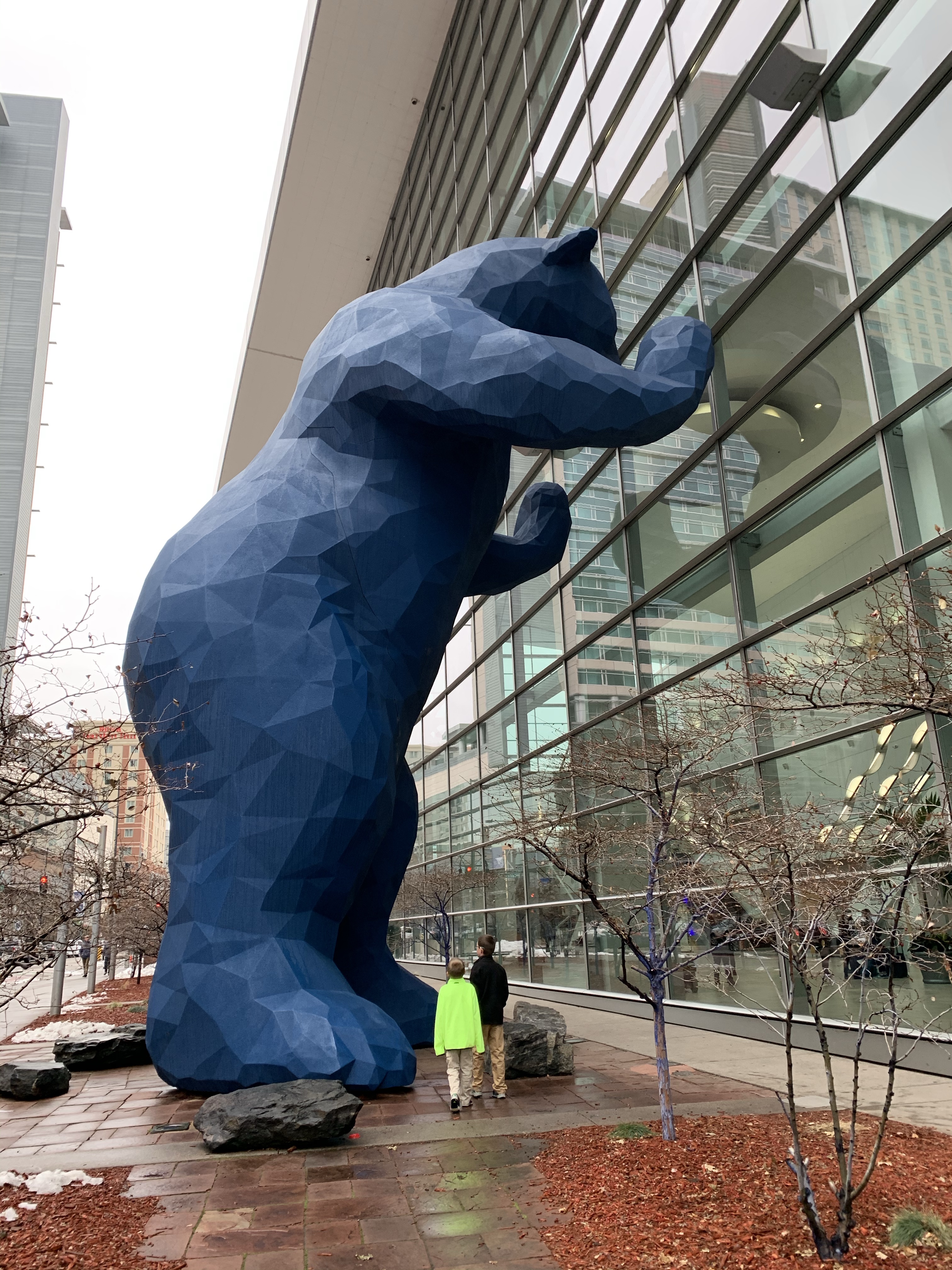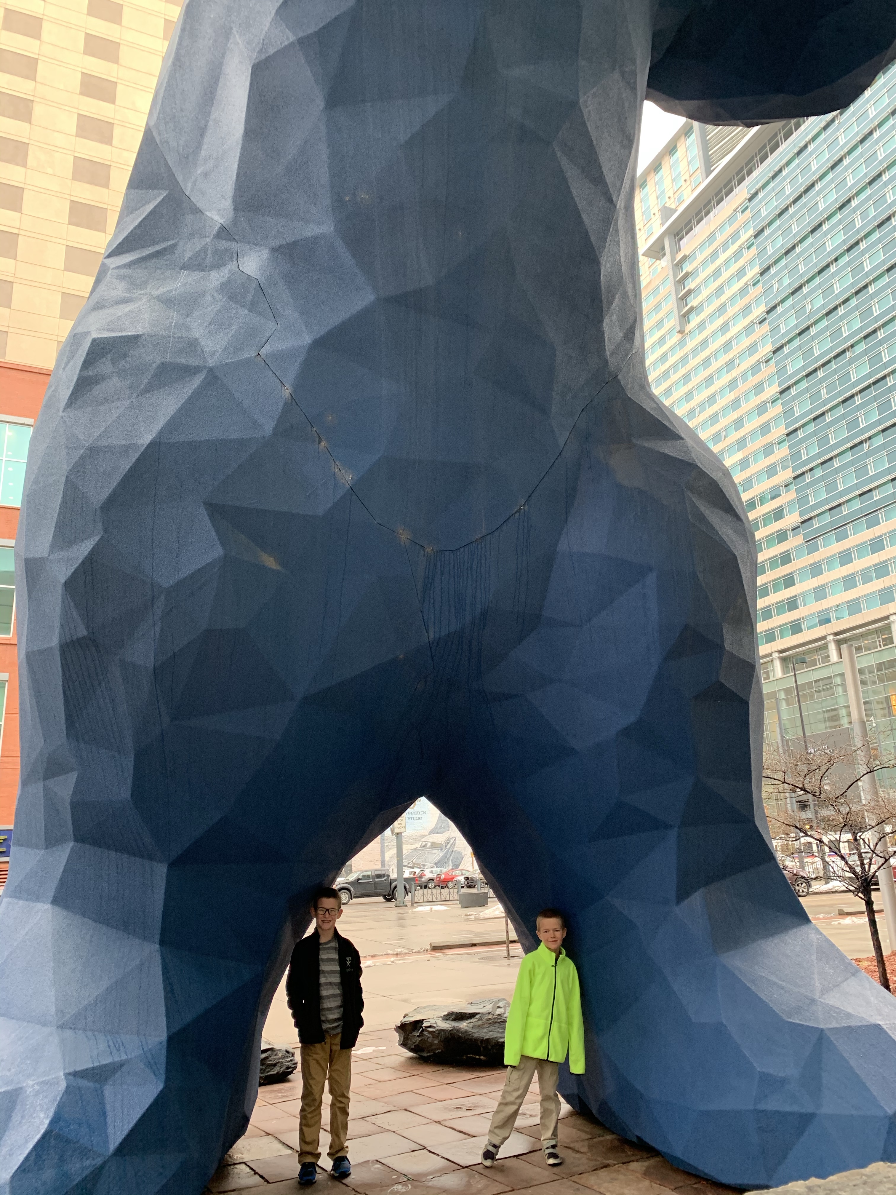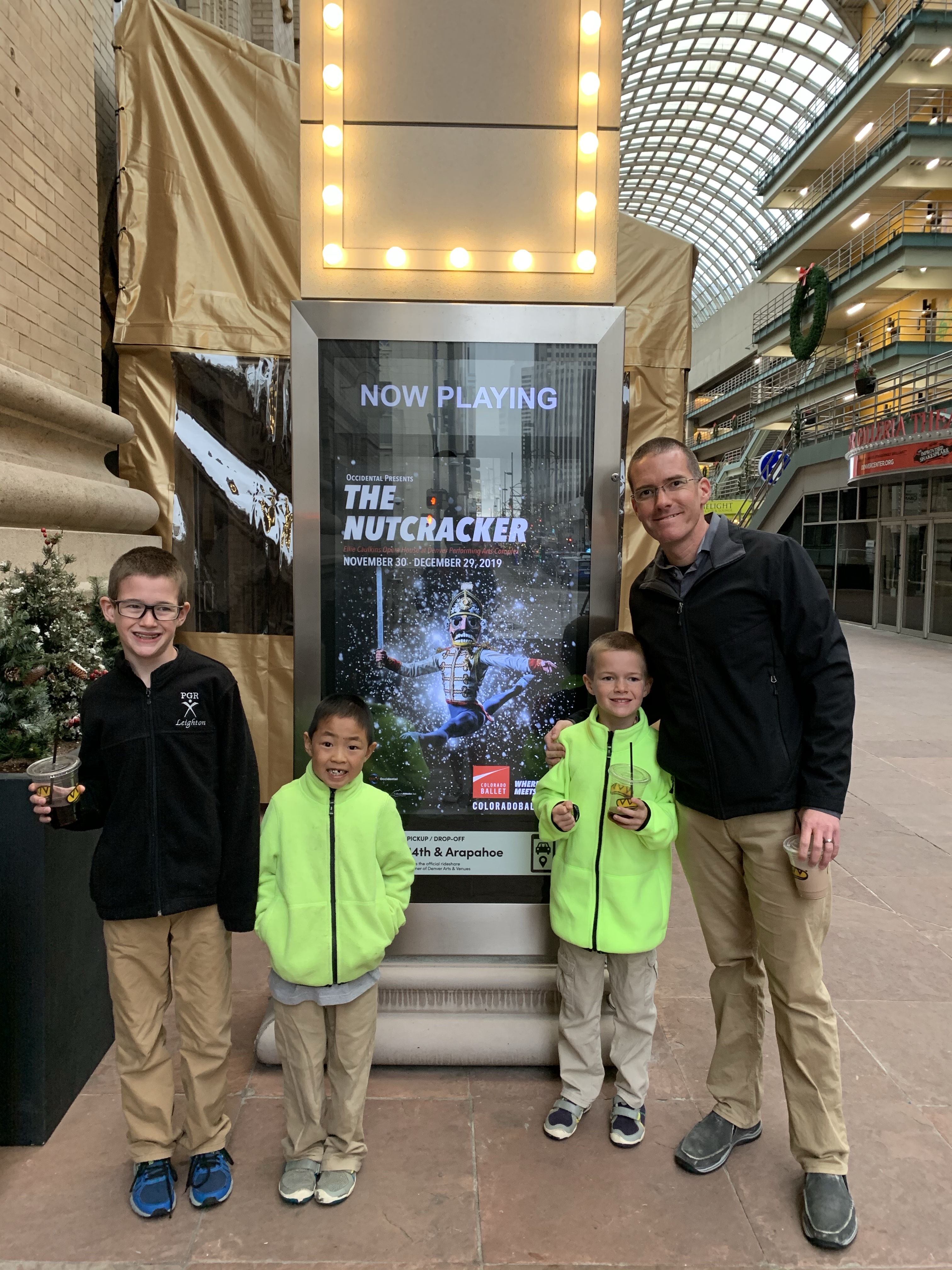 Last Thursday 5 of us got to go down to Denver and watch a mid day performance of Colorado Ballet’s Nutcracker. We got tickets through Caedmon’s dance company and had a great day. The 2 littles had preschool and then got to spend the afternoon with Honey and Grandpa so they had a great day as well. Our seats were pretty high up but we could see the whole stage from where we were at which was really great. The boys all had fun. Caedmon sat on my lap the entire time, “so he could see” and I know those years are slowly coming to a close to where he’ll sit on my lap. I told him one day maybe he’ll be the one of the stage and he said “yeah, I want that”. There were some differences between the Colorado Ballet and the version that Caedmon does, but I think all the boys still loved the mouse scene as their favorite. It was a chilly day but we headed to a sandwich place for lunch after the performance which everyone enjoyed. Caedmon, Leighton and I even checked out the big blue bear at the Convention Center while Clint and Edric were doing some quick Christmas shopping. It was a fun day and enjoyed by all.