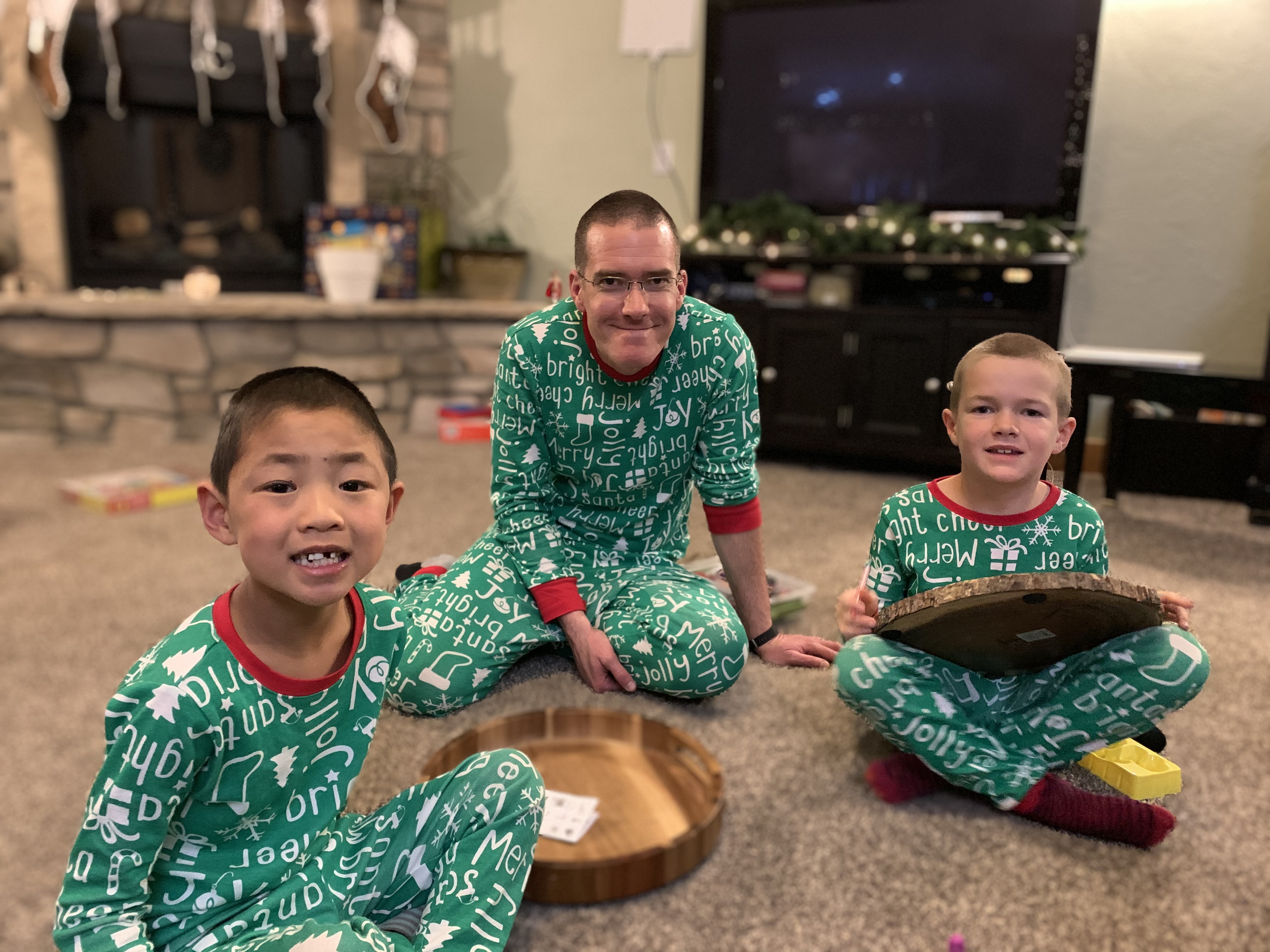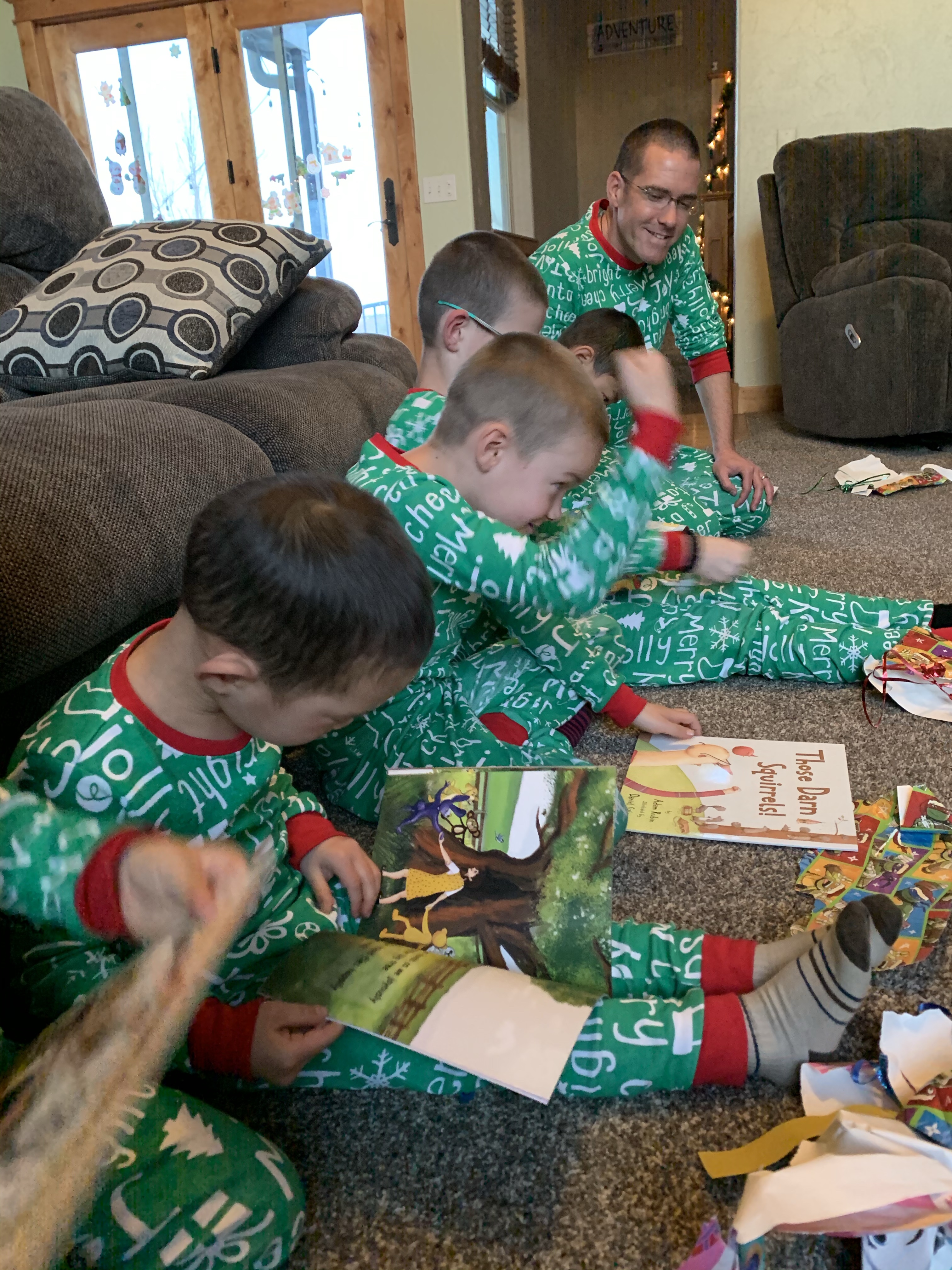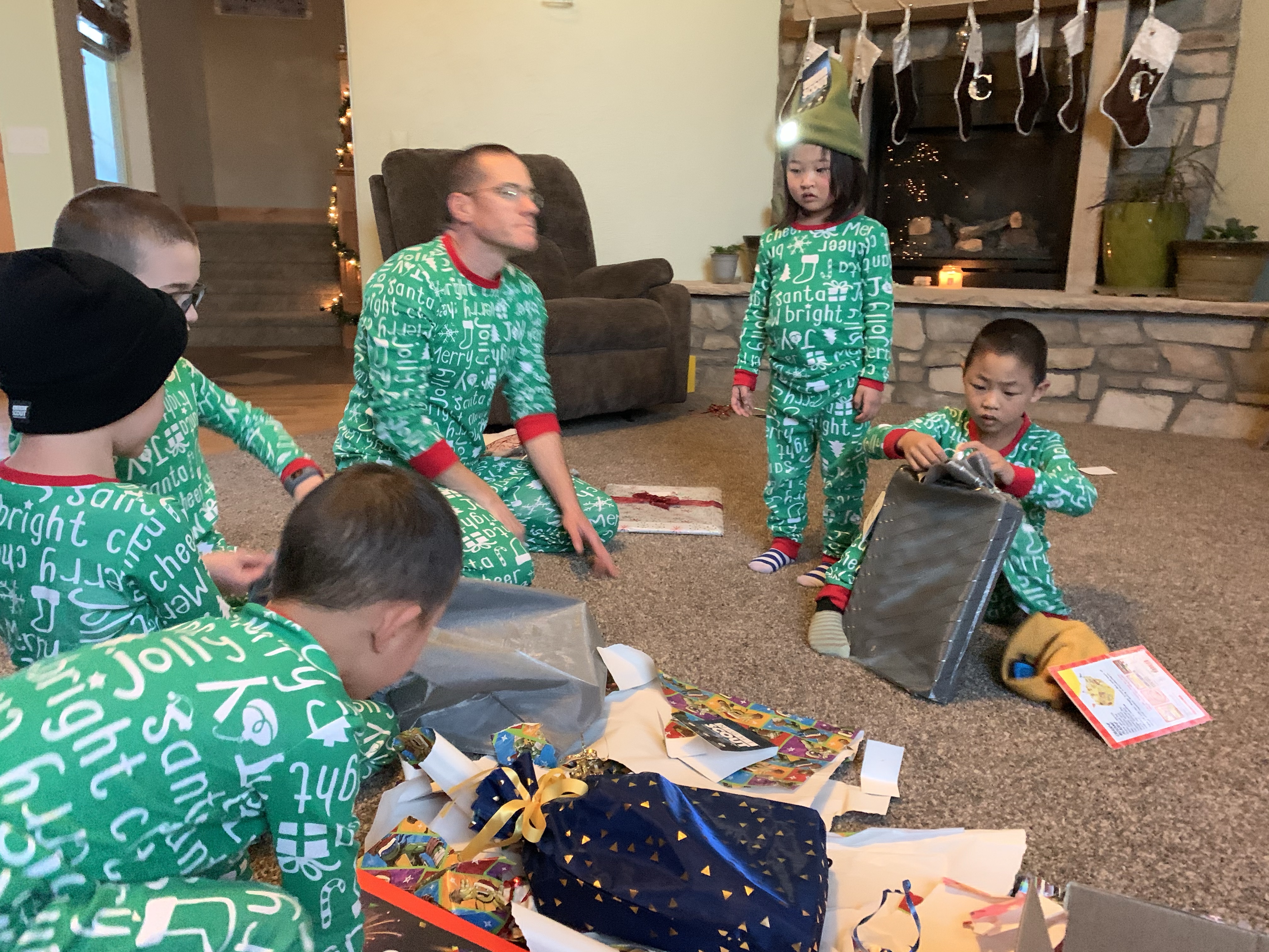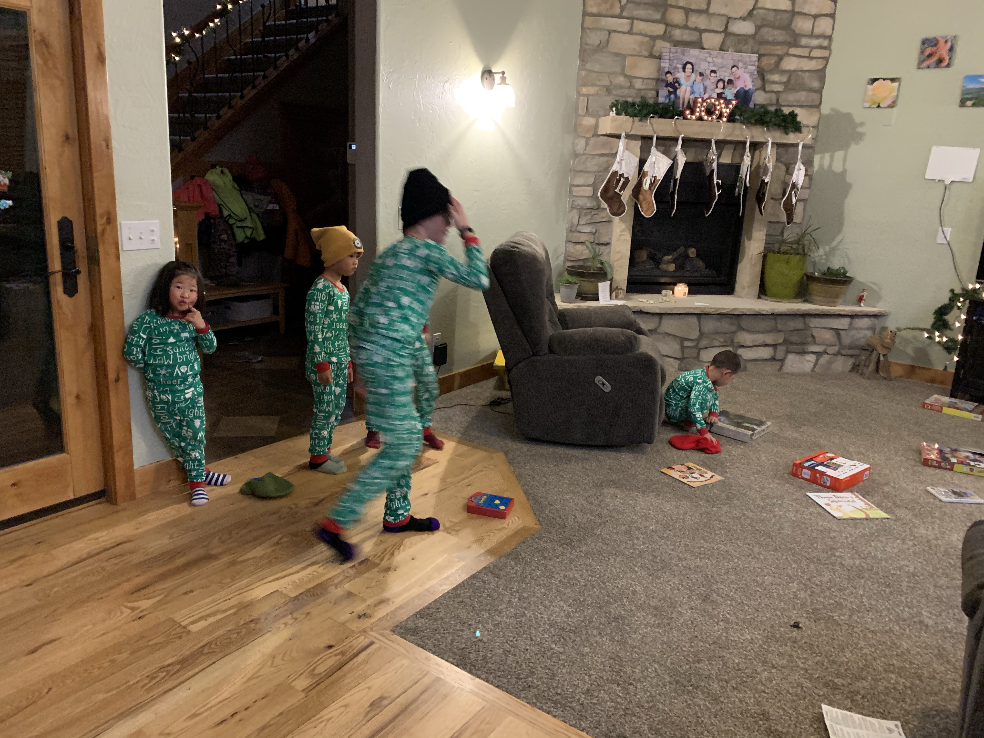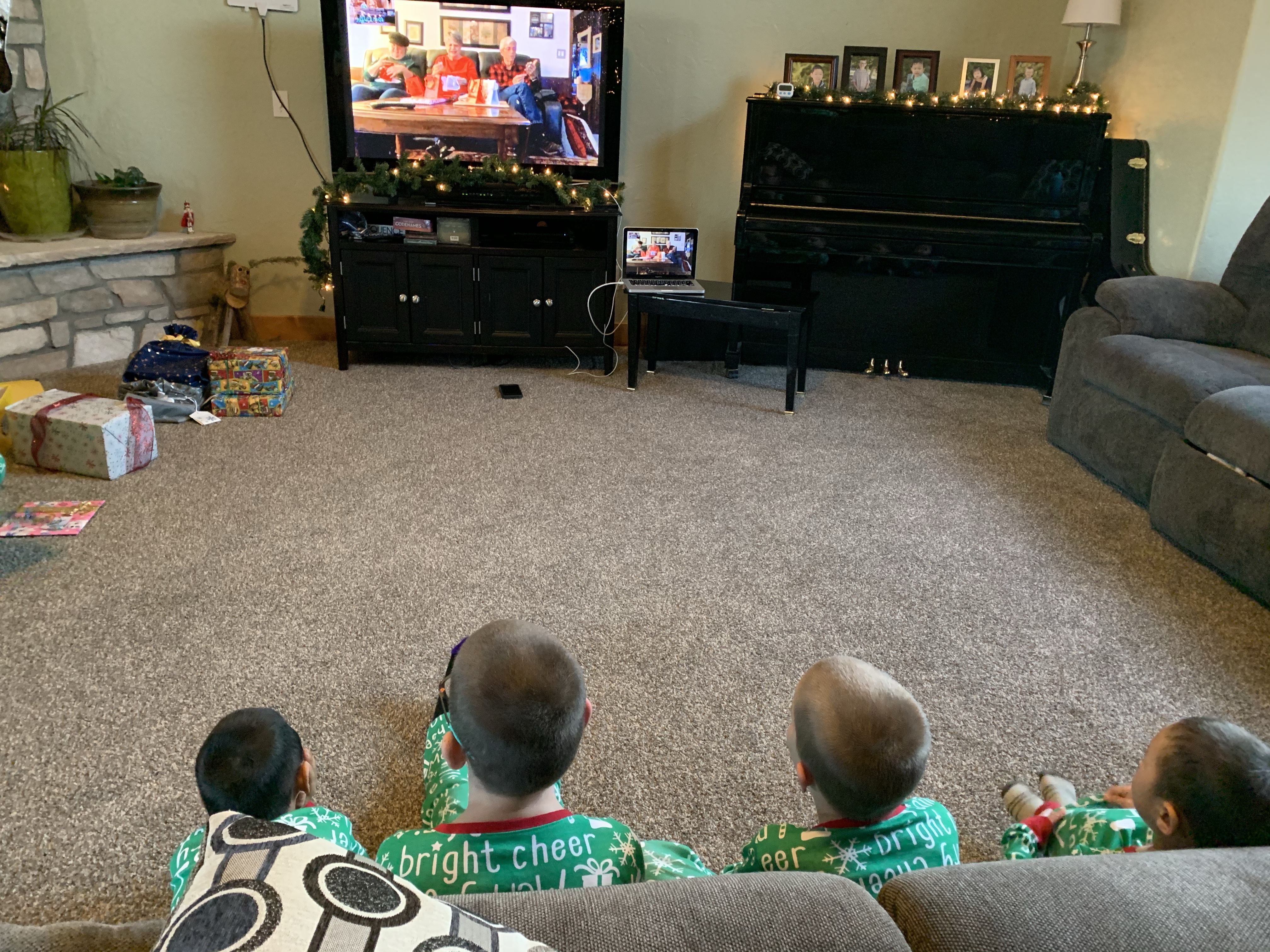 We did things a little different than usual this year for Christmas Eve and it was kind of a decision in the 11th hour to do so. I love going to church on Christmas Eve, it is one of my favorite services every year, even though we’ve had some adventures during such services, like when Leighton lite his hair on fire during the candle light part one year or when Caedmon in his little fire truck jammies joined Clint on stage while Clint was singing and danced all around him (with Clint not even knowing) when he was 20 months old. However because I was working night shifts the 22nd and 23rd and getting off the morning of the 24th it would mean that I wouldn’t get much sleep at all in order to get up and do Christmas Eve with Clint’s parents, then hurry around for dinner and changing everyone into nice clothes and then rushing off to church and inevitably making everyone cranky. Which is not what I wanted. So we called an audible in the 11th hour and I slept more post nights and actually woke up feeling rested and like a human again which hadn’t happened in a long time. We were then able to have a relaxed facetime phone call with Clint’s parents and aunt for their gifts. The kids all voted on wearing their jammies which just made it fun.