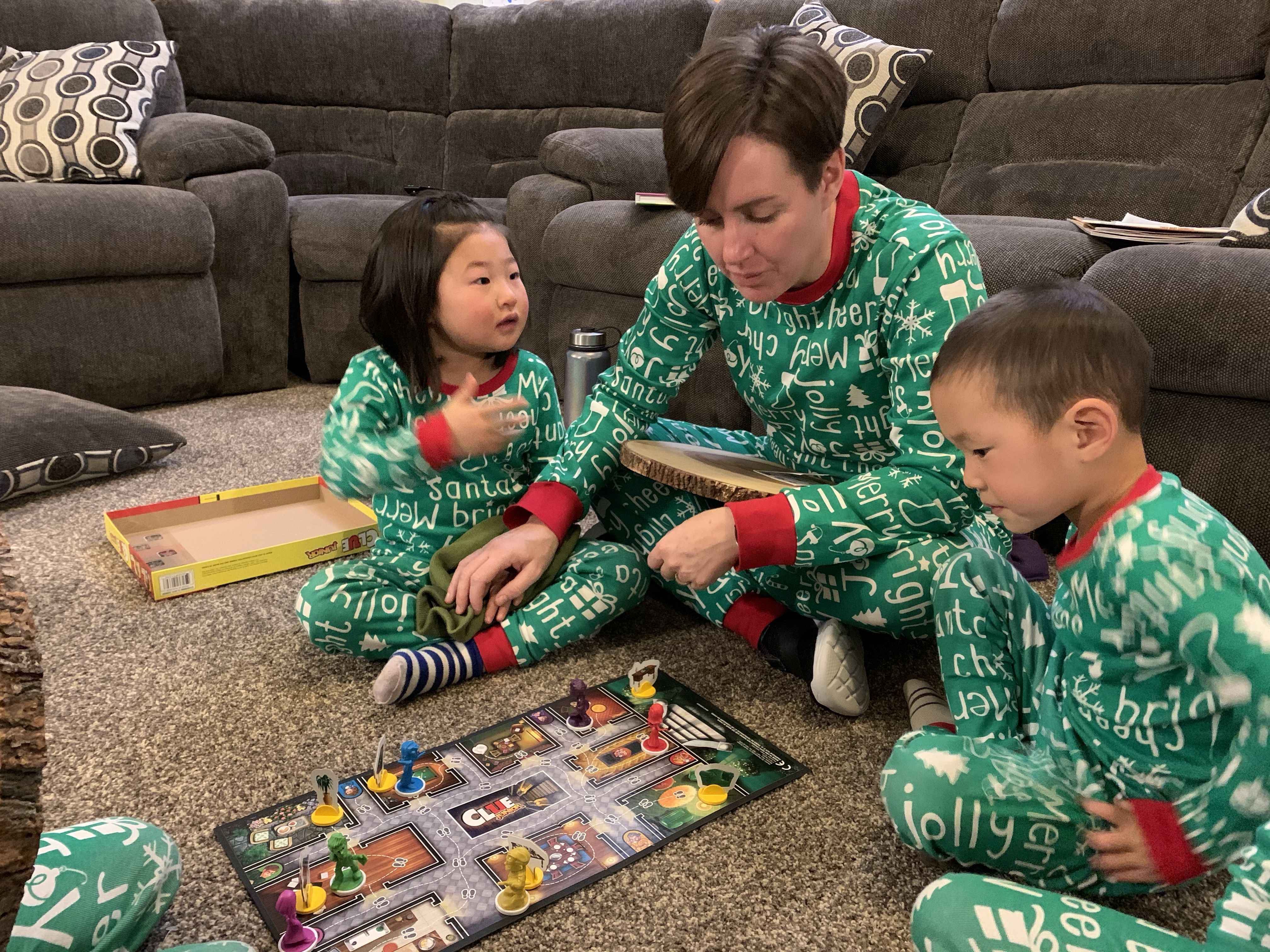 After doing facetime we had a picnic in the living room (because Clint had cleaned and had the dining room all set for Christmas dinner while I was sleeping). After dinner then we played Junior Clue and had a good time.