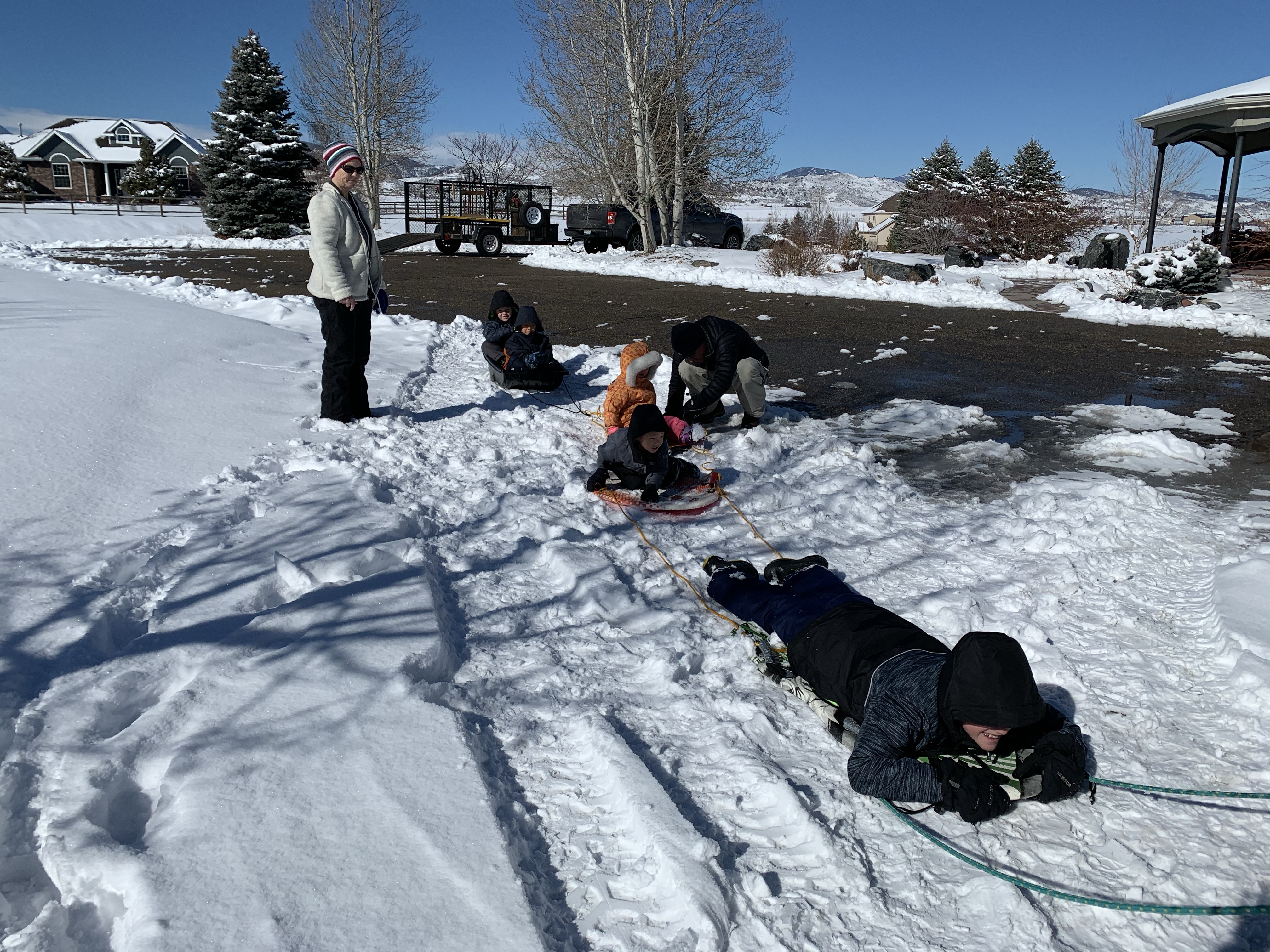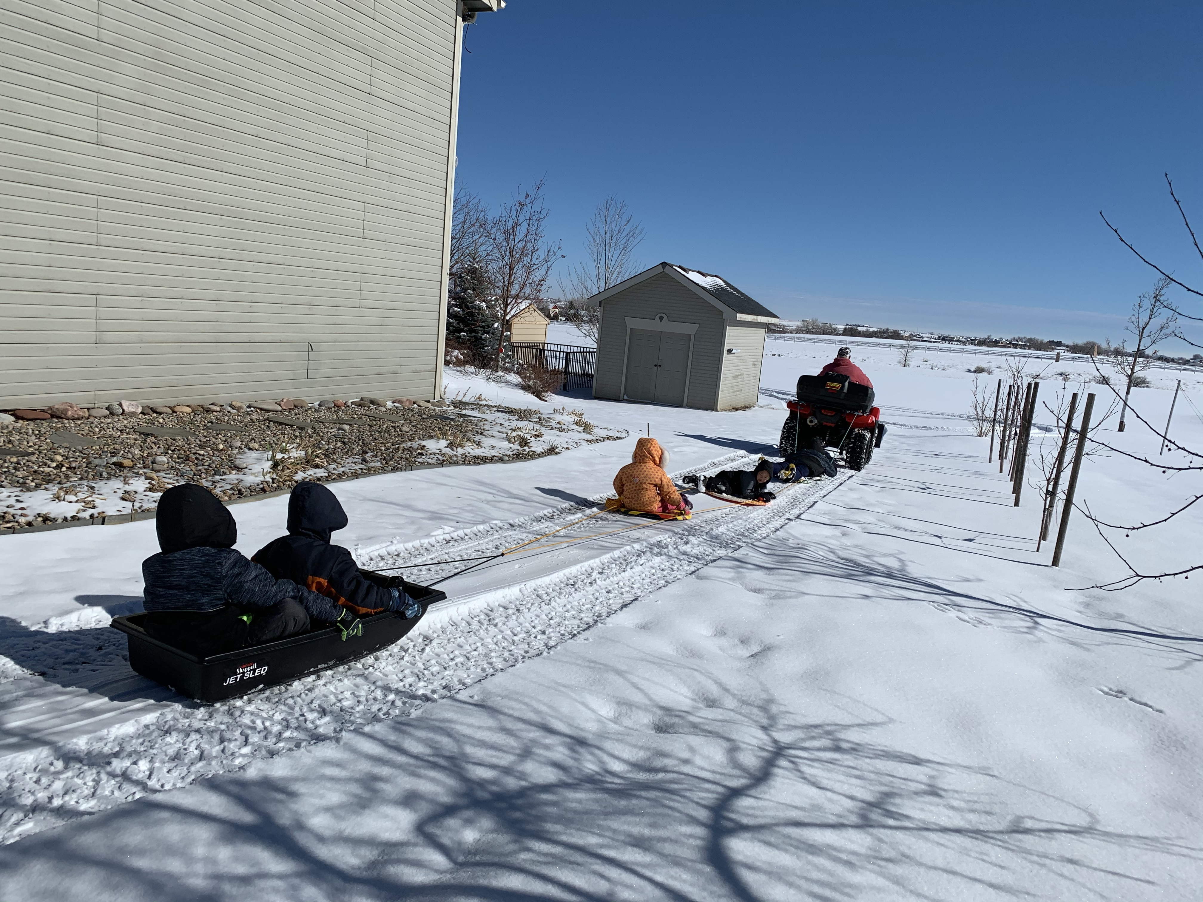 We have had a number of days with snow lately but Saturday morning the sun was out and it was a gorgeous day. Which made it a perfect day for my dad to come over and hook up the 4-wheeler and the sleds. I’m not sure who had the most fun, my parents or the kids. My mom was on one of the sleds for a bit as well with the kids and it was so fun to hear them all giggling and laughing and having fun.