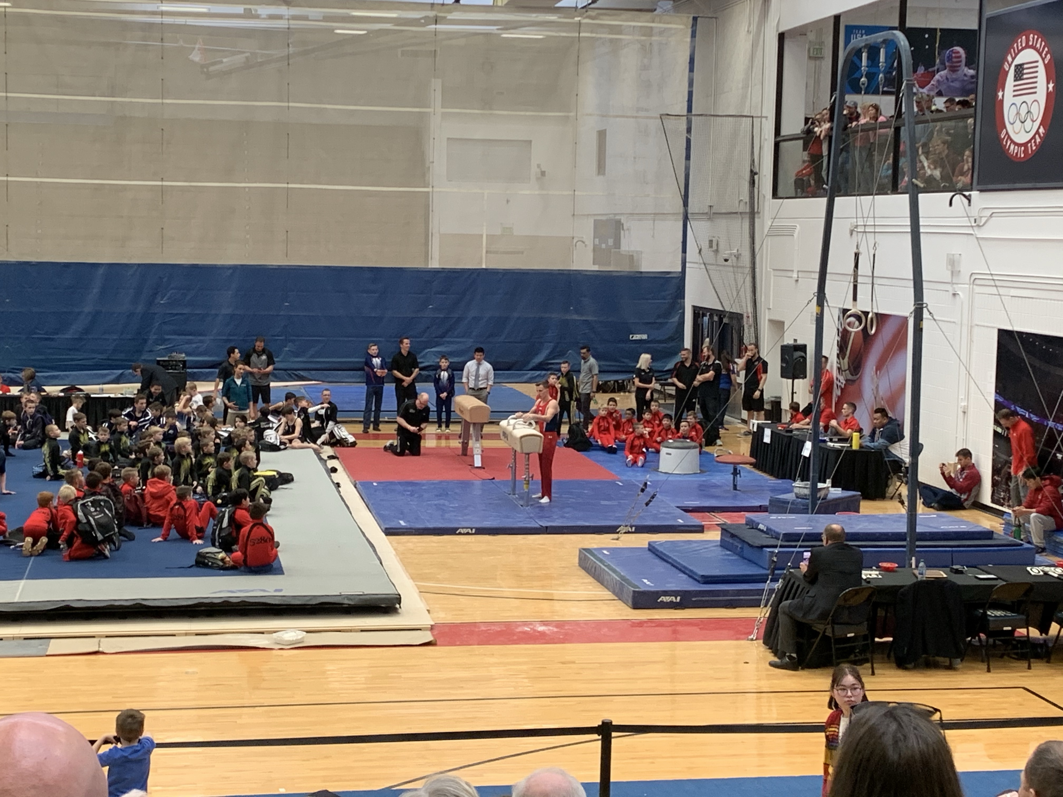 Leighton had a gymnastics meet at the Olympic Training Center in Colorado Springs this past weekend. It was scheduled for early Saturday morning so we went down Friday afternoon/evening and stayed at an ARBNB townhome. We got there and got settled and played some games and had a relaxing evening. Apples to Apples is a great game and everyone had fun playing. We were up early Saturday morning for the meet and Leighton had quite the cheering crowd for his meet. He didn’t do as well as he wanted to but he is getting better on each even with every meet and his scores went up even if he didn’t place. We had some long talks after the meet because he was pretty upset, but I think its been a good learning experience for him with that. At the end of his competition while the scores were all being tallied and figured some of the guys from the national team came out and warmed up and practiced. Eddie Penev who was one of the guys at the clinic that Leighton went to in November did his Pommel Horse routine in front of all the boys to practice it for the Winter Cup Competition that he has this week. Sam Mikulak, Robert Neff, Adrian De Los Angeles, Kanji Oyama and Donnell Whittenburg were all there practicing which the boys really liked seeing and watching. After we grabbed a quick lunch that we had packed we took a tour of the Olympic Training Center. Our tour guide was Ryan Boyle who is a ParaOlympic Cyclist and won the world championships and won a silver in the Time Trial in the 2016 Olympics and is training to make the 2020 US ParaOlympic team. He took us on a tour and we saw the pool, the resident dorms and cafeteria, the weight gym, the wrestling gym, and the indoor shooting range as well. It was a really good tour. We finished the day off with ice cream which made everyone happy.