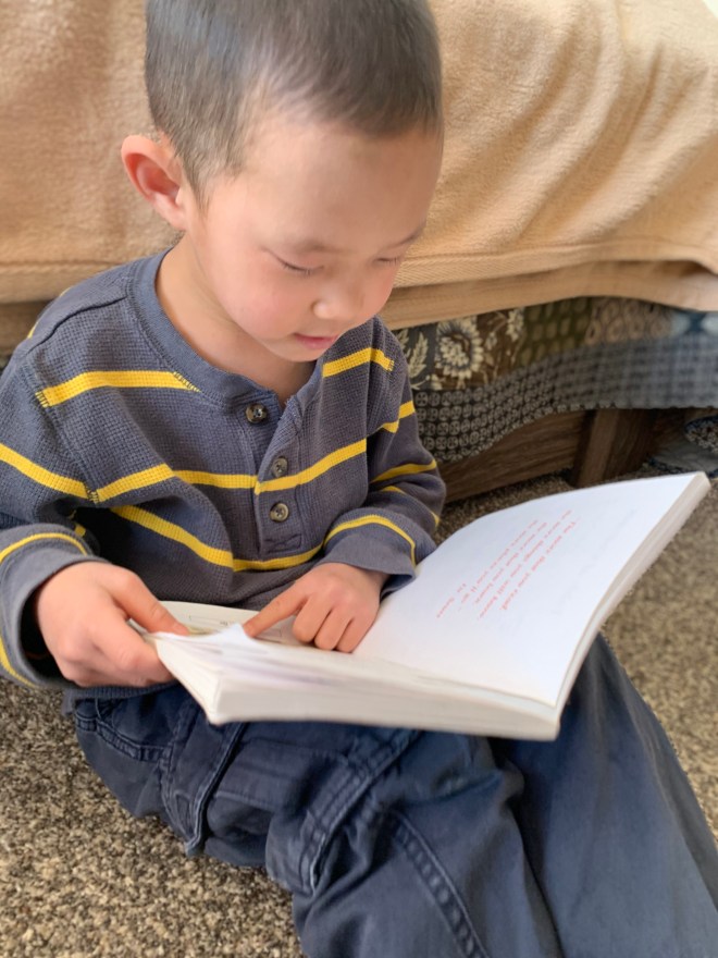 So Paxton decided to start reading. I’ve known that he knows all his letters and all the sounds for awhile but I decided to get an early reader book one evening down and just see how he did. Well he just took off. He quickly worked his way through “The rat is fat. The rat is Nat. The fat rat is Nat.” It was fun to see him read and just watch his eyes light up. He got the biggest grin on his face and carried the reading book with him the rest of the evening (he was a bit upset that I wouldn’t let him take it in the bath with him) and I’m pretty sure he slept with it in his bed. This past week for preschool they had to bring their favorite story books and so he took one of the little readers that he has been working on, and read his class all about Jim’s bad ham and bad jam and how Jim was mad about the bad ham and jam. Super fun to see him just take off and want to read. They have all approached reading so differently but whether it has been an easy thing or a difficult thing I hope they all enjoy reading throughout their lives.