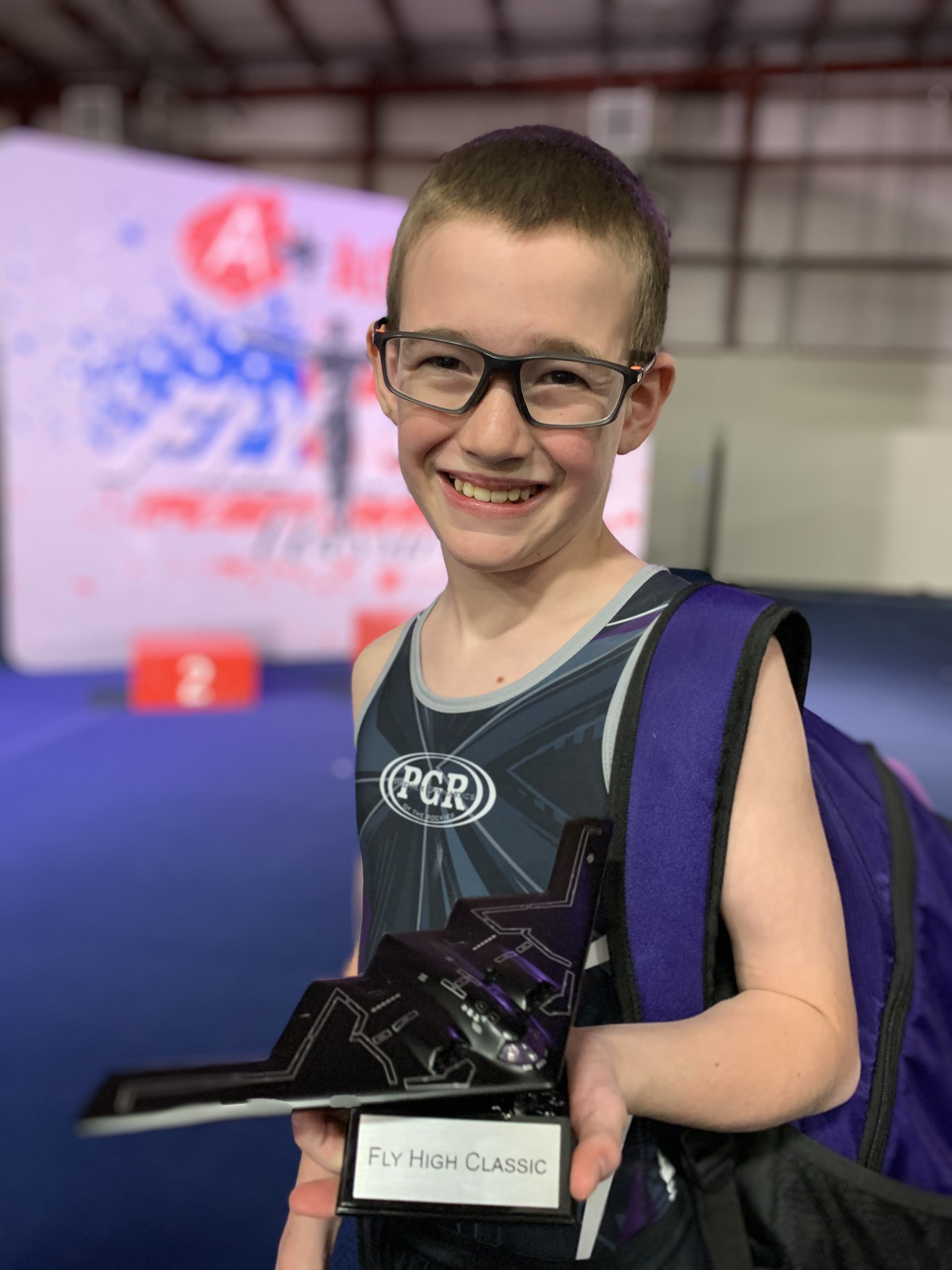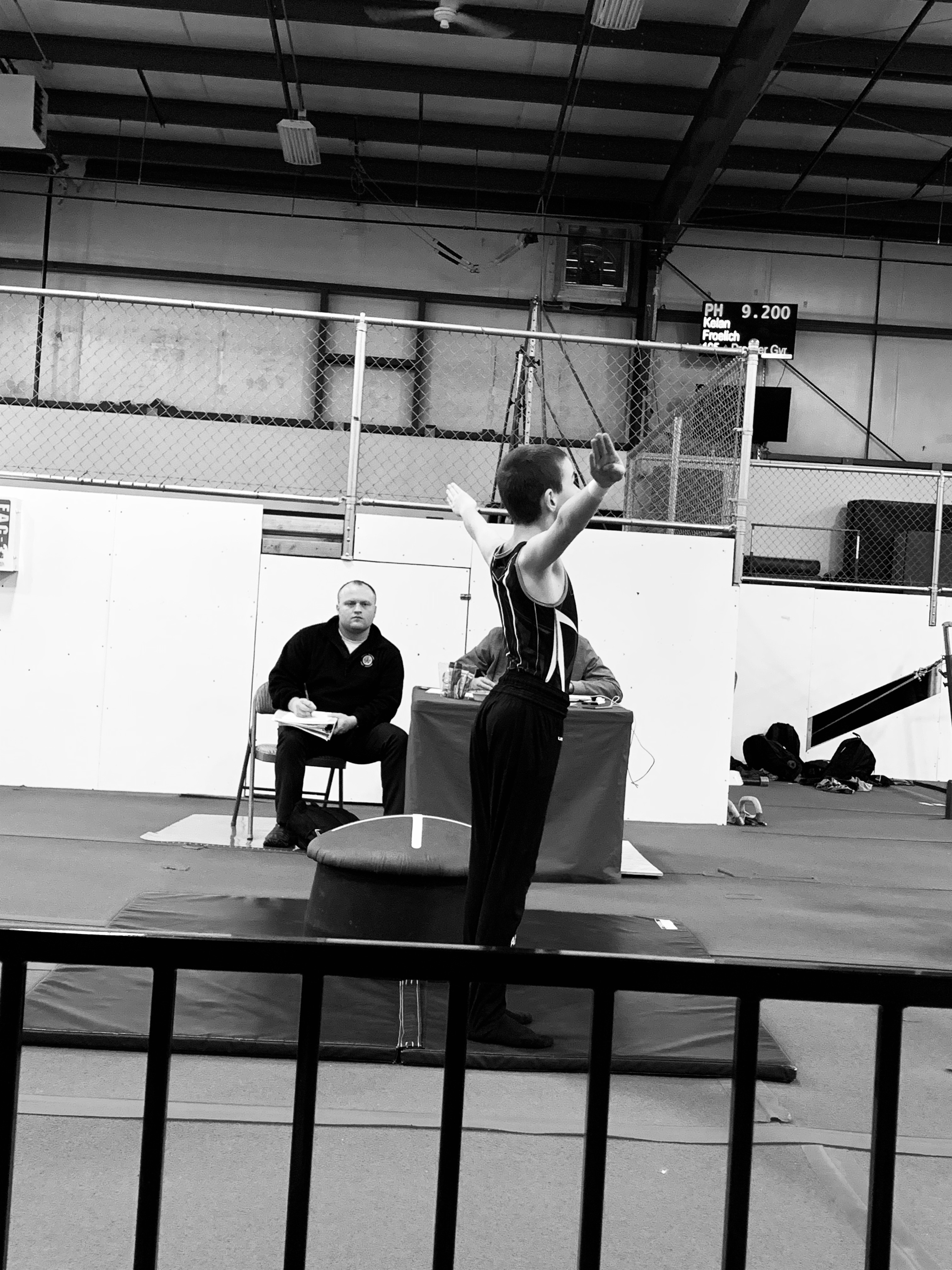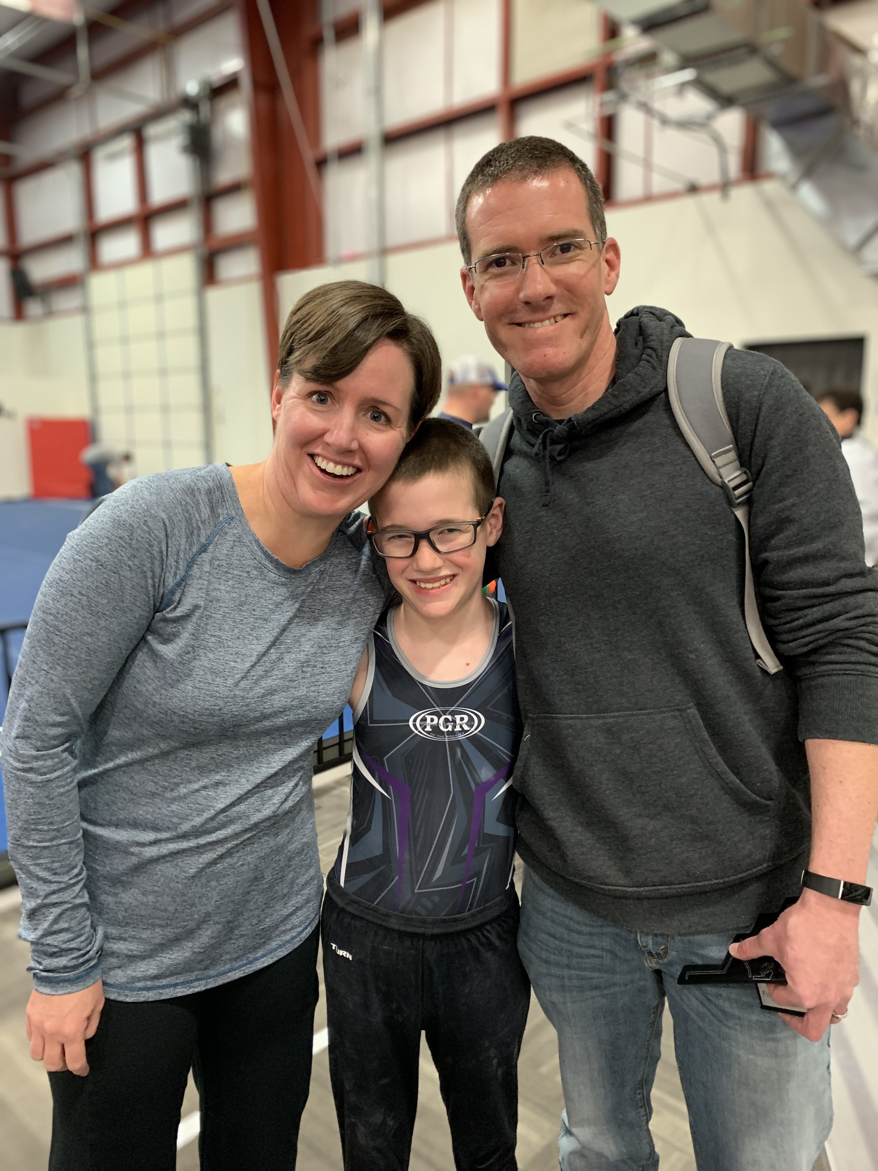 Meet number 5 is in the books as of this past weekend, Leighton only has State and Regional meet left of this season. This meet was down in Centennial Colorado which is really close to where my brother Chris lives, so he and his partner met us and cheered Leighton on with Clint and I. It was a super fun meet, the theme was “Fly High” so to introduce the boys they ran in on a lightened runway and did flips onto the mat. Leighton did really well, he has improved each meet, still has many things to work on but it has been a season of growth and development. His best two events are still pommel horse and vault which he took 2nd and 4th on. This meet however instead of handing out medals they gave the kids model airplanes which to young pre-teen boys that far beats medals anyway. After the meet we went with Chris and Adam for ice cream which topped off a great day.