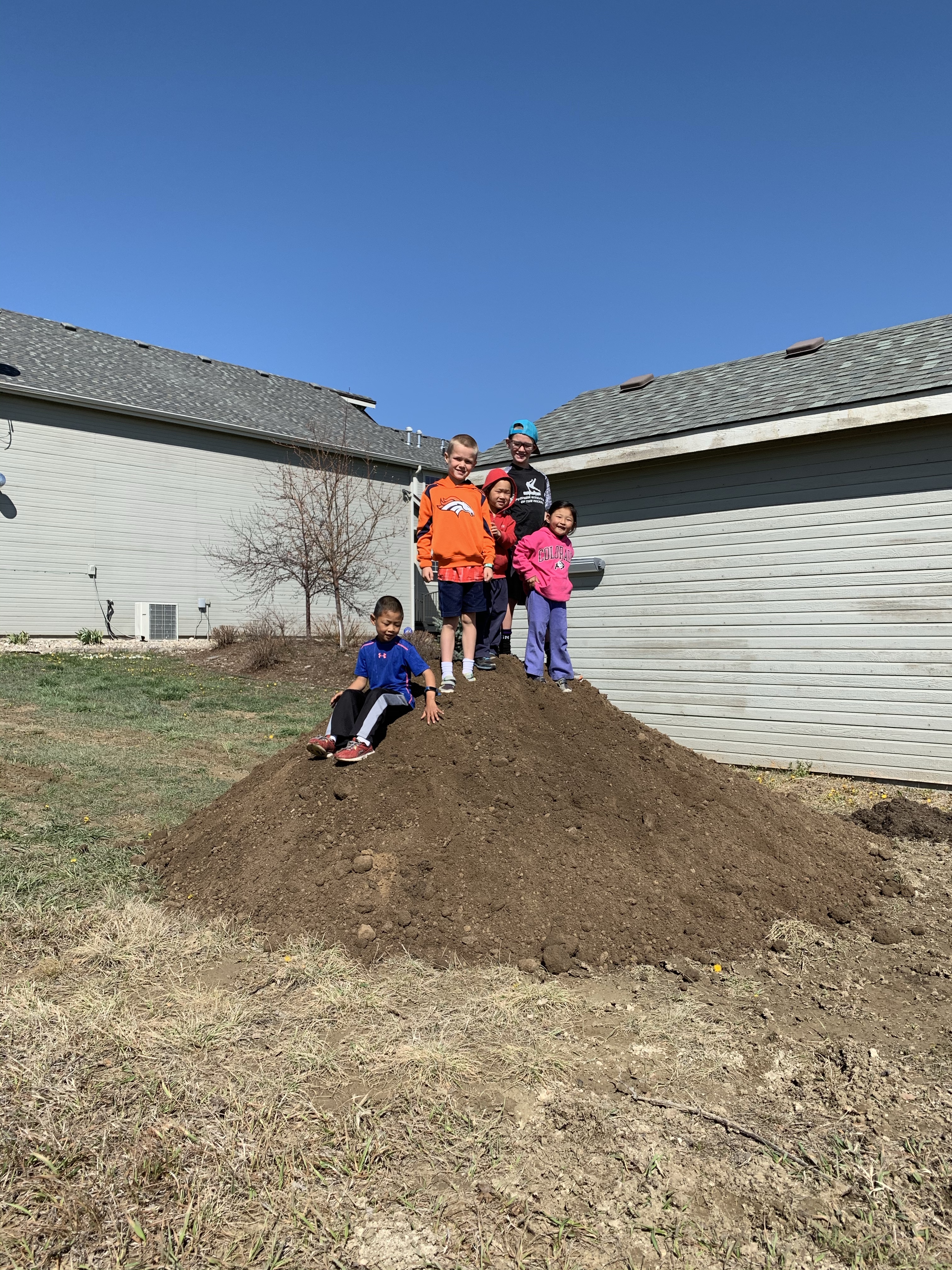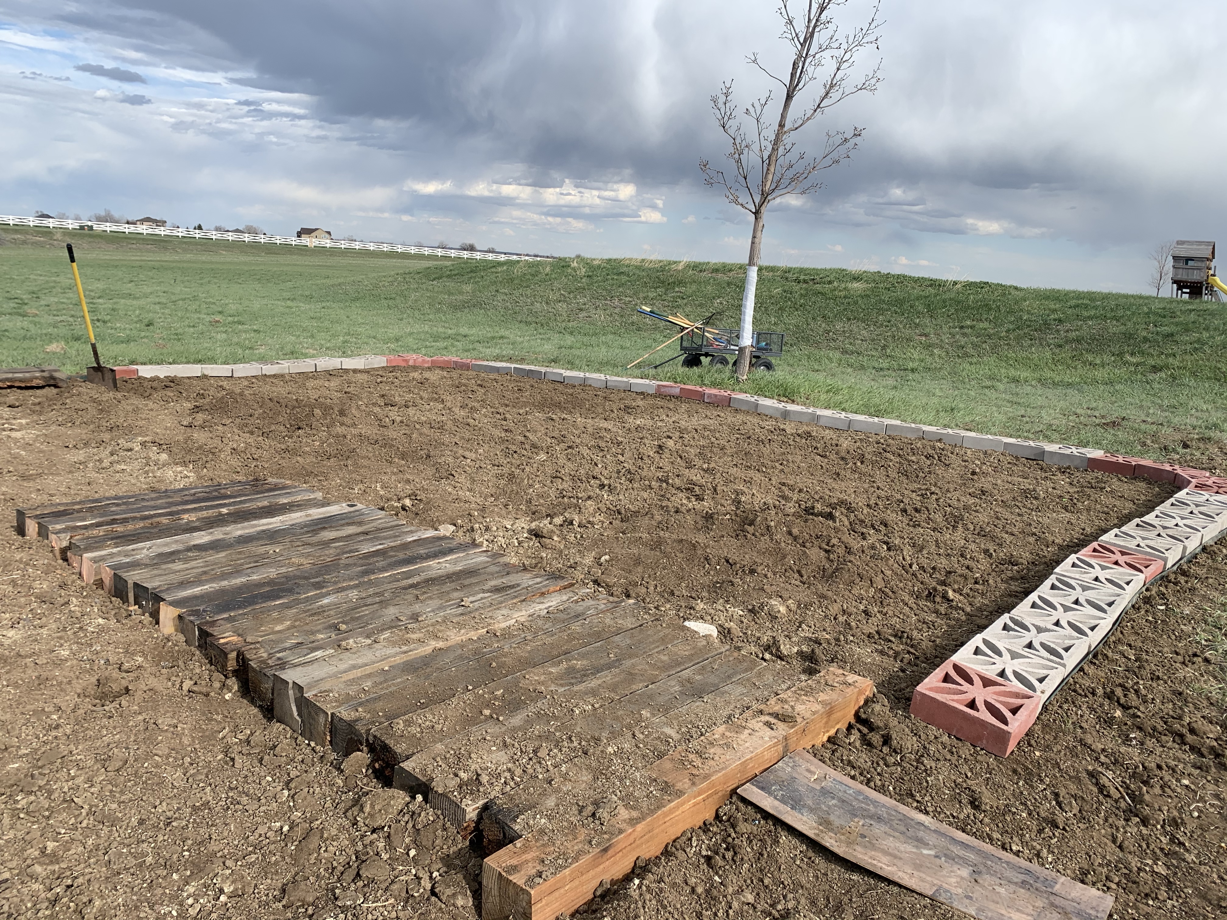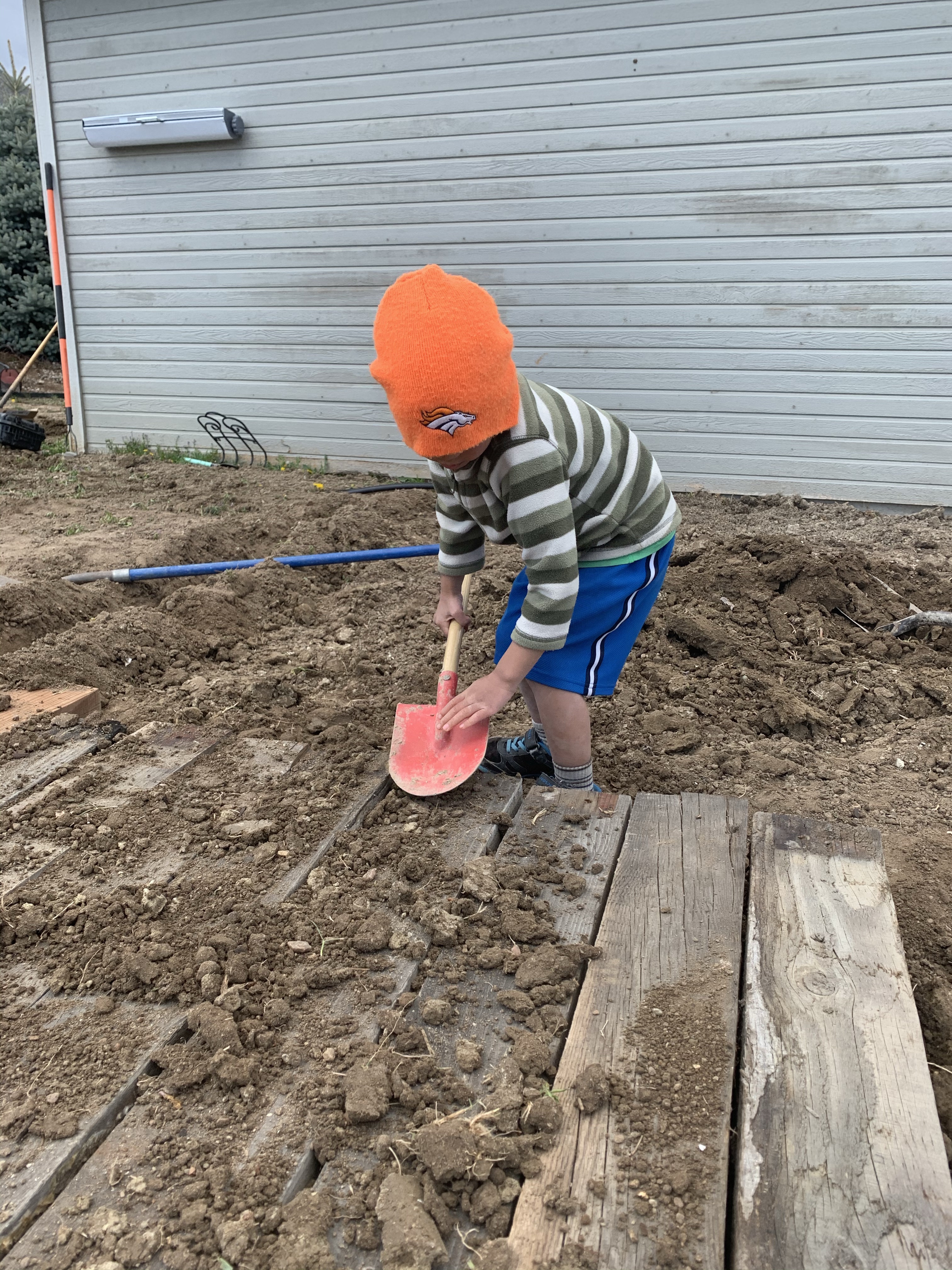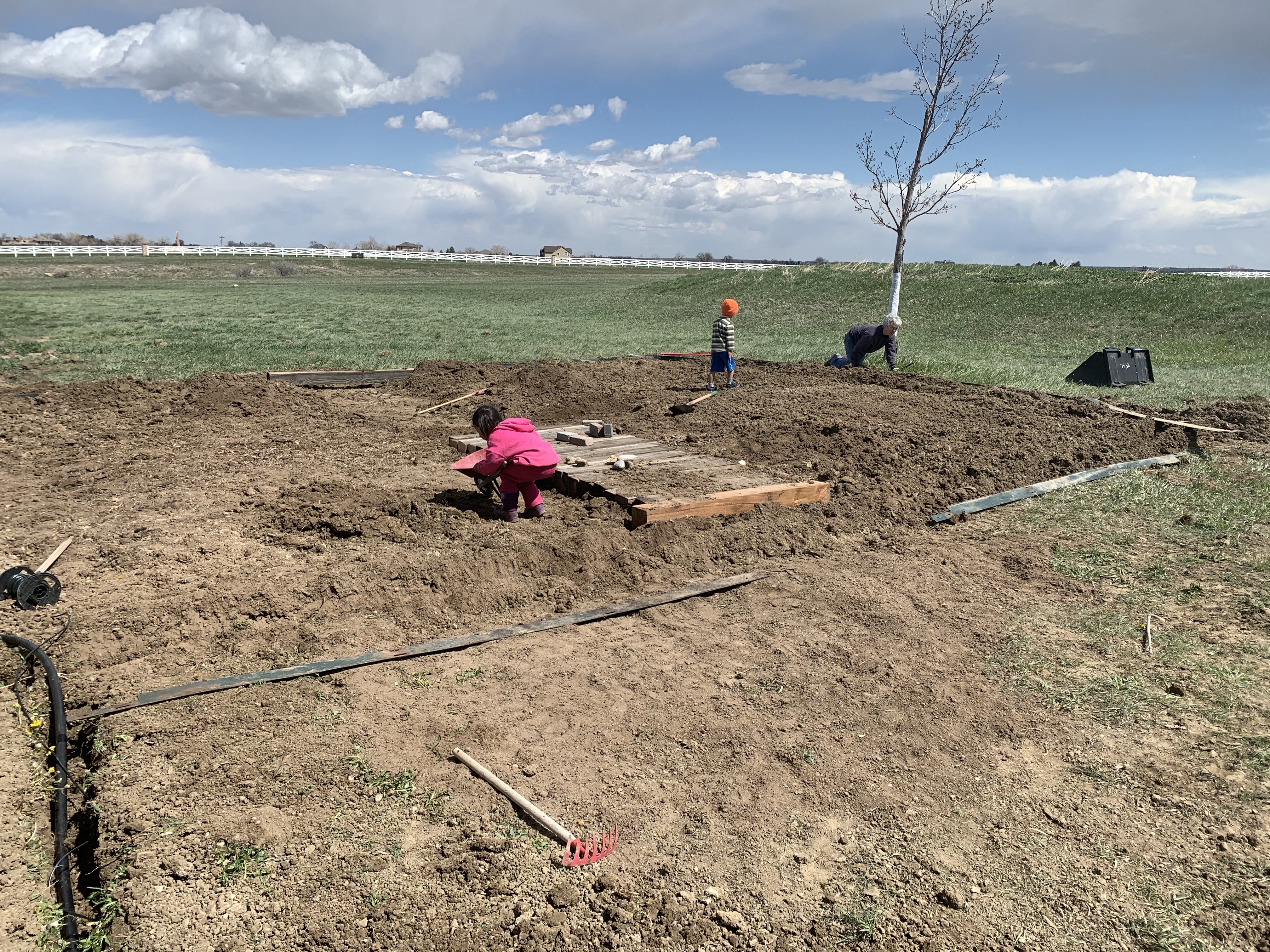 And we have a garden. Or at least a very large spot now to plant things in. 3 years ago when we moved in there was a small area with a couple raised beds that for that year and the next I made do. Last year because there was just way too much on my plate I attempted a couple of plants in pots on my porch and that failed pretty miserably. Finally I felt like things are decently under control and the kids are at an age where I could actually have a real garden. So after a whole lot of work on Wednesday I now do. It started on Tuesday with a bunch of dirt being delivered which the kids loved watching. But the real work started early Wednesday morning. My dad and Clint rented a trencher/tiller/mini bucket to spread and till and trench. They ran electricity to the little shed off the garden and then installed open water lines and faucets to both the garden and the bee garden as well. While they were trenching rest of us planted a honeysuckle, weeded the iris path, and did various other things. Once we got the garden tilled and the dirt spread my mom and I started hauling large logs to make a bridge through the middle of the garden. We then used some decorative bricks that we picked up from a neighbor to make a boarder around the garden. The guys (with plenty of help from little hands) got the faucets in and all the wiring done as we planted the strawberries and raspberries. I laid out my plan for where things are going to go and labeled rocks and placed those around. I am really looking forward to getting everything in and seeing how it all comes together.