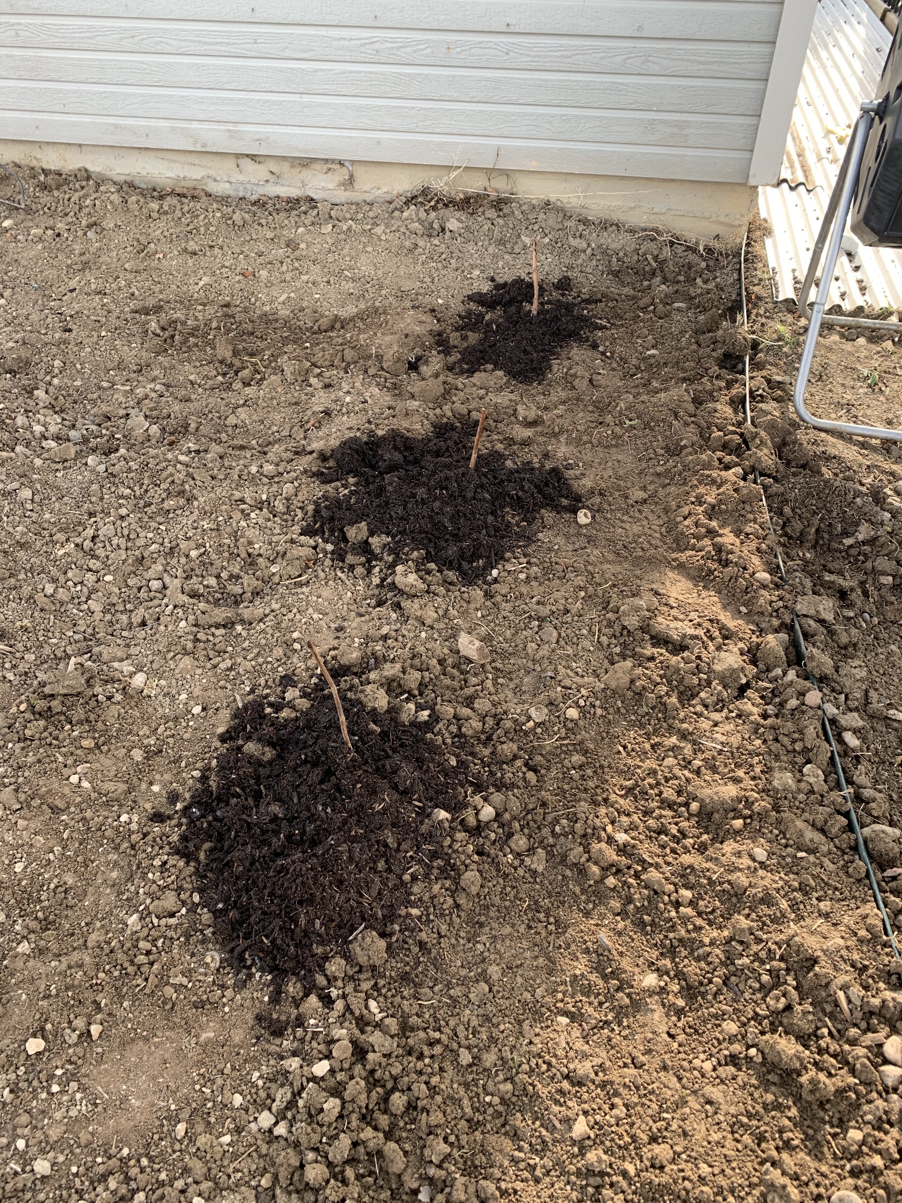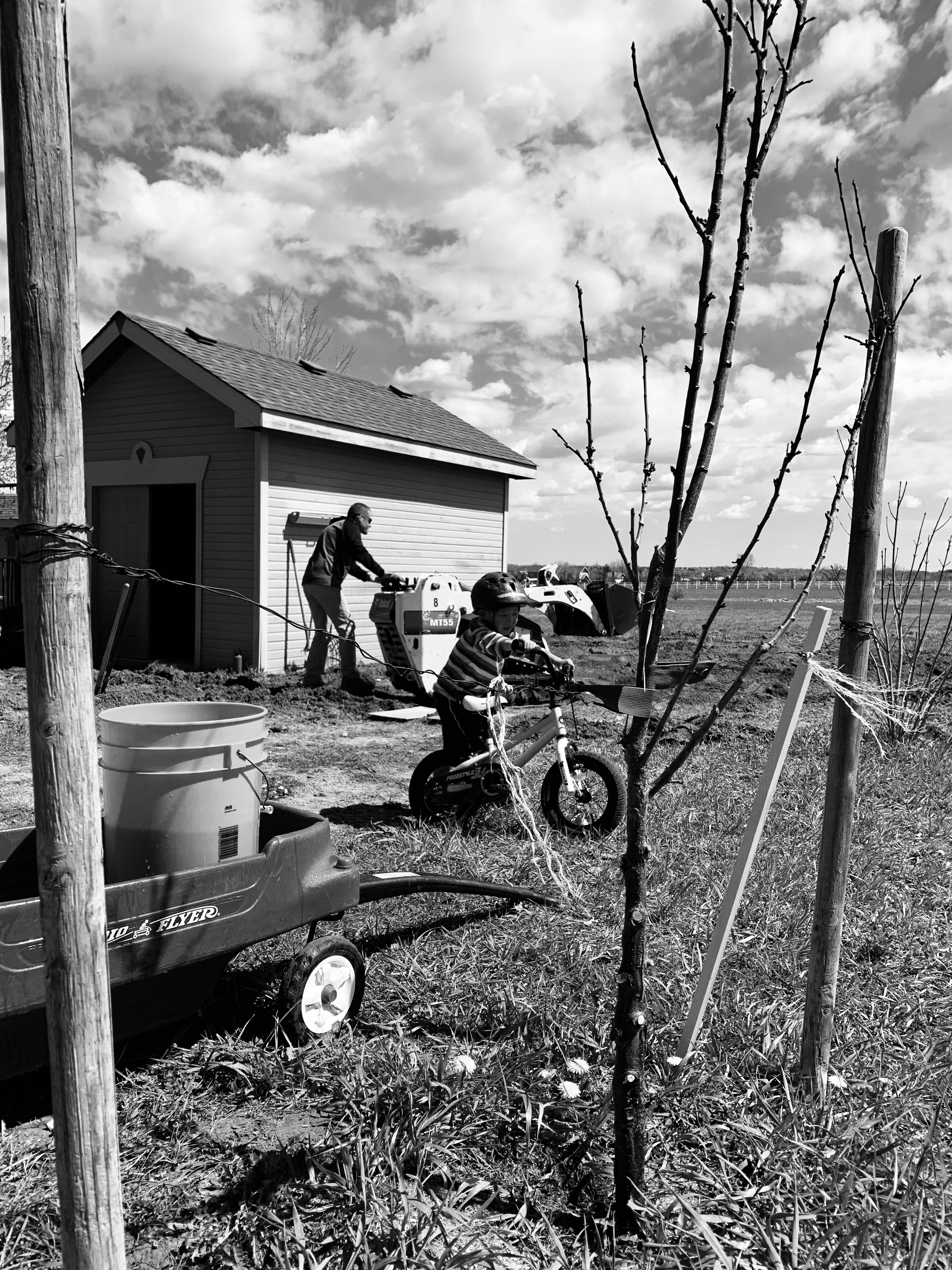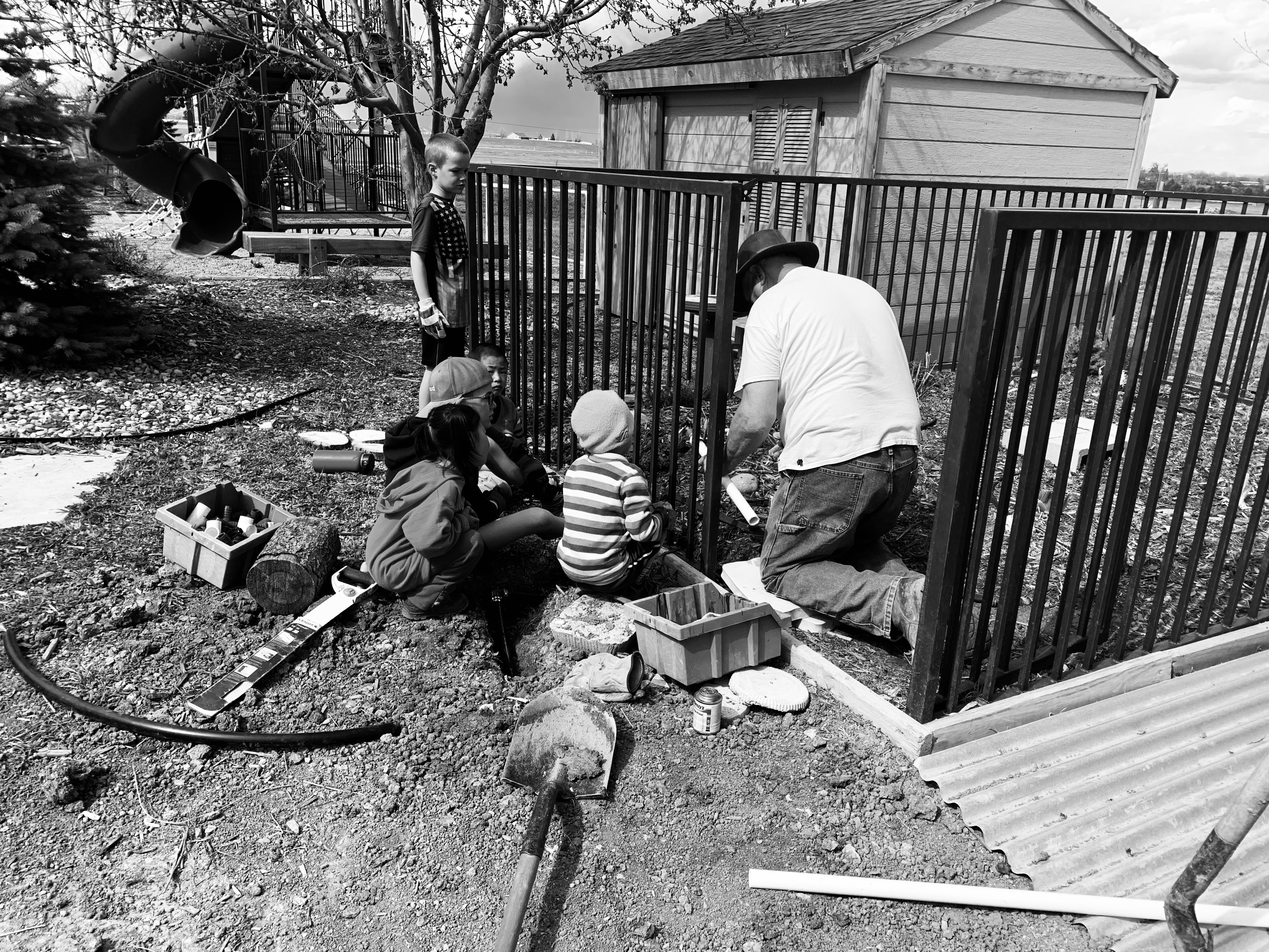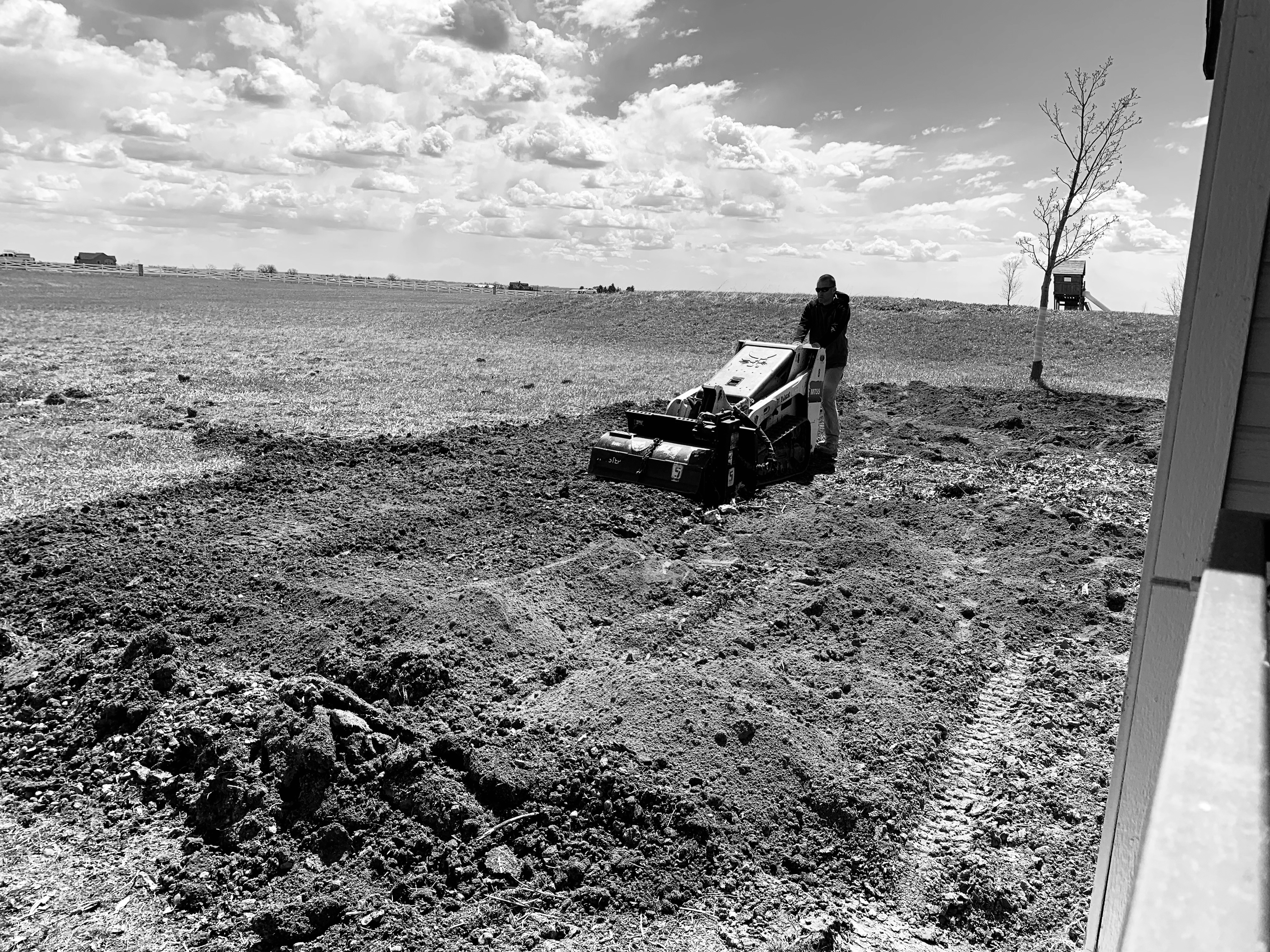 And we have a garden. Or at least a very large spot now to plant things in. 3 years ago when we moved in there was a small area with a couple raised beds that for that year and the next I made do. Last year because there was just way too much on my plate I attempted a couple of plants in pots on my porch and that failed pretty miserably. Finally I felt like things are decently under control and the kids are at an age where I could actually have a real garden. So after a whole lot of work on Wednesday I now do. It started on Tuesday with a bunch of dirt being delivered which the kids loved watching. But the real work started early Wednesday morning. My dad and Clint rented a trencher/tiller/mini bucket to spread and till and trench. They ran electricity to the little shed off the garden and then installed open water lines and faucets to both the garden and the bee garden as well. While they were trenching rest of us planted a honeysuckle, weeded the iris path, and did various other things. Once we got the garden tilled and the dirt spread my mom and I started hauling large logs to make a bridge through the middle of the garden. We then used some decorative bricks that we picked up from a neighbor to make a boarder around the garden. The guys (with plenty of help from little hands) got the faucets in and all the wiring done as we planted the strawberries and raspberries. I laid out my plan for where things are going to go and labeled rocks and placed those around. I am really looking forward to getting everything in and seeing how it all comes together.