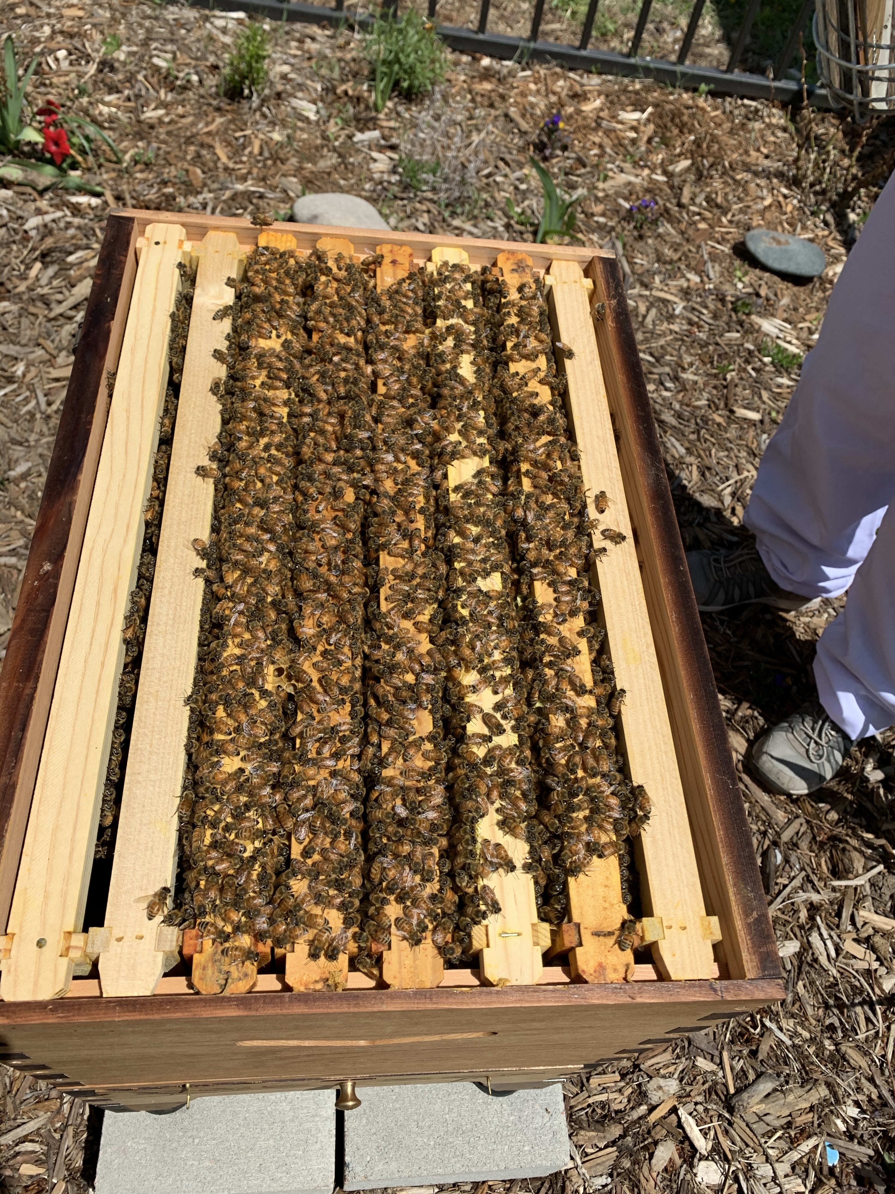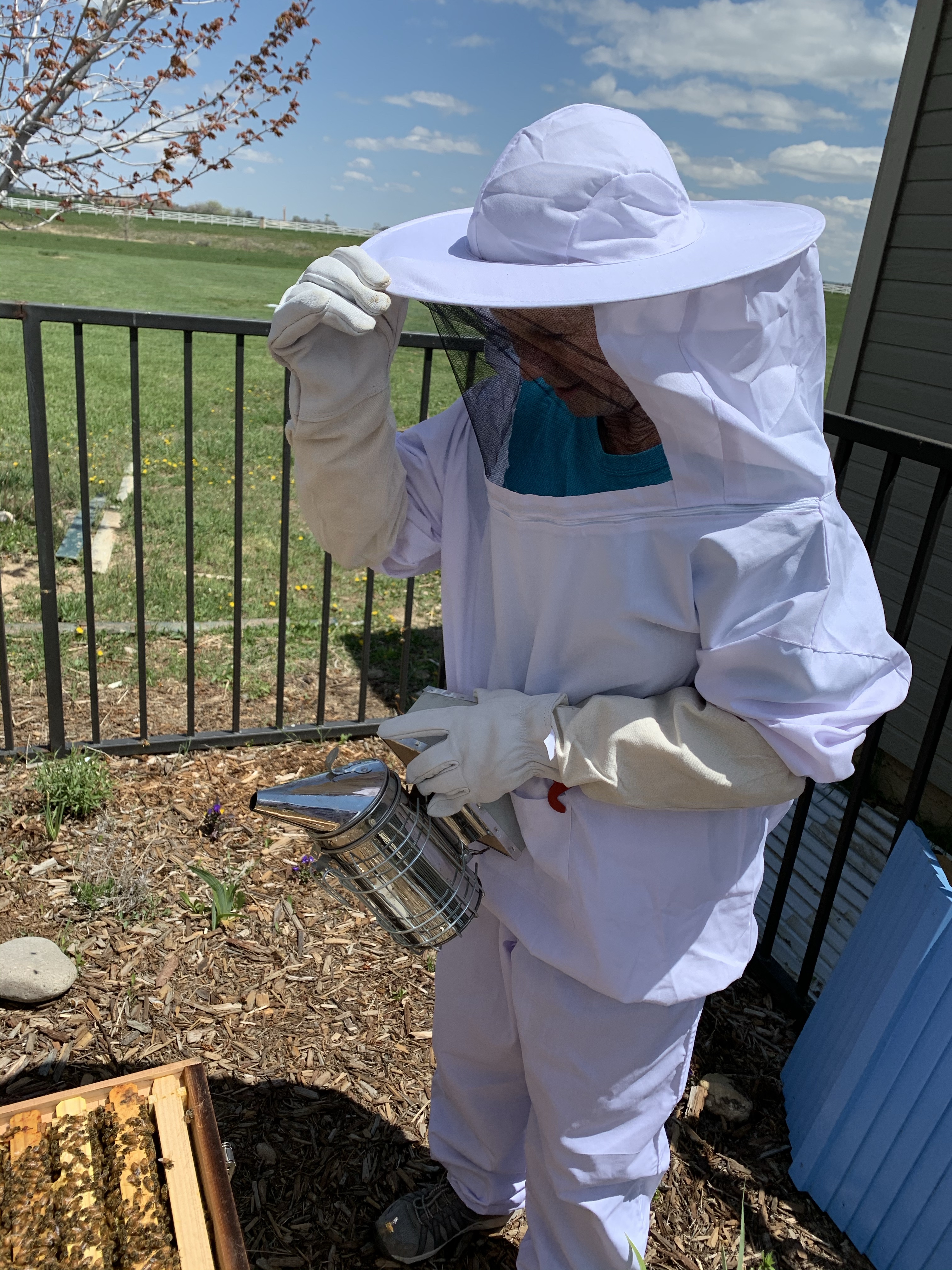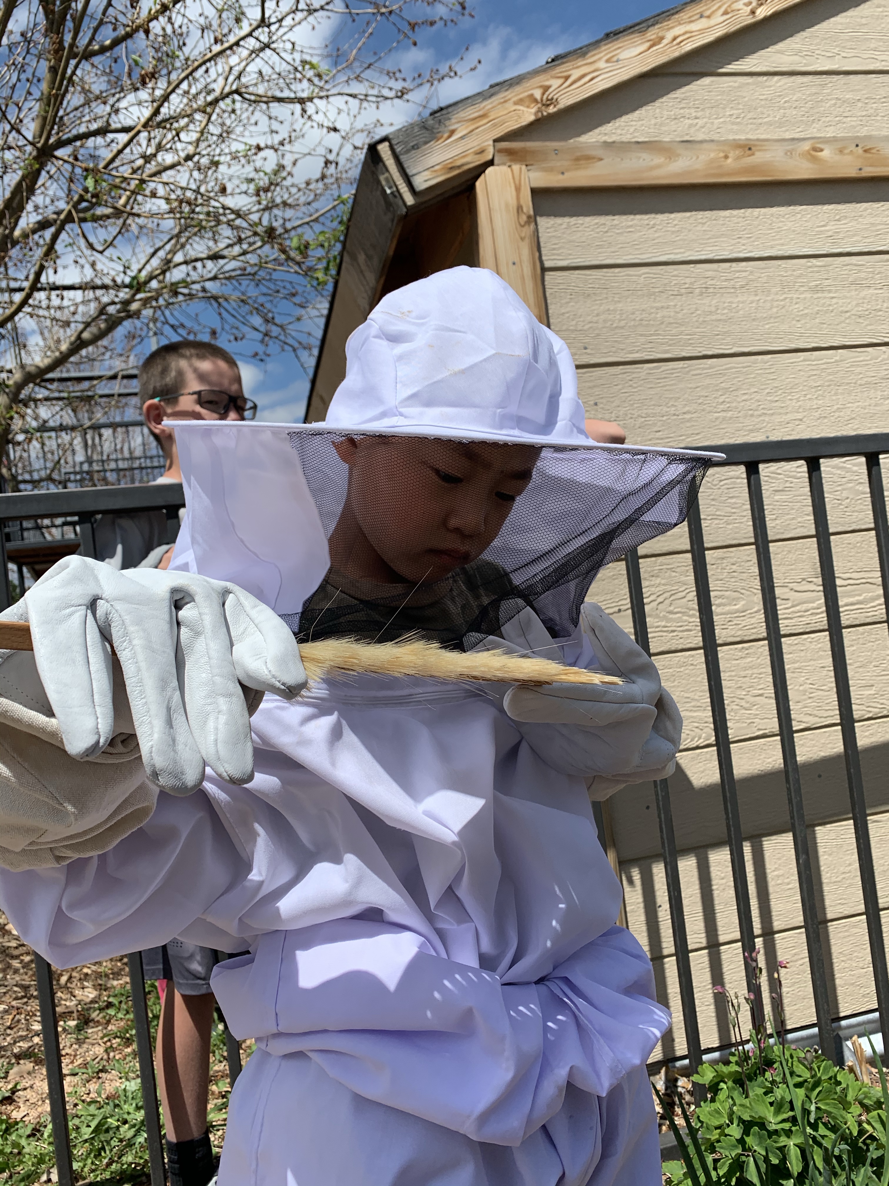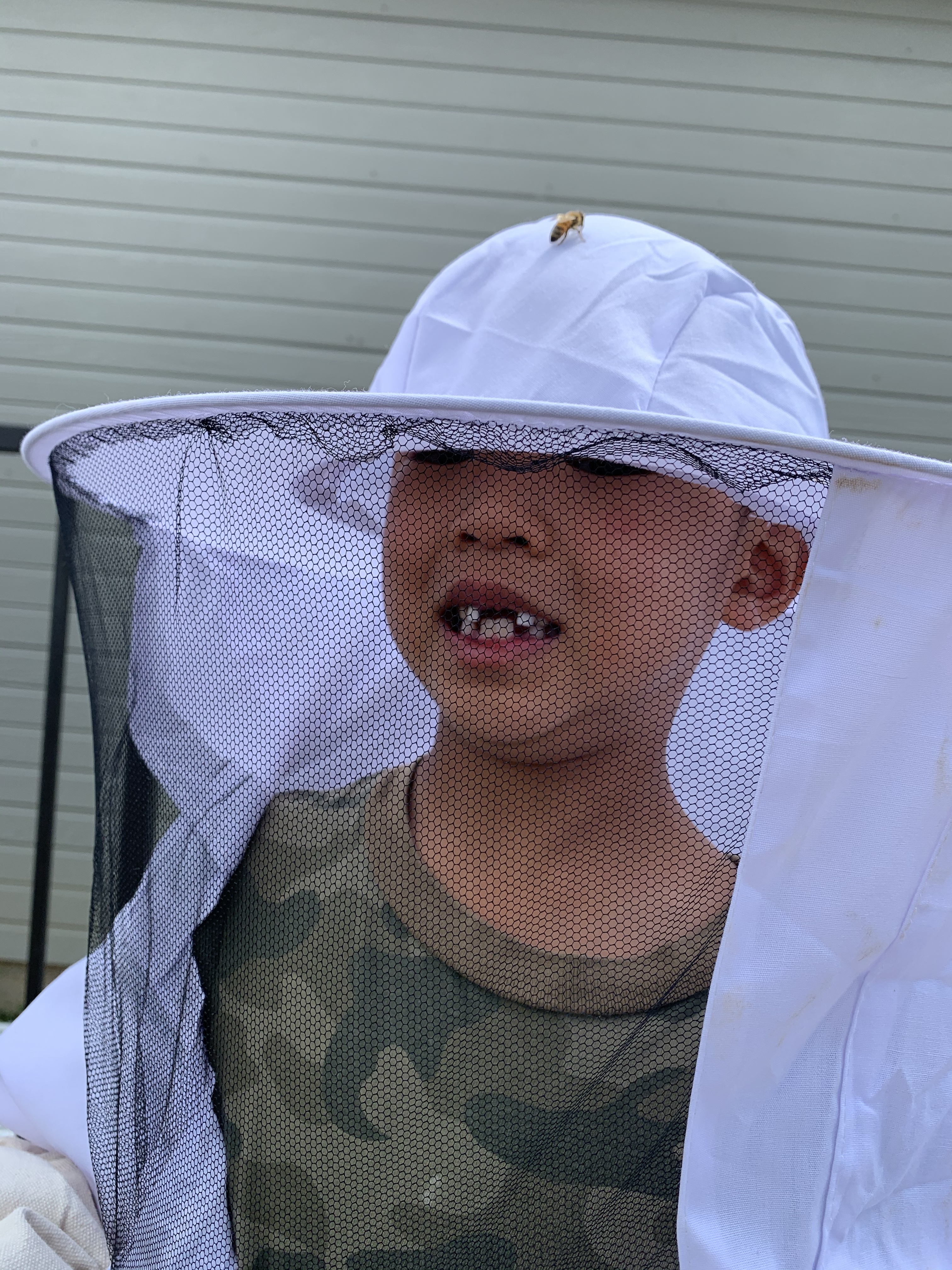 On Saturday it was time for our first check of the bees. Edric and my mom were my helpers and they both had a lot of fun. Edric was really excited to wear the bee suit and let the bees land on him. When I opened up the hive I saw the 5 frames from the nuc but then a number of bees also working on the three empty frames that I had hung. I pulled my first frame out of the middle of the brood box and started looking for the queen. My mom thought she saw one but then realized it was a drone, however just a minute later I found Queen Adelaide climbing all over my side of the frame. She was moving right along and it was good to actually spot her. We checked the rest of the frames and I discovered that the nuc frames all had plastic foundations which I’m not a fan of, but I will work on slowly working those out of the hive so that they can have all natural comb. On the frames that were fresh they had them decently built out for only being 6 days old. It was really neat to see. I decided to add a second brood box and pulled one of the full frames up to help encourage the bees to start building them up there. I put the feeder back on and the bees were set for another week. I have been learning so much just sitting out by their hive watching them come in and fly out full of pollen.