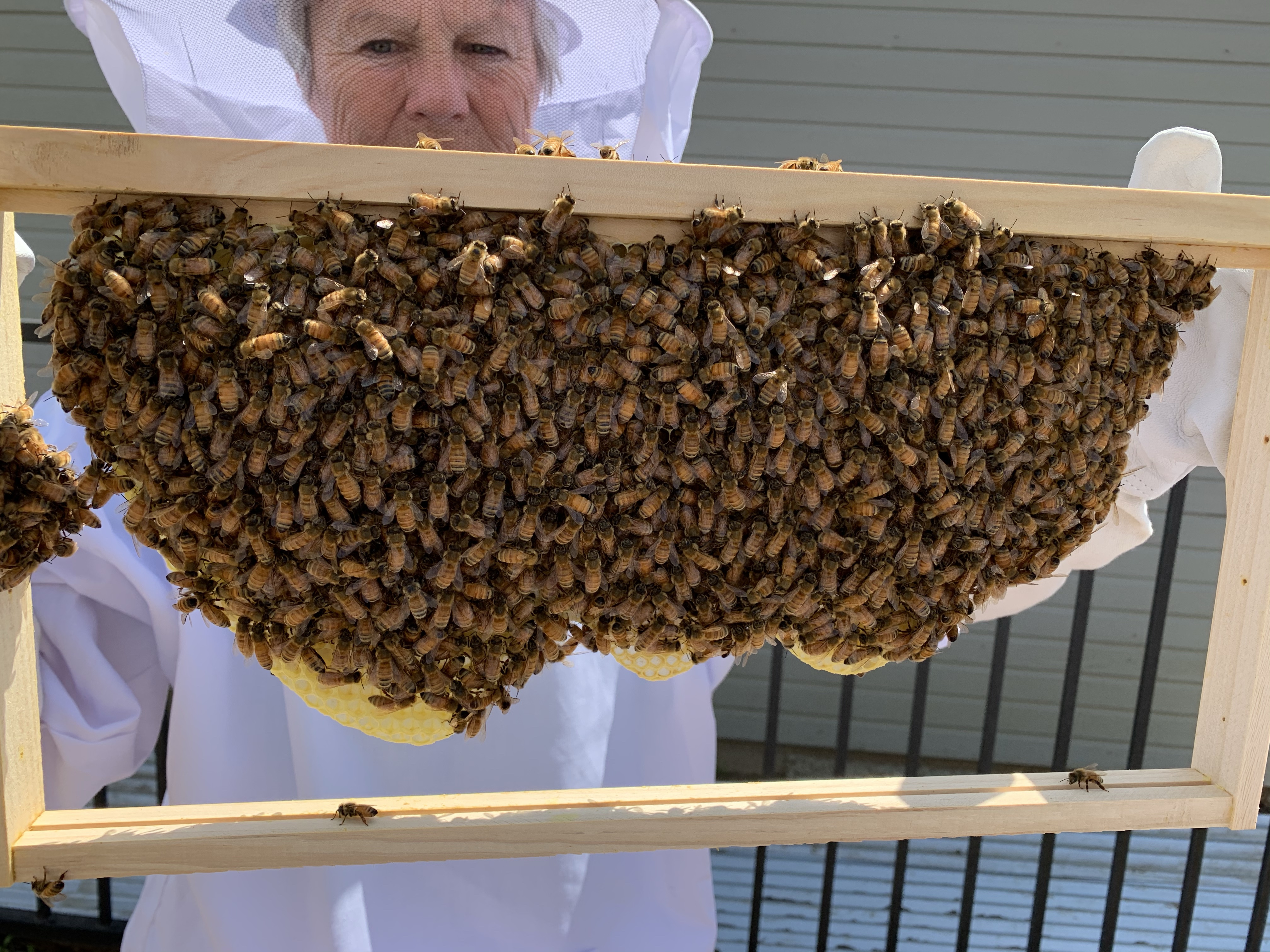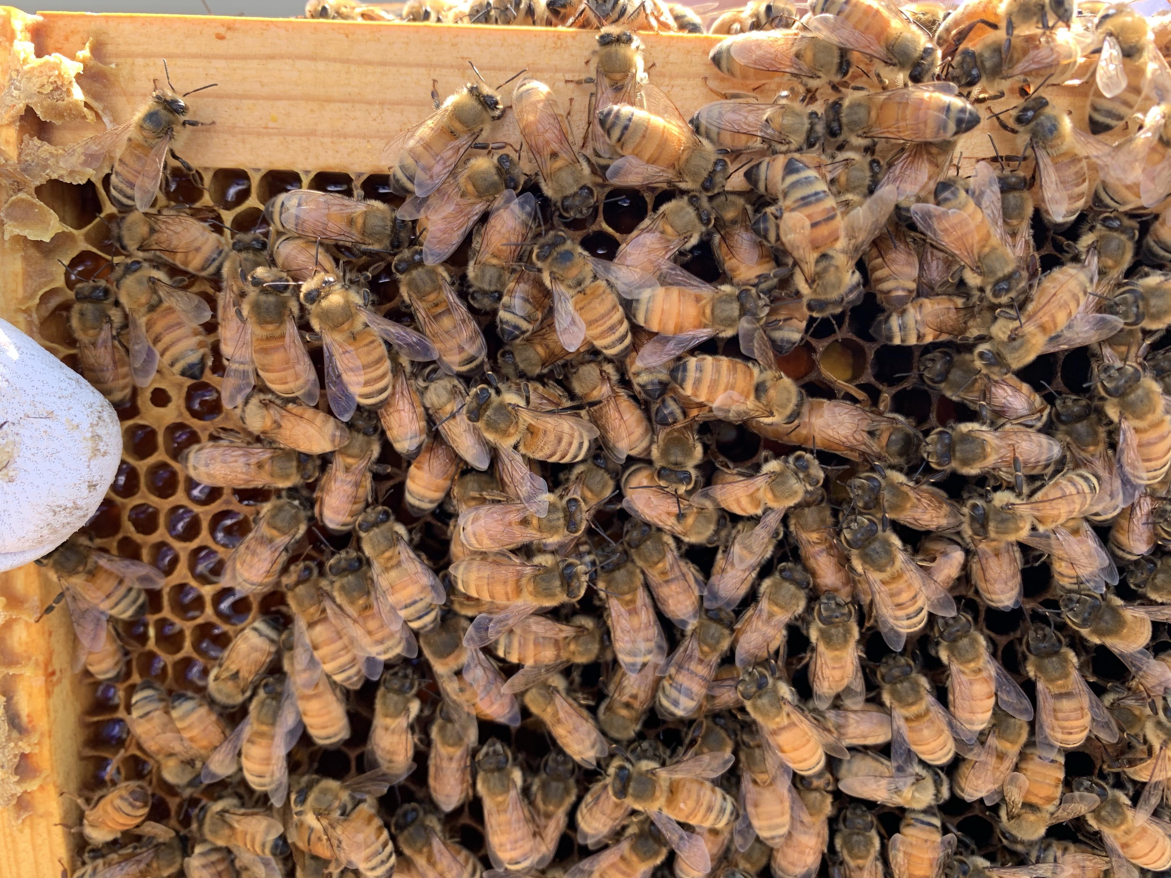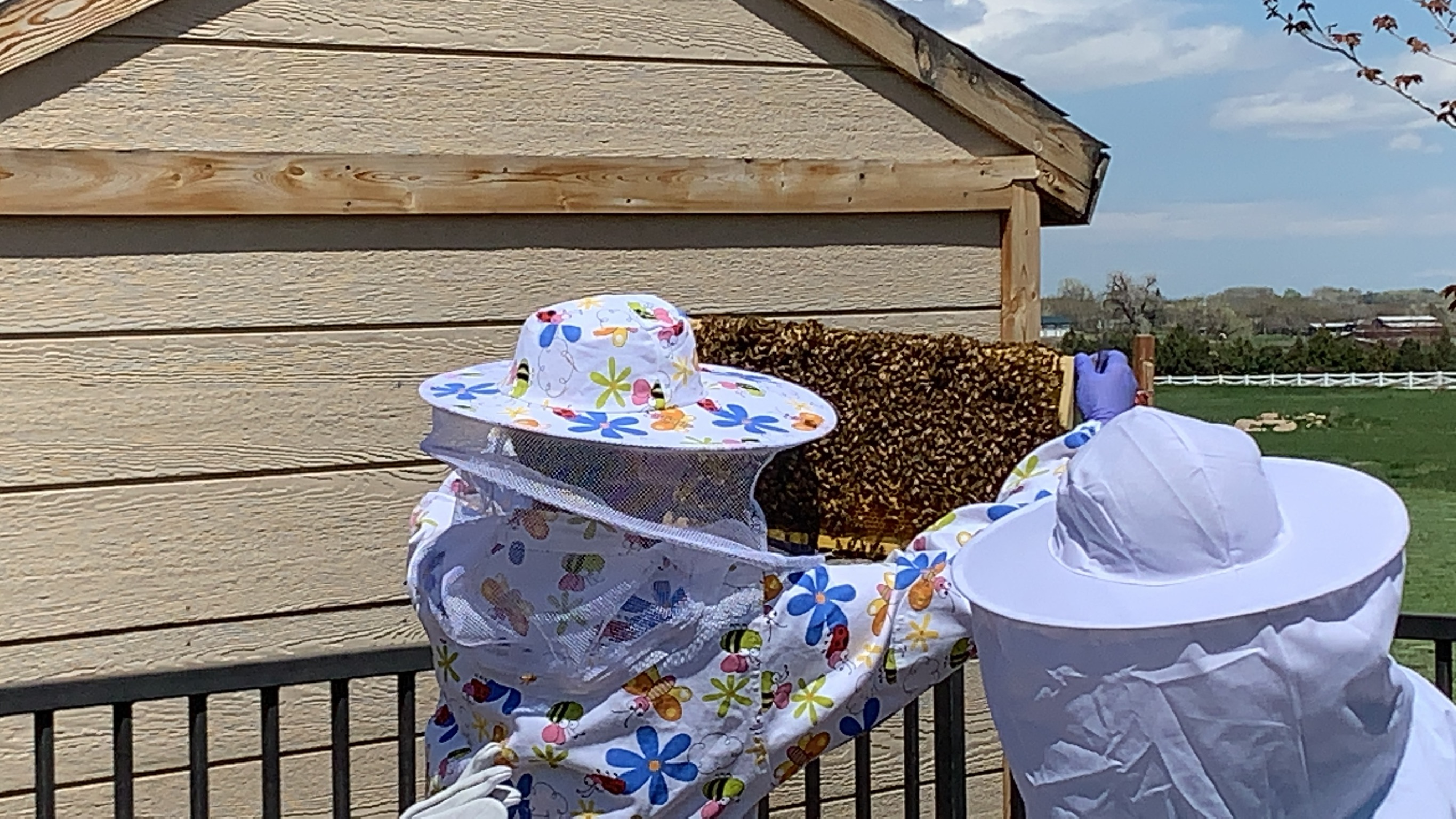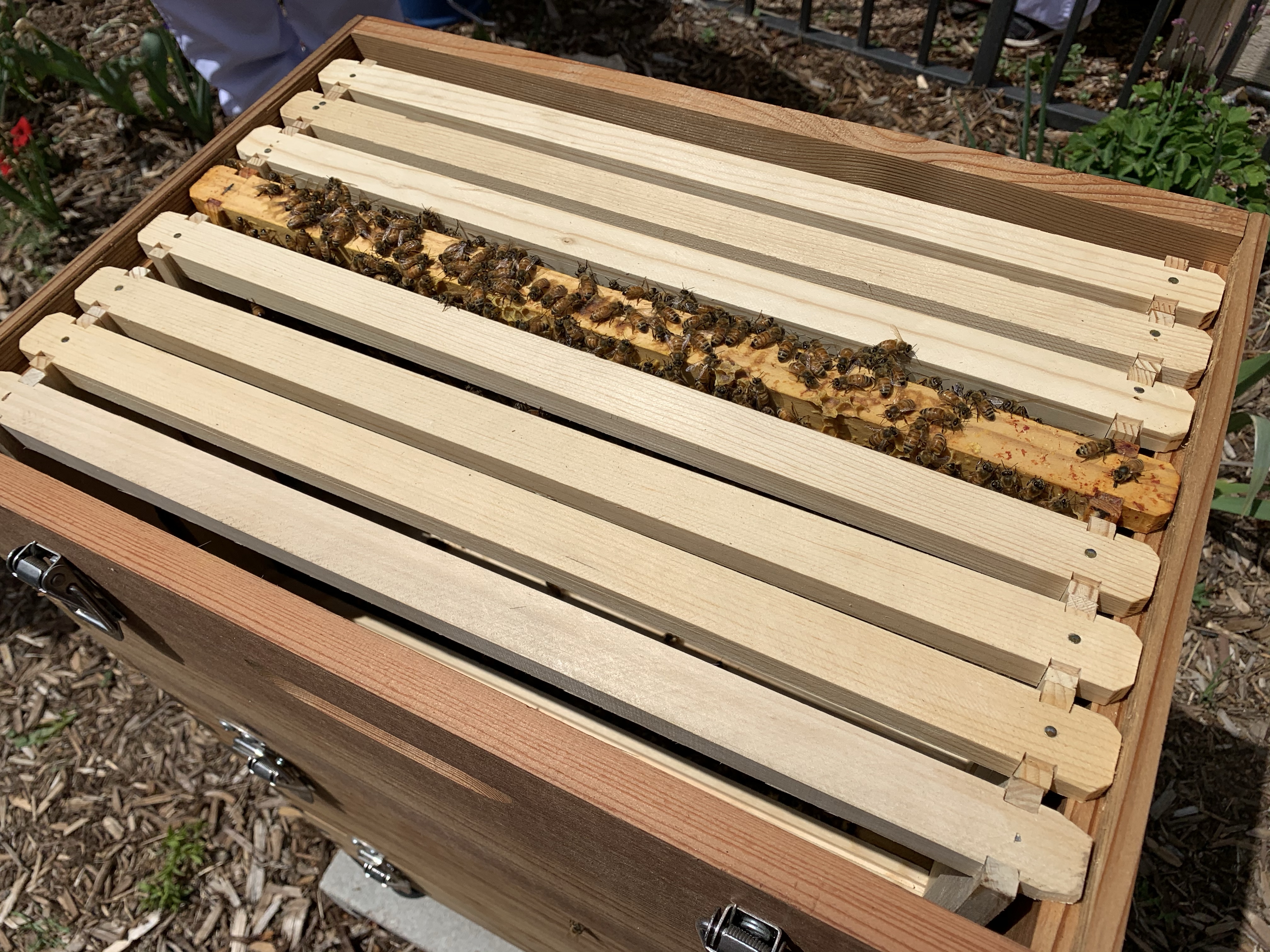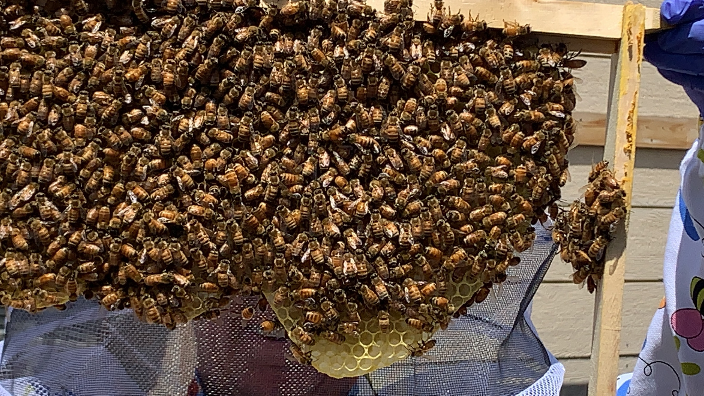 On Saturday it was time for our first check of the bees. Edric and my mom were my helpers and they both had a lot of fun. Edric was really excited to wear the bee suit and let the bees land on him. When I opened up the hive I saw the 5 frames from the nuc but then a number of bees also working on the three empty frames that I had hung. I pulled my first frame out of the middle of the brood box and started looking for the queen. My mom thought she saw one but then realized it was a drone, however just a minute later I found Queen Adelaide climbing all over my side of the frame. She was moving right along and it was good to actually spot her. We checked the rest of the frames and I discovered that the nuc frames all had plastic foundations which I’m not a fan of, but I will work on slowly working those out of the hive so that they can have all natural comb. On the frames that were fresh they had them decently built out for only being 6 days old. It was really neat to see. I decided to add a second brood box and pulled one of the full frames up to help encourage the bees to start building them up there. I put the feeder back on and the bees were set for another week. I have been learning so much just sitting out by their hive watching them come in and fly out full of pollen.
