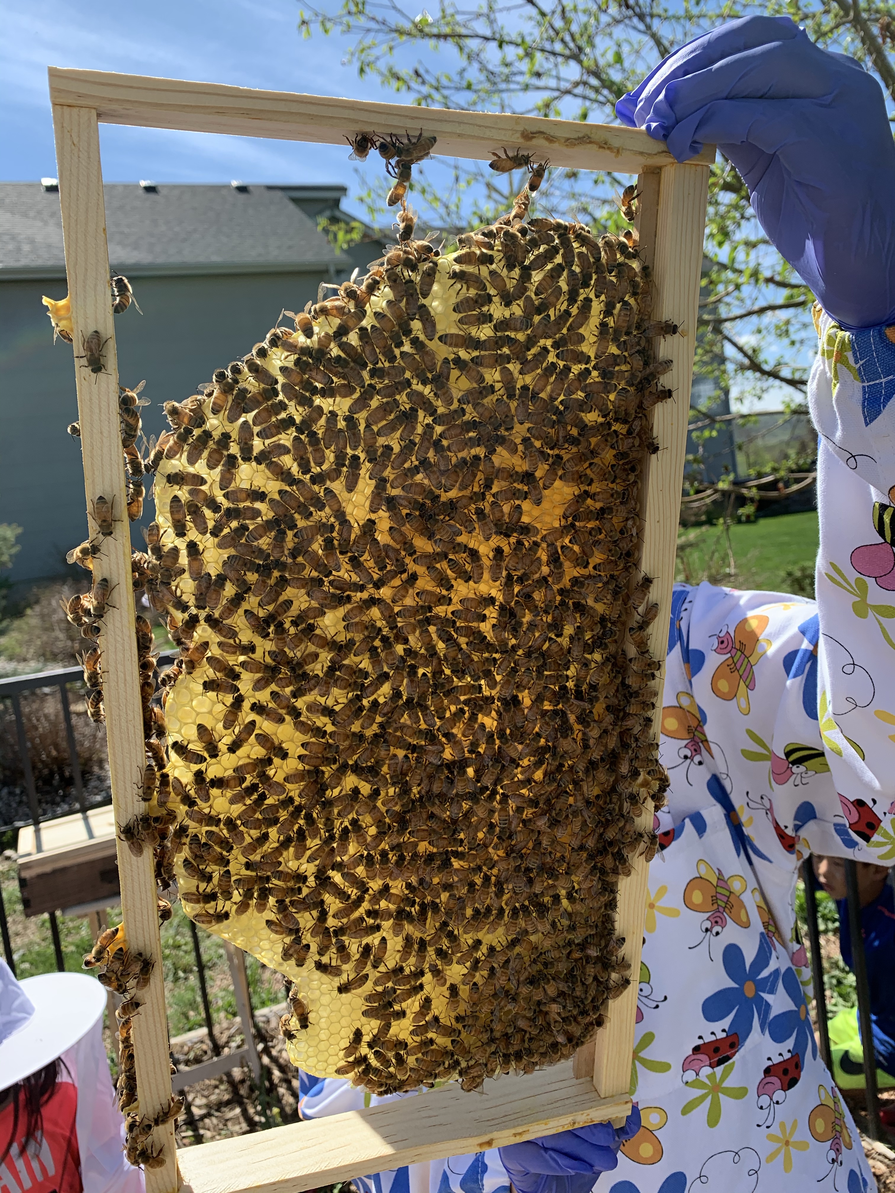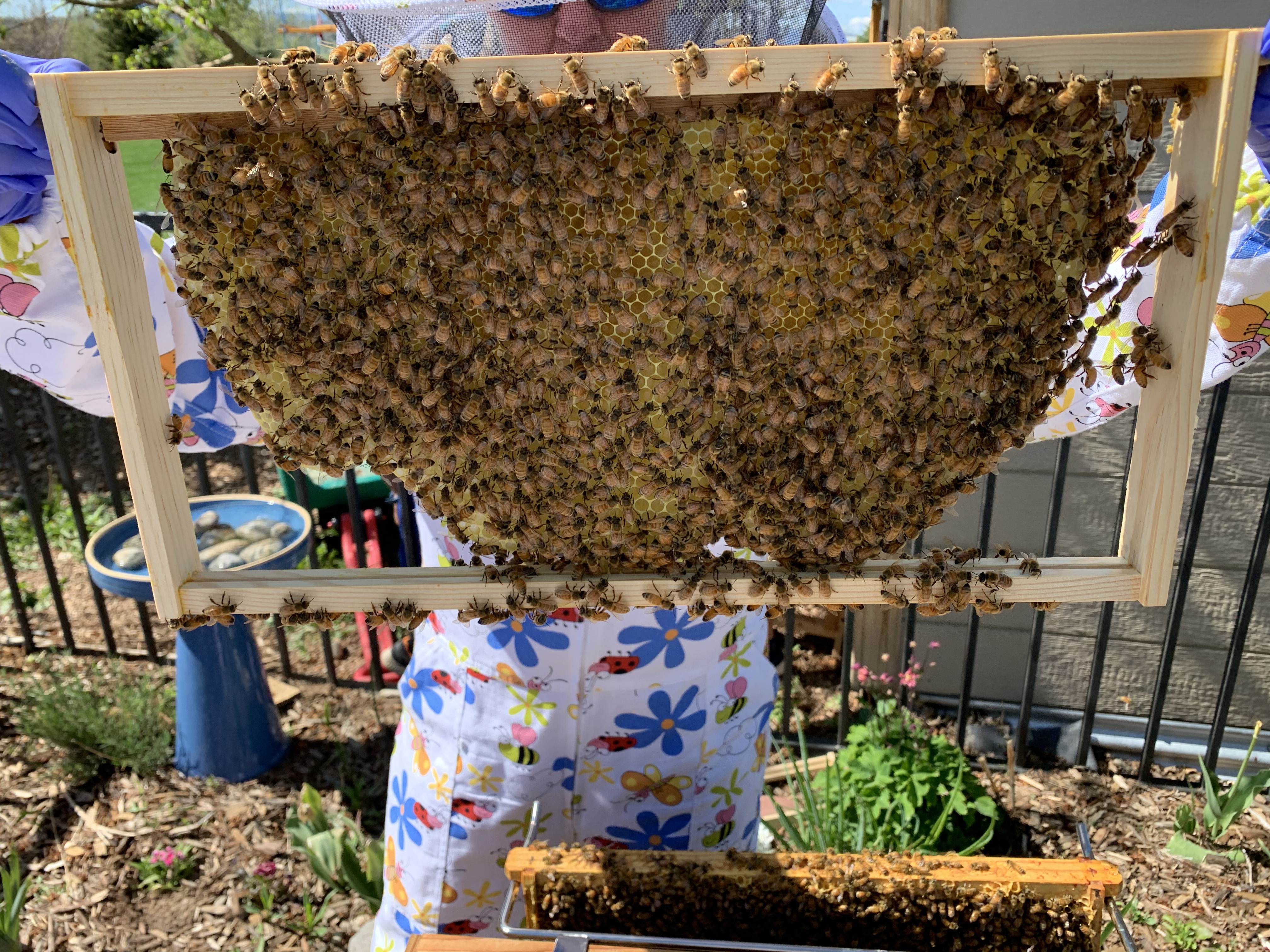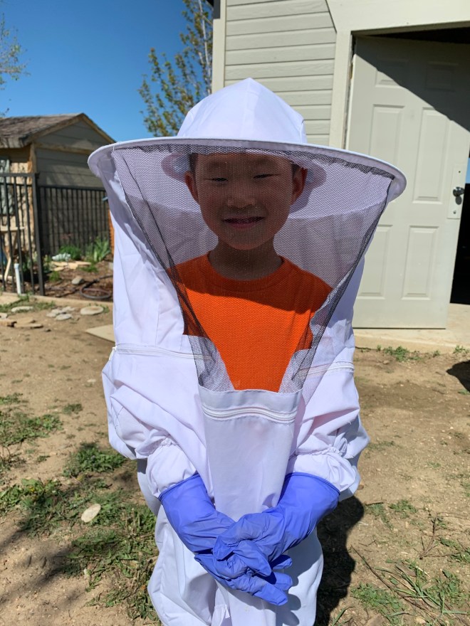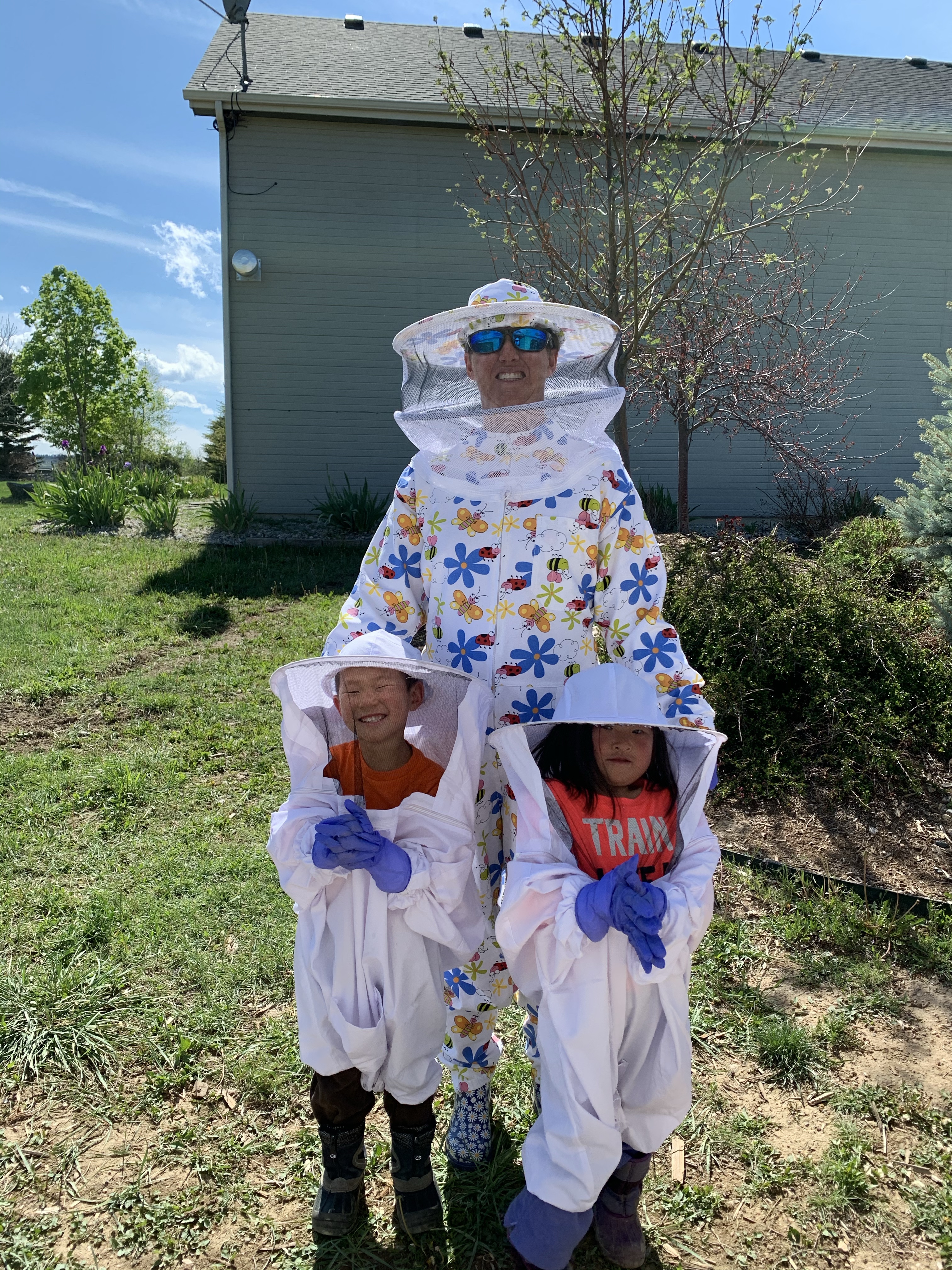 On Saturday we did our second check of the bees to see how they were doing. Paxton and Coppelia were my helpers. I was able to use just the jacket part of the “one size fits most” bee suits that we have and with some creative safety pins make them work for both of them. Clint was my other helper and I managed to not get a photo of him, mostly because he was taking most the photos. The bees were looking really good. They had started to build out some comb in the top brood box I put on which was good to see. It is fascinating to see how they work together to make scaffolding with their bodies for the comb to be built out on. We actually found Queen Adelaide checking out the new comb up in the second brood box. In the bottom box I found one frame that had very little brood in it but had some pollen in it and some stored honey. It was one of the original frames that we got with the nuc that was plastic. I am trying to keep plastic out of the hive as much as possible, and so since this was one fairly empty of brood I pulled it and replaced it with an empty frame so the bees could build and not use the plastic. We put the hive back together and then examined the frame I had removed. We all tried a little bit of the honey which everyone enjoyed. I did have a couple upset in tears that we were going to have to get rid of the frame which meant that the bee larvae would die but they did understand that in the long run getting the plastic out was a good plan. It will be a number of weeks before I remove the next frame as I had quite a few tears to dry from my soft sweet hearts. Clint even said when we were all done, “that was actually pretty good”, he’s been my most nervous about all of this but I think he actually is beginning to enjoy it (even if just a bit).