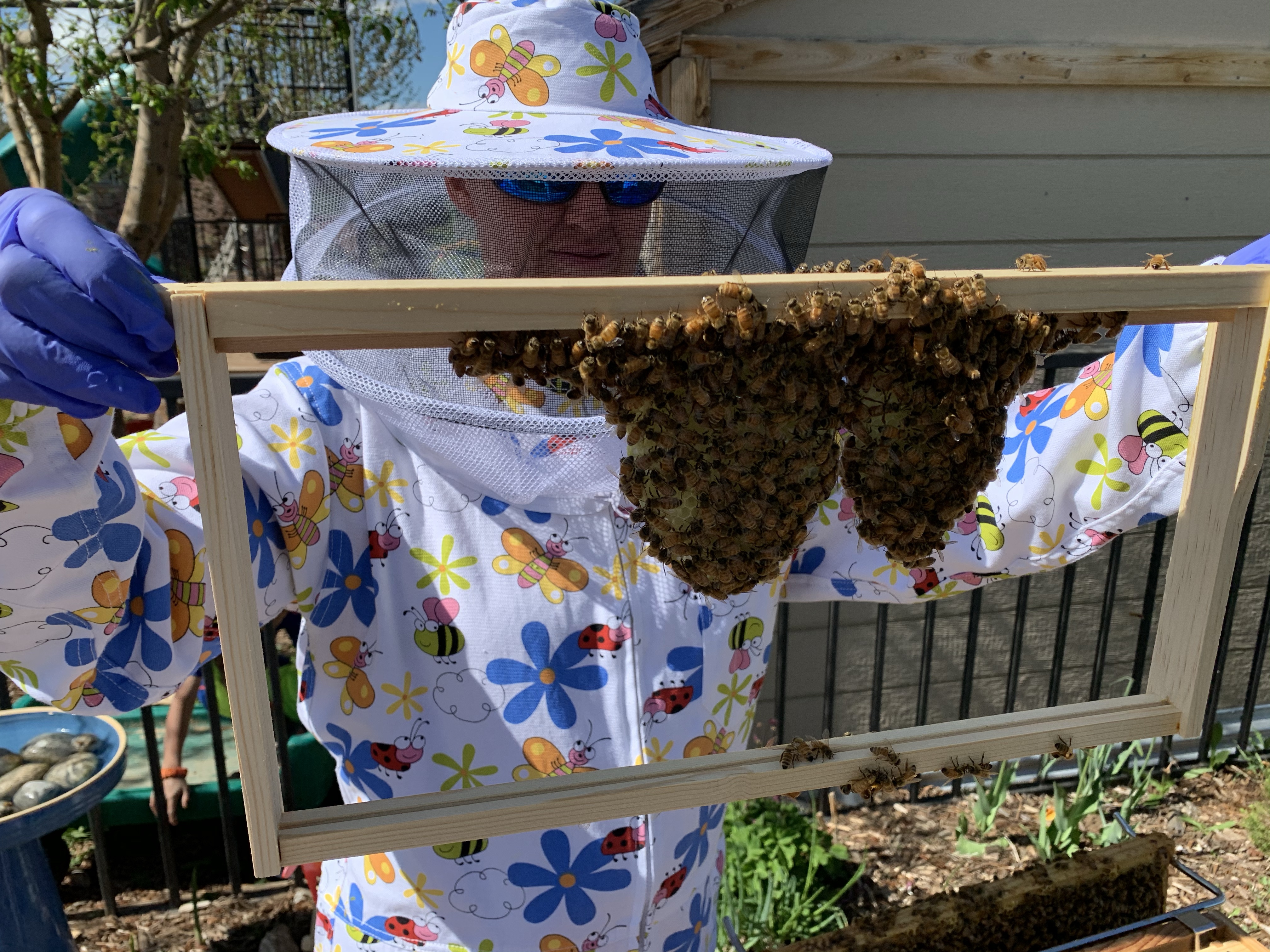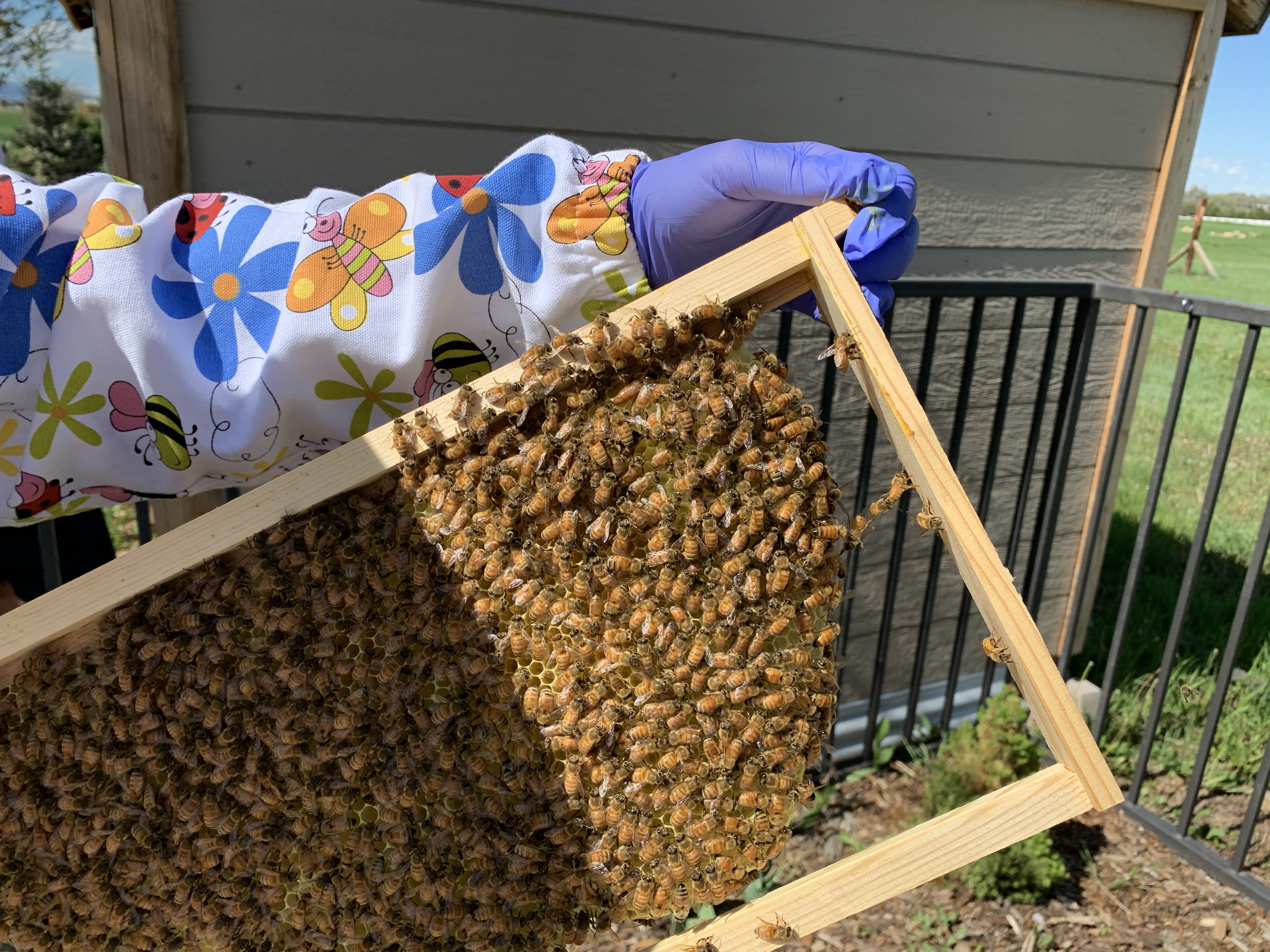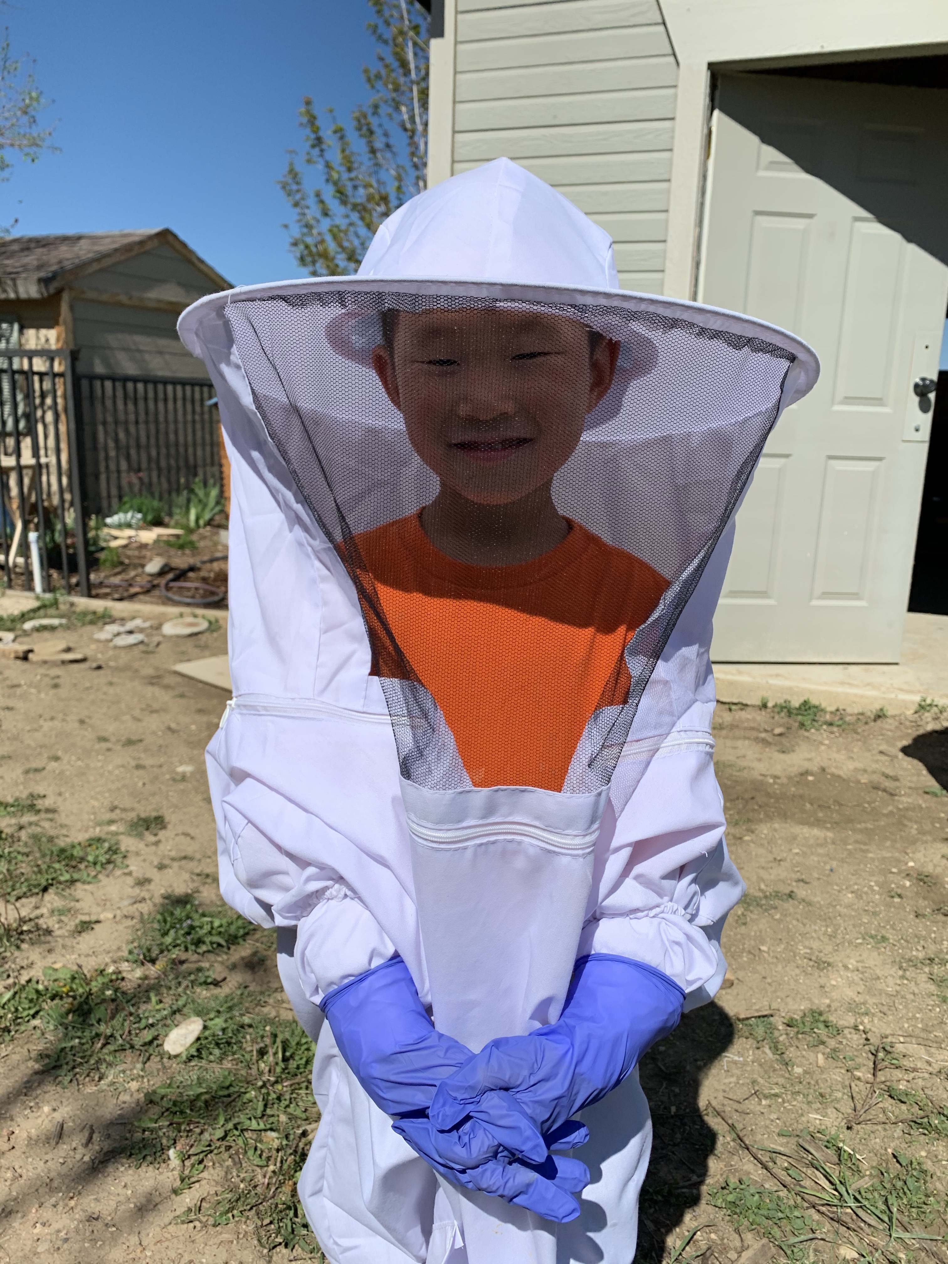 On Saturday we did our second check of the bees to see how they were doing. Paxton and Coppelia were my helpers. I was able to use just the jacket part of the “one size fits most” bee suits that we have and with some creative safety pins make them work for both of them. Clint was my other helper and I managed to not get a photo of him, mostly because he was taking most the photos. The bees were looking really good. They had started to build out some comb in the top brood box I put on which was good to see. It is fascinating to see how they work together to make scaffolding with their bodies for the comb to be built out on. We actually found Queen Adelaide checking out the new comb up in the second brood box. In the bottom box I found one frame that had very little brood in it but had some pollen in it and some stored honey. It was one of the original frames that we got with the nuc that was plastic. I am trying to keep plastic out of the hive as much as possible, and so since this was one fairly empty of brood I pulled it and replaced it with an empty frame so the bees could build and not use the plastic. We put the hive back together and then examined the frame I had removed. We all tried a little bit of the honey which everyone enjoyed. I did have a couple upset in tears that we were going to have to get rid of the frame which meant that the bee larvae would die but they did understand that in the long run getting the plastic out was a good plan. It will be a number of weeks before I remove the next frame as I had quite a few tears to dry from my soft sweet hearts. Clint even said when we were all done, “that was actually pretty good”, he’s been my most nervous about all of this but I think he actually is beginning to enjoy it (even if just a bit).