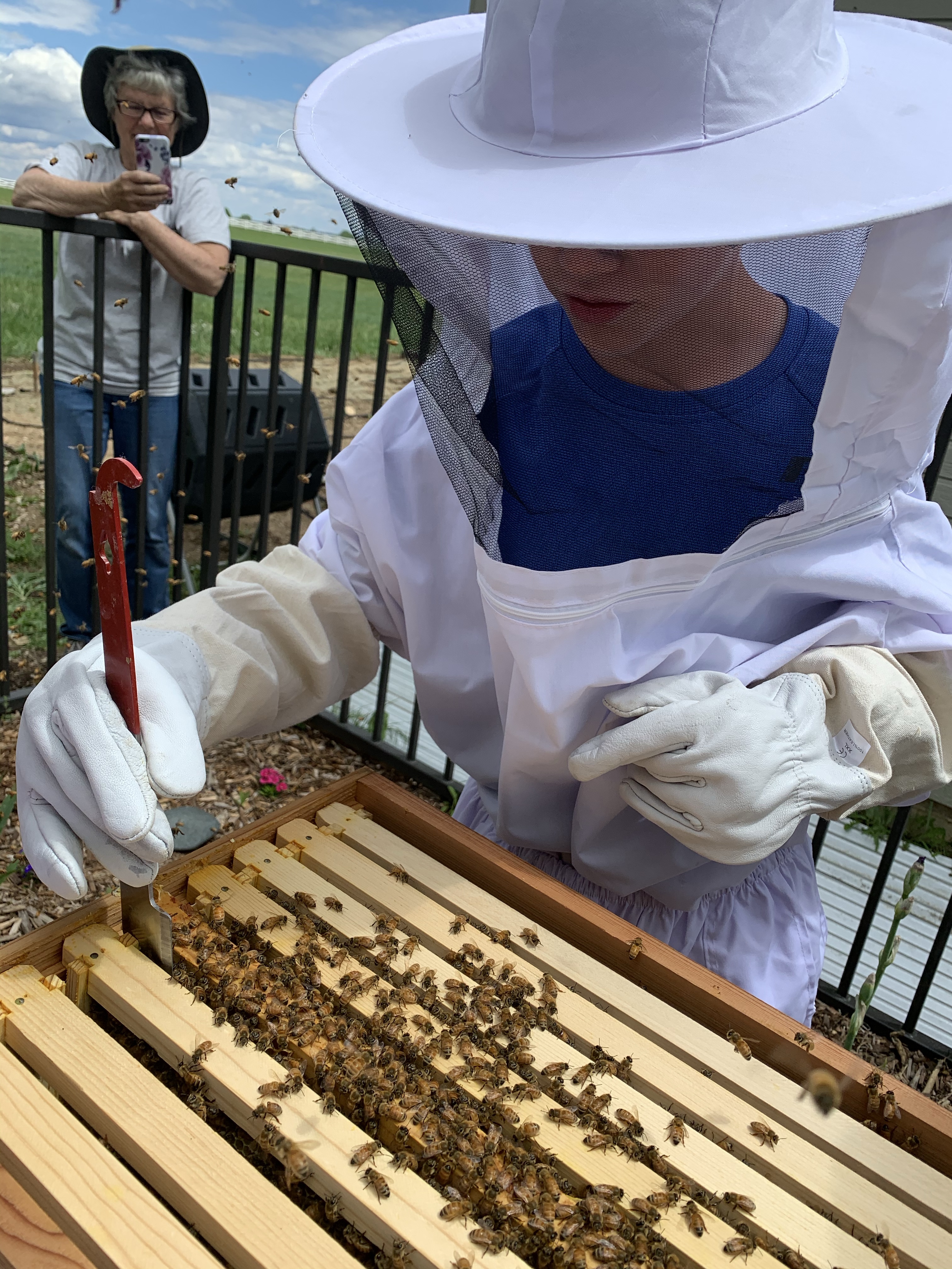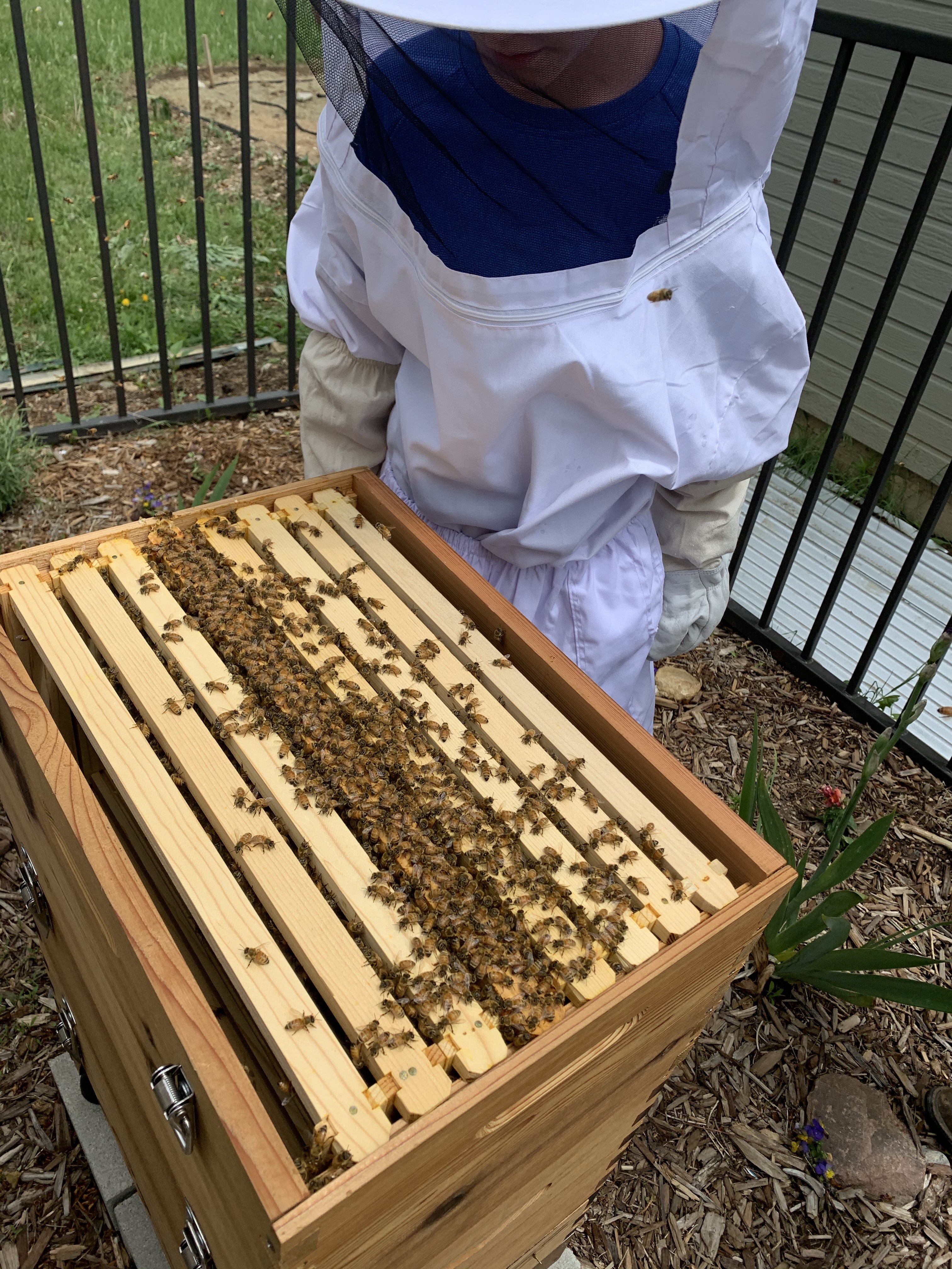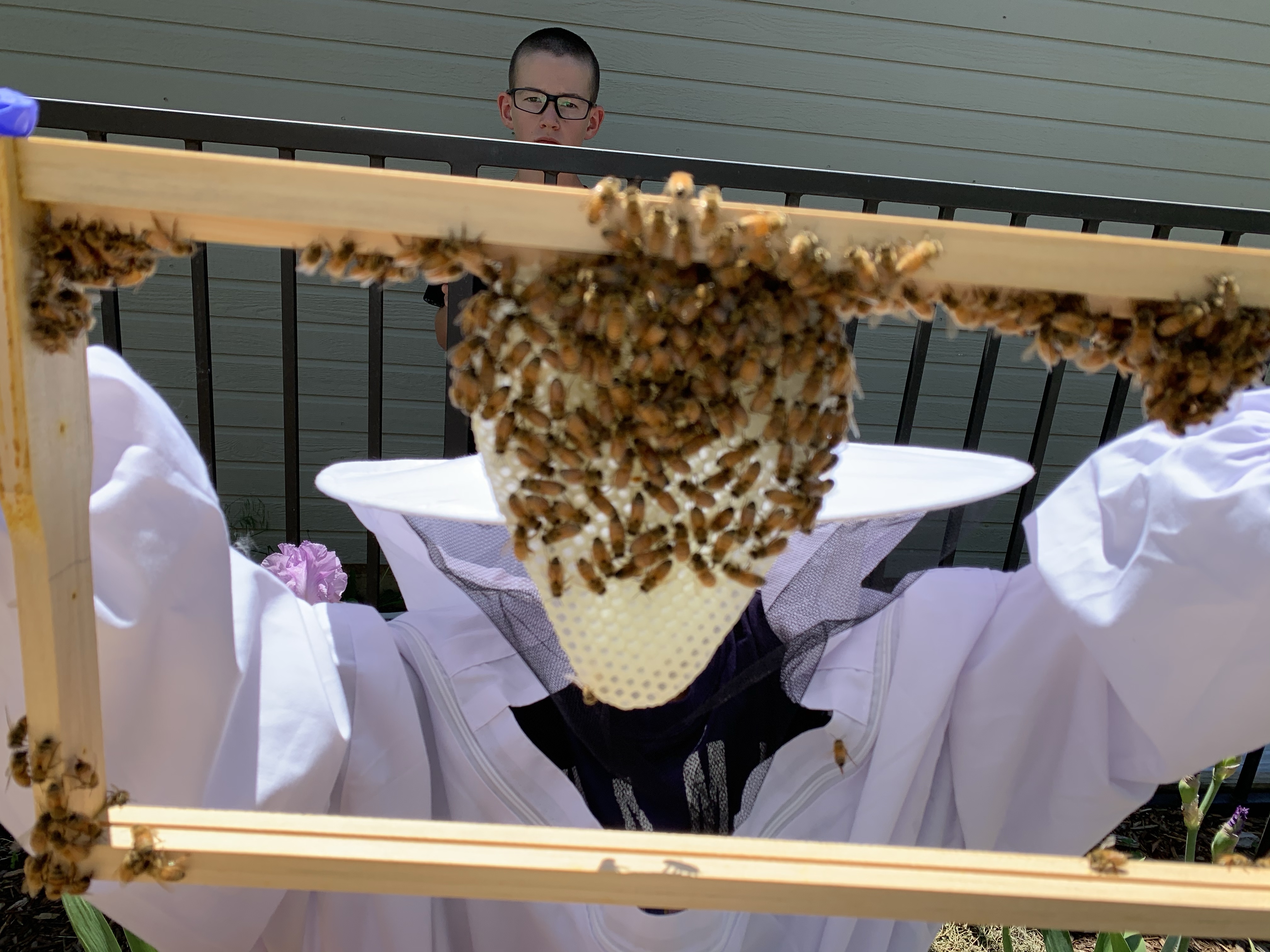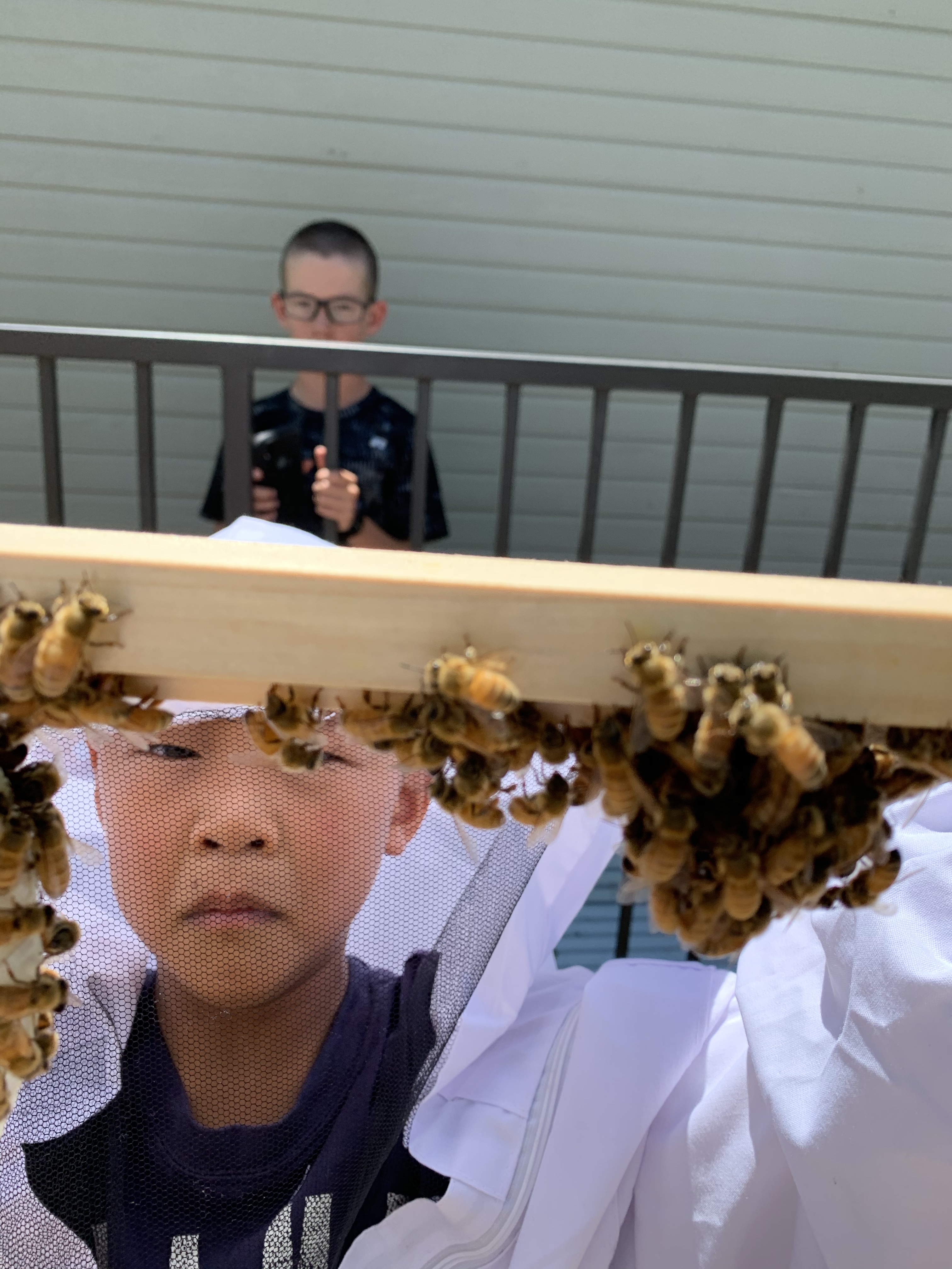 Our bees are doing well. We are all learning and ton and having lots of fun with it. We do frequent walks out to the hive just to watch them flying in and out bringing pollen and nectar back to the hive. On Memorial Day my dad helped Leighton, Caedmon and I check the bees and he helped the boys take off the entrance reducer and put in a mouse guard over the front. It’s really early to worry about autumn mice staking out my hive for their winter home but the mouse guard also reduces the entrance some and it was a good transition piece that I will probably just leave on full time. On that day the bees seemed to really love Caedmon’s bee hat which he thought was great. About a week later Edric and Clint checked the bees with me. We were able to watch a couple baby bees hatch and filmed the queen and all her exploring over the comb and laying eggs. I think we are all enjoying this more than we even thought we would.