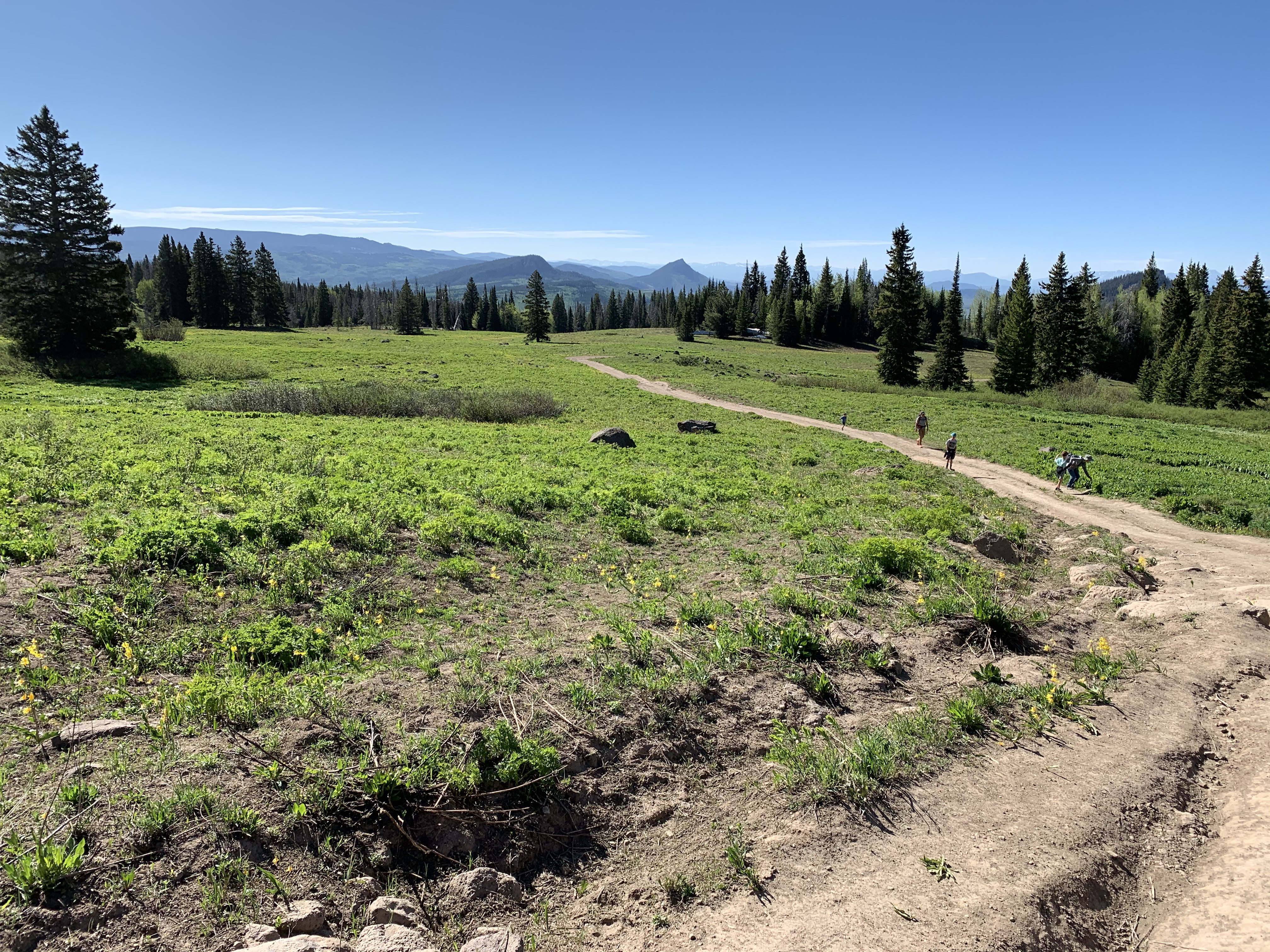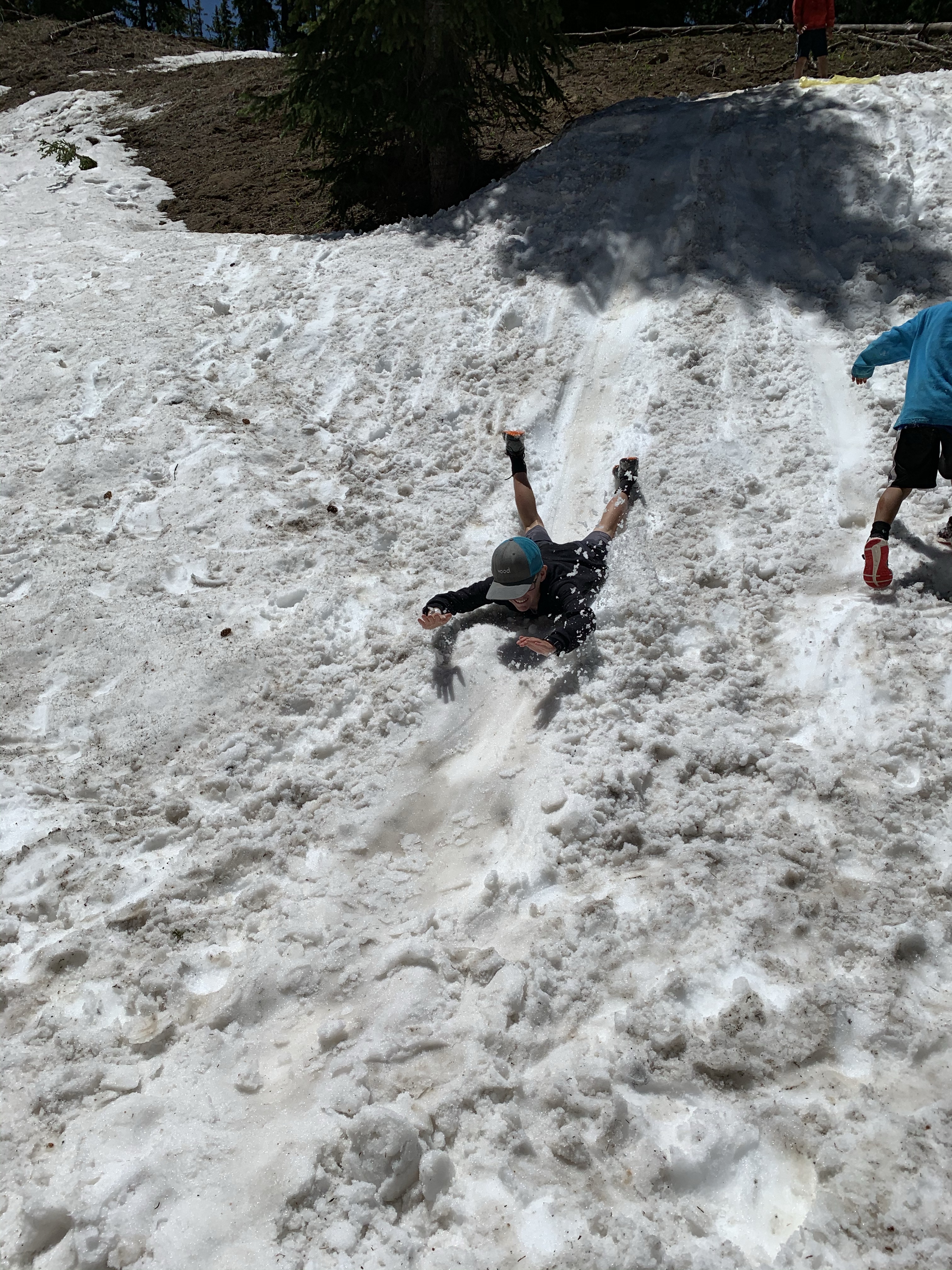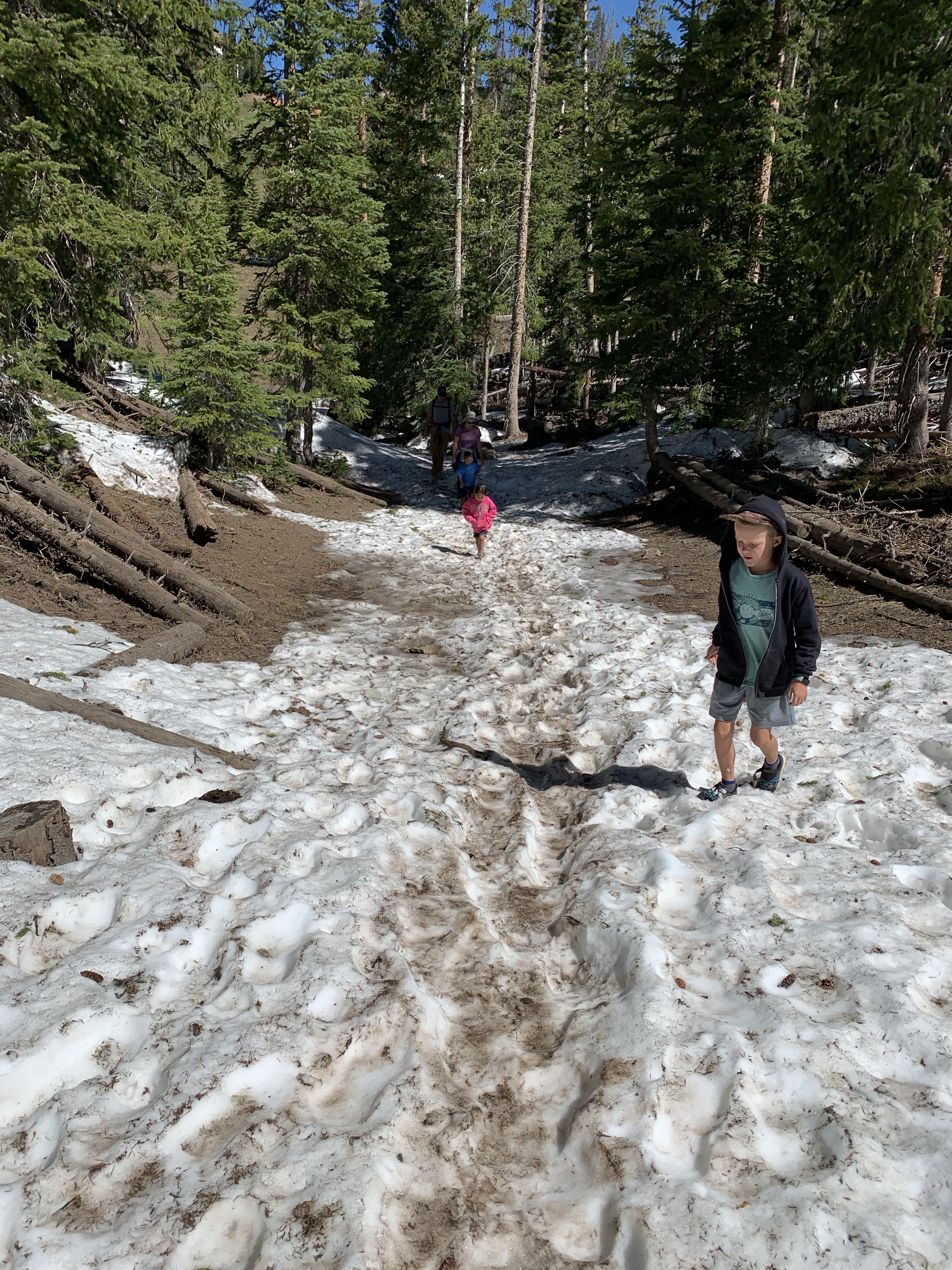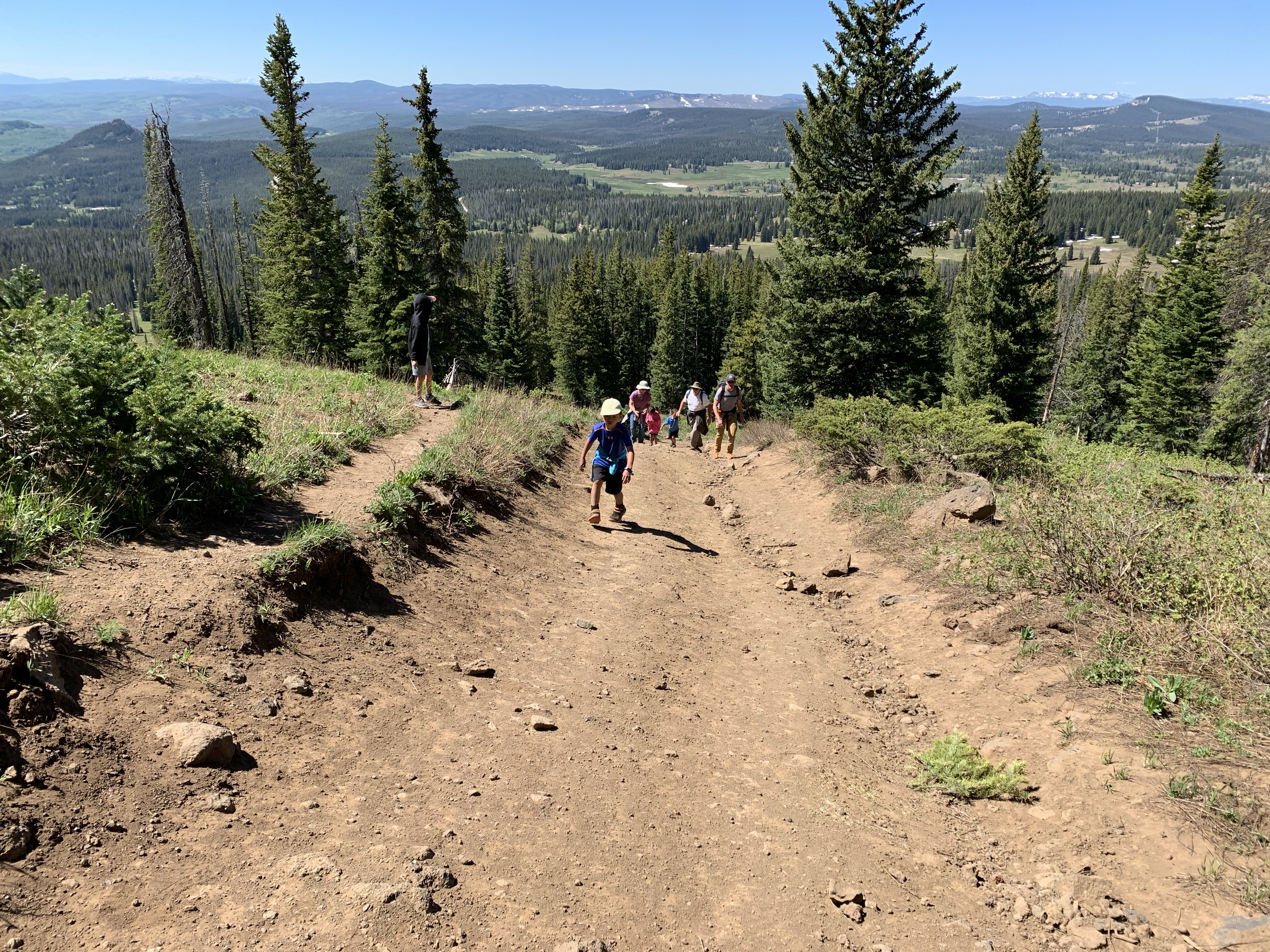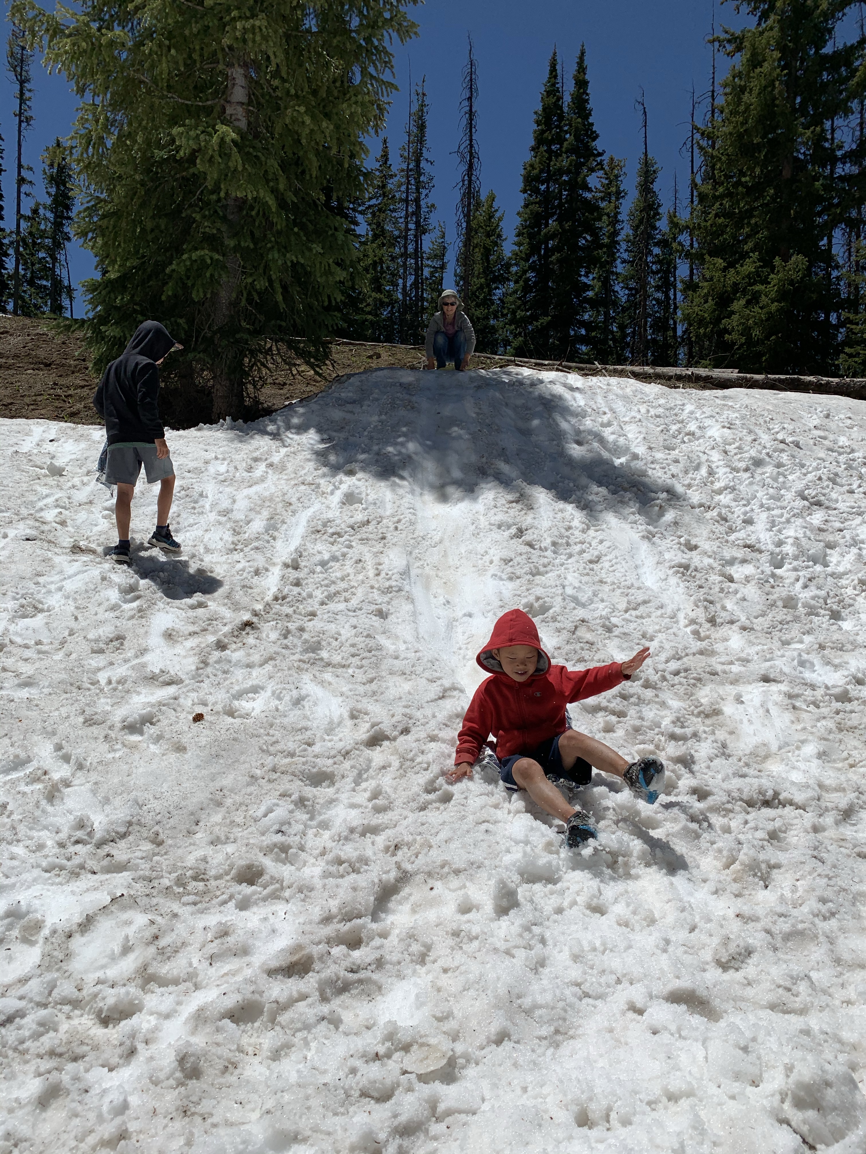 While we were up at my Aunt’s cabin we hiked up Rabbit Ears. The day was beautiful and we could not have asked for a better day. We hiked through fields of wildflowers that were abloom and gorgeous. Part way up we came to a large snow field which meant we all took turns sliding down the snow and laughing. The last bit of the hike is fairly steep but everyone made it to the top and we had a great lunch at the top enjoying the breath taking views. On our way back down we again slid and had a blast at the snow field. It was a great 6+mile hike!