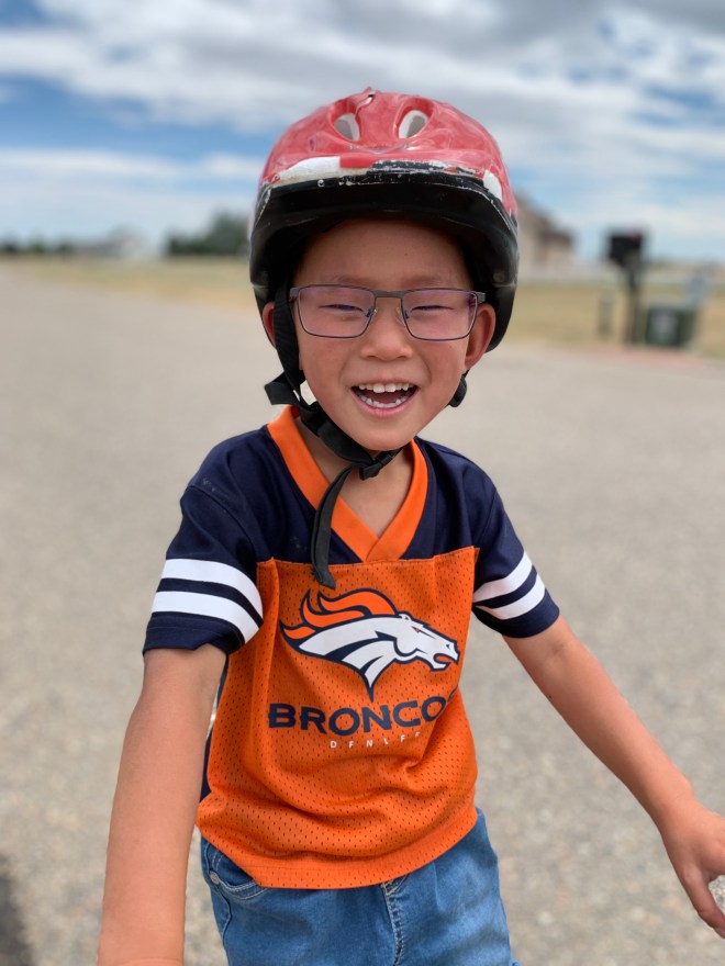 Clint and I have both wondered since Paxton came home what his vision was like. He always held things really close, and while I know most kids bring things really close he just seemed to bring them closer compared to the other kids. He often would tell us “I don’t see them” when we’d ask him to go pick up the toys in the yard or the socks on the floor. So we finally had it confirmed at his first eye appointment a couple of weeks ago. His vision is about the same as Leighton’s and Clint’s and way better than mine ever were (pre-surgery for me). Last Thursday he picked up his new glasses. The guy is little and I was concerned that there wouldn’t be any that fit his little face and small nose bridge well but he picked these out and really likes them. He’s still getting use to wearing them but doing a pretty good job of rocking the glasses.