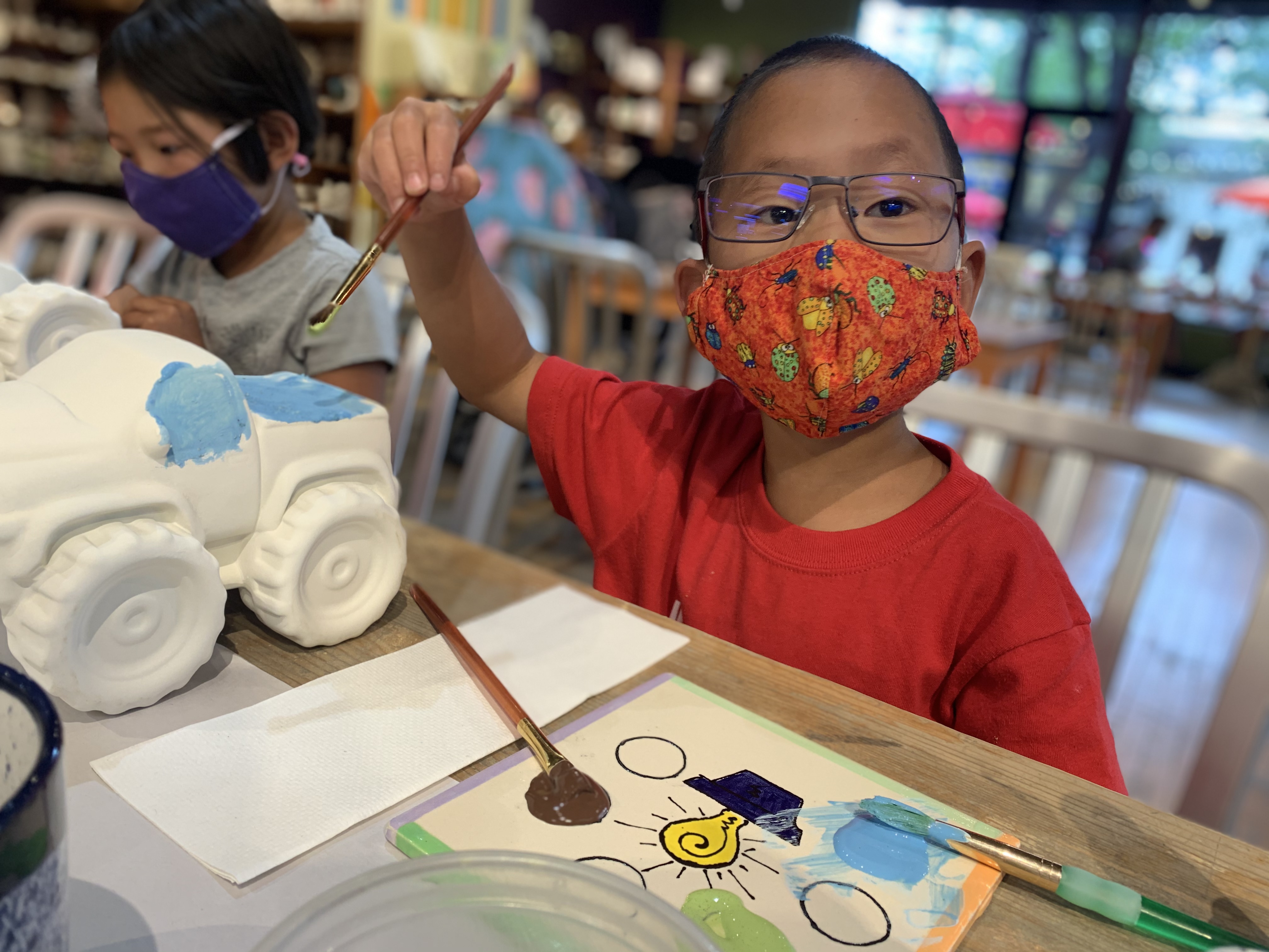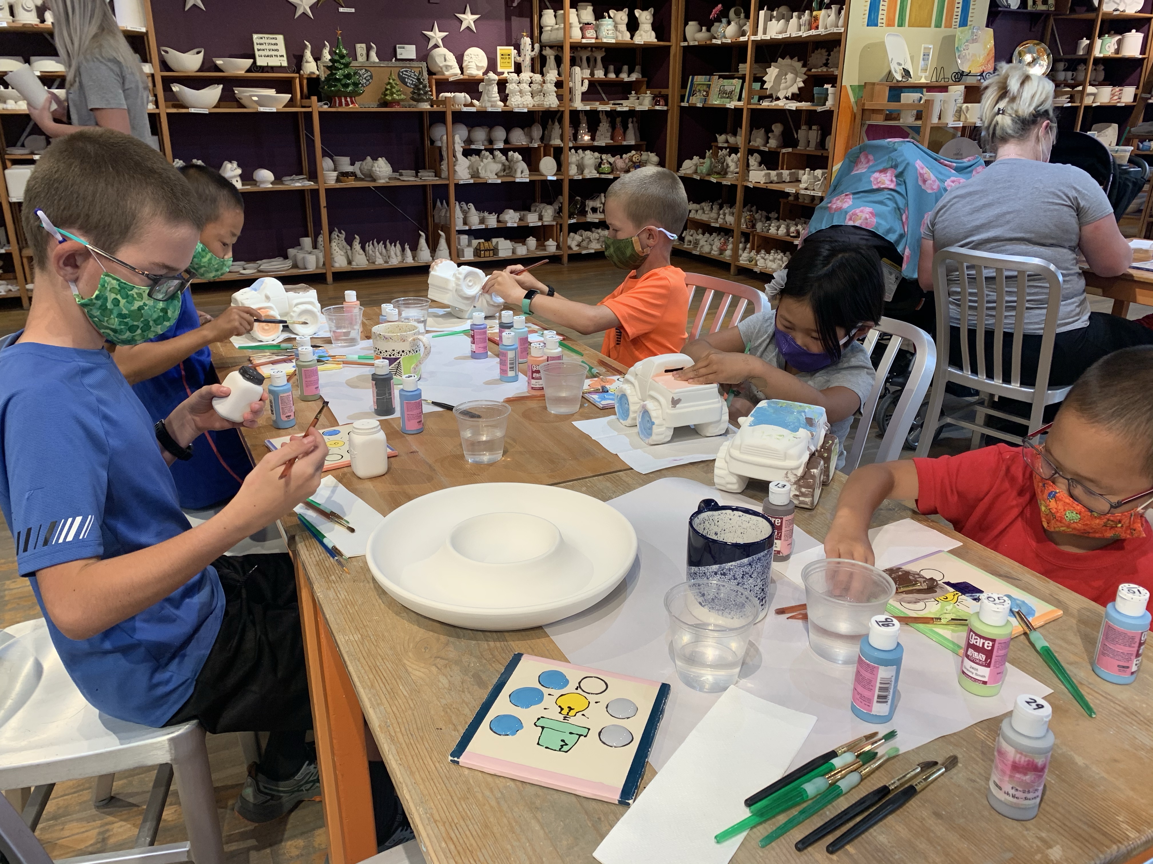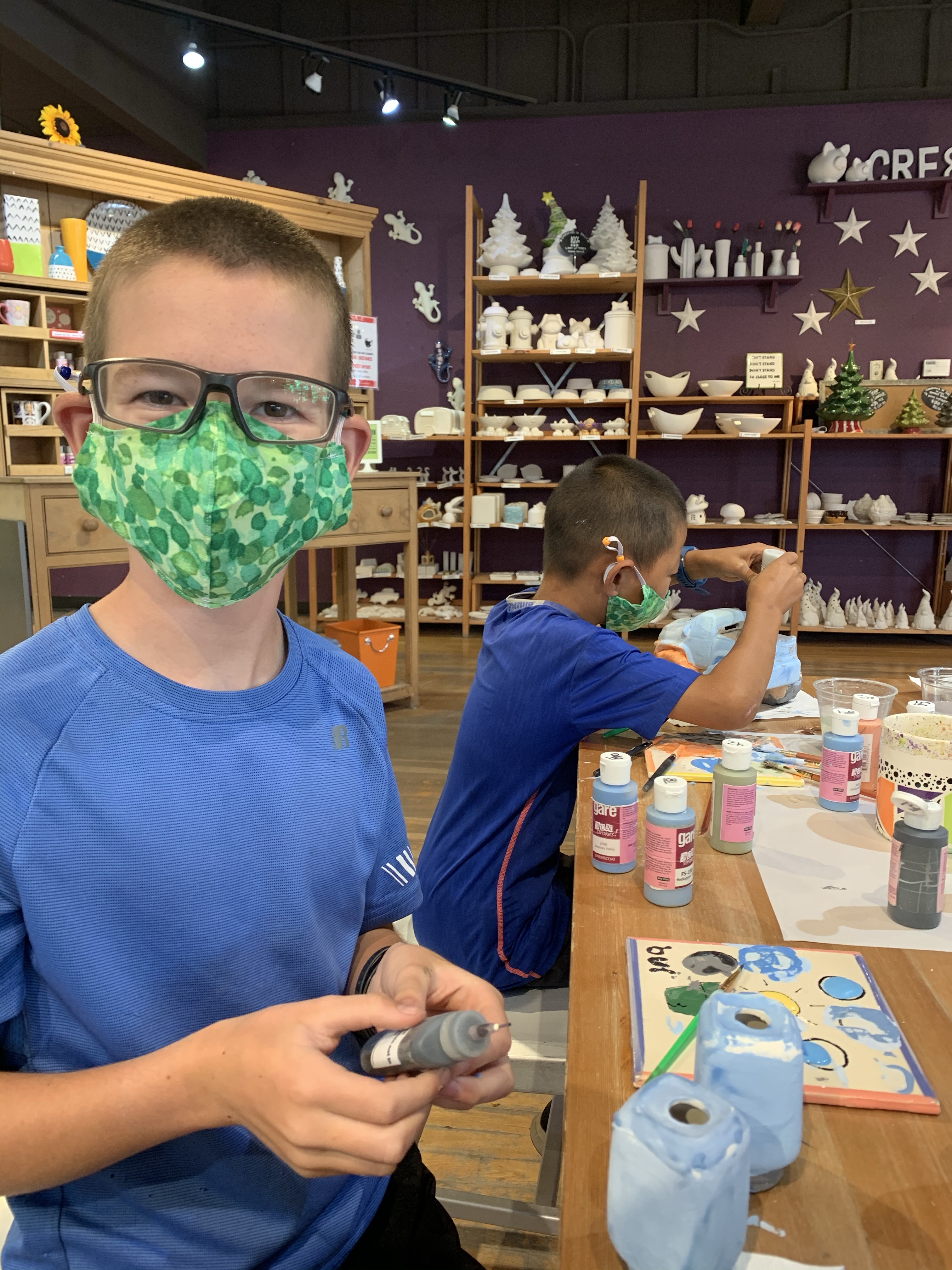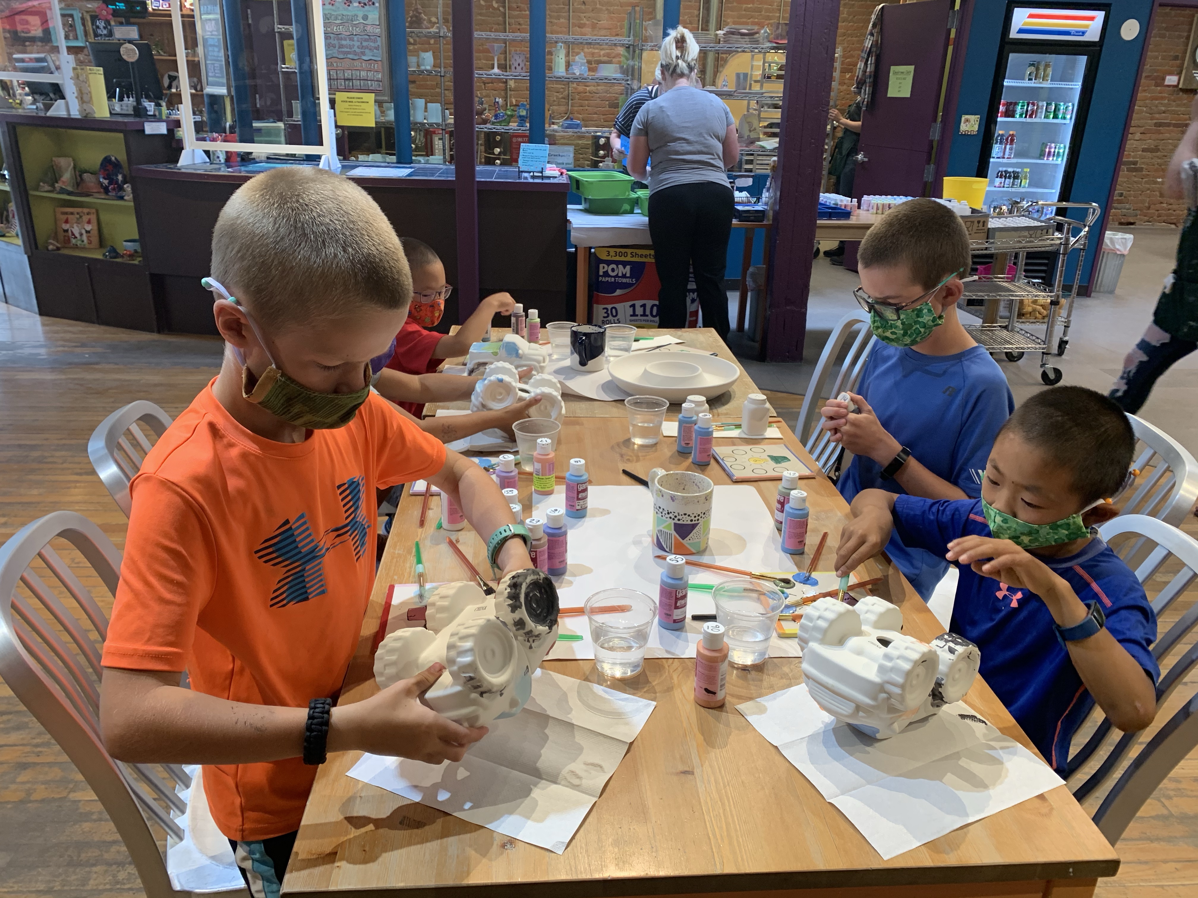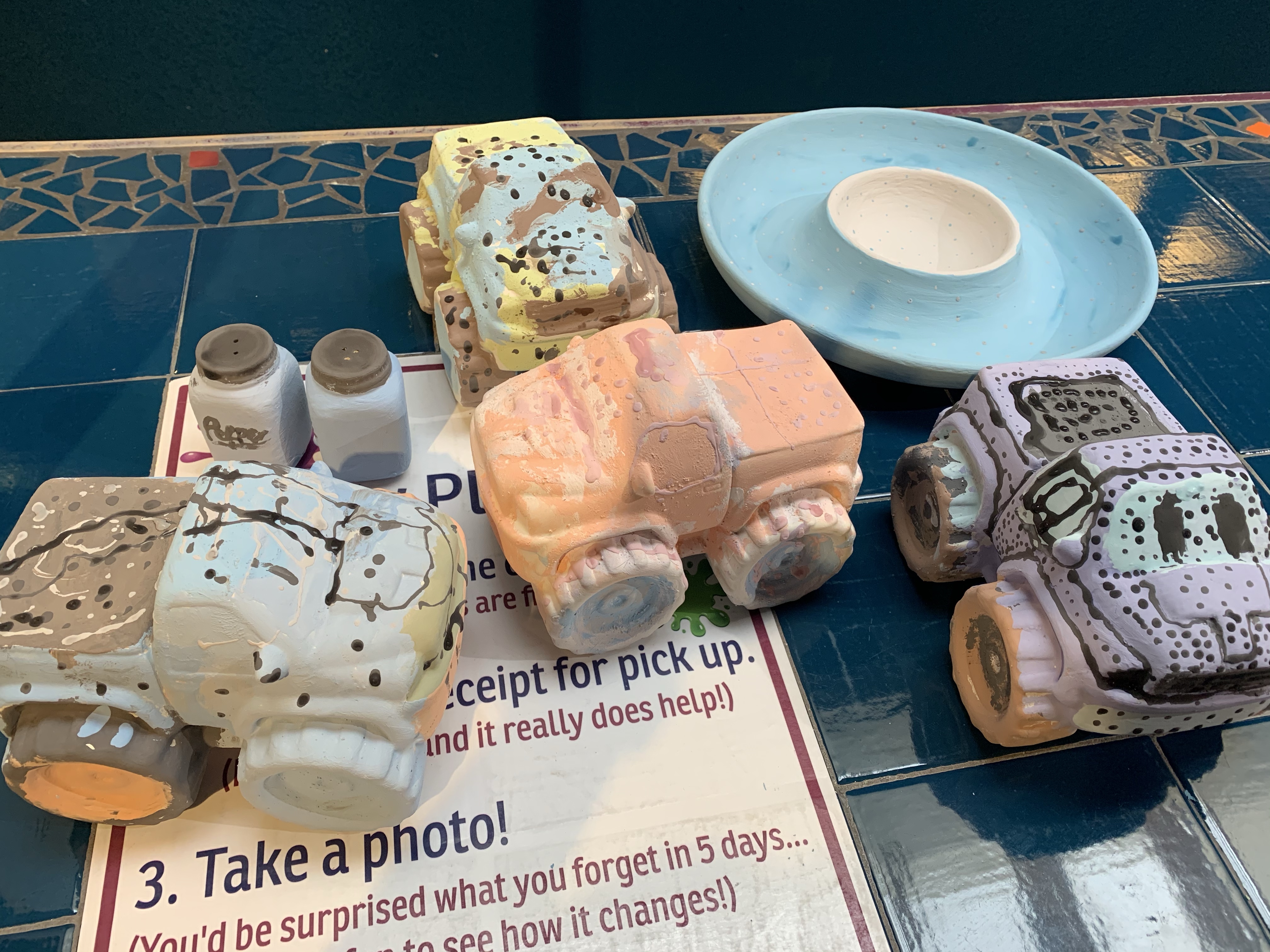 On Saturday Clint was going to have some friends over to brew a home brew and as much as I thought he probably wanted 5 little helpers around I thought it might be beneficial if we found something else to do. I thought about going for a hike but mid-day in late July sounded hot and no fun….so I finally decided that taking them to a place with tons of breakable things and giving them paint sounded like a better idea. It actually was a lot of fun and then kids were super excited. I let them each pick out what they wanted to paint…..and 4 of the 5 decided they wanted to paint Monster Truck piggie banks. I totally figured Coppelia would go for the cupcake treasure box but nope, she wanted a monster truck too. Leighton picked salt and pepper shakers and I did a salsa and chip bowl. We wore our masks and they had everyone spread out so we followed all the rules. The kids painted for over 2 hours and had a great time. The pieces won’t be finished until Thursday, but I’m excited to see them!