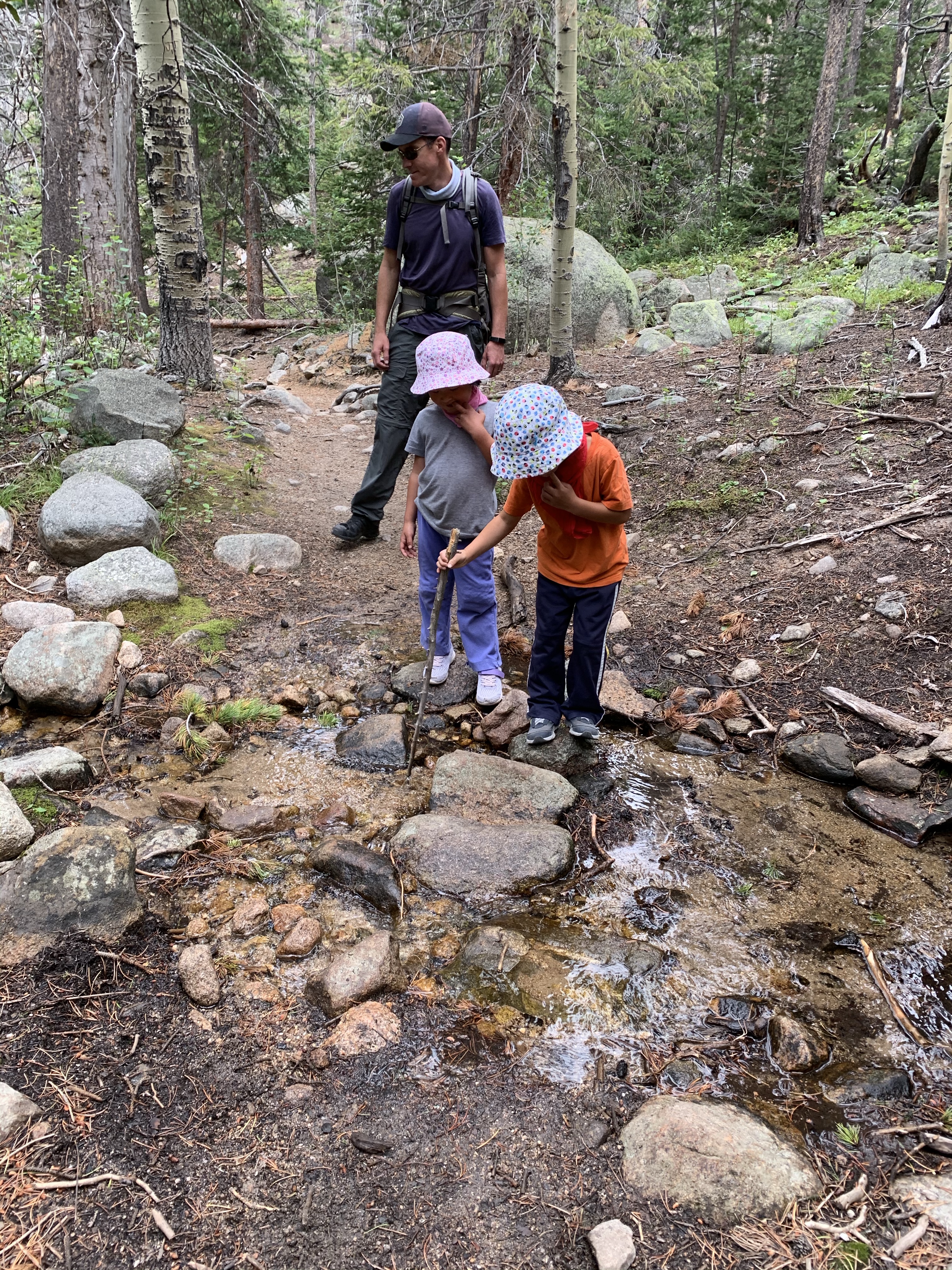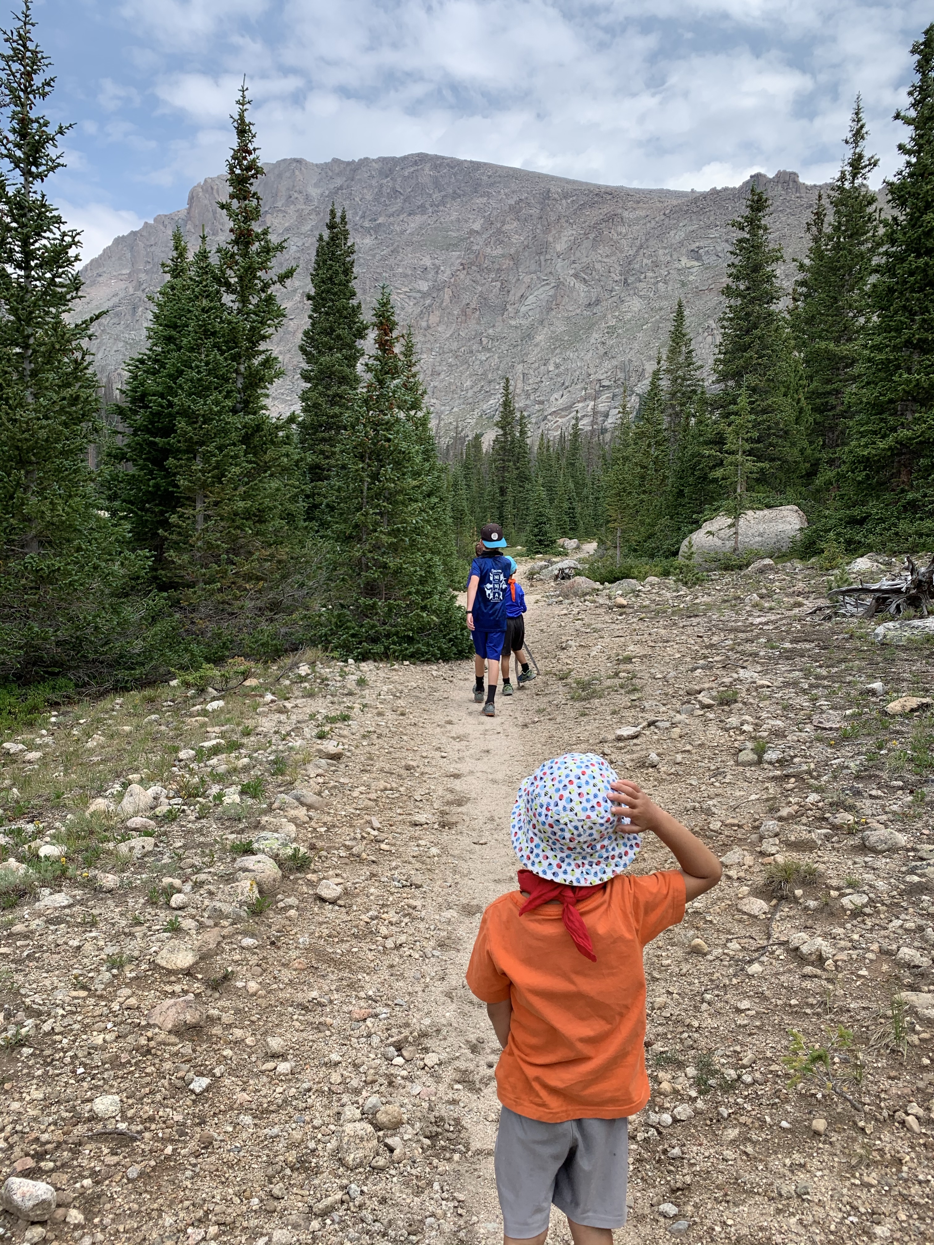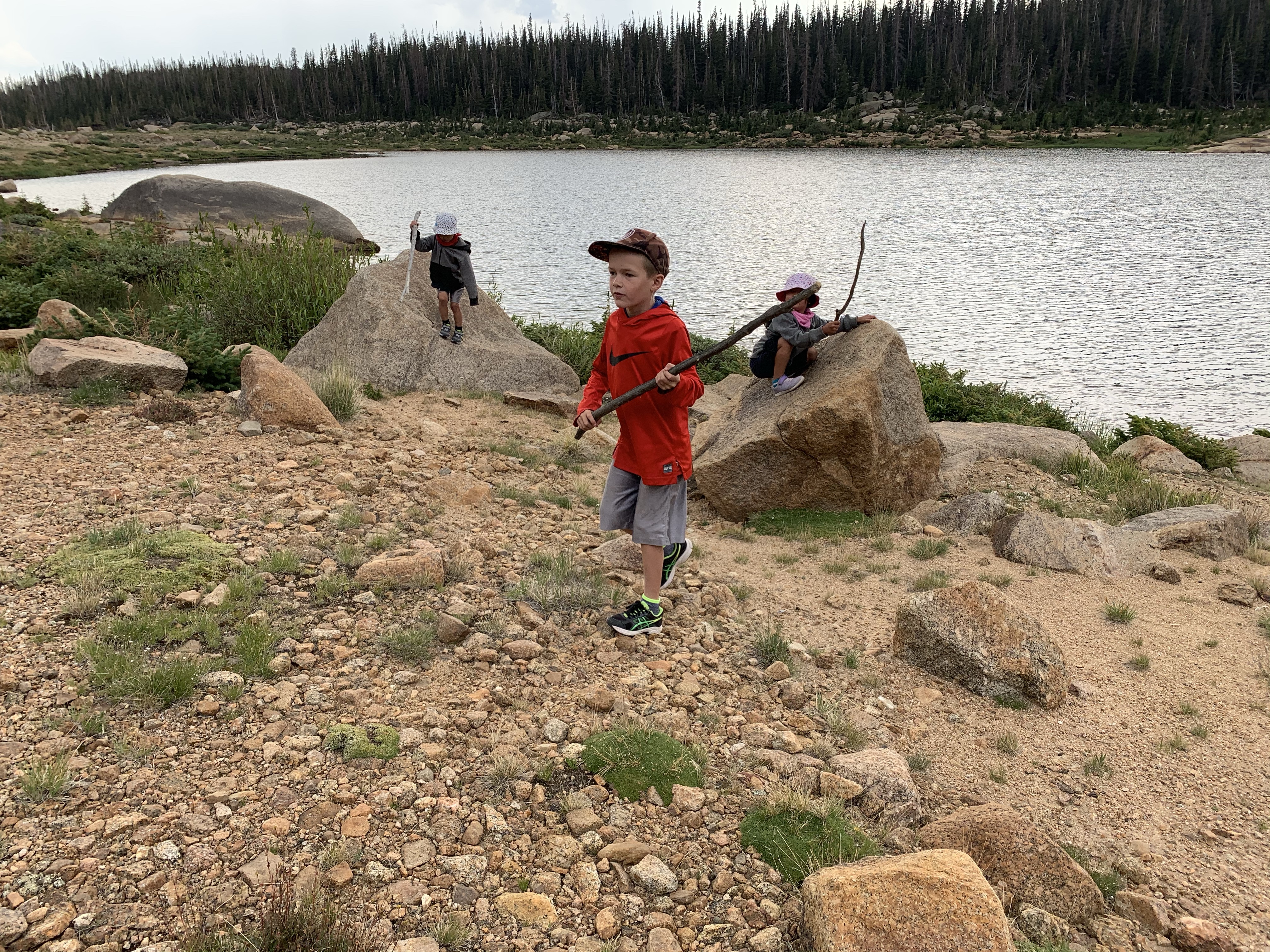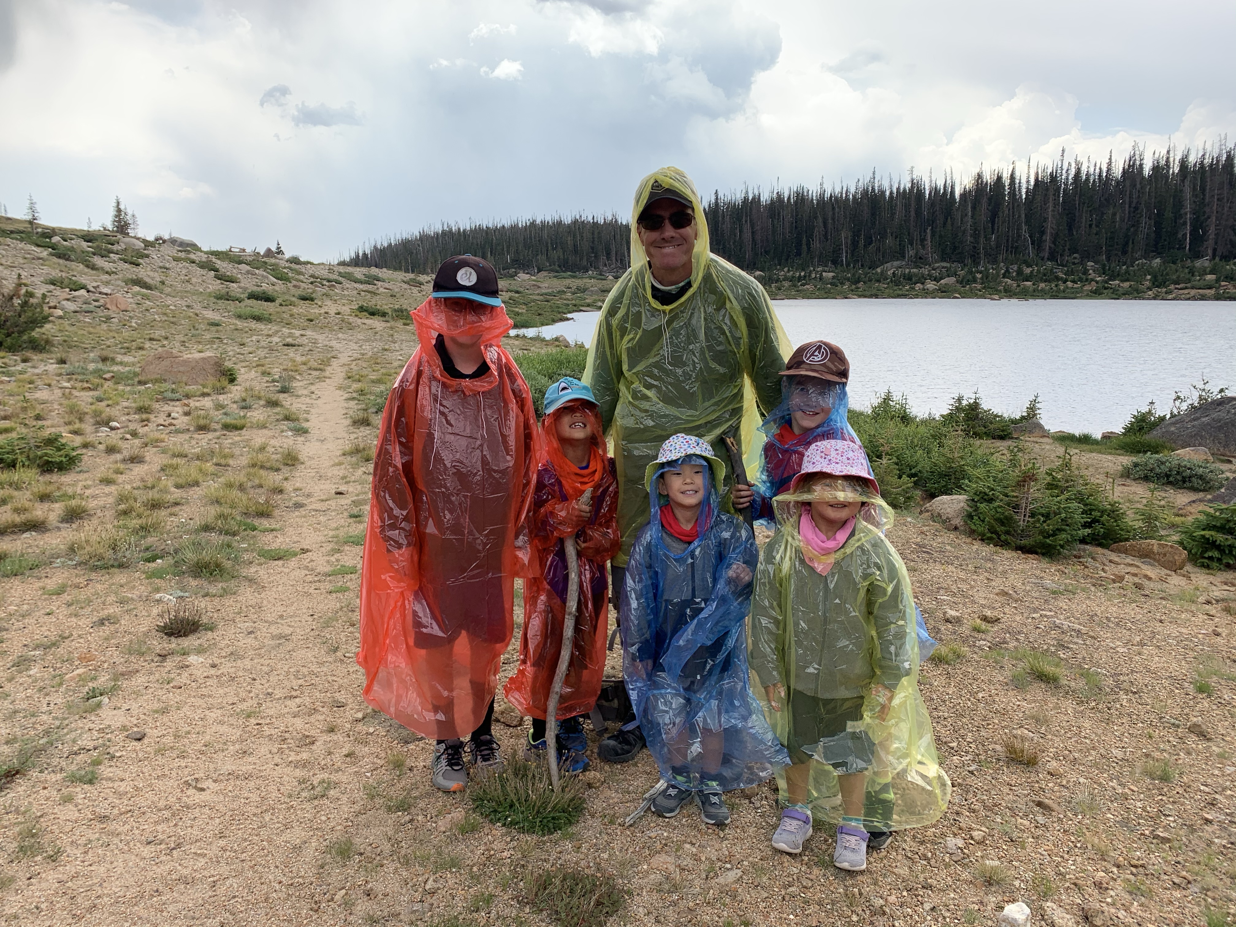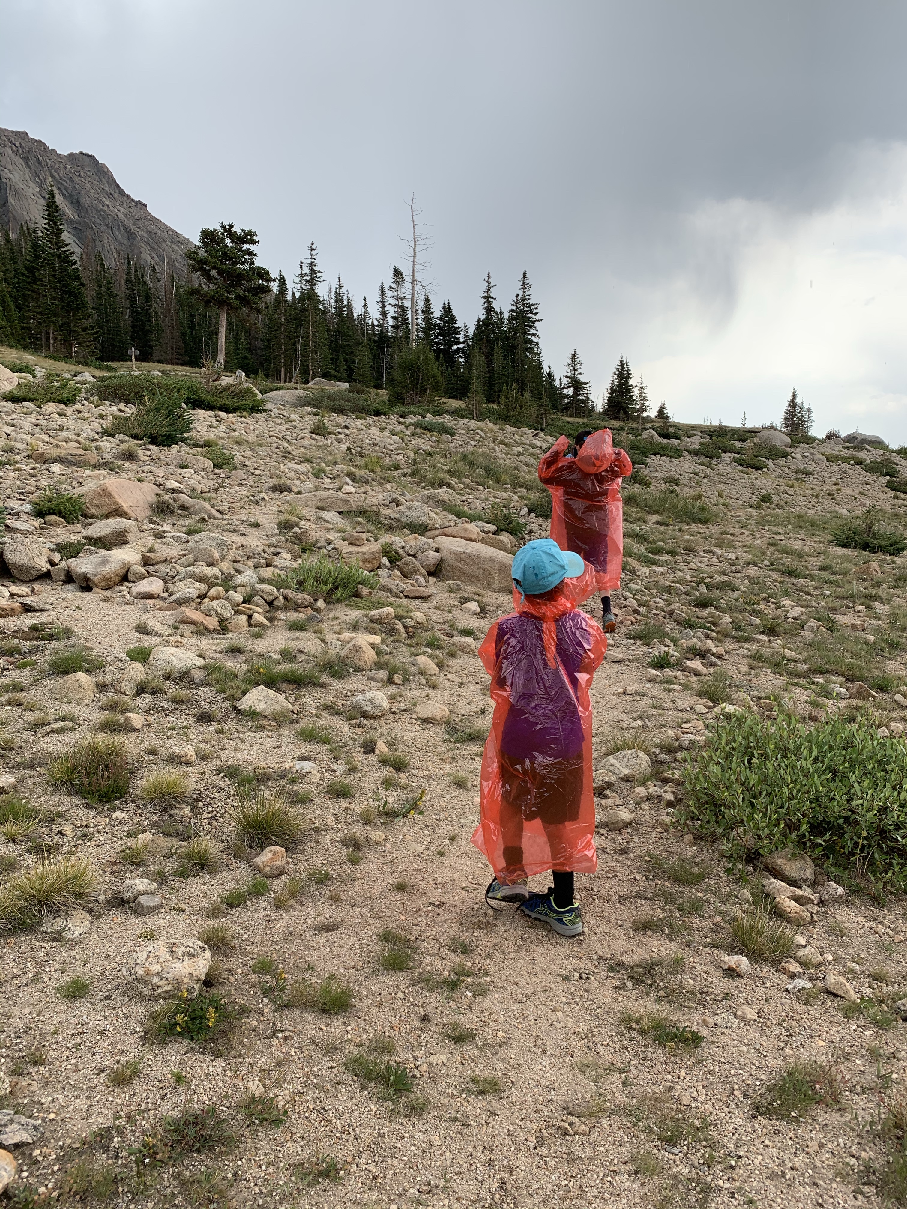 On our second day of backpacking we left the tents and bags behind (except for Clint who carried all our food/water/snacks/extra clothes for the day) and headed up the Lawn Lake trail near our camp site. It was a gorgeous day and a tough hike. We had a head start already being nearly 3 miles up the trail at our back country camp site, but it was nearly 4 miles more to the top. And it was about 1500 feet more in elevation climb as well. The kids didn’t really seem to notice it and we had a blast hiking and exploring. The view at the lake made the hike all worth it. It was absolutely breathtaking and we talked with the kids about God’s great creation and beauty. We made it to the lake about lunch time and sat down and enjoyed our lunch. As we were eating I looked up and there was a large moose across the lake eating her lunch as well. It was pretty neat to see. The kids were just as impressed with the moose as they were with a marmot that kept coming near. At least until the marmot started eating some nearby animal poop and then they weren’t so impressed with it. We climbed and played on the rocks near the lake and had a great time. However clouds quickly rolled in and we decided to head back to our camp site. But then the clouds really moved in and so we put everyone in ponchos just in case, and as it turned out we got those on with about a minute to spare. They were great though and kept us dry in the storm. The hike going back was almost all downhill which made it nice, we told stories, pretended that we were motorbikes, giggled and had a good hike back. In the end we did almost 9 miles. We headed down to the river by our camp site and played in it the rest of the afternoon. I’m pretty sure we re-routed the river with all the rocks and sticks that we threw in. Clint had dehydrated homemade fried rice for our dinner that night and we all enjoyed that with some hot chocolate. Everyone slept really well that night in our tents.