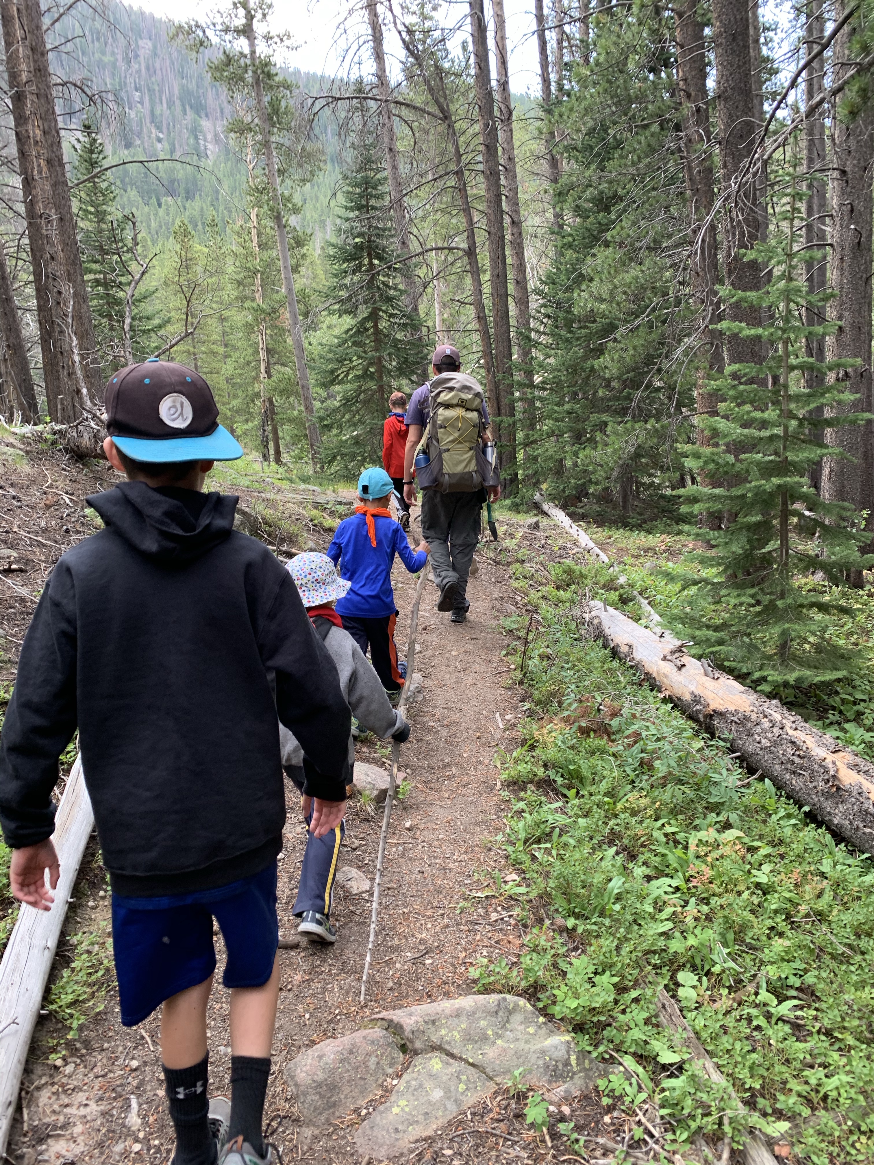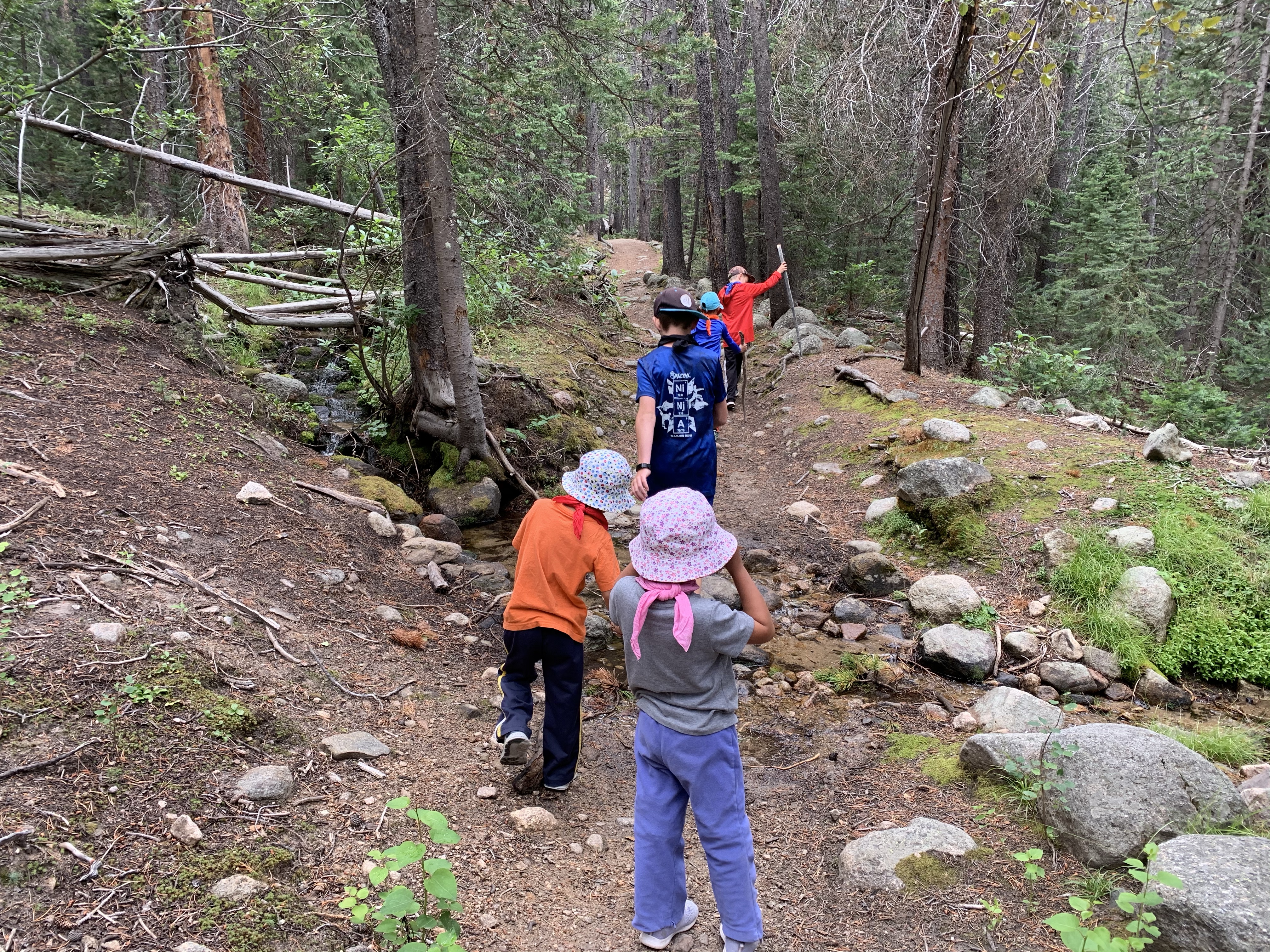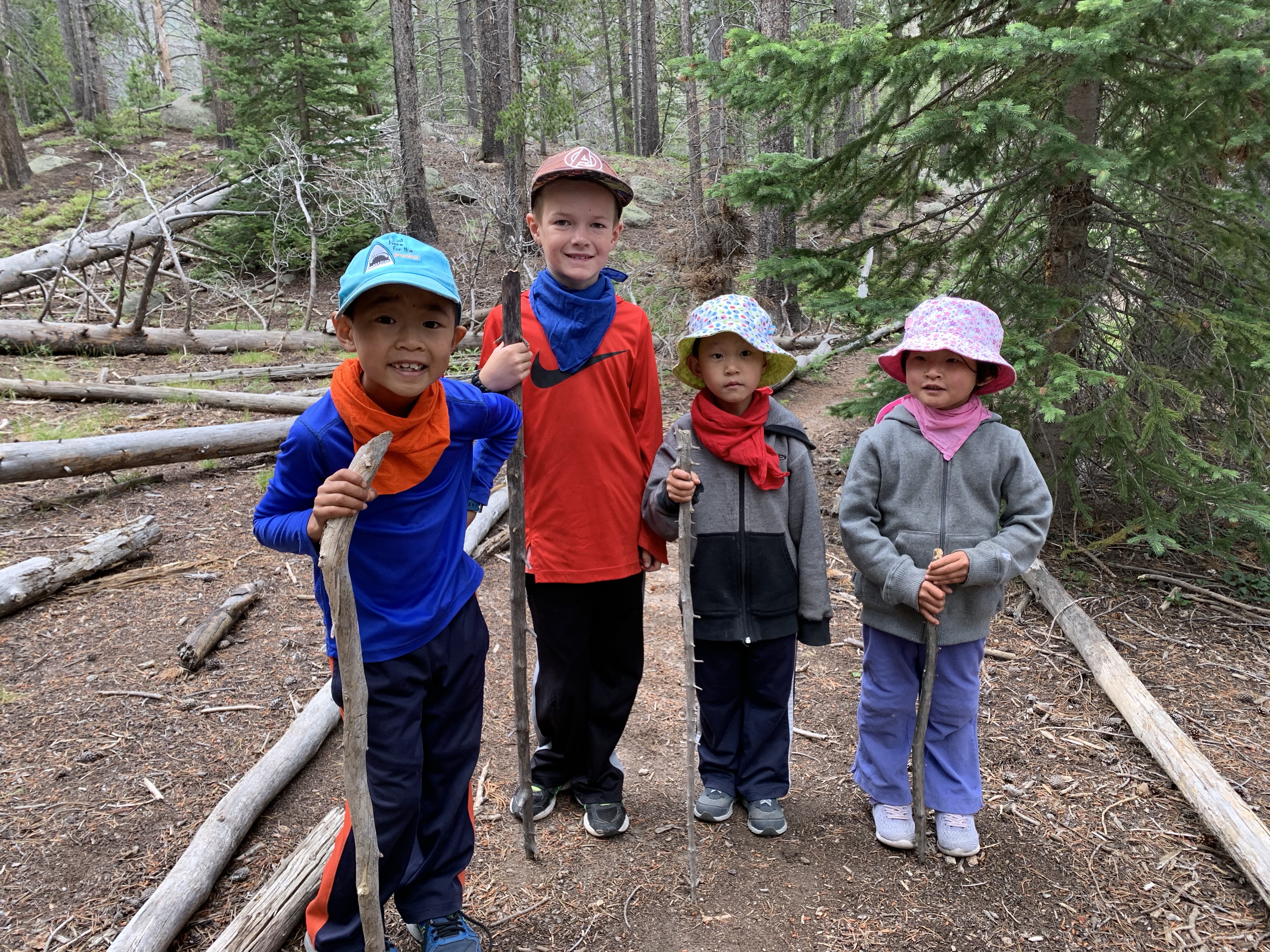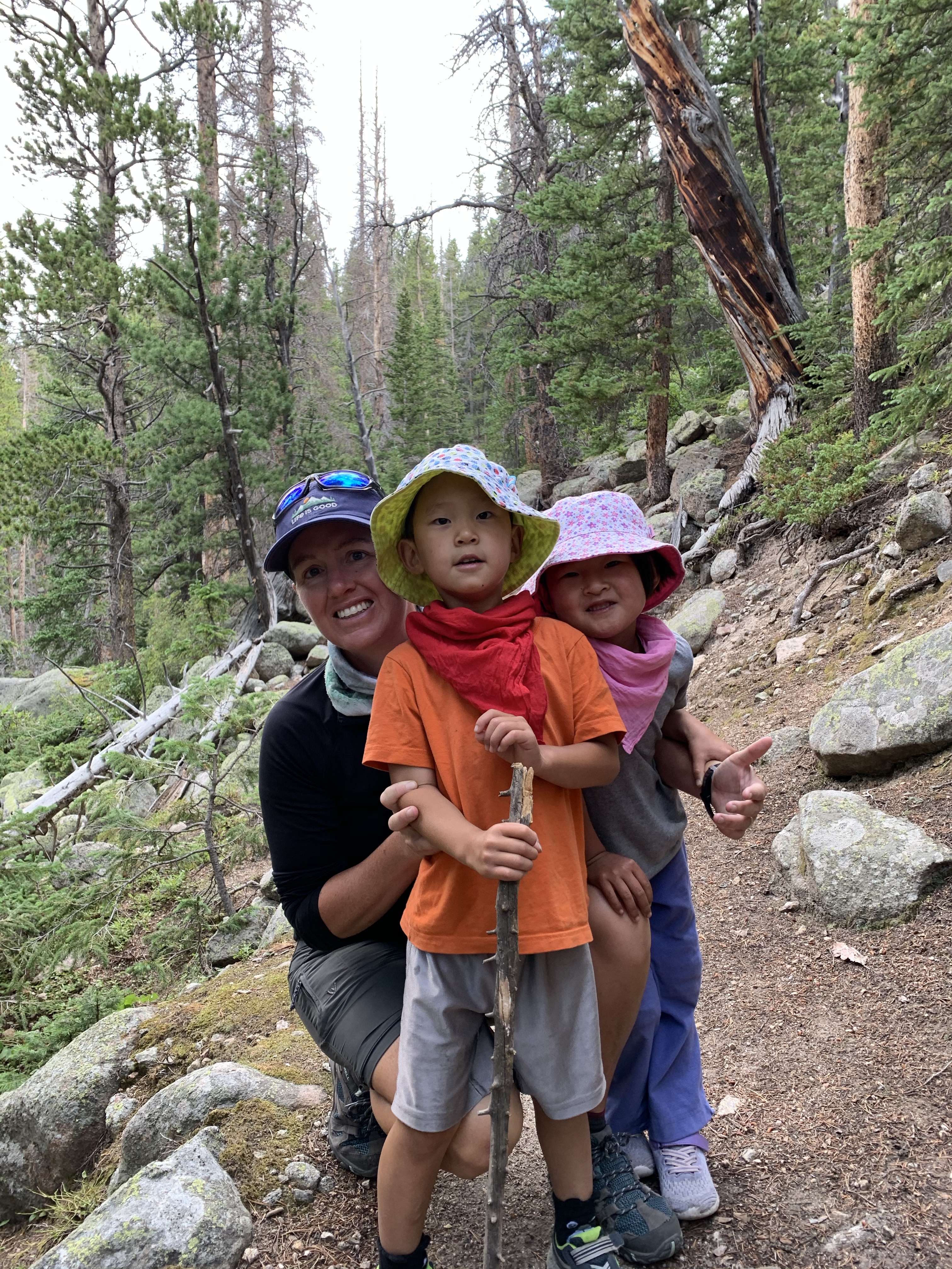 On our second day of backpacking we left the tents and bags behind (except for Clint who carried all our food/water/snacks/extra clothes for the day) and headed up the Lawn Lake trail near our camp site. It was a gorgeous day and a tough hike. We had a head start already being nearly 3 miles up the trail at our back country camp site, but it was nearly 4 miles more to the top. And it was about 1500 feet more in elevation climb as well. The kids didn’t really seem to notice it and we had a blast hiking and exploring. The view at the lake made the hike all worth it. It was absolutely breathtaking and we talked with the kids about God’s great creation and beauty. We made it to the lake about lunch time and sat down and enjoyed our lunch. As we were eating I looked up and there was a large moose across the lake eating her lunch as well. It was pretty neat to see. The kids were just as impressed with the moose as they were with a marmot that kept coming near. At least until the marmot started eating some nearby animal poop and then they weren’t so impressed with it. We climbed and played on the rocks near the lake and had a great time. However clouds quickly rolled in and we decided to head back to our camp site. But then the clouds really moved in and so we put everyone in ponchos just in case, and as it turned out we got those on with about a minute to spare. They were great though and kept us dry in the storm. The hike going back was almost all downhill which made it nice, we told stories, pretended that we were motorbikes, giggled and had a good hike back. In the end we did almost 9 miles. We headed down to the river by our camp site and played in it the rest of the afternoon. I’m pretty sure we re-routed the river with all the rocks and sticks that we threw in. Clint had dehydrated homemade fried rice for our dinner that night and we all enjoyed that with some hot chocolate. Everyone slept really well that night in our tents.