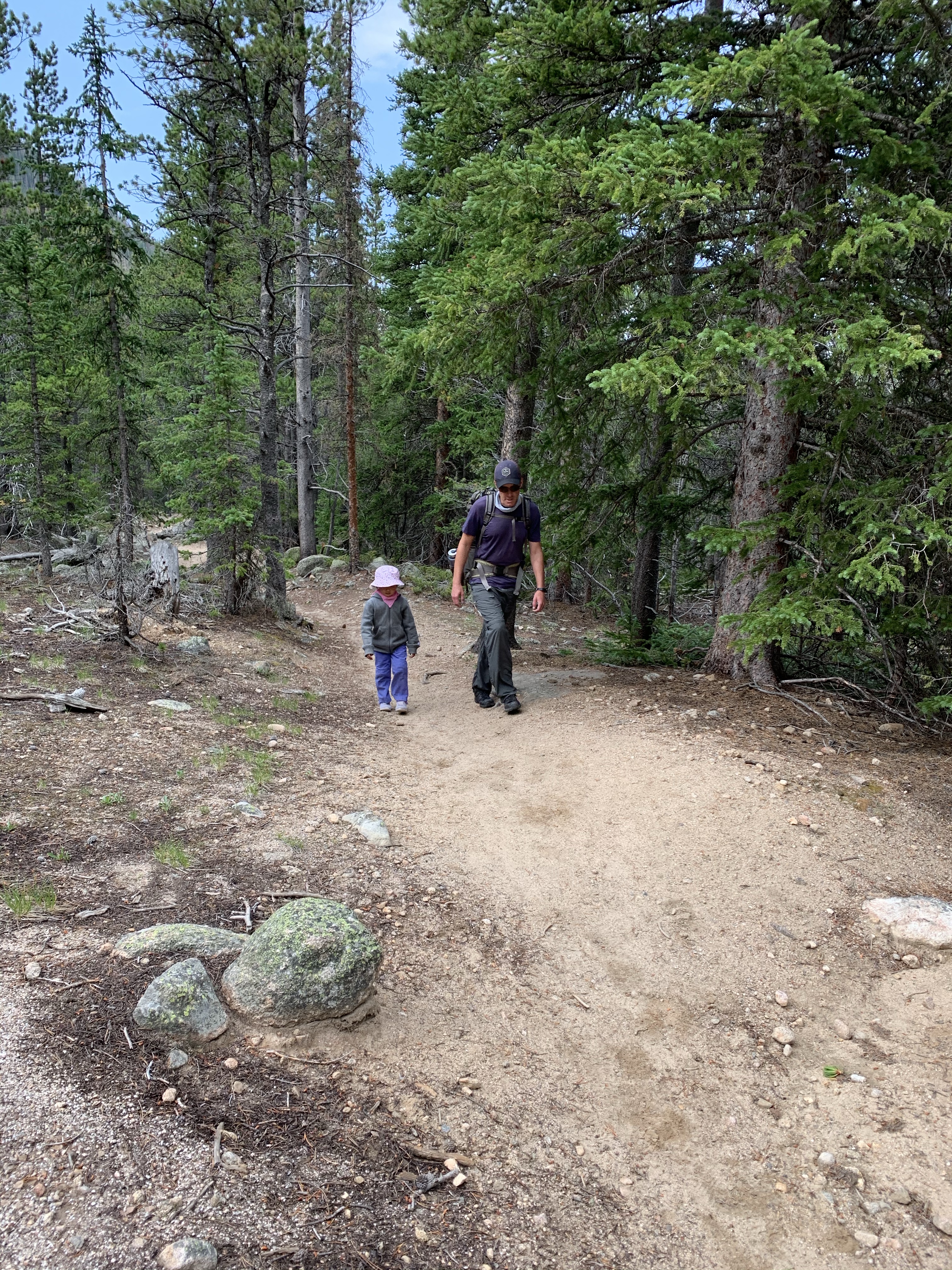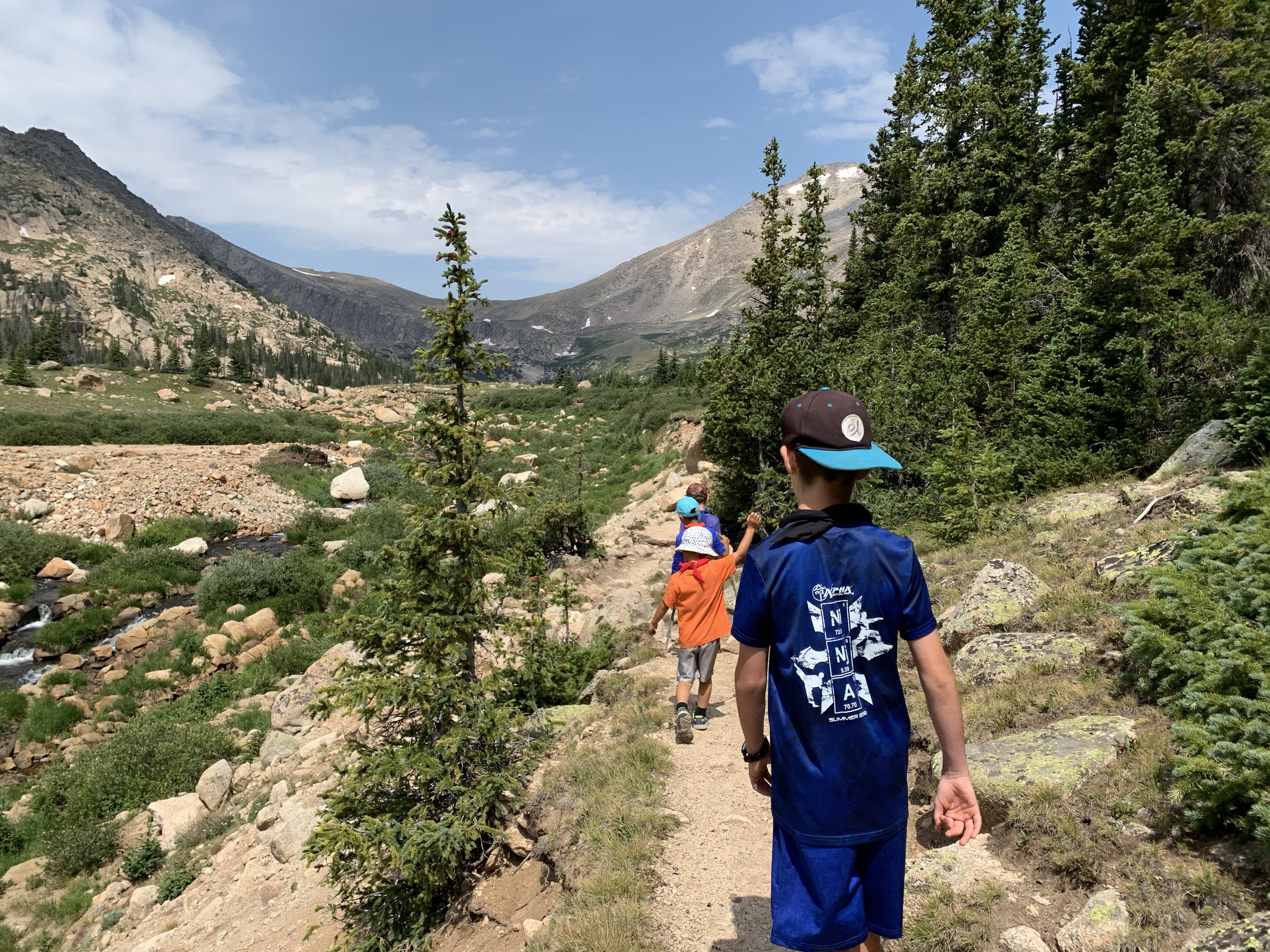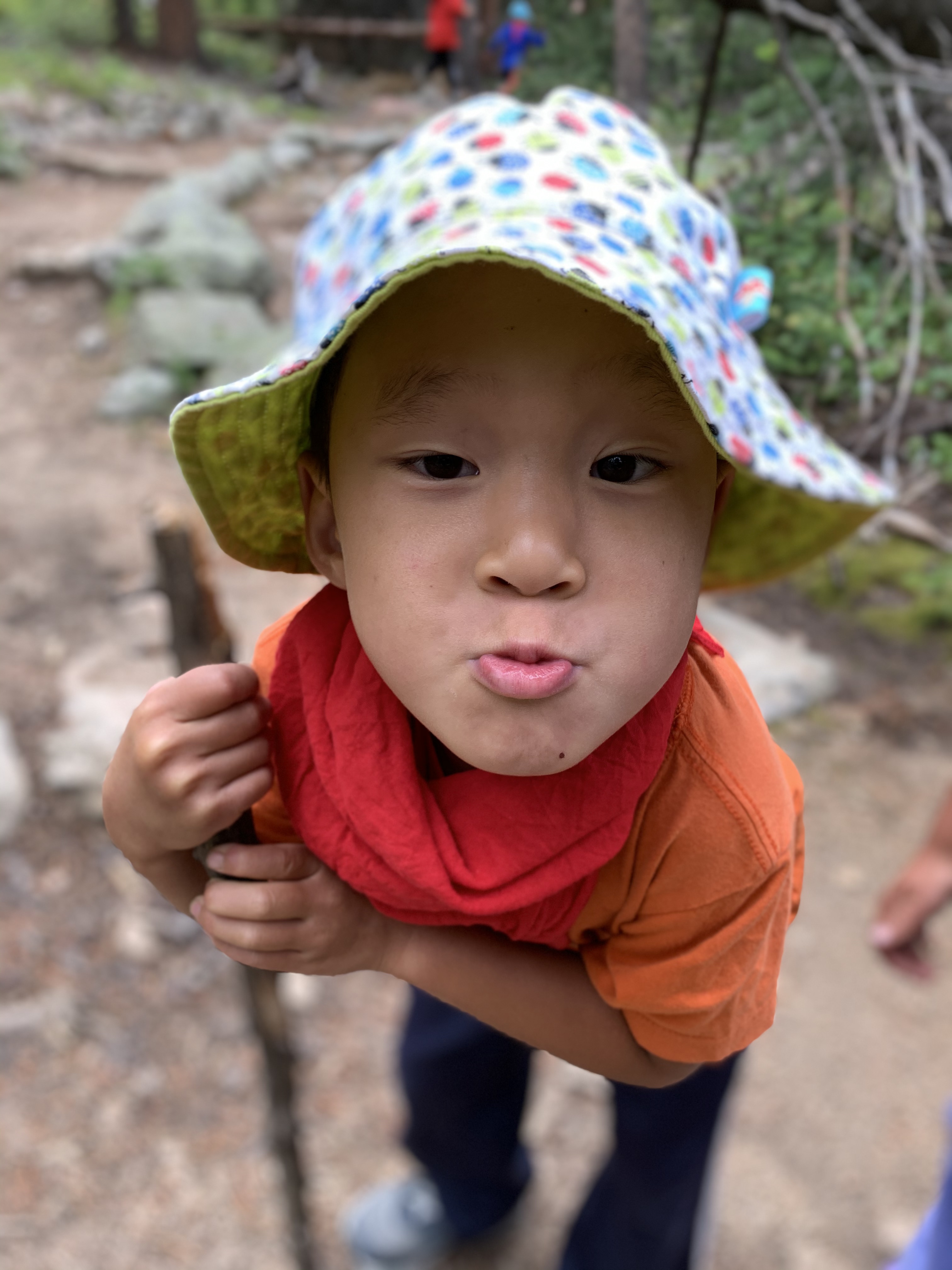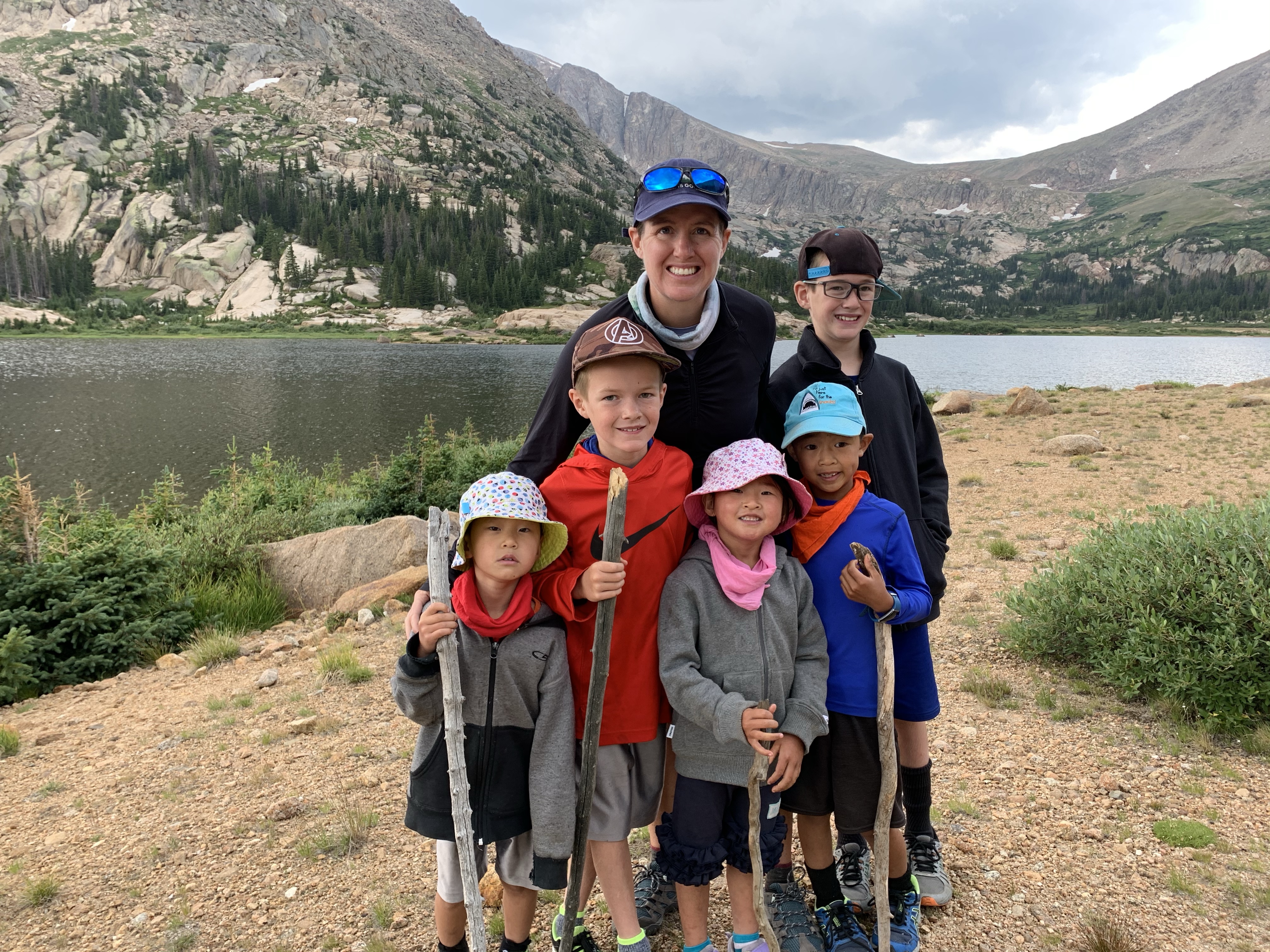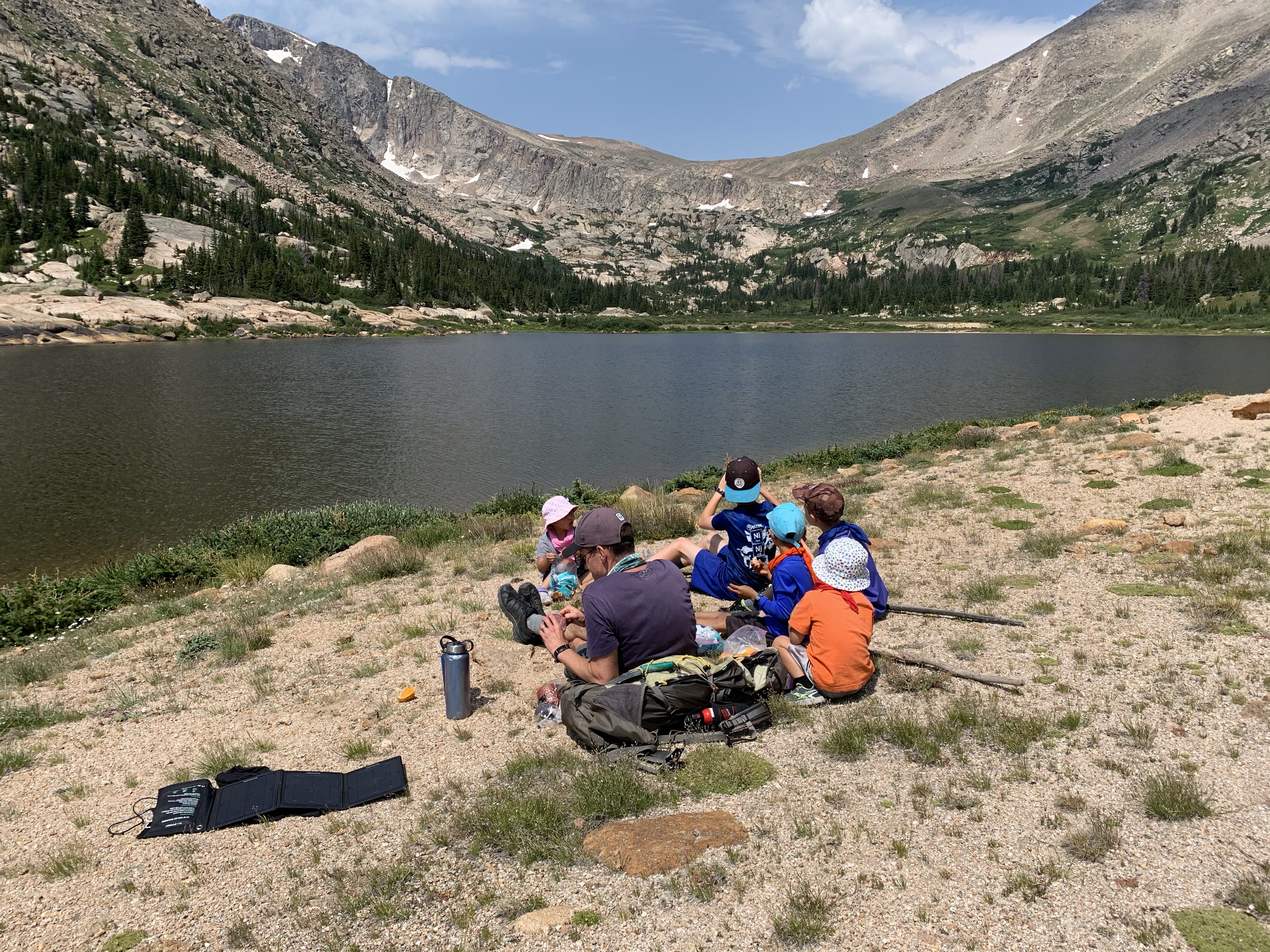 On our second day of backpacking we left the tents and bags behind (except for Clint who carried all our food/water/snacks/extra clothes for the day) and headed up the Lawn Lake trail near our camp site. It was a gorgeous day and a tough hike. We had a head start already being nearly 3 miles up the trail at our back country camp site, but it was nearly 4 miles more to the top. And it was about 1500 feet more in elevation climb as well. The kids didn’t really seem to notice it and we had a blast hiking and exploring. The view at the lake made the hike all worth it. It was absolutely breathtaking and we talked with the kids about God’s great creation and beauty. We made it to the lake about lunch time and sat down and enjoyed our lunch. As we were eating I looked up and there was a large moose across the lake eating her lunch as well. It was pretty neat to see. The kids were just as impressed with the moose as they were with a marmot that kept coming near. At least until the marmot started eating some nearby animal poop and then they weren’t so impressed with it. We climbed and played on the rocks near the lake and had a great time. However clouds quickly rolled in and we decided to head back to our camp site. But then the clouds really moved in and so we put everyone in ponchos just in case, and as it turned out we got those on with about a minute to spare. They were great though and kept us dry in the storm. The hike going back was almost all downhill which made it nice, we told stories, pretended that we were motorbikes, giggled and had a good hike back. In the end we did almost 9 miles. We headed down to the river by our camp site and played in it the rest of the afternoon. I’m pretty sure we re-routed the river with all the rocks and sticks that we threw in. Clint had dehydrated homemade fried rice for our dinner that night and we all enjoyed that with some hot chocolate. Everyone slept really well that night in our tents.