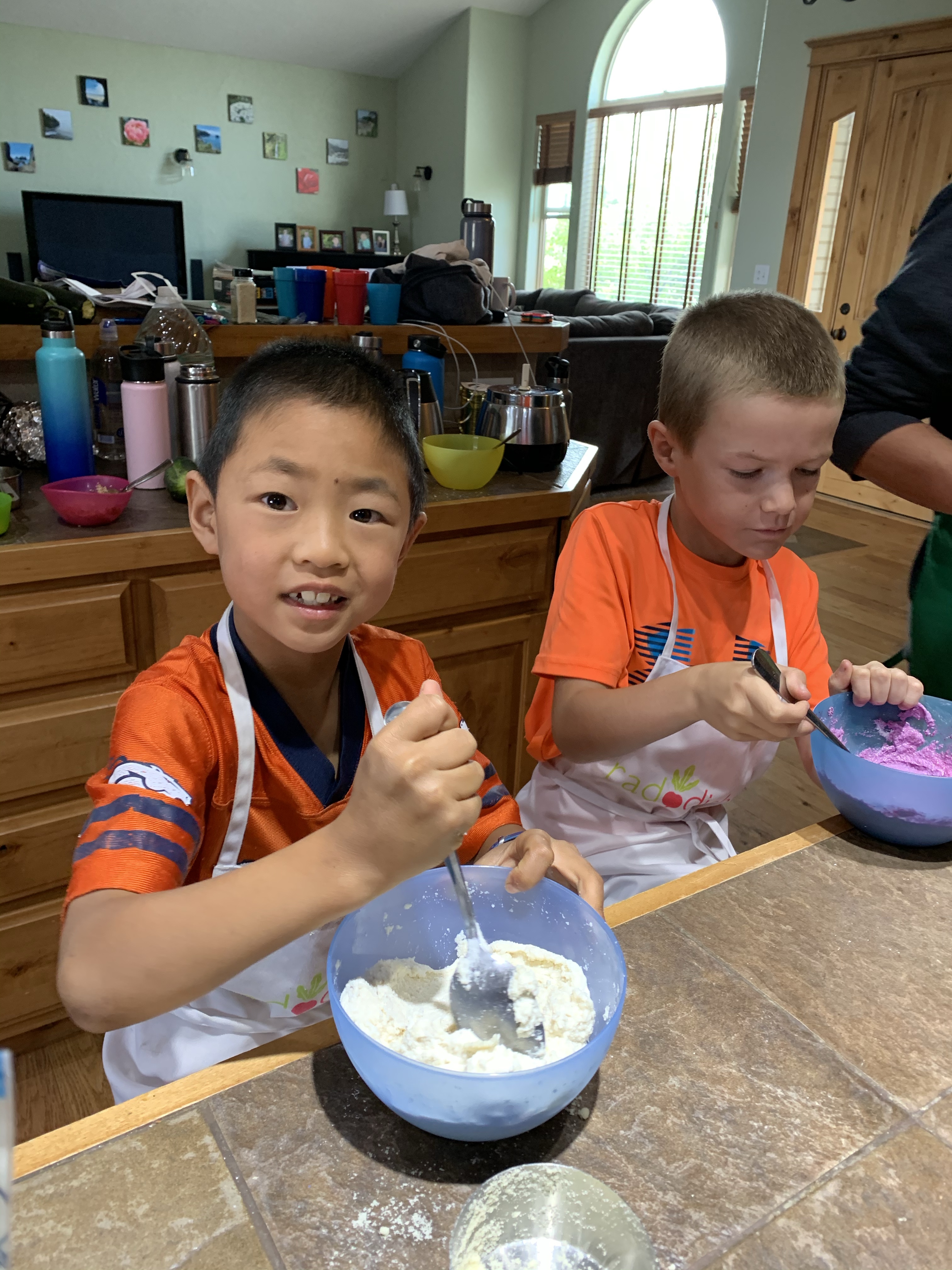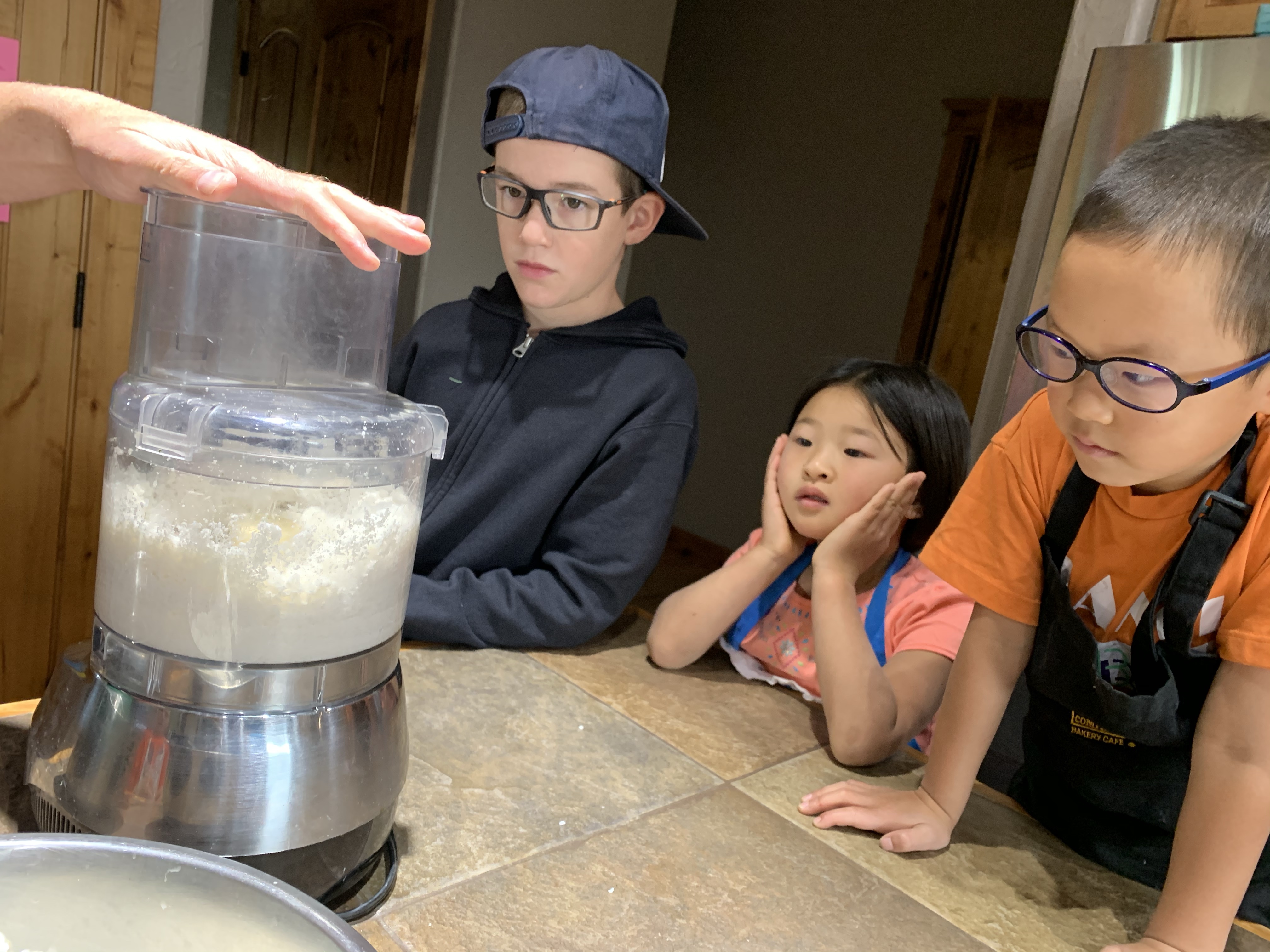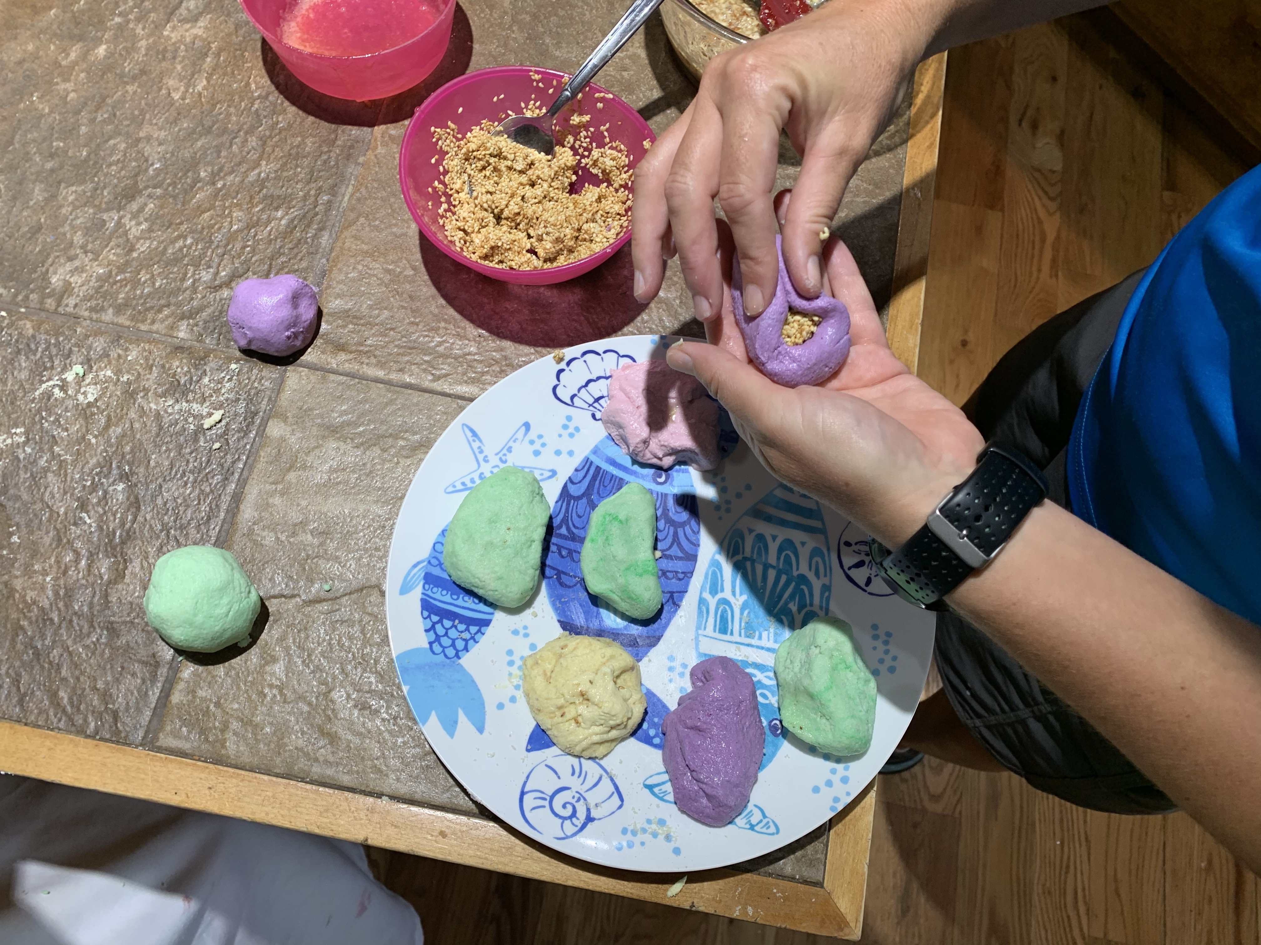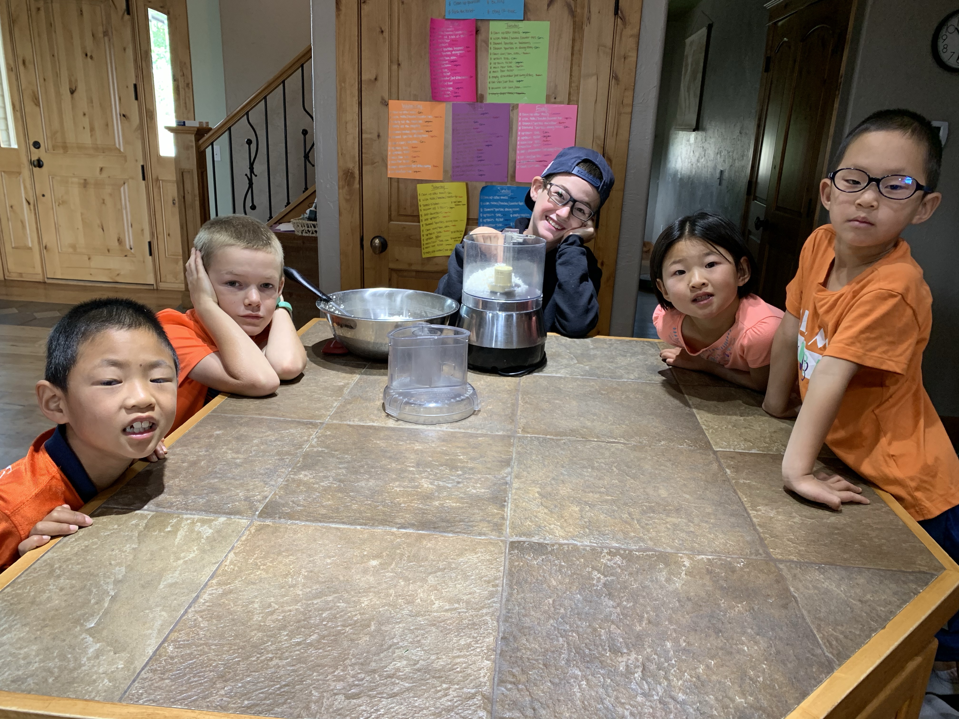 This week is Chuseok, which is the Korean harvest festival. It is traditional to make and eat Songpyeon which are rice cakes during Chuseok. We have never made or eaten them before but that changed last week when we decided to try our hand at making them. Clint soaked the rice the night before and then worked on grinding it into a fine flour while the kids gathered pine needles from the trees in the yard. Songpyeon is traditionally colored with natural dyes so the kids and I went to work on those with blueberries, raspberries and peaches that we heated and strained. We did end up using food coloring for green but the other colors we made were all natural. Leighton roasted the sesame seeds and instead of red beans which are a traditional filling we went with chopped walnuts and honey. The dough was not the easiest to work with and we struggled to make the moon shaped traditional shape….ours looked like blobs. Often they are decorated beautifully and well ours looked more like a child’s play-doh mess. But we tried, if you want an idea of what they are suppose to look like then feel free to google Songpyeon. To cook them we steamed them over the pine needles that the kids picked. It did give them a nice flavor but the pine needles were not the easiest thing to pick off the hot rice cakes. Everyone was very excited to try them with our lunch and that’s about where the excitement ended. I can’t say that anyone was a huge fan of them. I think I definitely made them too thick which may have been part of it. So we will try again later or track down somewhere to order them, but we had fun making them.