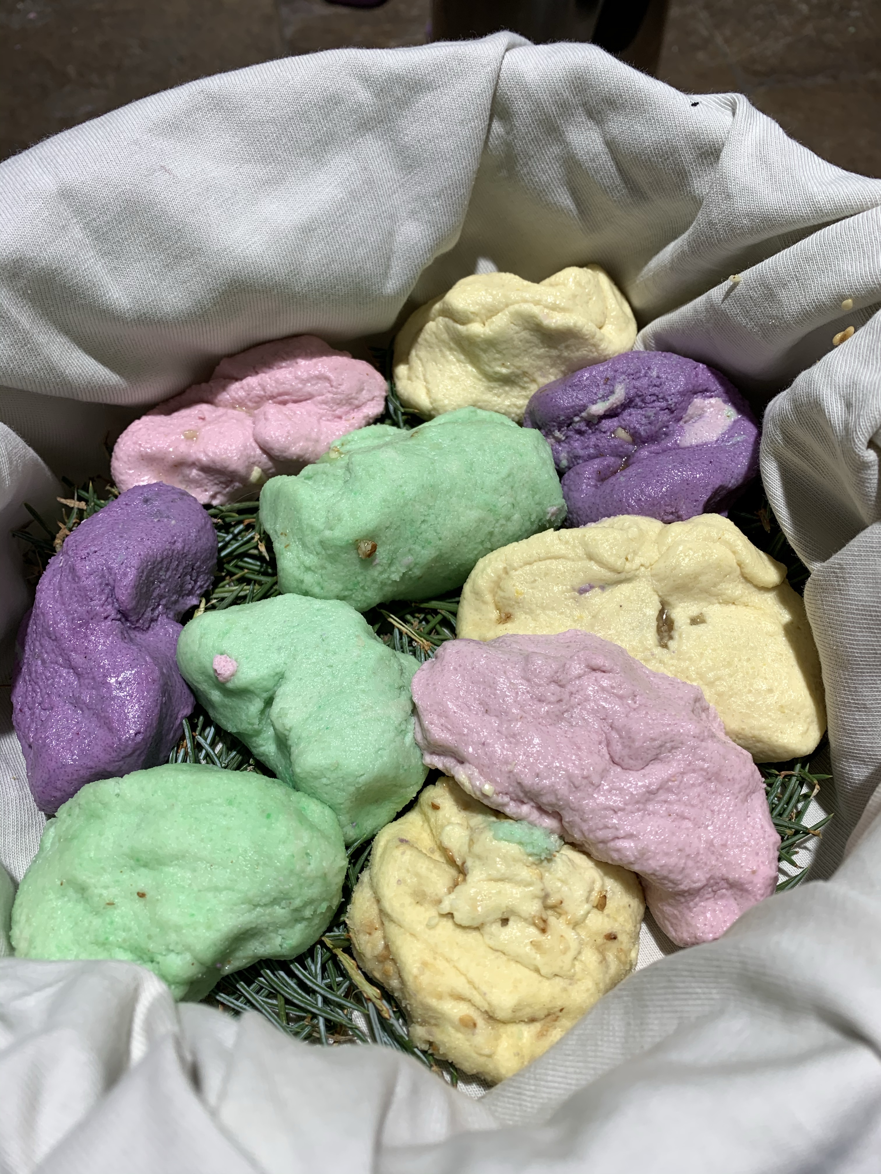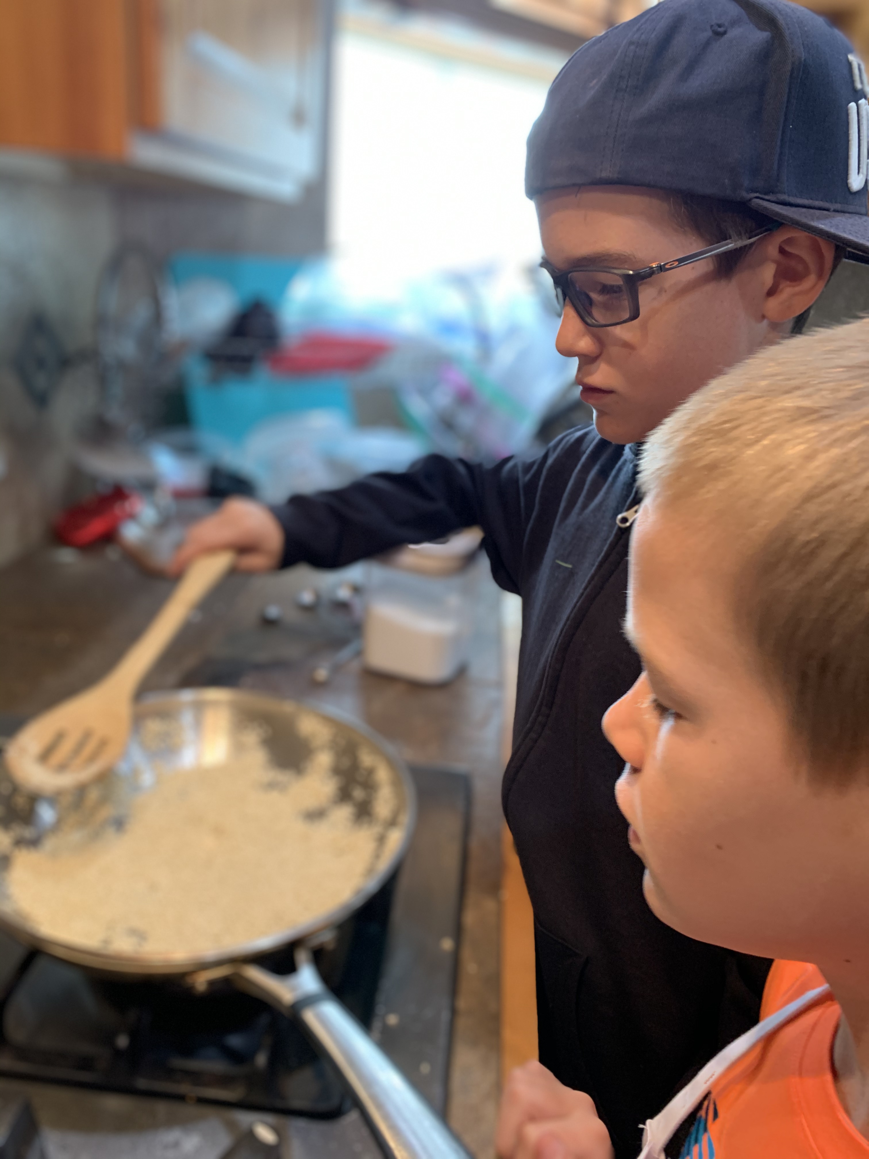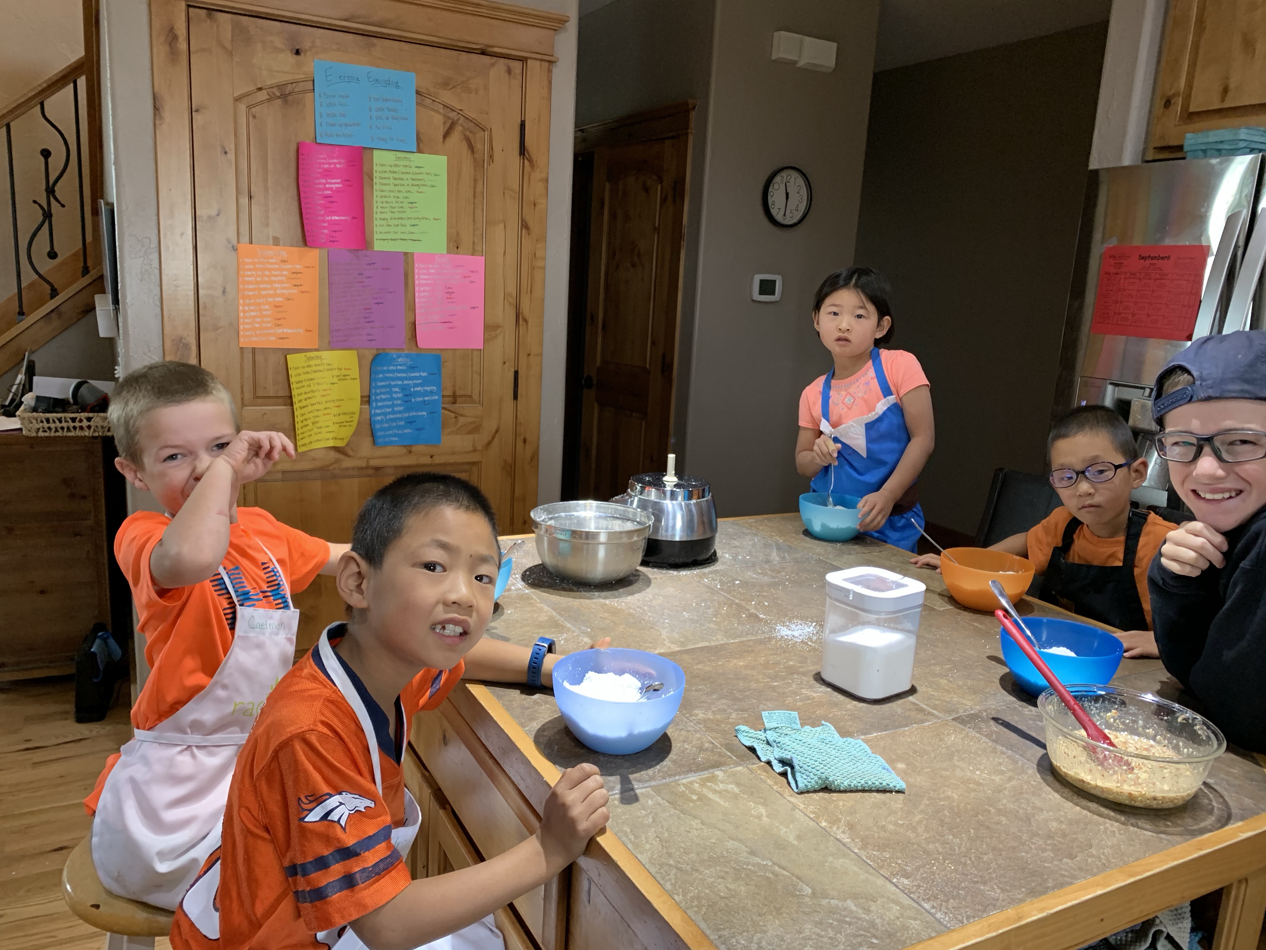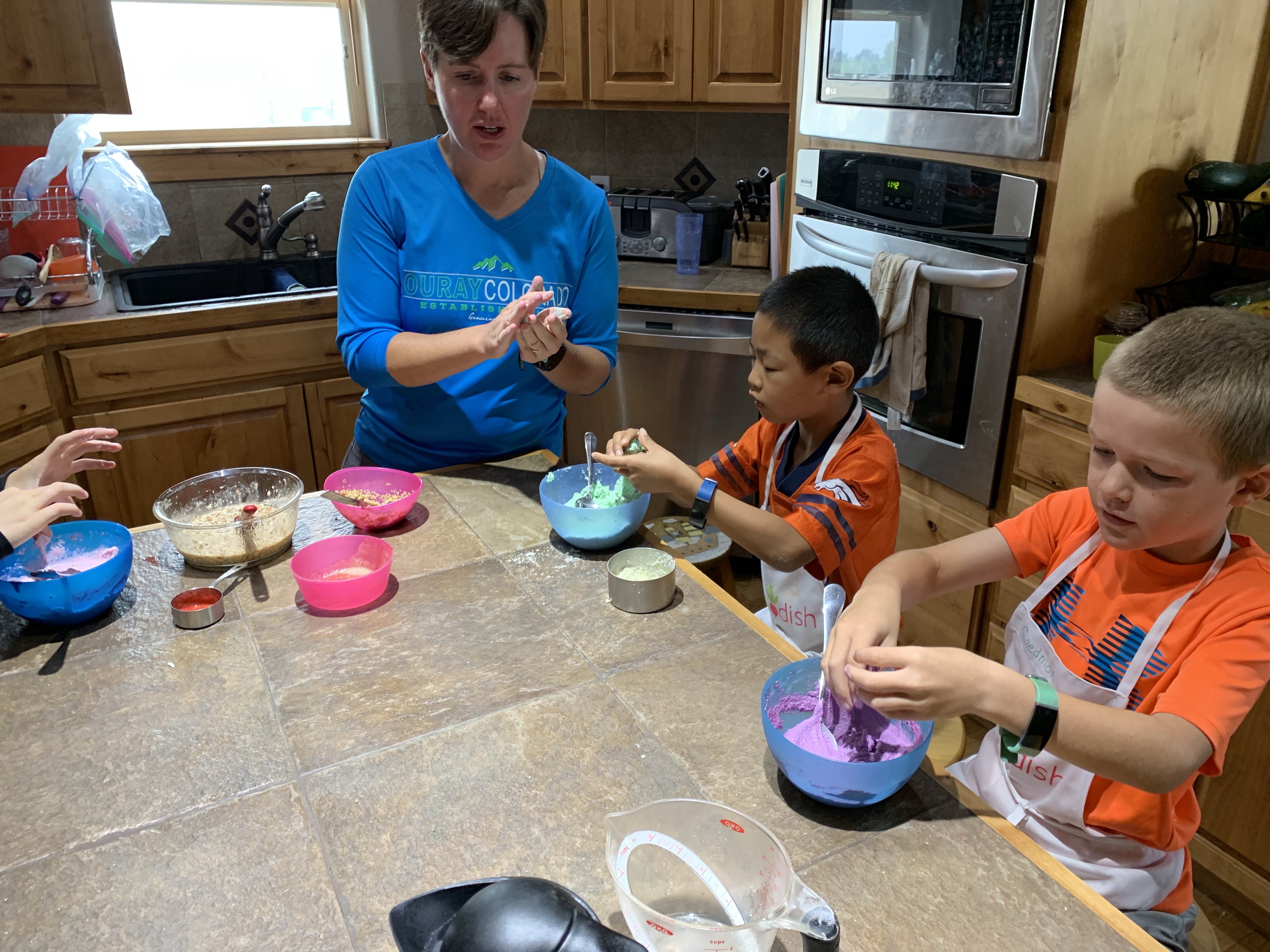 This week is Chuseok, which is the Korean harvest festival. It is traditional to make and eat Songpyeon which are rice cakes during Chuseok. We have never made or eaten them before but that changed last week when we decided to try our hand at making them. Clint soaked the rice the night before and then worked on grinding it into a fine flour while the kids gathered pine needles from the trees in the yard. Songpyeon is traditionally colored with natural dyes so the kids and I went to work on those with blueberries, raspberries and peaches that we heated and strained. We did end up using food coloring for green but the other colors we made were all natural. Leighton roasted the sesame seeds and instead of red beans which are a traditional filling we went with chopped walnuts and honey. The dough was not the easiest to work with and we struggled to make the moon shaped traditional shape….ours looked like blobs. Often they are decorated beautifully and well ours looked more like a child’s play-doh mess. But we tried, if you want an idea of what they are suppose to look like then feel free to google Songpyeon. To cook them we steamed them over the pine needles that the kids picked. It did give them a nice flavor but the pine needles were not the easiest thing to pick off the hot rice cakes. Everyone was very excited to try them with our lunch and that’s about where the excitement ended. I can’t say that anyone was a huge fan of them. I think I definitely made them too thick which may have been part of it. So we will try again later or track down somewhere to order them, but we had fun making them.