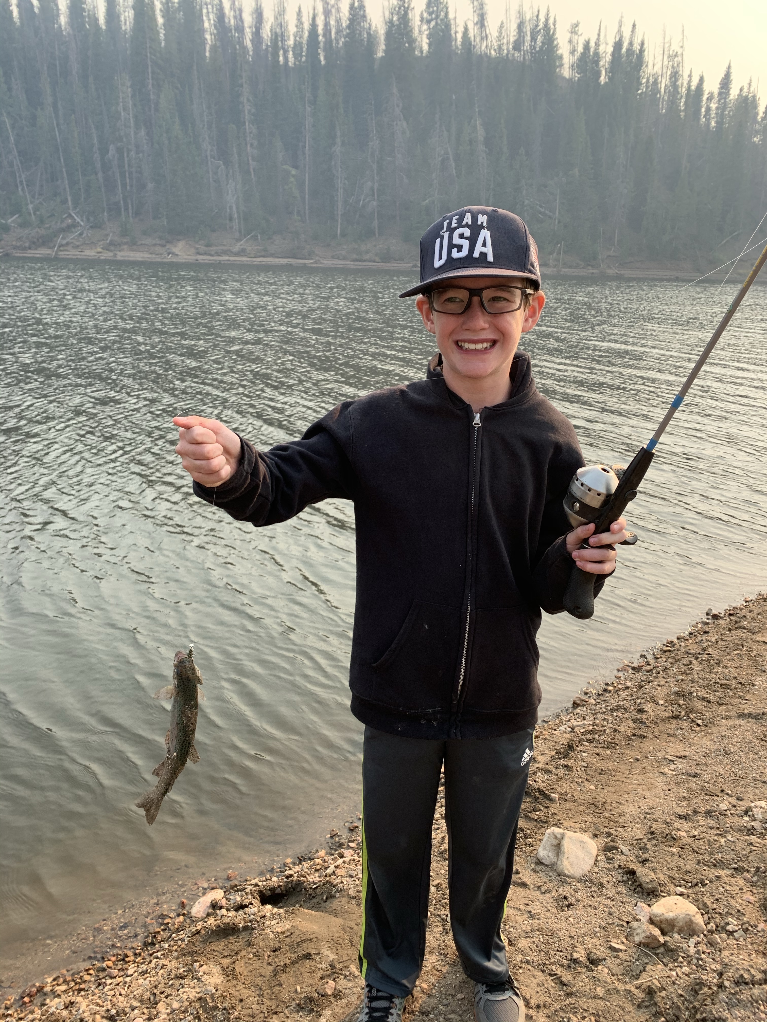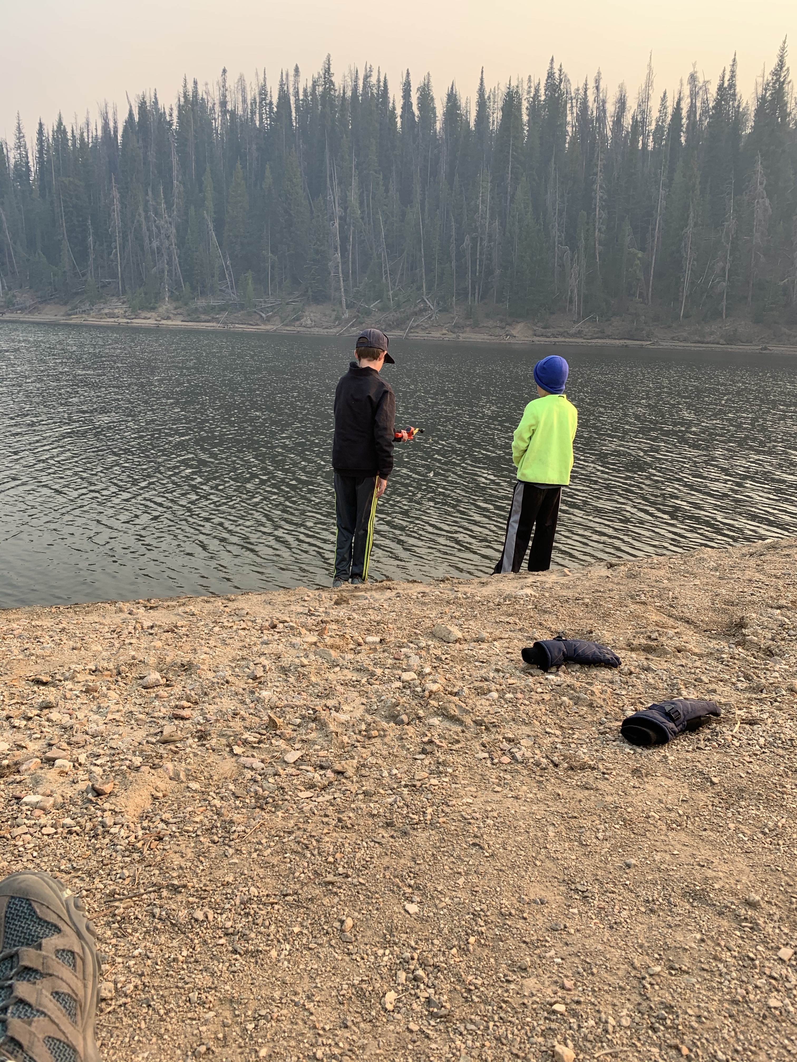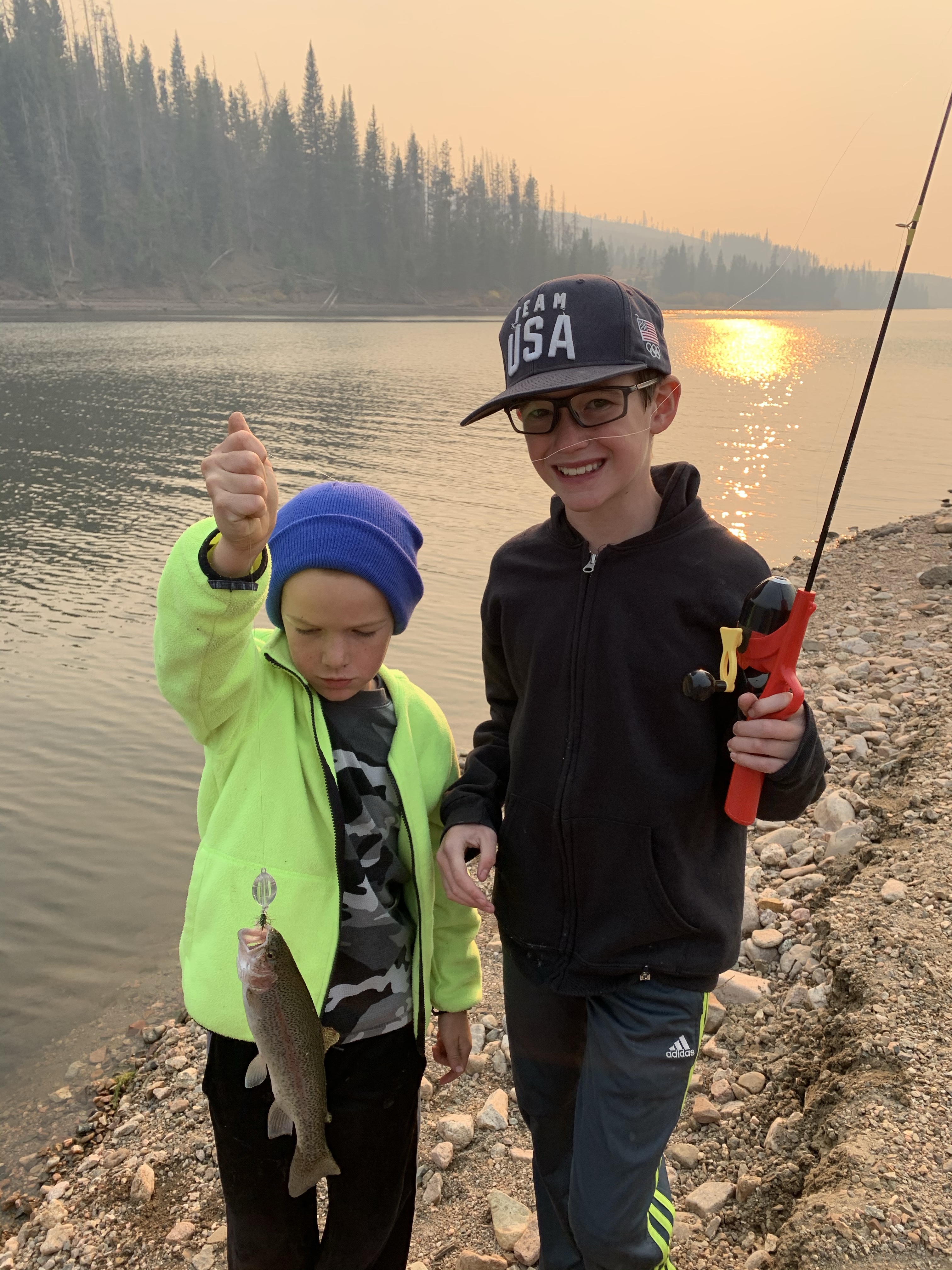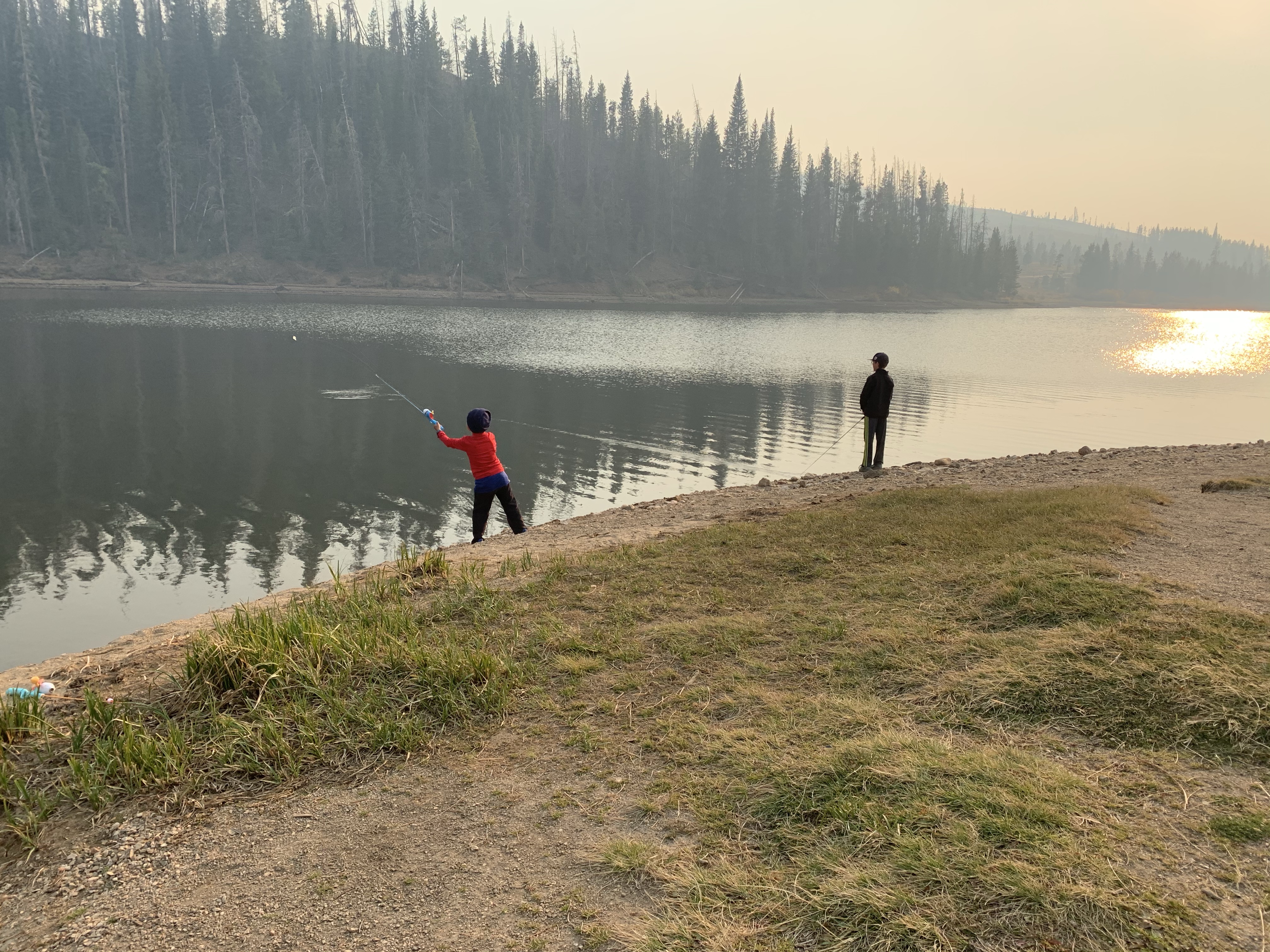 Saturday afternoon after we got back from Ruby Jewel hike/lake it was still early enough in the afternoon that we headed back down to Michigan Reservoir and spent some time fishing. we caught a number of fish that afternoon and I believe that we did because it was so hazy from all the smoke the fish thought it was dusk. Leighton was a good big brother and helped get Caedmon’s line set up with the same lure system that he had on his pole and together they caught a few fish. Paxton was quite insistent that he get a chance to use Clint’s rod and so together they used that and caught a fish and his eyes were so bright and smile huge when he caught a fish. I didn’t try to catch a fish but one of the kids would ask me to toss their line out because I could cast it farther than they could and I would inevitably land a fish. It was funny. The smoke was really bad that afternoon but we still had a great time. When we made it back to the yurt while Clint and I cooked chili the kids played in the stick teepee behind the yurt. Sunday morning we packed and cleaned everything up pretty fast and then headed back for some more fishing. The fish were really biting again that morning which was lots of fun. Coppelia was the only one that didn’t catch a fish, but I think that was because she spent the majority of her time either tied and tangled up in her line or playing in the sand along the shore. In the end I actually ended up catching the most which I totally rubbed in and took great pride in. But everyone had fun.