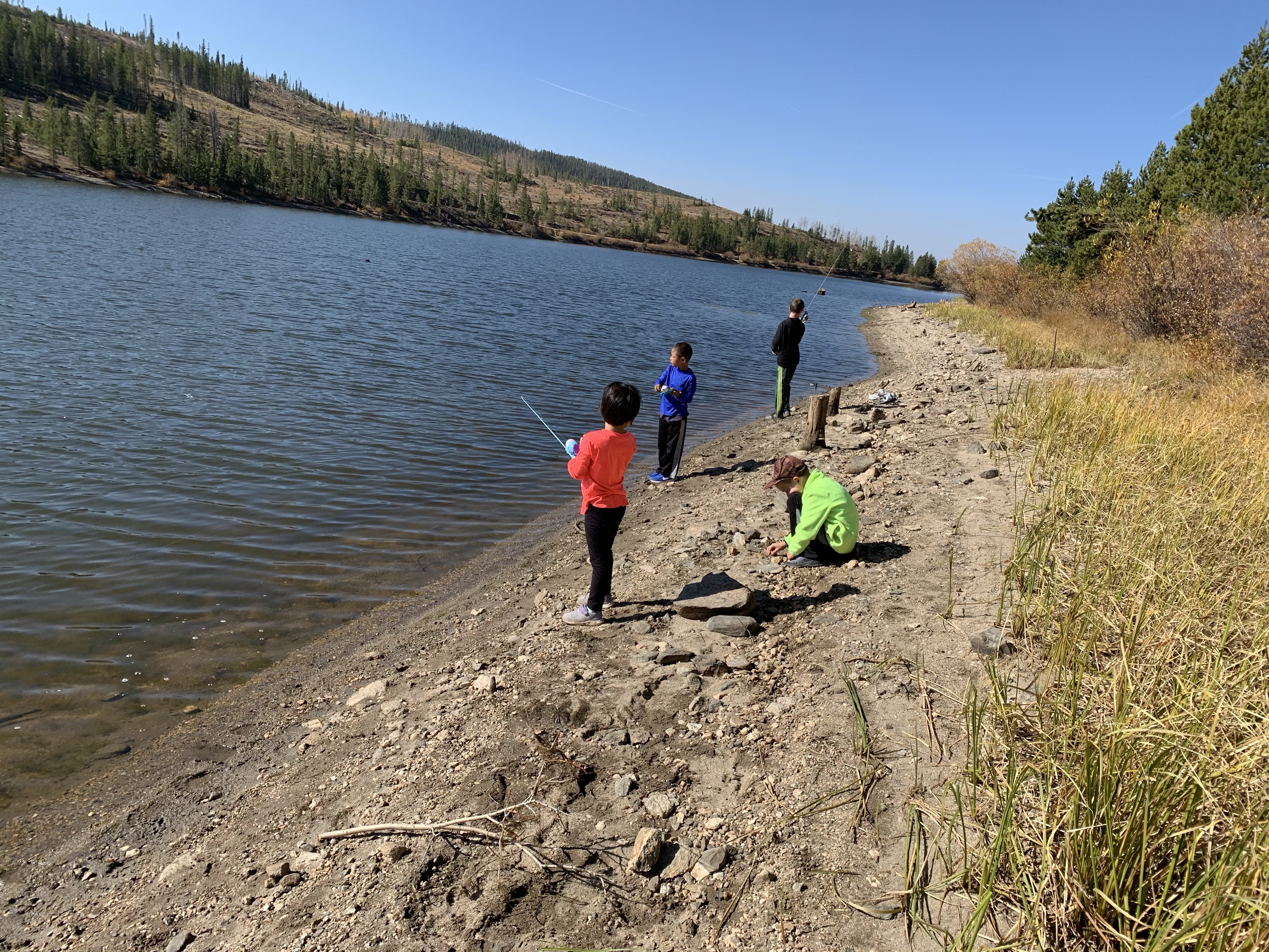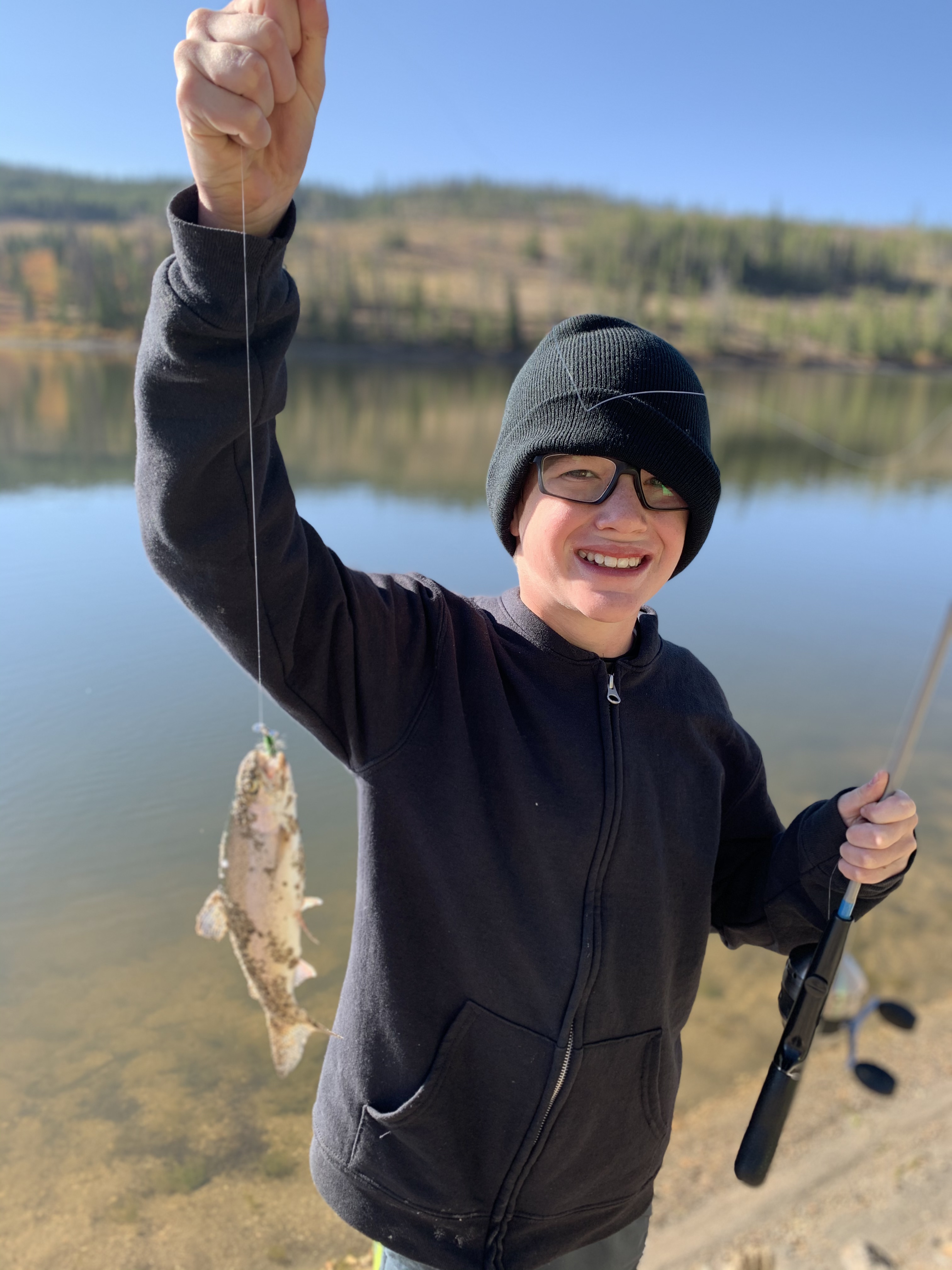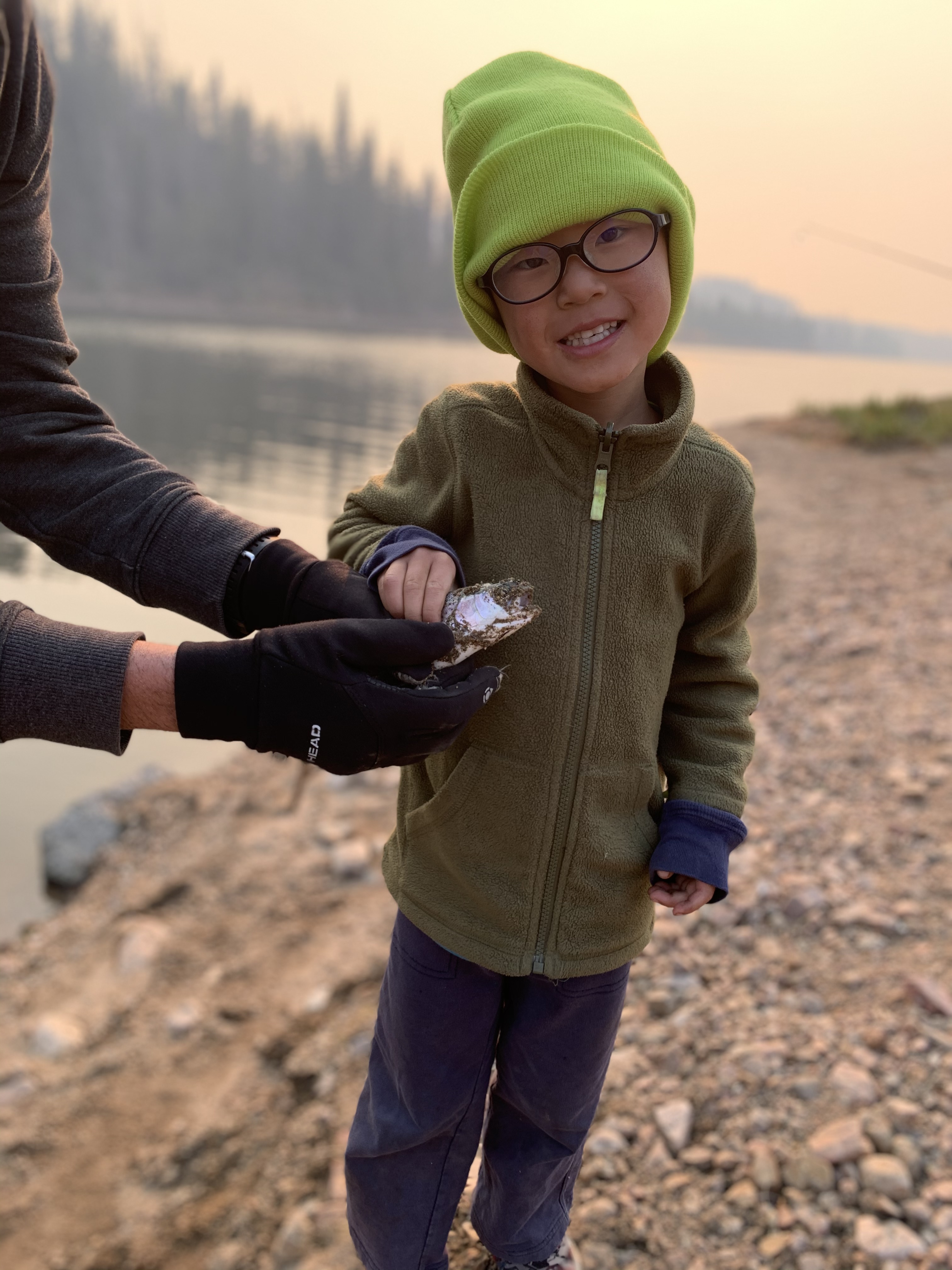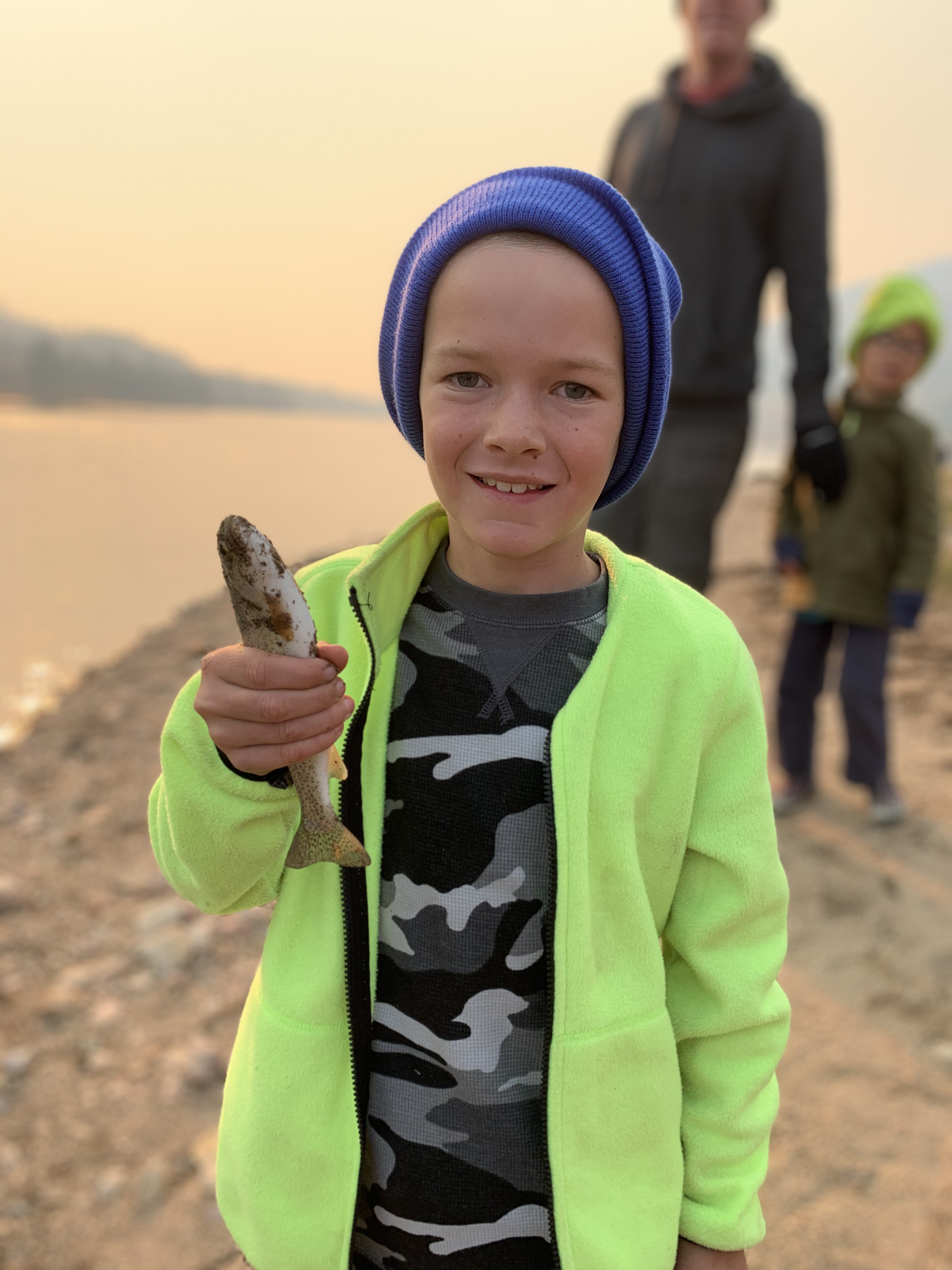 Saturday afternoon after we got back from Ruby Jewel hike/lake it was still early enough in the afternoon that we headed back down to Michigan Reservoir and spent some time fishing. we caught a number of fish that afternoon and I believe that we did because it was so hazy from all the smoke the fish thought it was dusk. Leighton was a good big brother and helped get Caedmon’s line set up with the same lure system that he had on his pole and together they caught a few fish. Paxton was quite insistent that he get a chance to use Clint’s rod and so together they used that and caught a fish and his eyes were so bright and smile huge when he caught a fish. I didn’t try to catch a fish but one of the kids would ask me to toss their line out because I could cast it farther than they could and I would inevitably land a fish. It was funny. The smoke was really bad that afternoon but we still had a great time. When we made it back to the yurt while Clint and I cooked chili the kids played in the stick teepee behind the yurt. Sunday morning we packed and cleaned everything up pretty fast and then headed back for some more fishing. The fish were really biting again that morning which was lots of fun. Coppelia was the only one that didn’t catch a fish, but I think that was because she spent the majority of her time either tied and tangled up in her line or playing in the sand along the shore. In the end I actually ended up catching the most which I totally rubbed in and took great pride in. But everyone had fun.