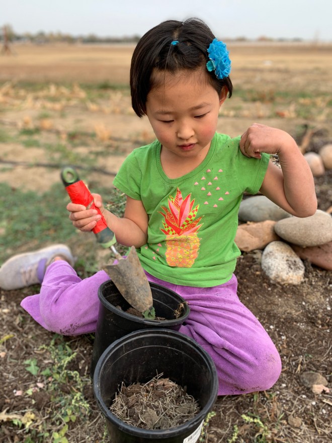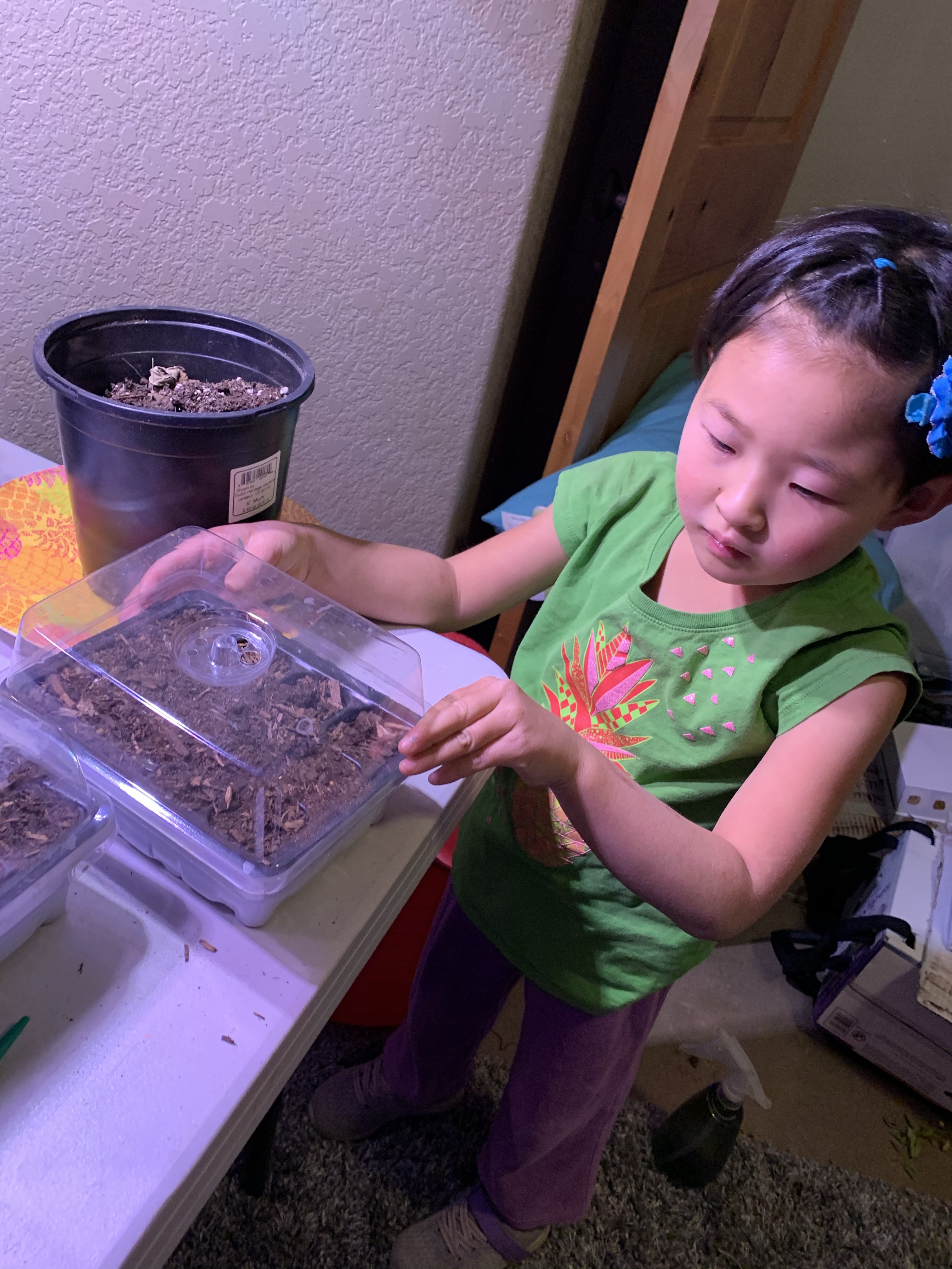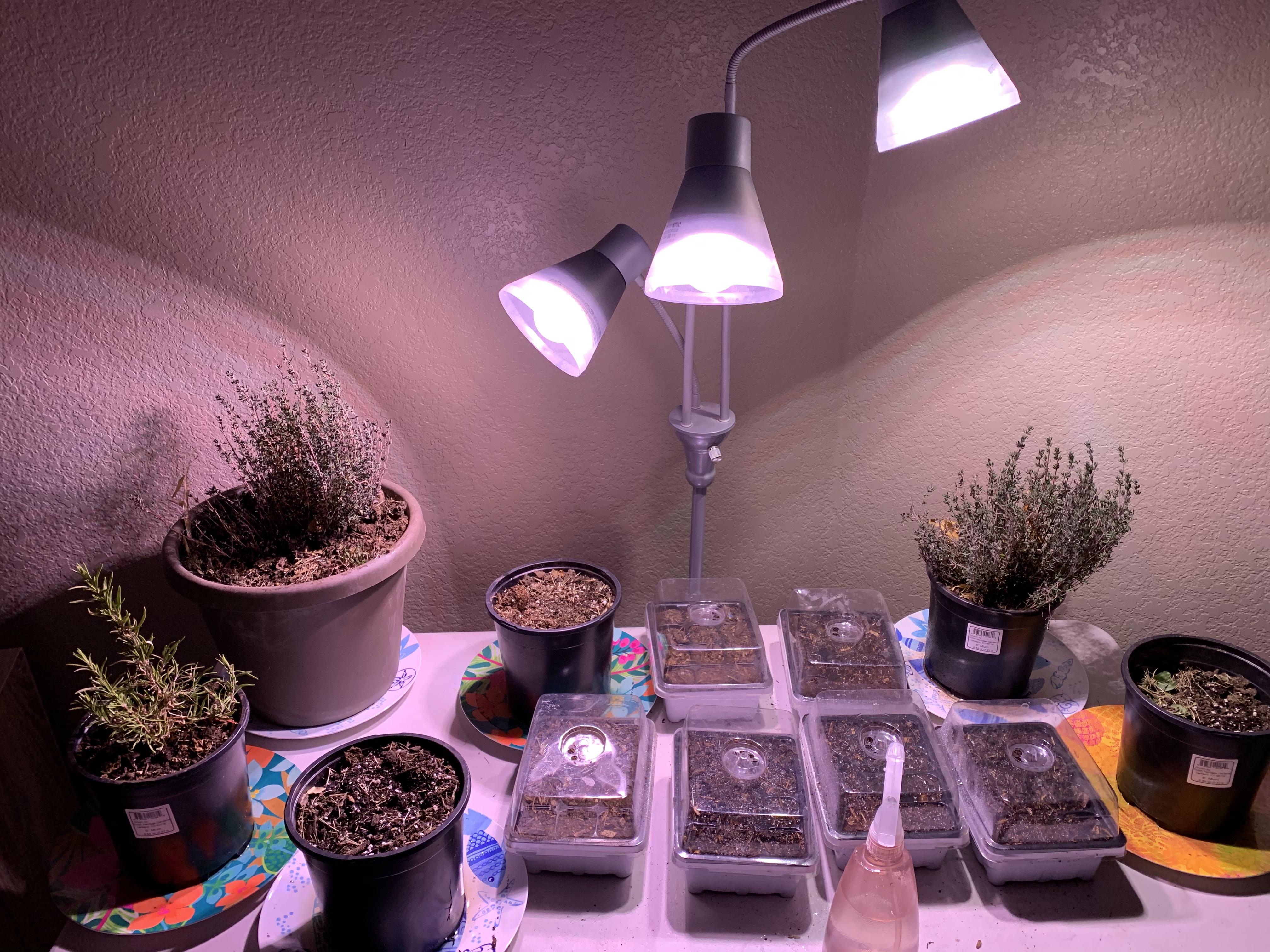 So I’m trying something new this year. I have never had a winter garden, or done any indoor gardening in the winter, but I decided to try this year. Last Wednesday with Coppelia’s help I dug up my thyme and rosemary from my outdoor garden because they were looking pretty spent and planted them in some planters for inside. Clint has been making Kombucha and so the herbs go really well with that. We filled up my seed starter packs with some dirt as well. I had found some indoor grow bulbs at Home Depot so we set those up with a lamp that wasn’t being used. We have become addicted to tomatillo salsa and so in our seed starters we planted various hot peppers and tomatillos. We had a couple extra pots so we added some cilantro seeds and I think we threw some carrot seeds in the other. I have no idea if any of these things will actually grow, but we’ll try and see what happens. New adventures are always fun.