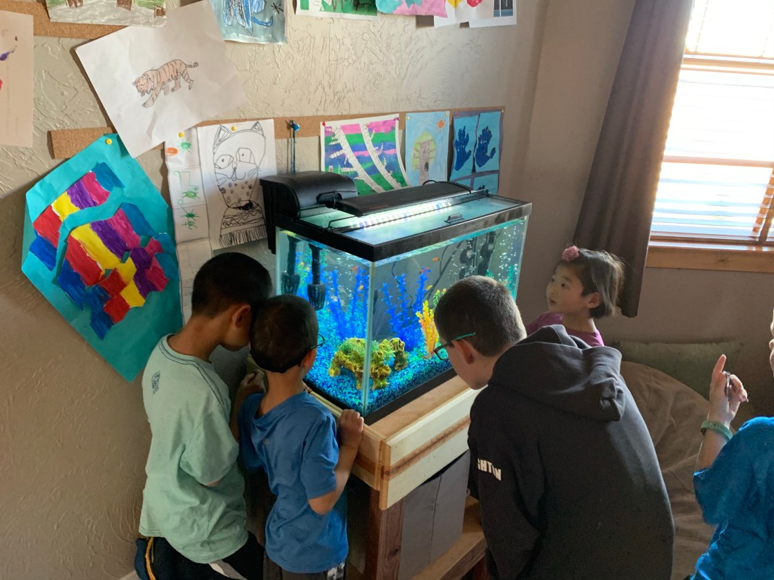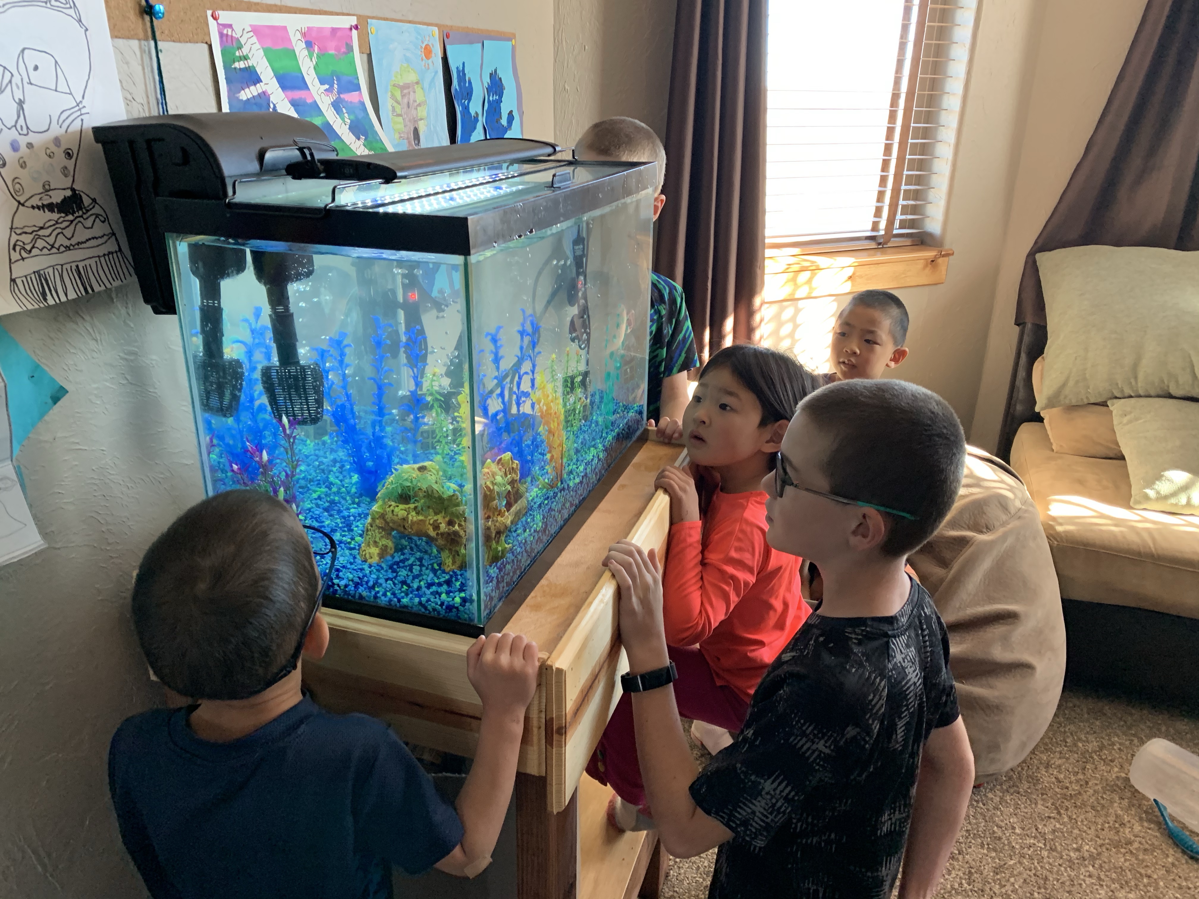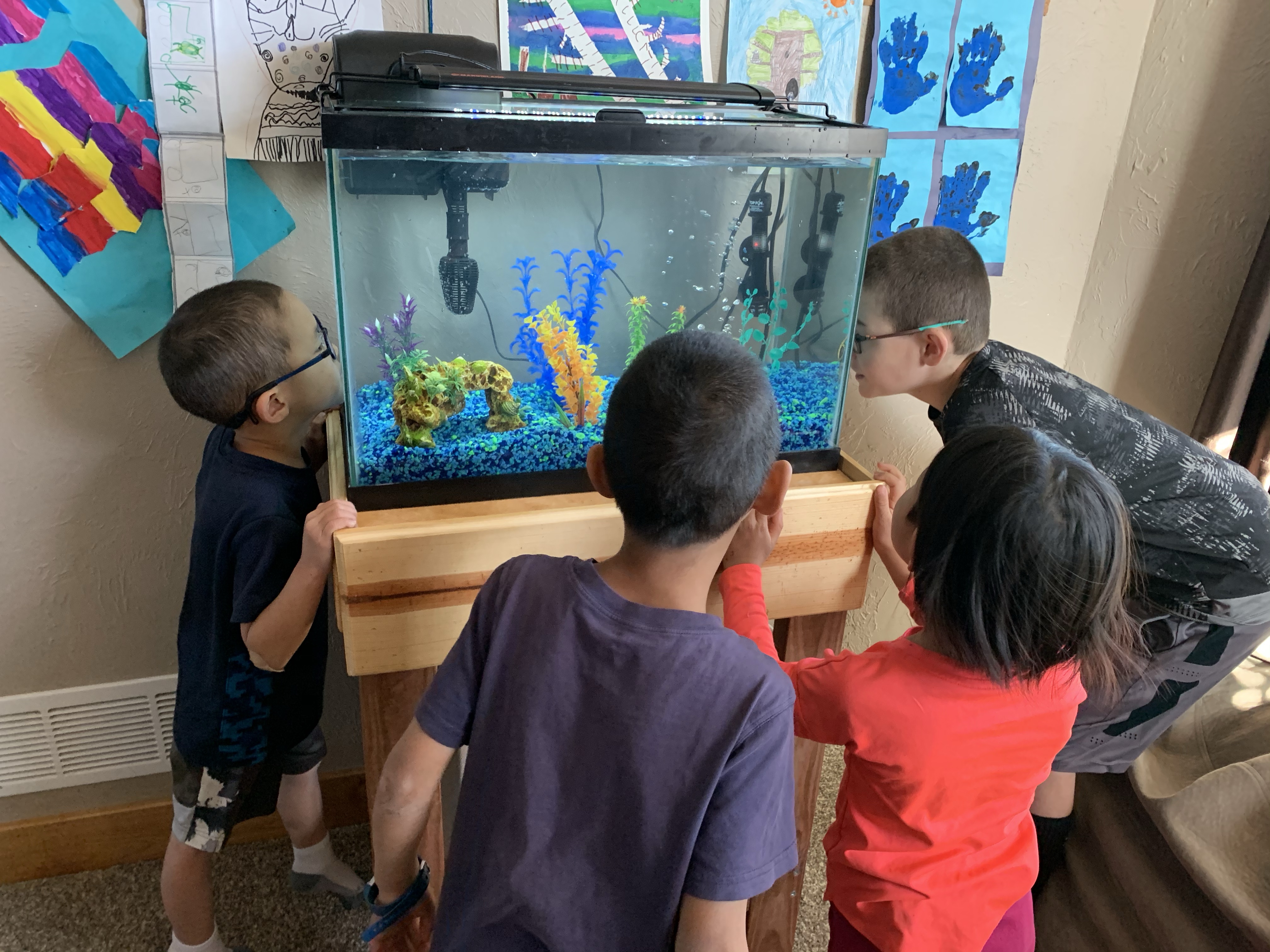 Caedmon has been asking for the past number of months if we could get fish again. The last time we had fish was nearly 4 years ago and it was a fish that wouldn’t die. He lived for years and despite forgetting to feed him for days on end (like an entire adoption trip to Korea), moving, even having an entire bag of cat food dumped into his tank, etc etc. he lived on. But it has since been awhile and so we decided to pull the tank out again and have fish. Clint wanted to build a sturdy table for the tank so he spent a weekend getting that all set up. We then got the tank all set up and let it sit almost a week before we went to get fish. The kids loved just staring at the tank before the fish were even in it and watching the bubbles. Finally on the Monday after Thanksgiving we were all set to get the fish. The kids picked out 3 fish and a catfish. On the way home they had a very serious discussion about the names and decided to go with a theme. And so we have Mercury the catfish, and then Mars, Jupiter, and Venus the fish.