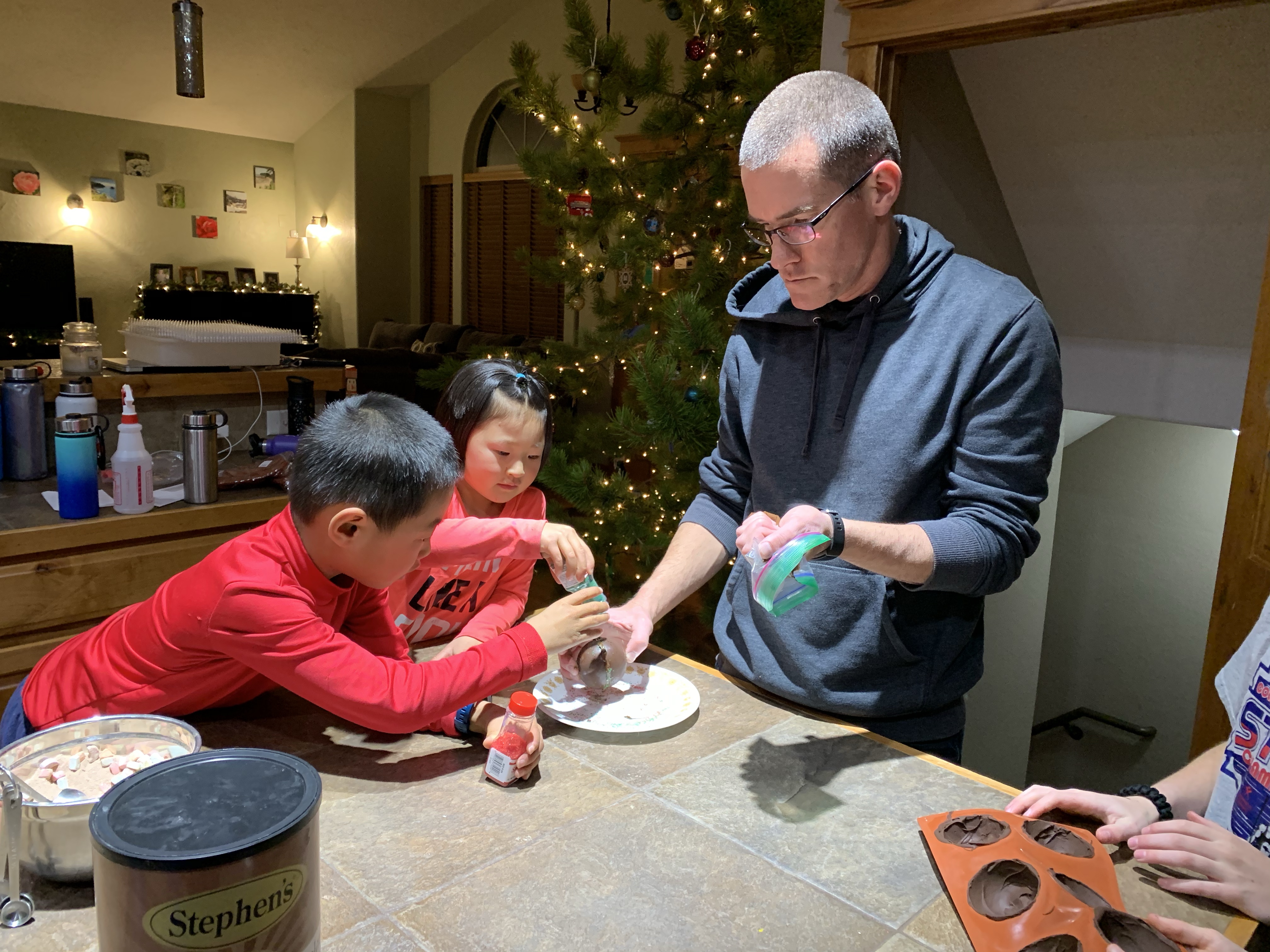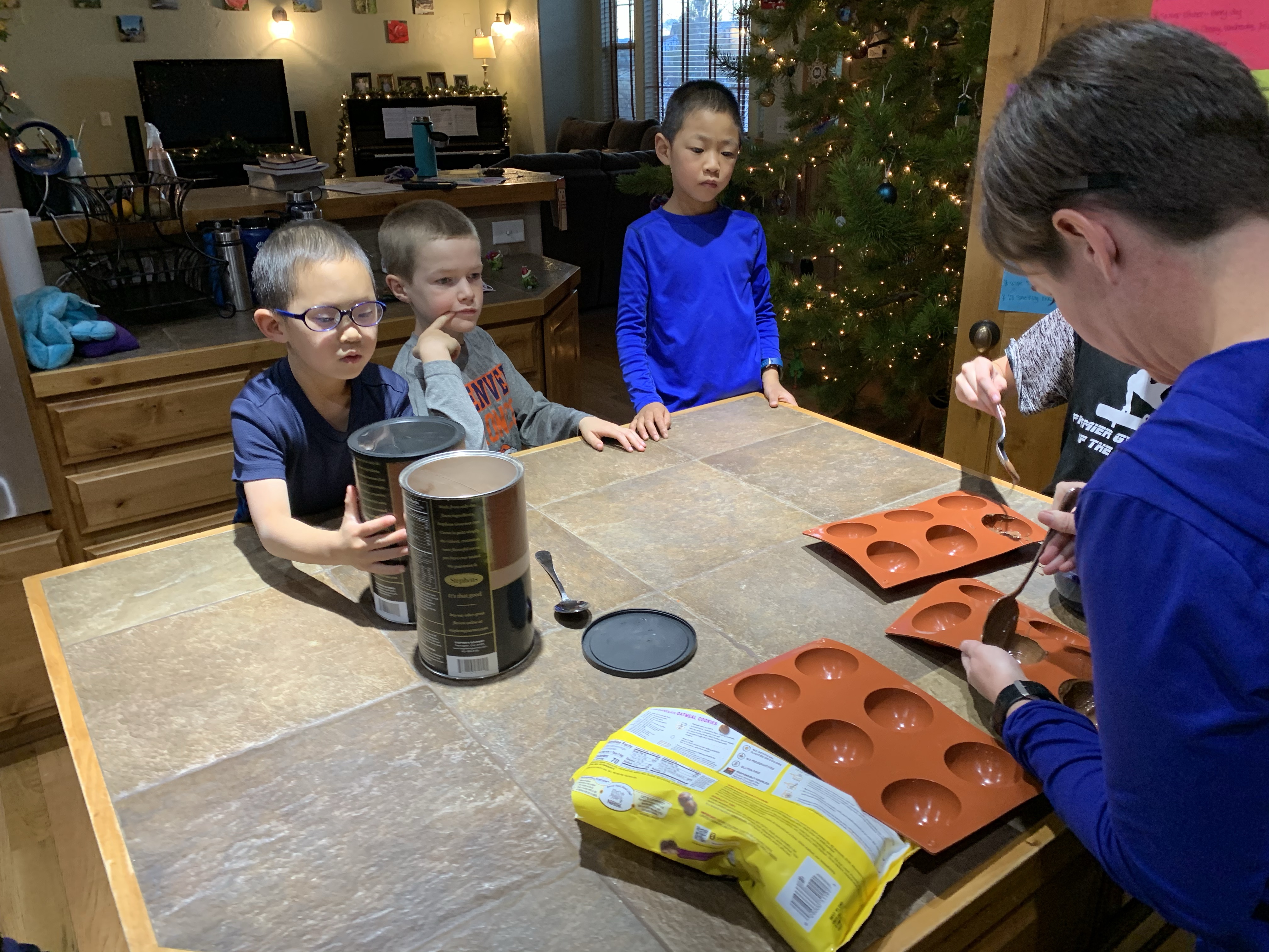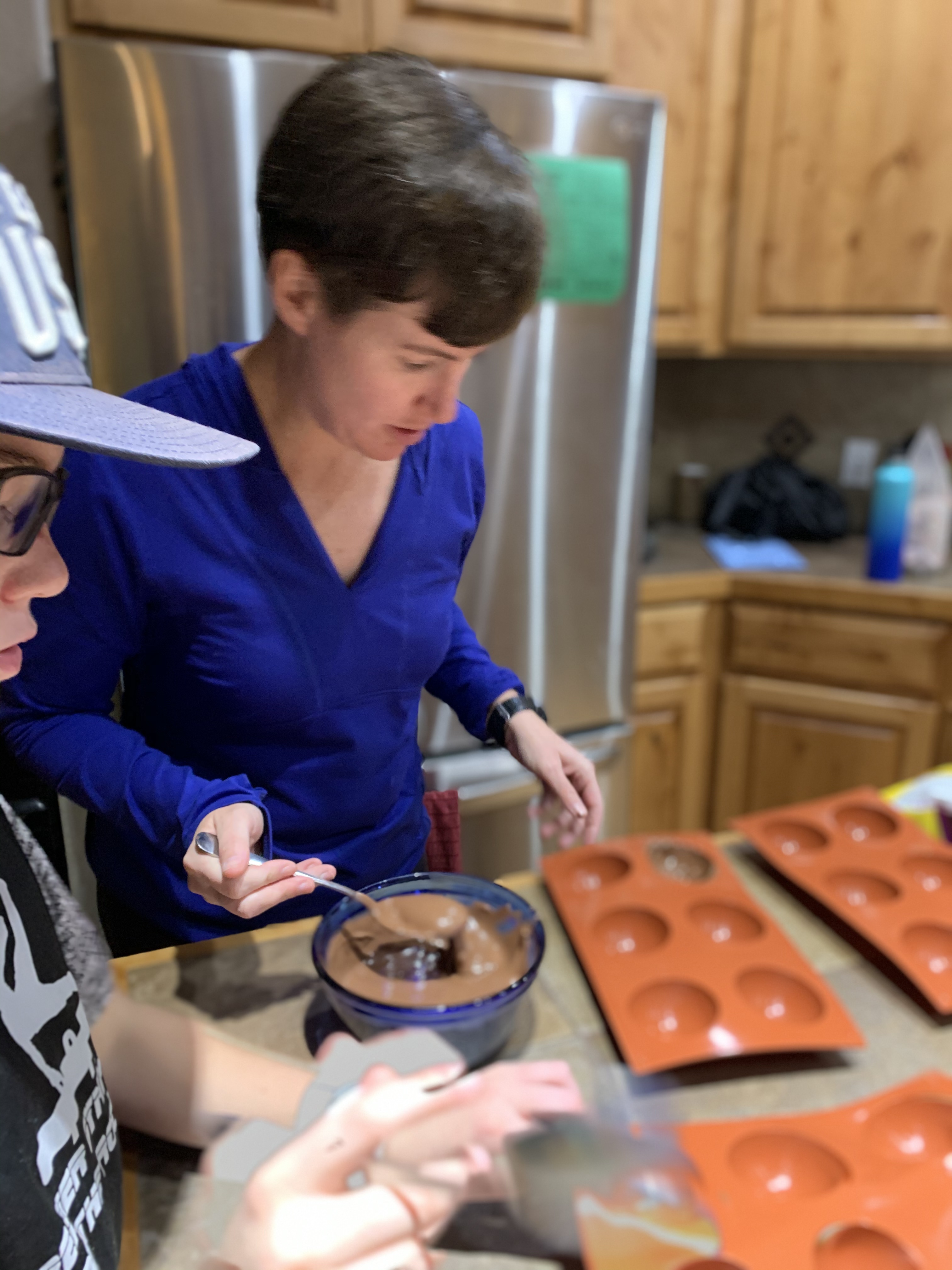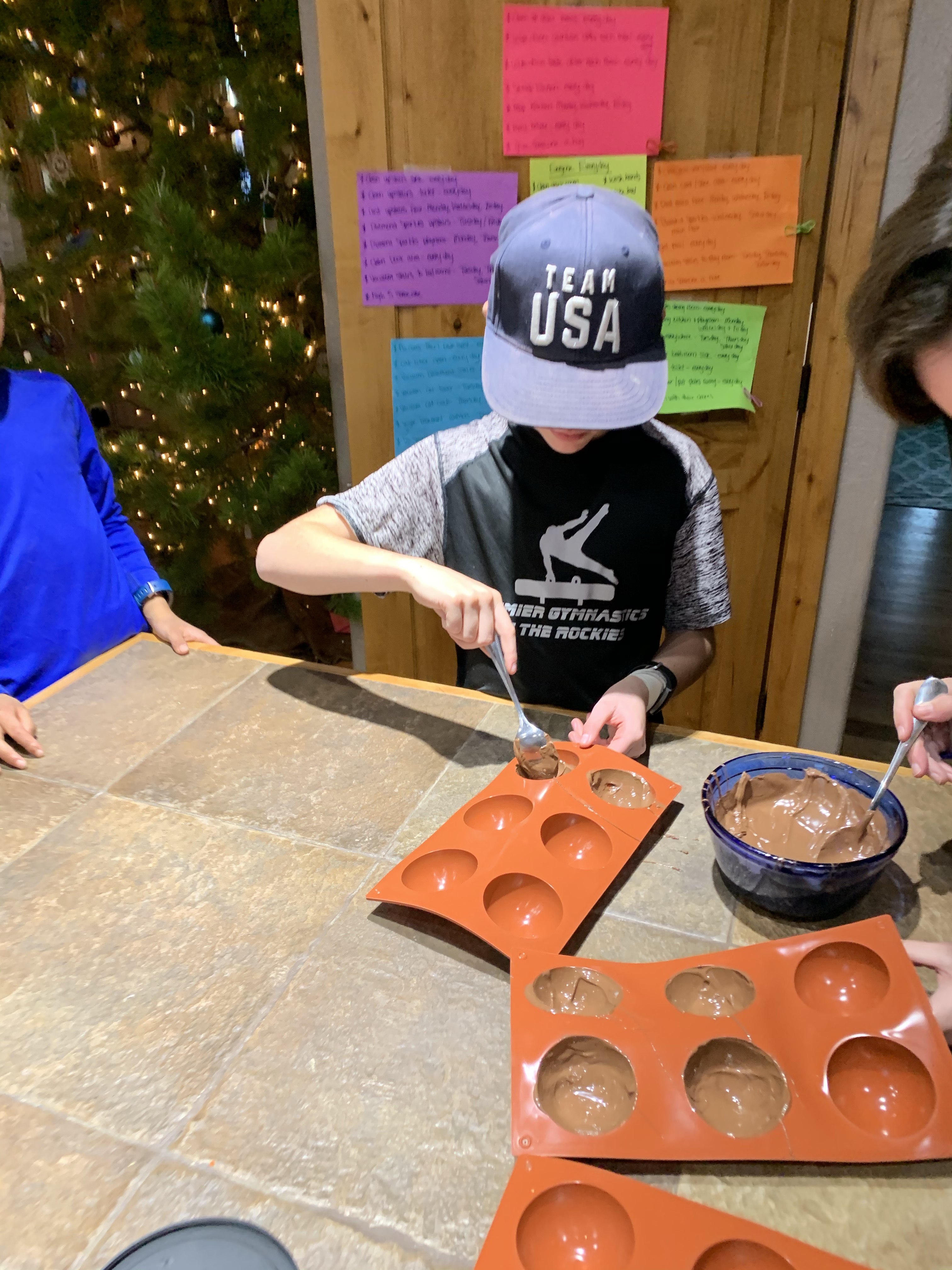 Sometimes best intentions don’t necessarily play out. I had heard about hot chocolate bombs from my Bible Study group and after looking them up decided we should try and make some. I thought we’d make a bunch and then mail them with our family Christmas gifts this year. It was good plan but because I know nothing about tempering chocolate if we had in fact been able to mail them they would have ended up gooey messes with melted chocolate and hot cocoa powder every where. The other issue that we had is that despite thinking that I had put dehydrated marshmallows in our amazon cart I had in fact not (I also did the same thing with Paxton’s Christmas present but luckily remembered that in time), so because everyone is making hot chocolate bombs when I did figure out that I didn’t have them ordered the only ones left were cereal marshmallows which I decided would work just fine (which they did). So we spent two evenings working together and by the end had a pretty good system down but because of my lack of chocolate tempering skills meant that we were running them back to the freezer in between each stage. They are definitely not the prettiest around but we had a lot of fun making them and hopefully for the friends and family that we can hand deliver them too they end of tasting good. It was a lot of fun and a fun way to spend the evenings.