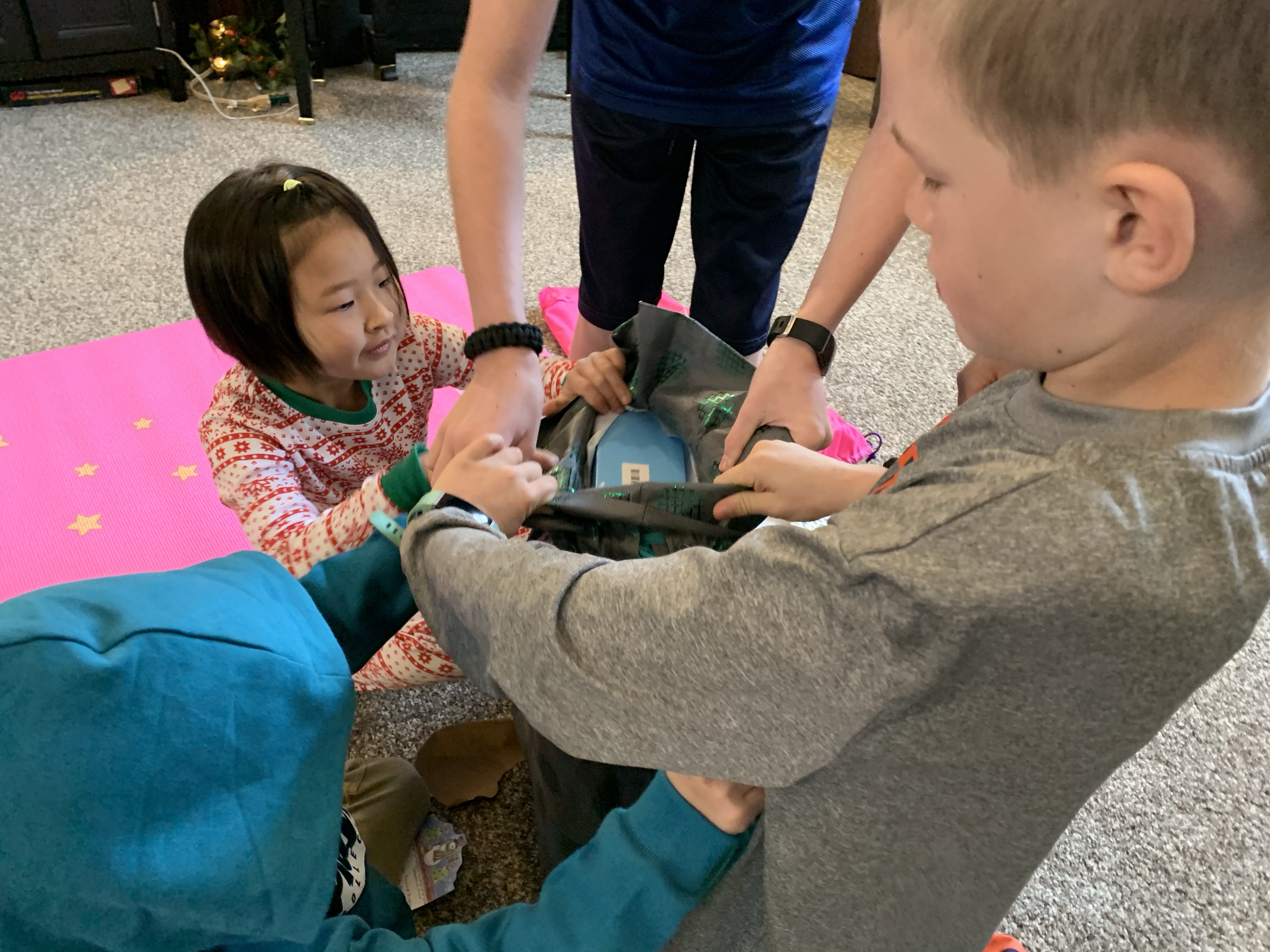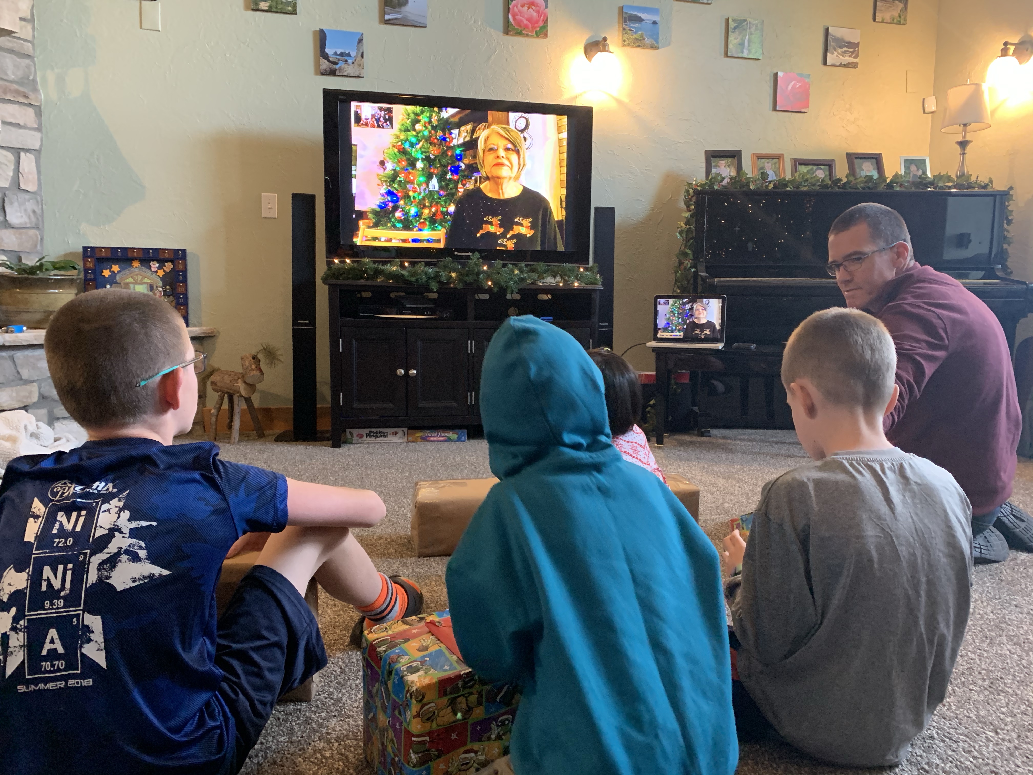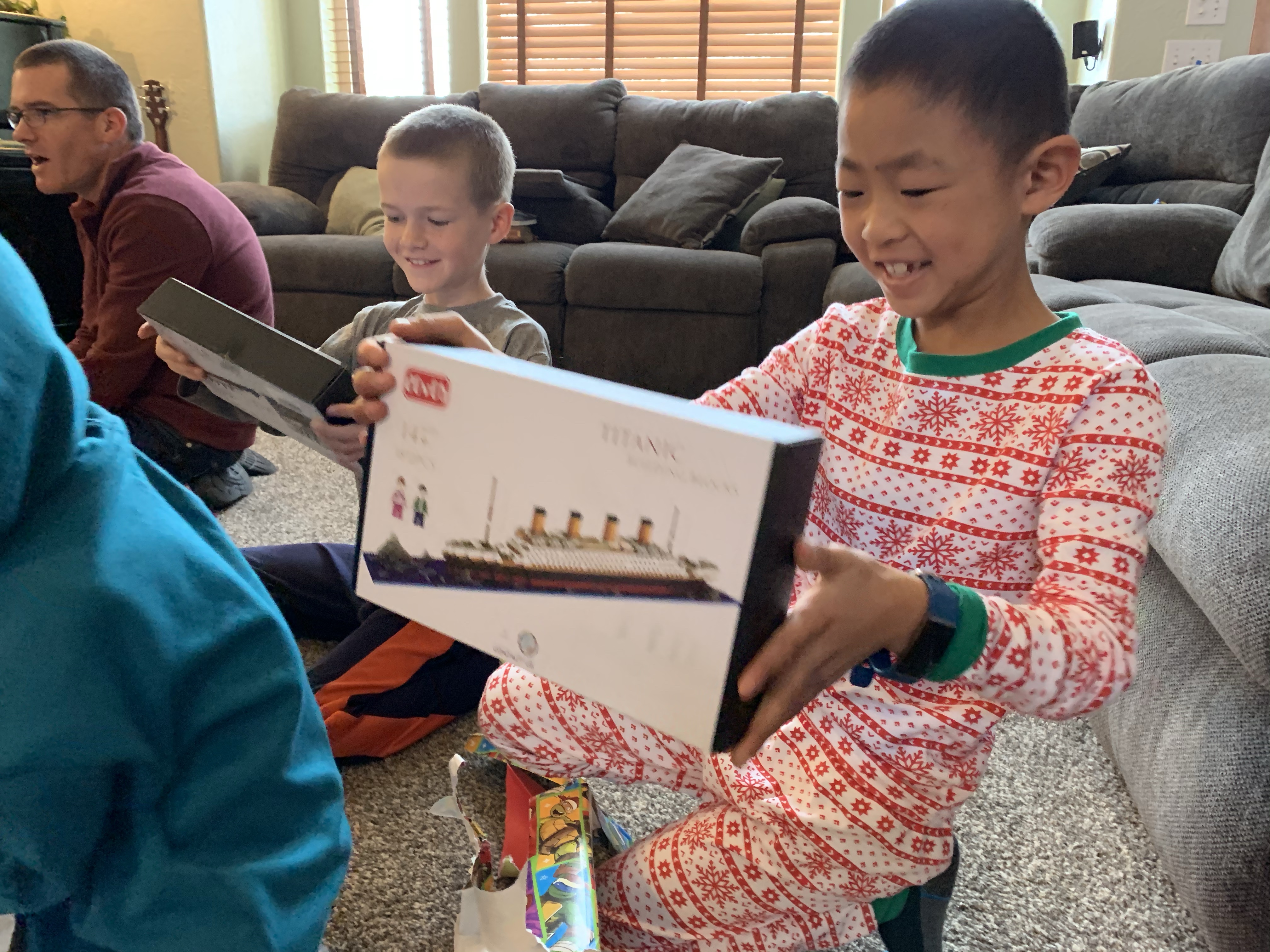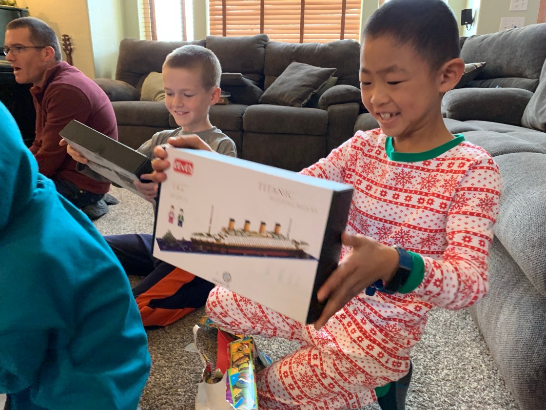 On Christmas Eve this year we facetimed with Clint’s parents mid morning and the kids opened their gifts from Mimi and Papa. They had a great time, and unfortunately the gifts we sent them did not arrive in the mail by the time we did the facetime. Edric and Caedmon were really excited to get Titanic models to build, Coppelia got a yoga mat with a unicorn on it, Paxton got some construction trucks and Leighton got some shirts for gymnastics practice. They also opened the gift from Clint’s aunt which was a fun outdoor frisbee game. It was a beautiful day and so the kids all spread out to play with their toys and play outside. I worked Christmas Eve in the evening so I missed church, but Clint and the kids watched it from home. At work the local fire department brought in a huge banner signed by 58 different fire fighters from 3 area agencies which was really cool. We had a great day getting ready for Christmas!