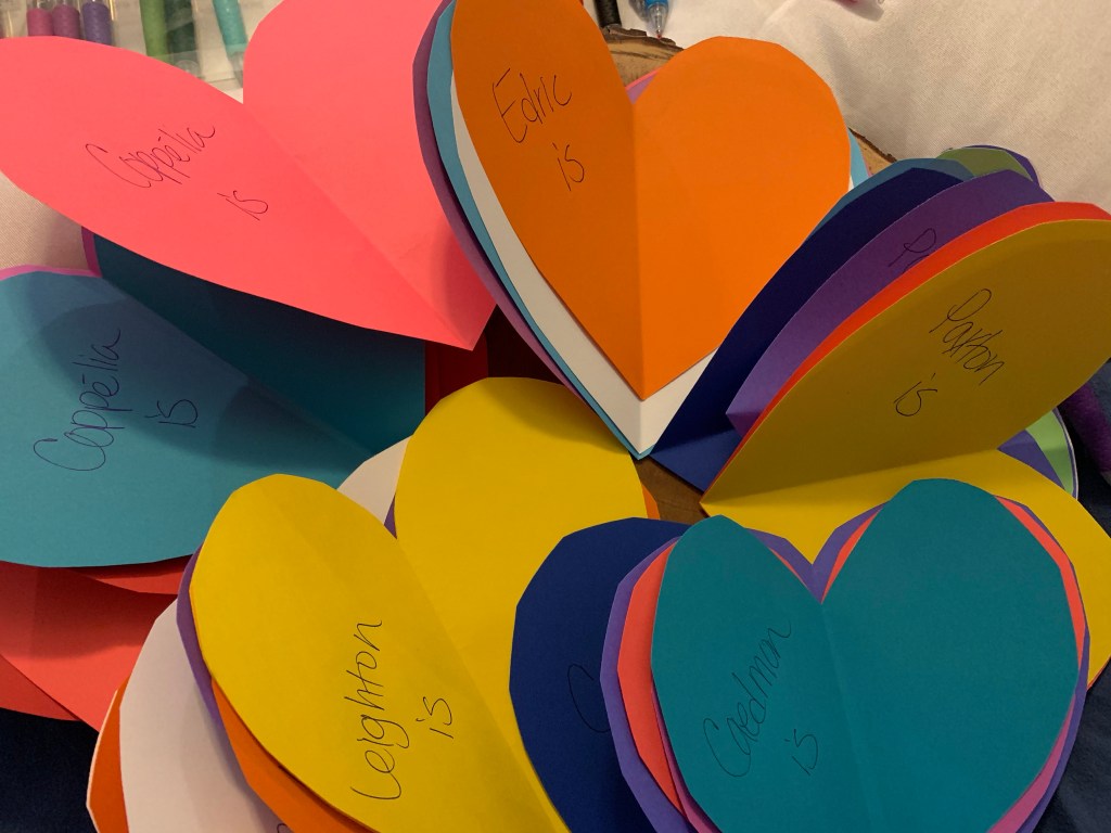 I’m not real good at celebrating Valentines Day each year. Usually I’m a bit overwhelmed by 5 rounds of valentine cards and getting those all signed by the kids and getting them delivered to the preschool or homeschool enrichment program or whatever. And I’m not a big fan of the cheesiness of the day either and feeling like we just came off of Christmas and gifts and celebrations and I’m not real ready to figure out gifts again. My friend Sarah though shared with me what she does each year and I am super excited and jumped on board this year. She cuts out a heart for each of her girls times 14 and then each night hangs a heart with their name on it and a positive word that describes that child. It is a great way to encourage and celebrate each kid and I totally jumped on board. And then I did the math and realized that that was still 70 hearts that I had to cut and fill out. But I’m doing it and the kids are loving their hearts on their doors each morning and it has been sweet to see how they have been cutting out hearts to put on my door and to share with each other as well. I did some funny ones for Clint just to make everyone laugh (ie Clint is stinky etc etc). But it has been a really neat way to celebrate the kids and their uniqueness in a special way that doesn’t feel too over commercialized or cheesey.