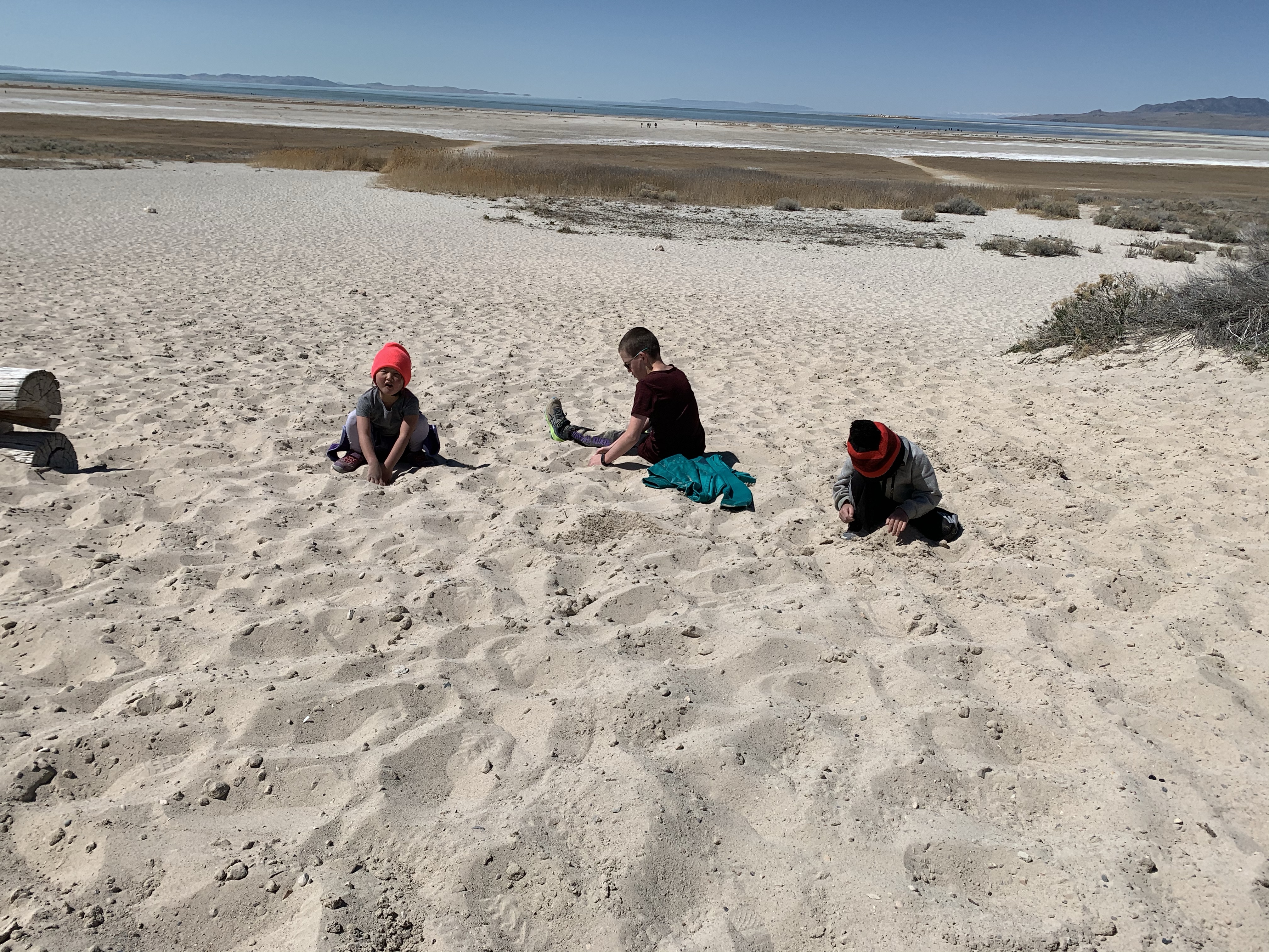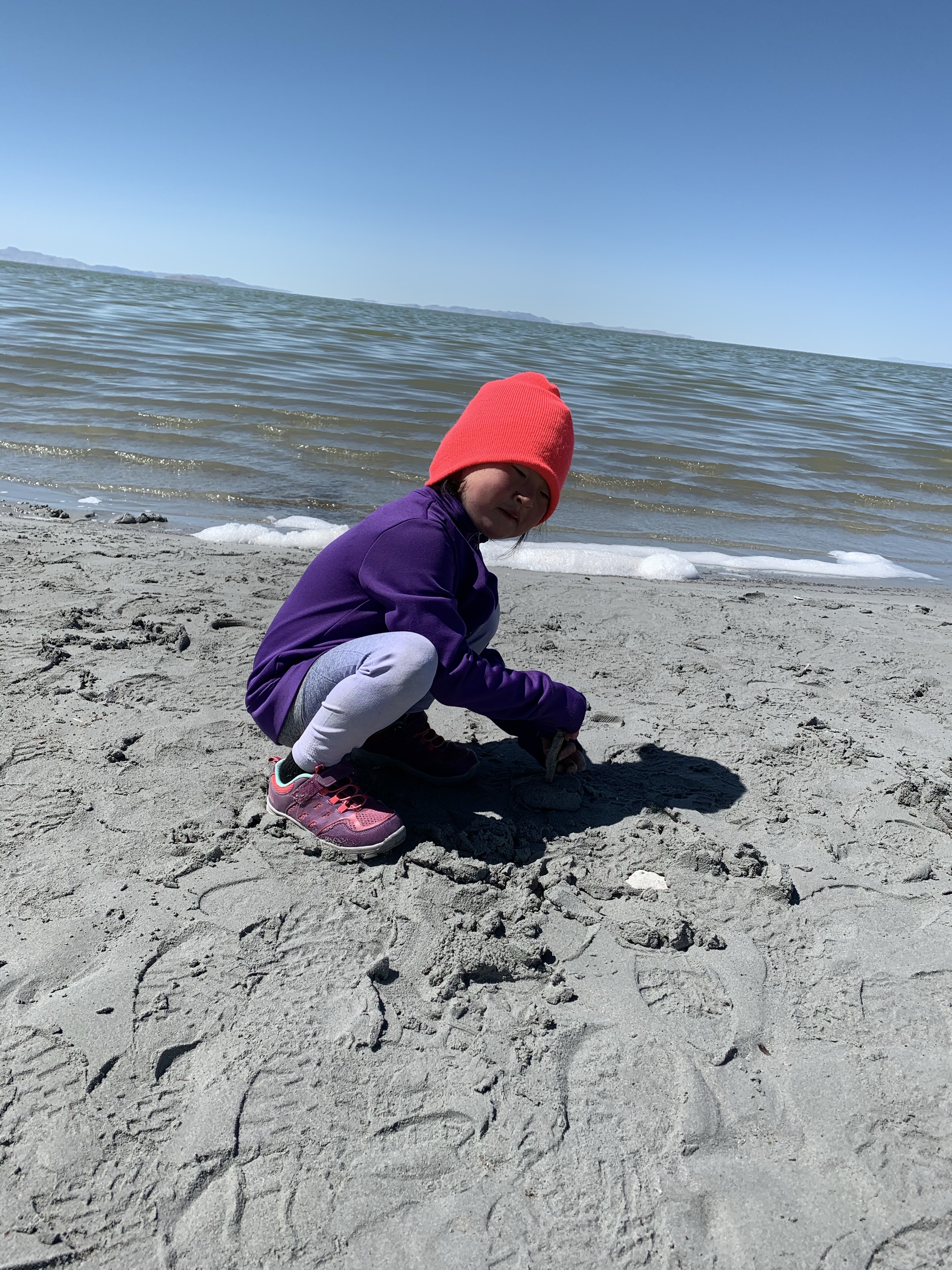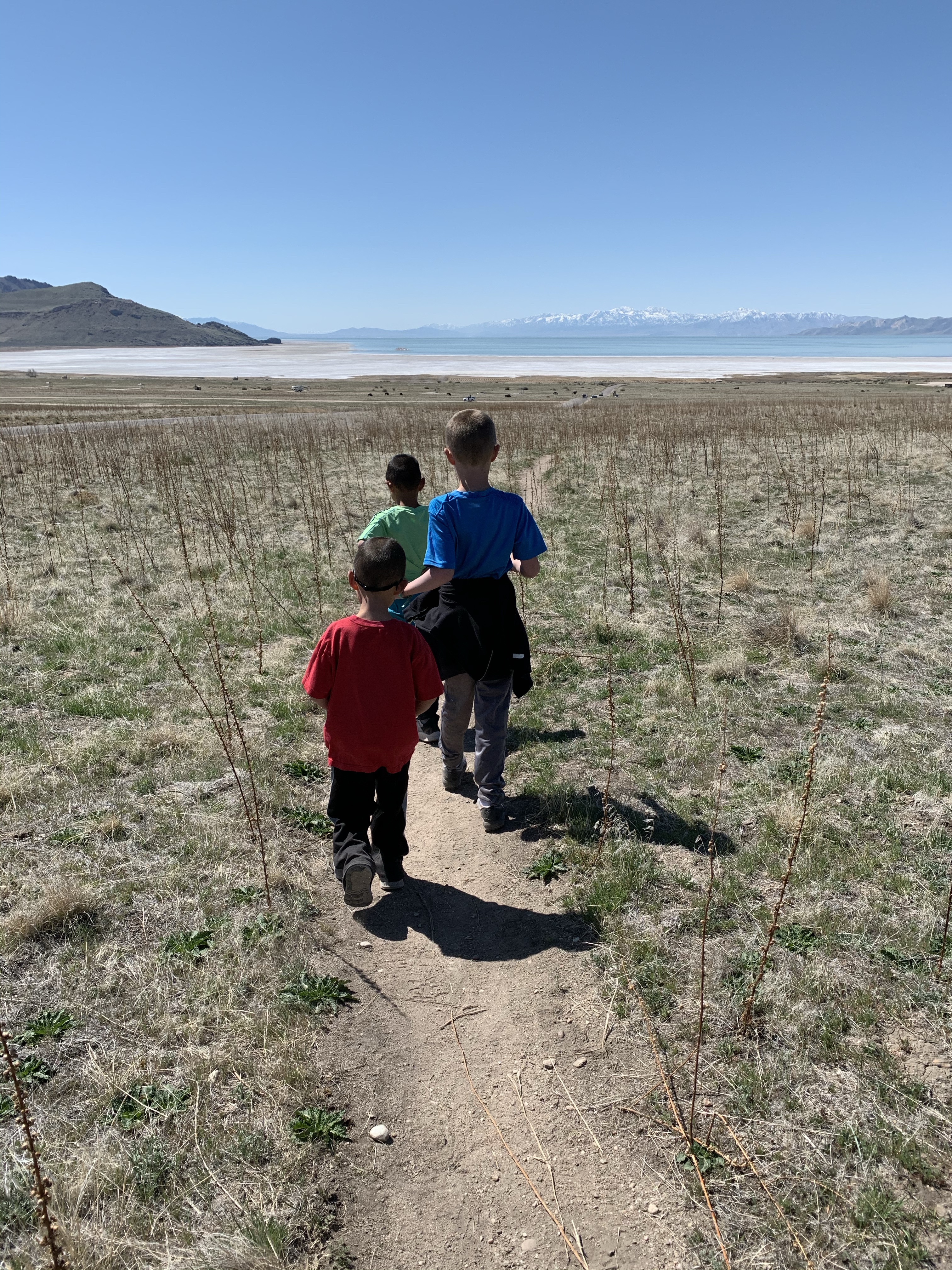 Last Friday we drove up to Antelope Island Park near Salt Lake and spend the day exploring the area and hiking. It sits on the Great Salt Lake which Leighton was super excited about because he had just been reading about the Salt Lake in his geography class. We did a 5 mile hike around part of the island which was just gorgeous. We pretty much had the trail to ourselves which allowed the kids to run and play and climb. Coppelia alternated between being a butterfly and yelling “flap flap flap” (for her wings) and using a stick as her trunk for being an elephant. We saw a lizard while we were on the hike and as we got close back to the car there was a heard of bison roaming around. We were able to avoid them, although Clint and Coppelia who were about 50 yards behind the boys and myself had to take a slight detour as one of the bison decided he’d like to walk on the path blocking them. After our hike we headed to the beach area and ate lunch and then went out to splash and play on the edge of the lake. The boys were pretty sure because the lake was huge that it might actually be a sea or an ocean but I told them it was just a lake. It wasn’t all that warm but we had a great time just having a hiking day as a family.
