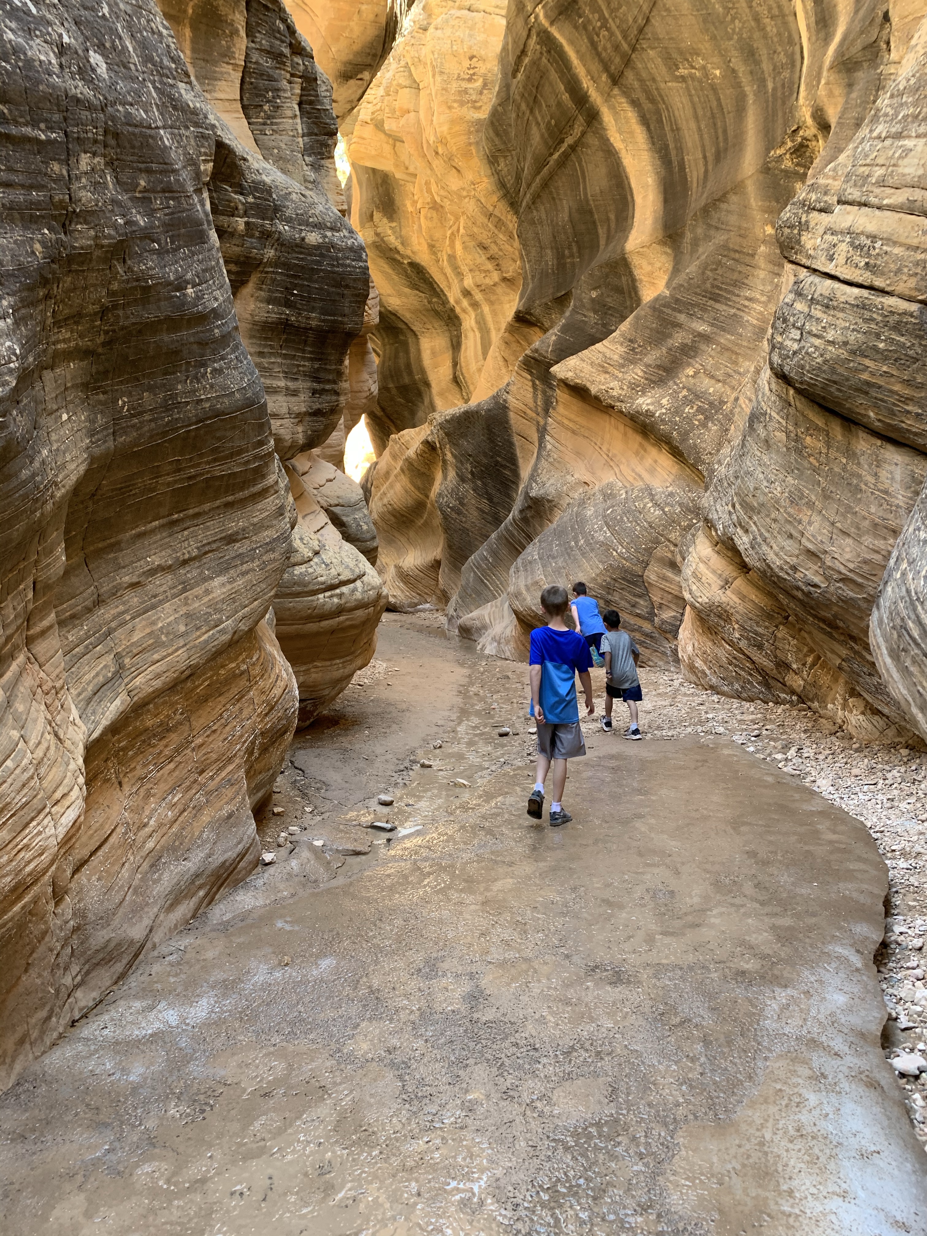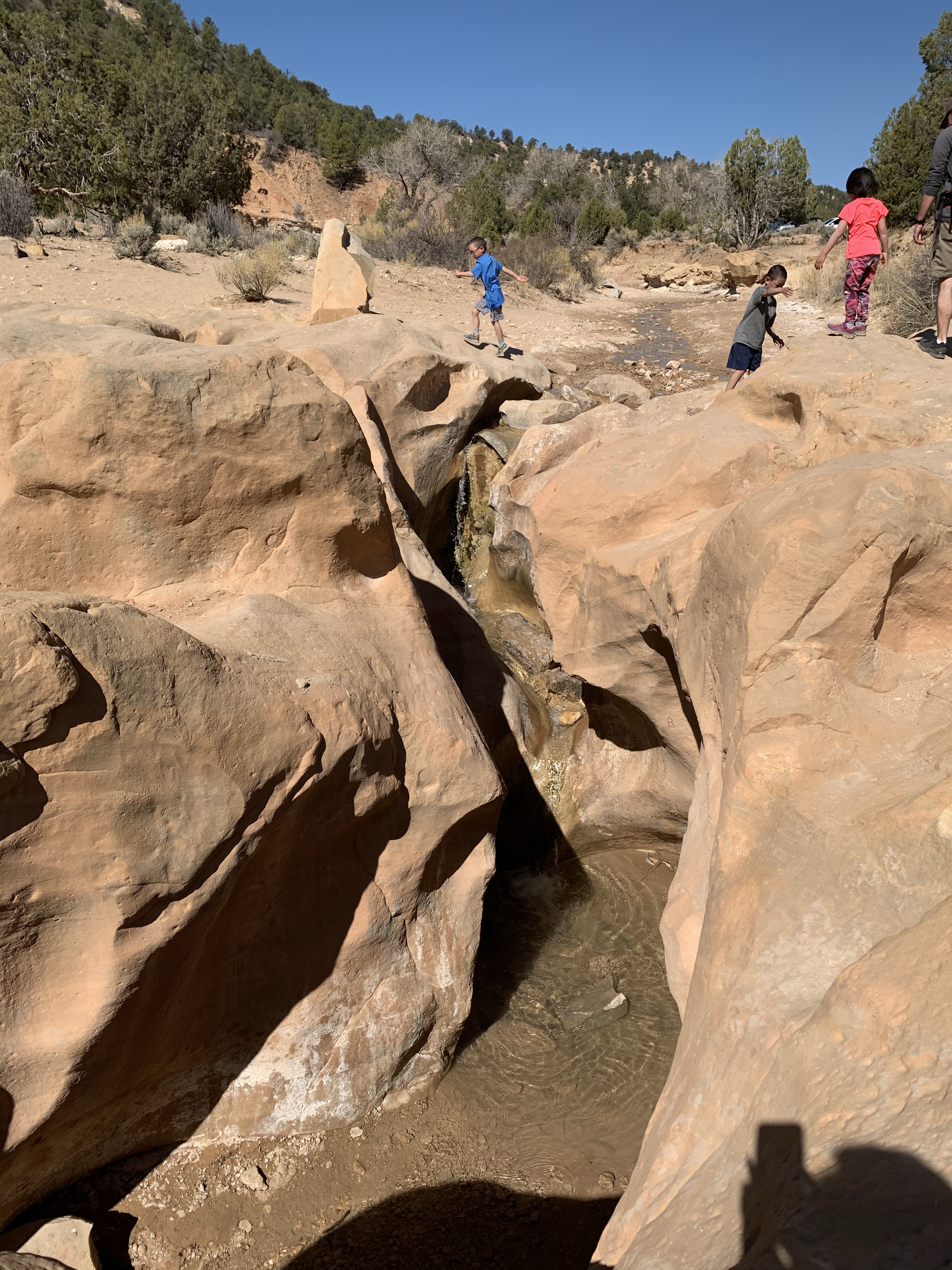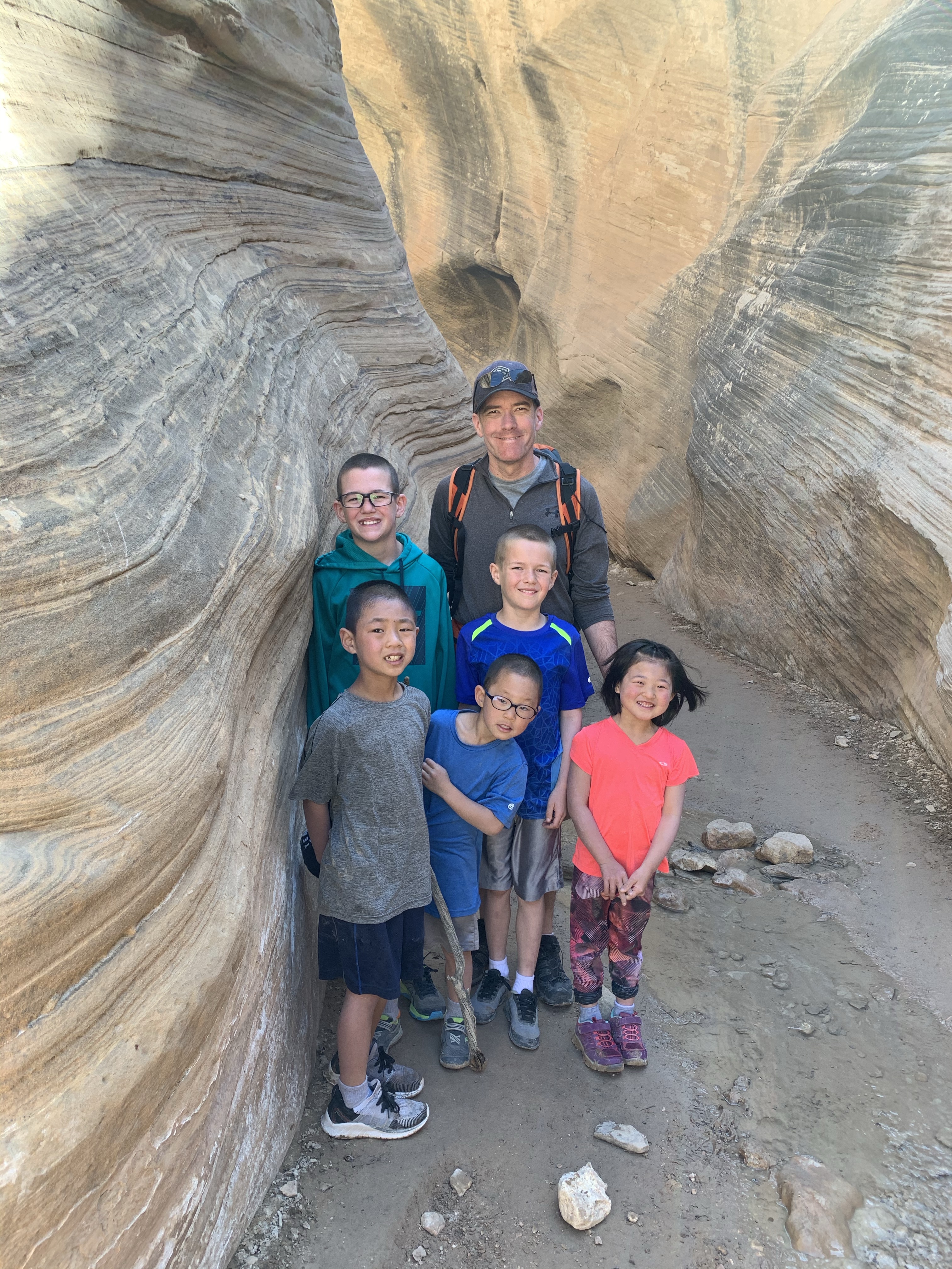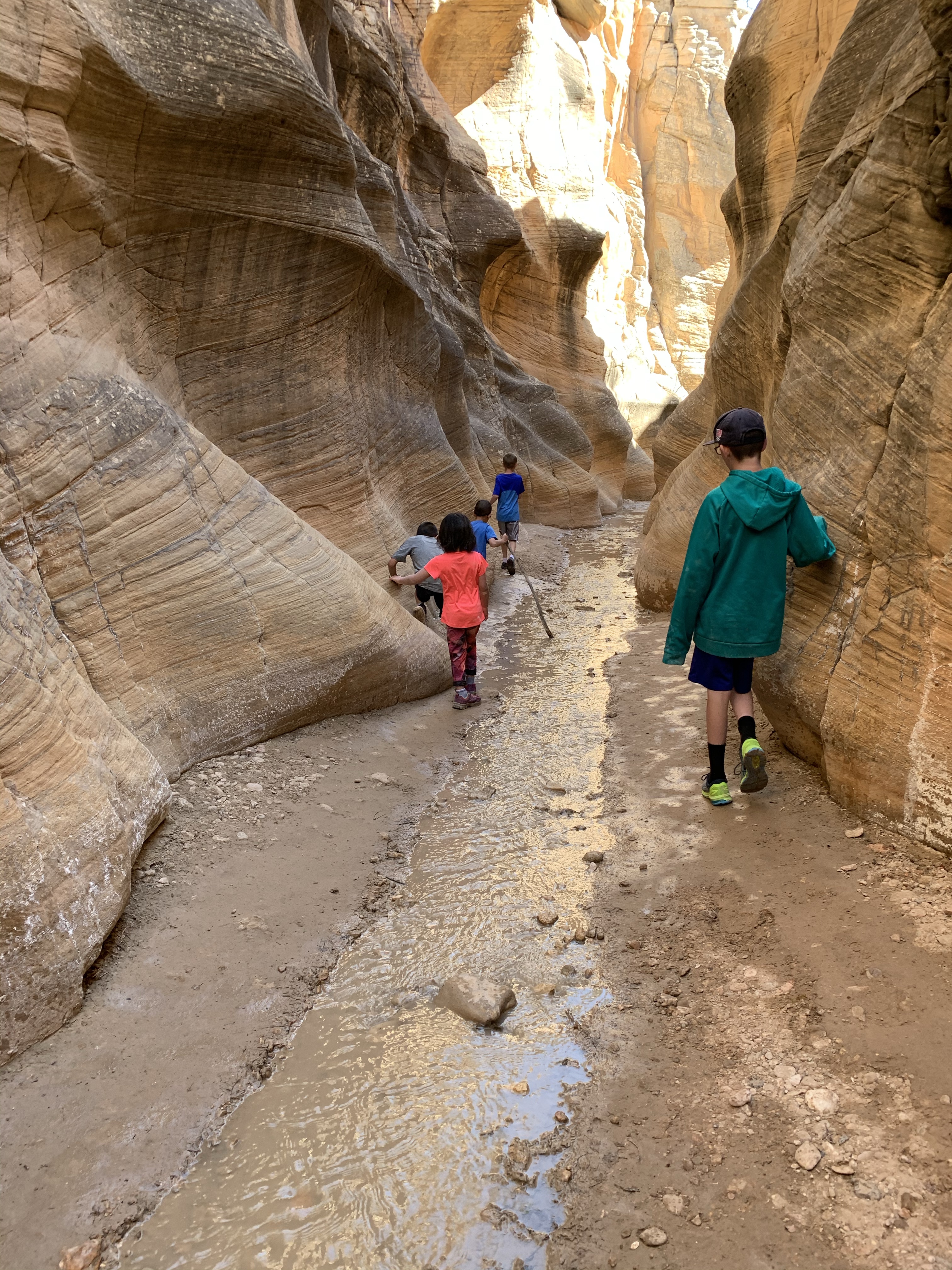 On Sunday we drove into Grand Staircase-Escalante National Monument and explored the Willis Creek Slot Canyon. It was an amazing hike, we dropped into the slot canyon right at the beginning and followed it down nearly 2 1/2 miles. The walls kept getting higher and higher there were all sorts of nooks and crannies for the kids to climb into and explore. There was a little stream running through the slot canyon that we just jumped back and forth over. The weather was perfect and we had an amazing time hiking it. When we got back to the start we ate our lunches that were packed in the car. It won’t be a hike we forget anytime soon.